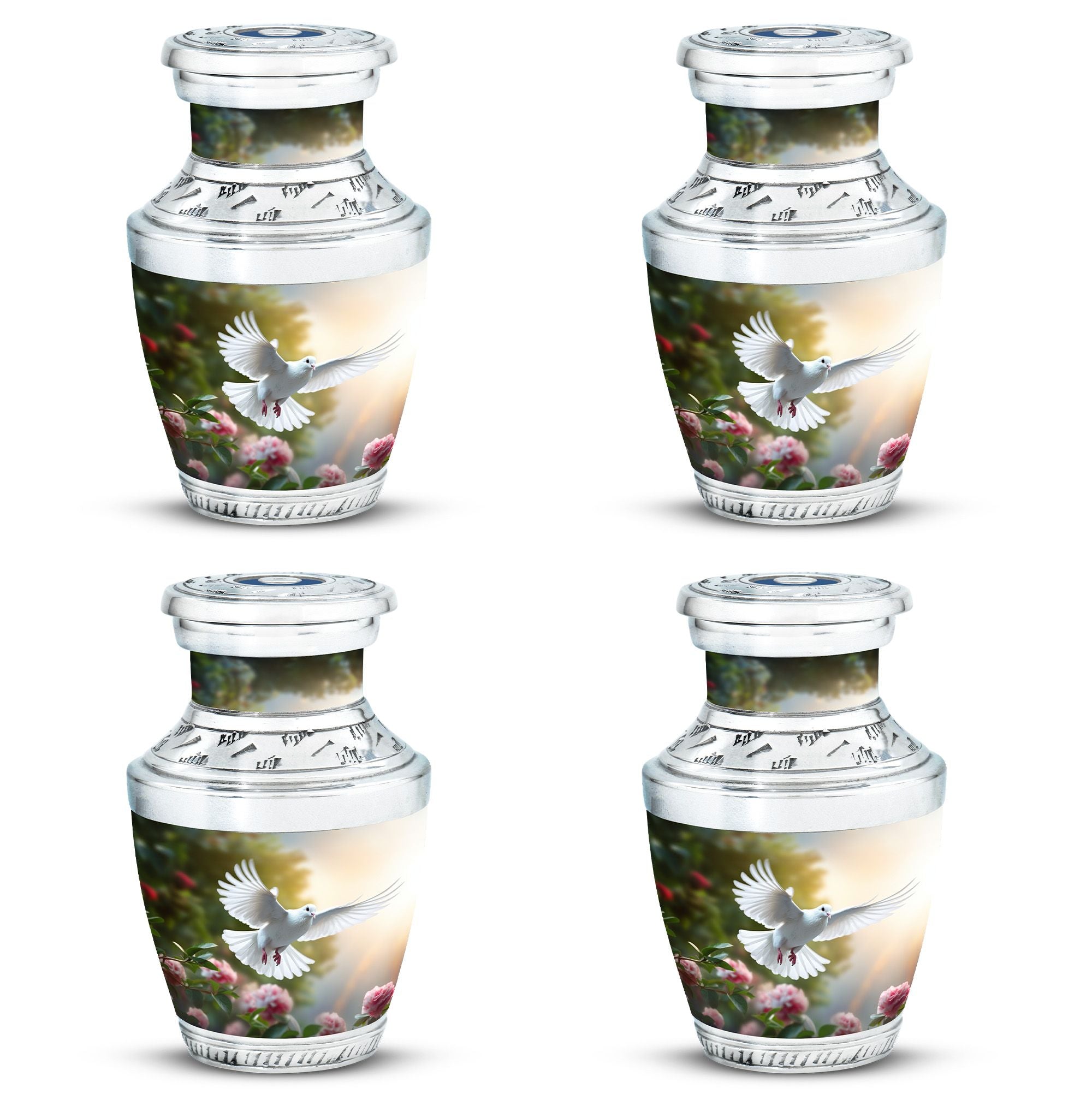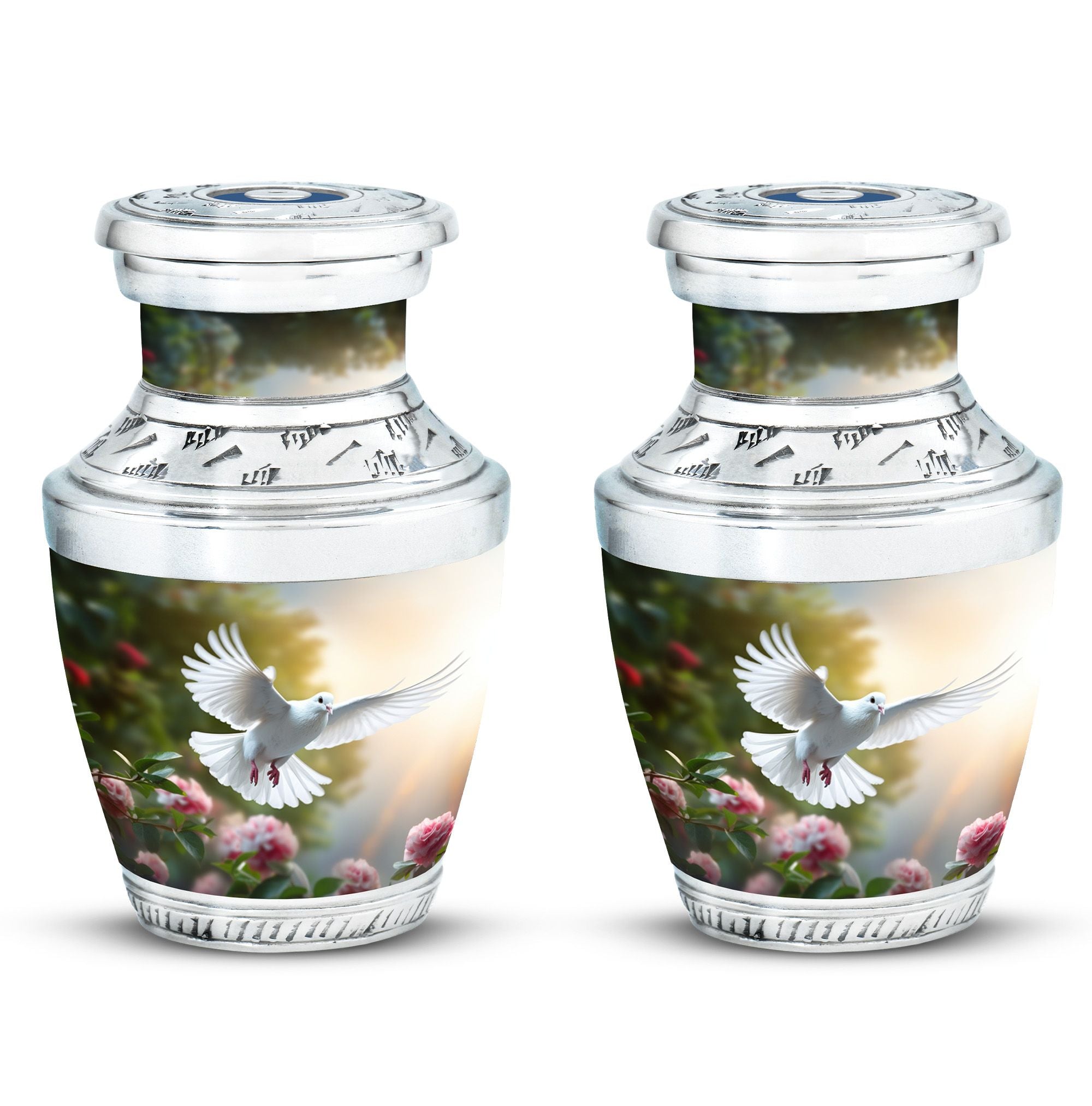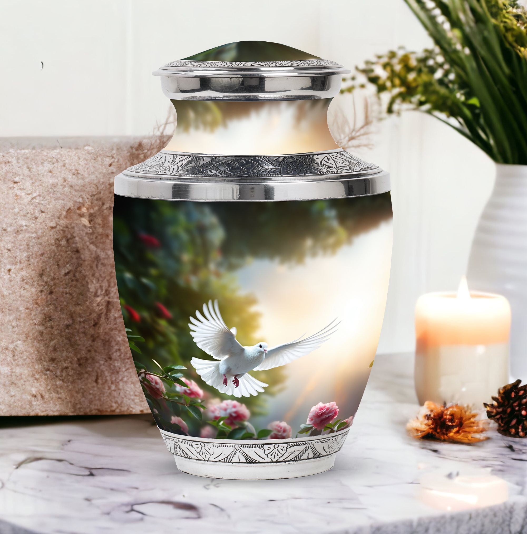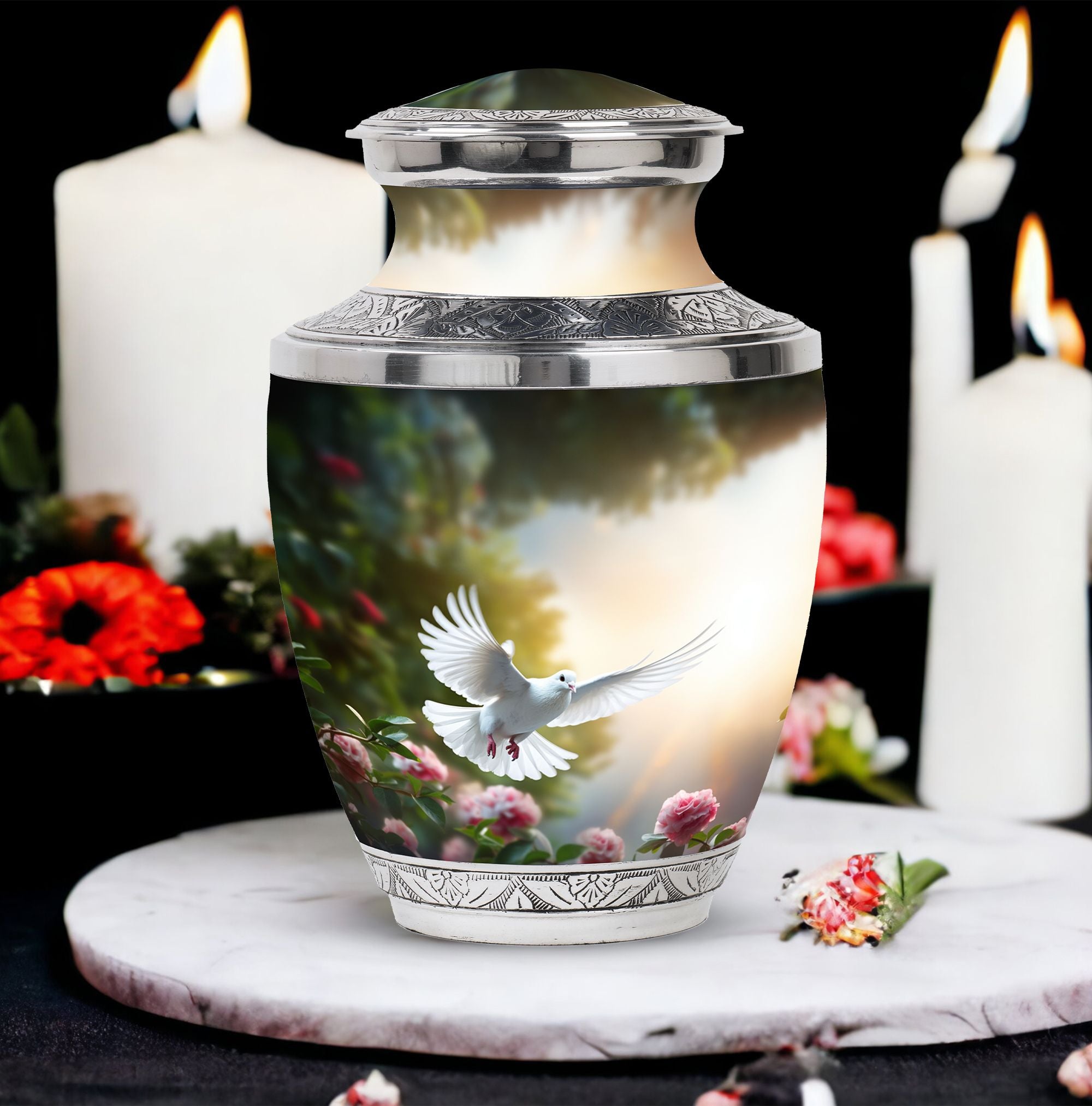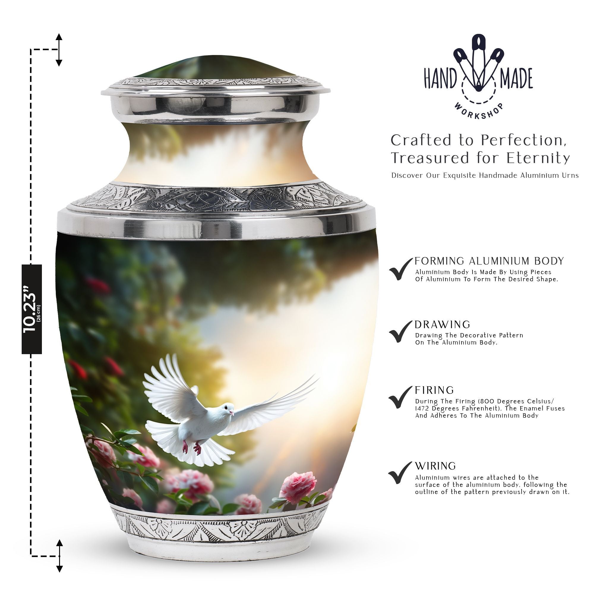 Invoke a sense of respect and peace with the magnificent Dove Flying Memorial Urn, a majestic piece designed to capture the essence of honoring a loved one. This large 10-inch urn meticulously fashioned from durable aluminium exudes timeless elegance. With a weight of 3.3 pounds and the capacity to hold up to 200 cubic inches, it offers ample space for cremation ashes. It comes with a beautifully soft velvet pouch intended for secure containment of the beloved one's ashes, emphasizing its thoughtfulness and attention to detail. For a personal touch, you can even customize it with engraved names, which etches a lasting tribute to the departed soul. This memorial urn, with its unmatched aesthetics and quality, serves not just as a funeral product but also a precious keepsake. Spacious and beautiful, the urn is perfect for providing a dignified home for your loved one's ashes. This breathtaking piece beautifully blends nostalgia and hope, making it a much sought-after item in the market for memorial urns, burial urns for ashes, and personalised urns. The substantial size of 3 inches makes it an impressive urn for cremations, a distinguished choice for remembering your cherished one.