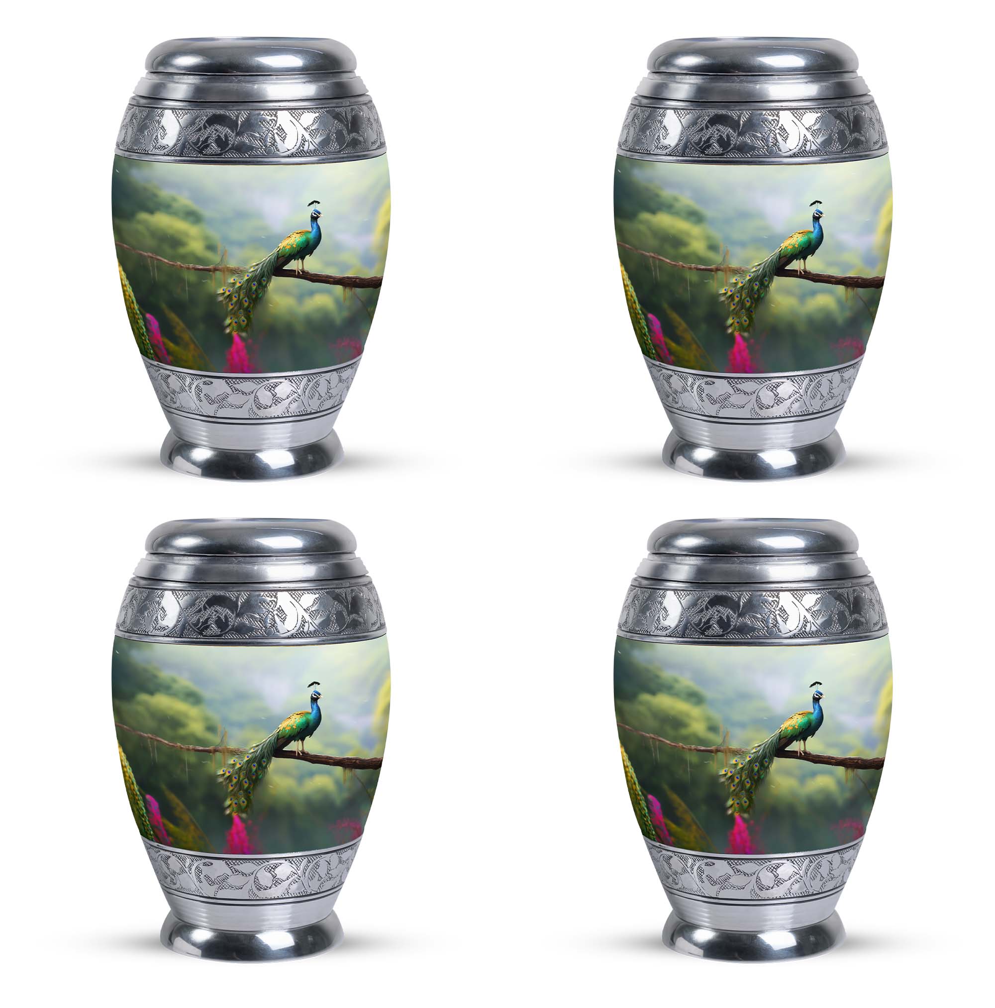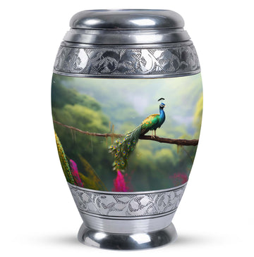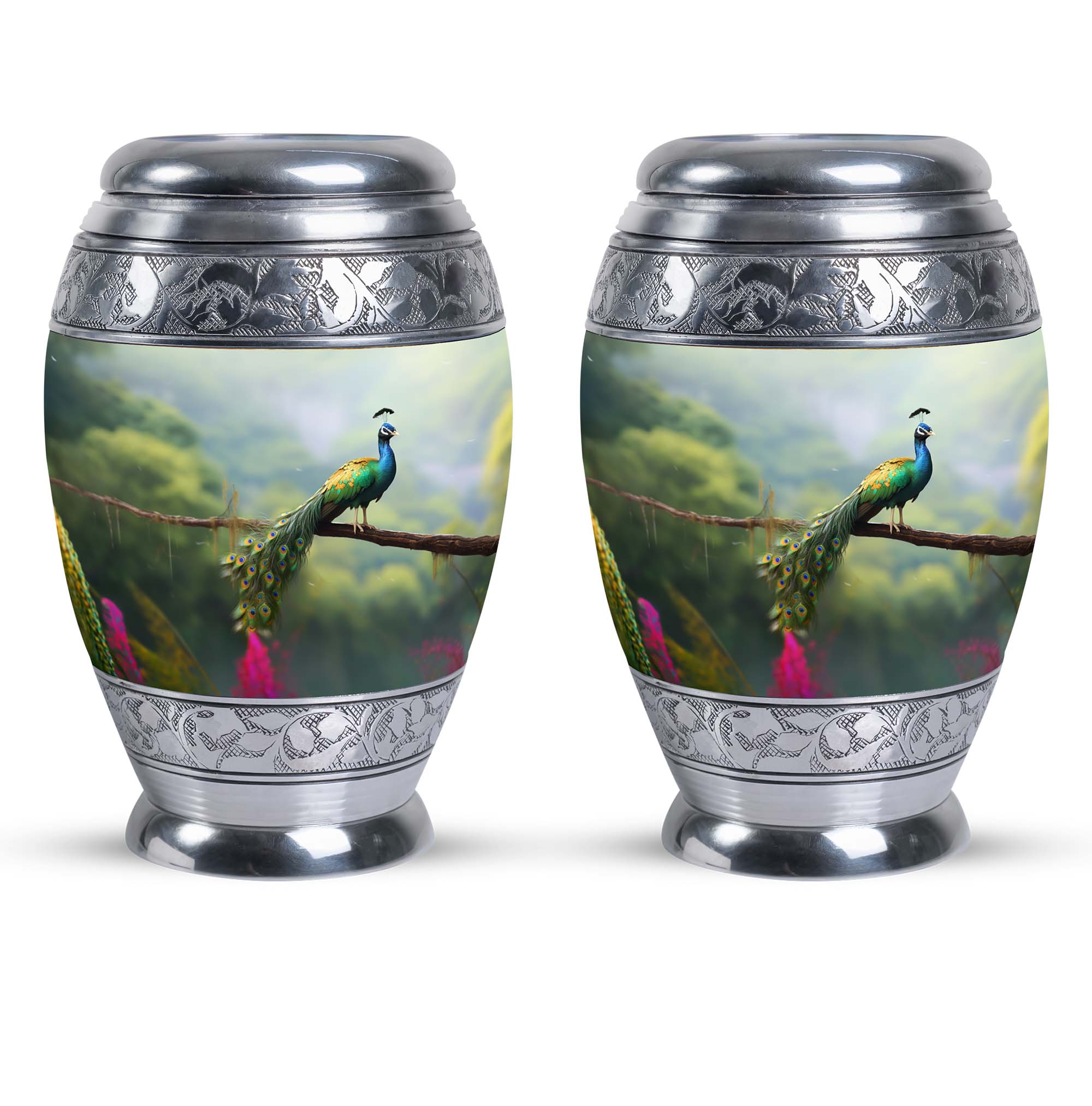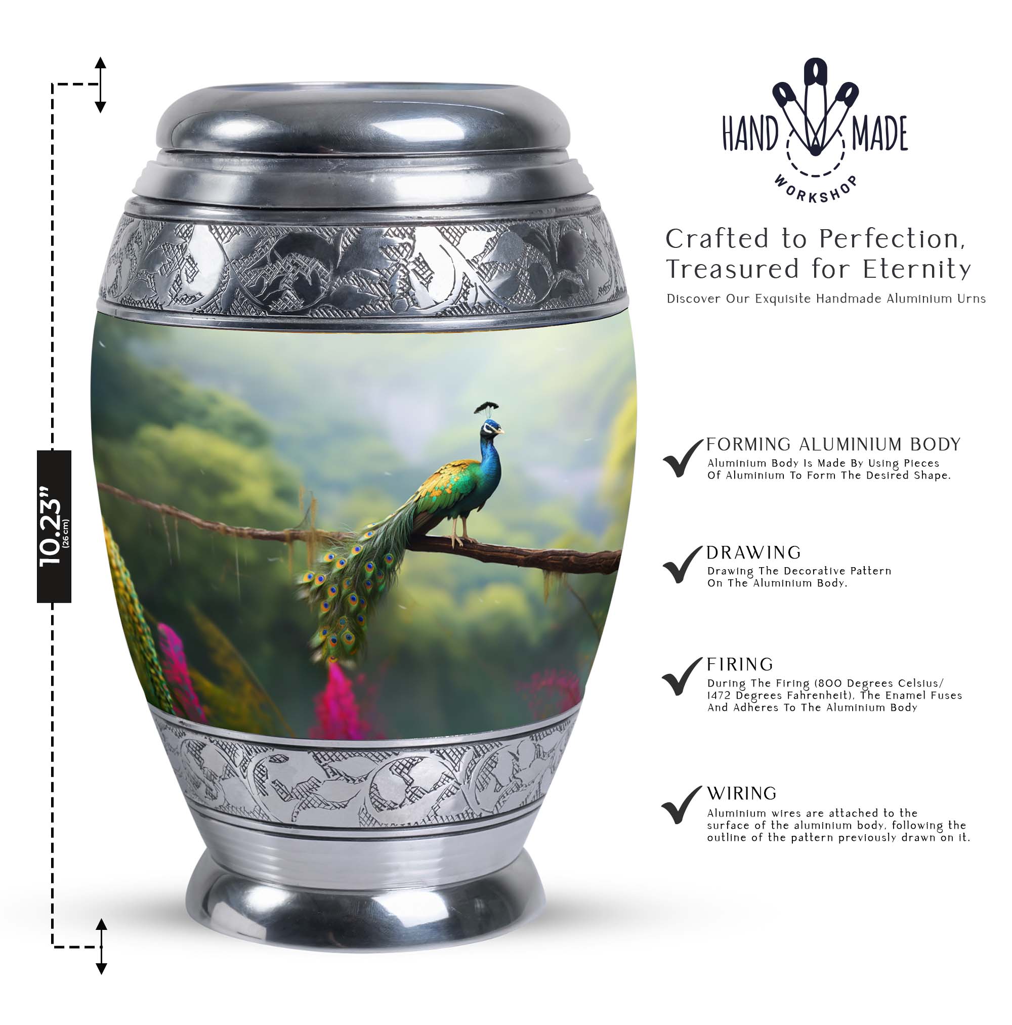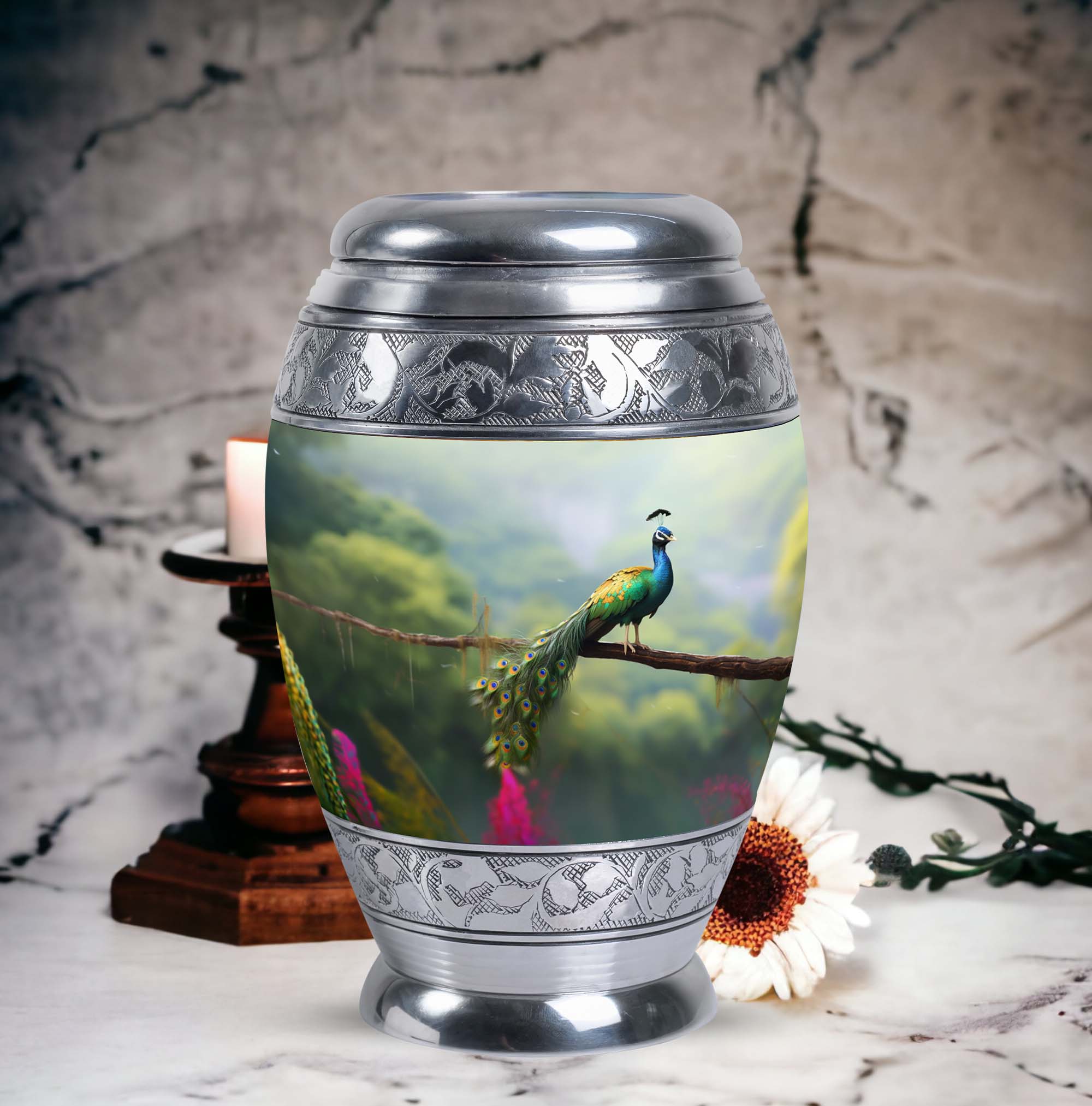 Cherish the memory of your loved ones with our premium Peacock Urns for Ashes, meticulously crafted for adults. This large urn is constructed from high-quality Aluminium, providing a durable vessel for lasting remembrance. The urn measures at a height of 10 inches with a weight of 3.3 pounds, ample enough to securely hold up to 200 cubic inches of ashes of your beloved one. Our classic urn, with its tasteful design, will effortlessly complement your memorial space. With an option of personalization, you can engrave names onto the urn making it even more meaningful and unique. The urn comes along with a velvet pouch, providing a comforting containment for the ashes. Seek solace in our ashes urn, a perfect tribute to the everlasting bond. Please note, the urn design does not alter the classic urn form. This particular item also comes under common searches such as Personalized Urns, Urns for Ashes for Dad, Urns for Human Remains, and Decorative Urn for Ashes.