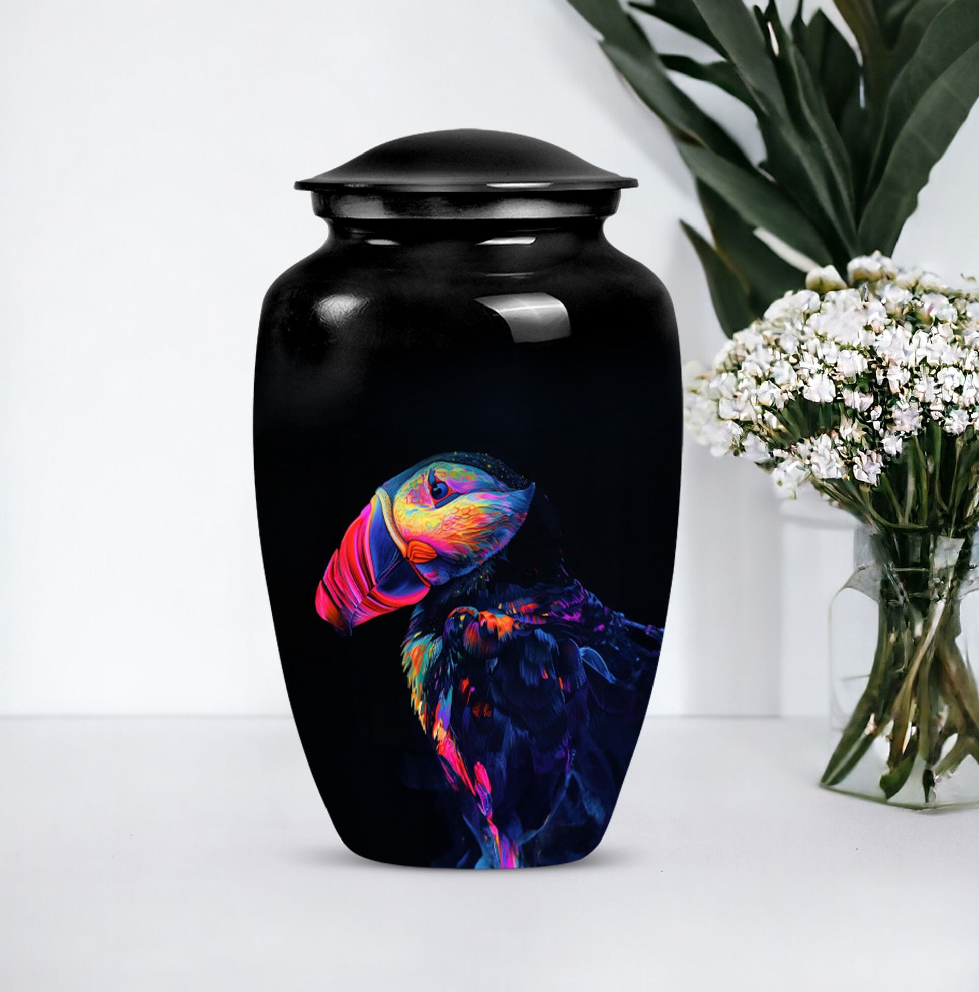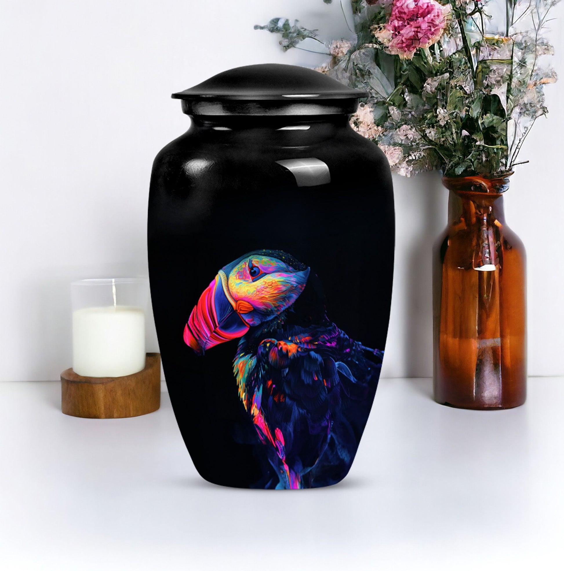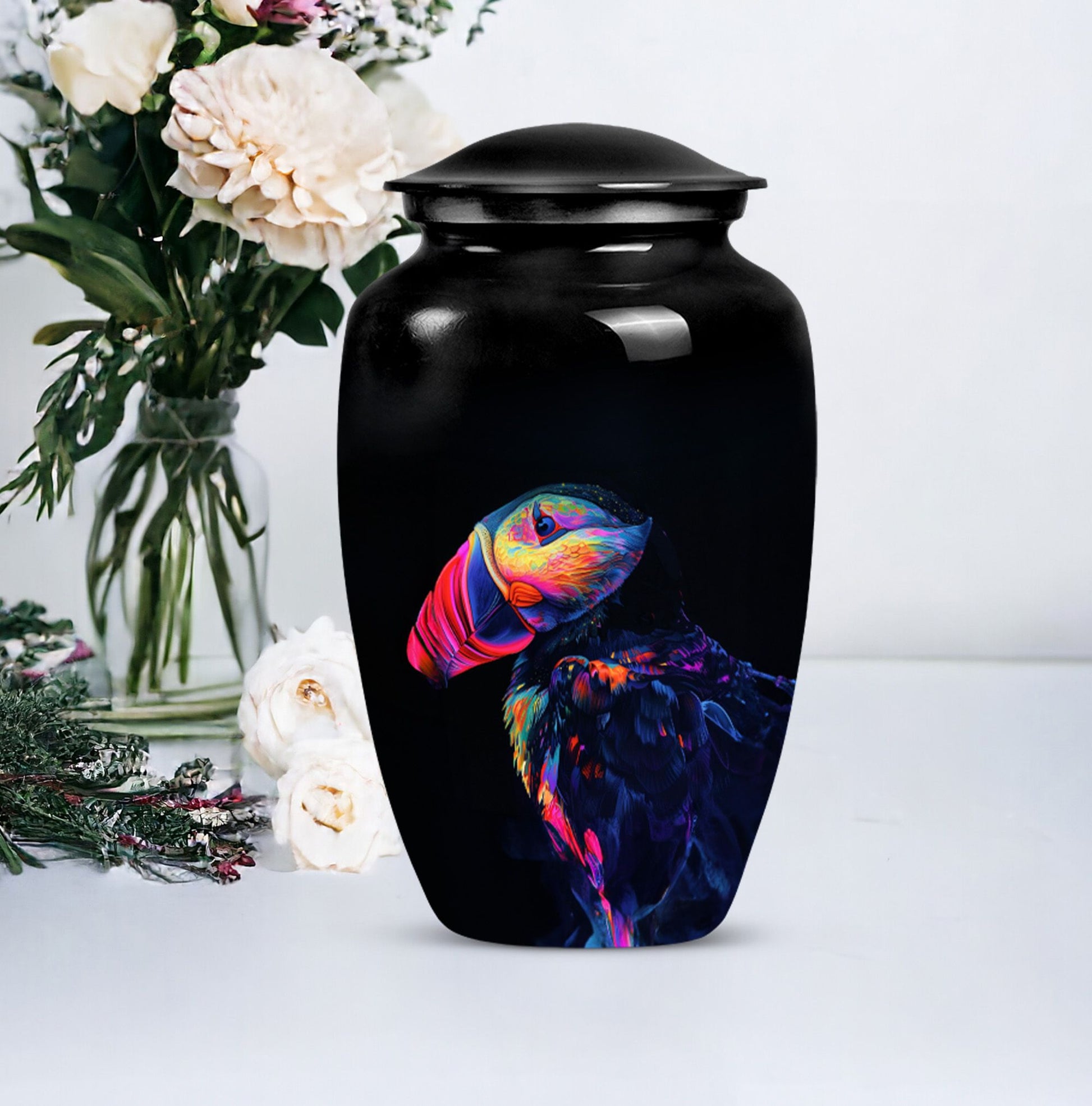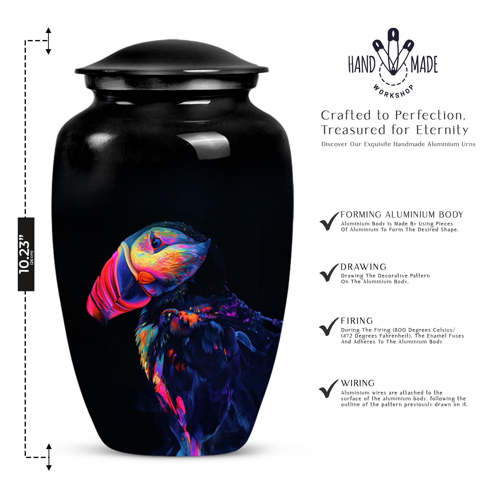 Introducing our Puffin Bird urn, a hand-crafted cremation urn thoughtfully engineered for the containment of your cherished one's ashes. This unique, 10-inch tall abstract-themed Large Urn is meticulously fabricated from premium aluminum, ensuring durability and longevity. With a notable capacity of up to 200 cubic inches, this urn is more than adequate for preserving the ashes of your loved one. Notably, it boasts a commendable weight of just 3.3 pounds, offering effortless handling and secure placement. Step away from the conventional with this casually sophisticated cremation urn, imposing an element of dignified elegance to any space it occupies. It arrives alongside a complimentary velvet pouch, ensuring containment and safeguarding of the ashes. Besides, should you desire a more intimate touch, feel free to personalize the urn with engraved names. This Multipurpose Urn with a photo frame is the perfect memory piece. Whether you intend it for burial purposes or to serve as a thoughtful keepsake, our classic urn stands unrivaled. So why wait? Embrace this one-of-a-kind urn for cremation, an emblem of enduring love and respect for your departed.