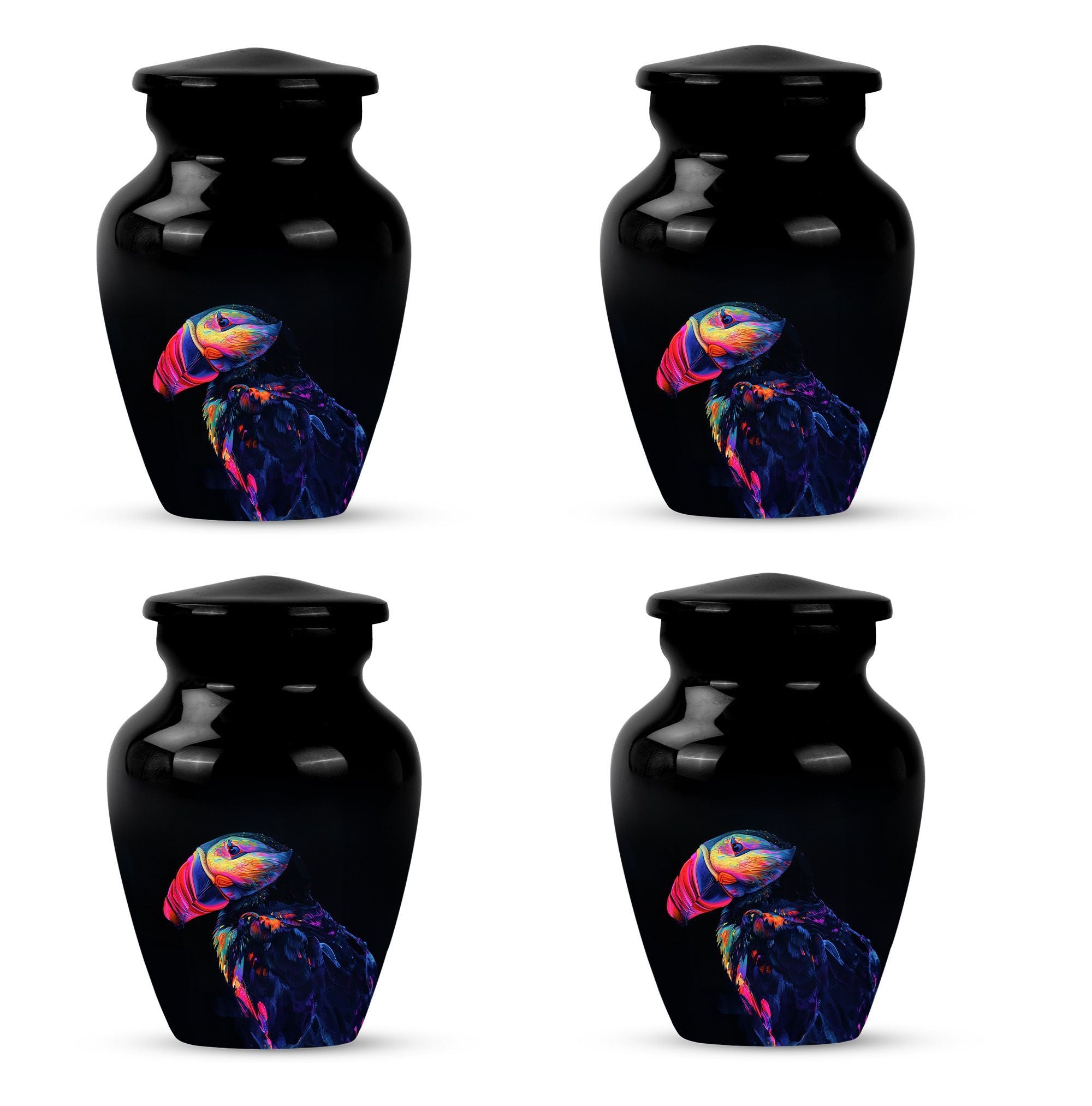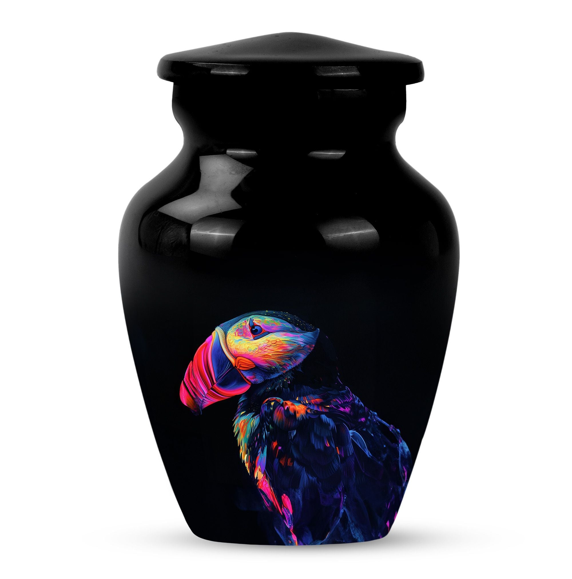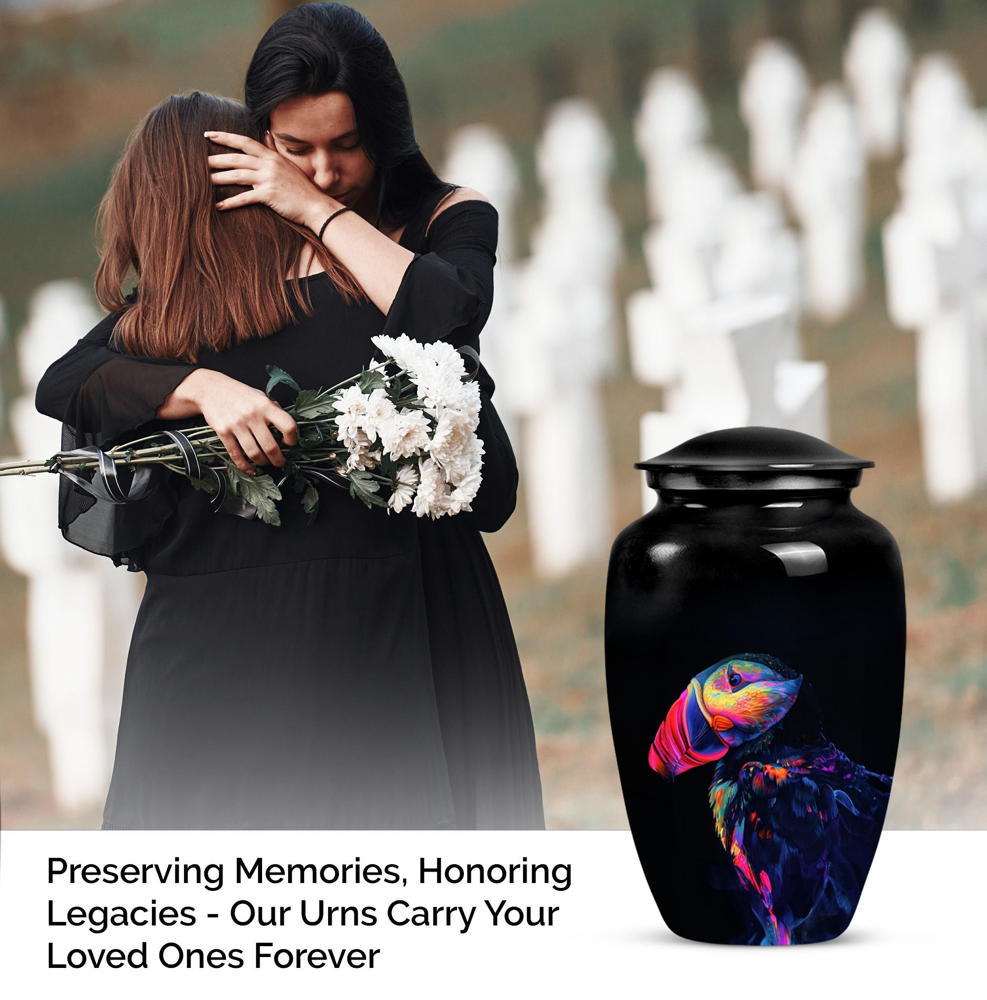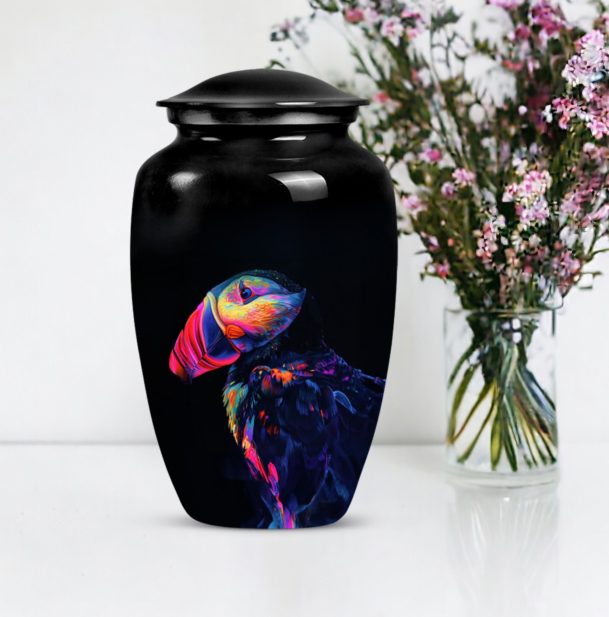 Introducing our Puffin Bird urn, a hand-crafted cremation urn thoughtfully engineered for the containment of your cherished one's ashes. This unique, 10-inch tall abstract-themed Large Urn is meticulously fabricated from premium aluminum, ensuring durability and longevity. With a notable capacity of up to 200 cubic inches, this urn is more than adequate for preserving the ashes of your loved one. Notably, it boasts a commendable weight of just 3.3 pounds, offering effortless handling and secure placement. Step away from the conventional with this casually sophisticated cremation urn, imposing an element of dignified elegance to any space it occupies. It arrives alongside a complimentary velvet pouch, ensuring containment and safeguarding of the ashes. Besides, should you desire a more intimate touch, feel free to personalize the urn with engraved names. This Multipurpose Urn with a photo frame is the perfect memory piece. Whether you intend it for burial purposes or to serve as a thoughtful keepsake, our classic urn stands unrivaled. So why wait? Embrace this one-of-a-kind urn for cremation, an emblem of enduring love and respect for your departed.