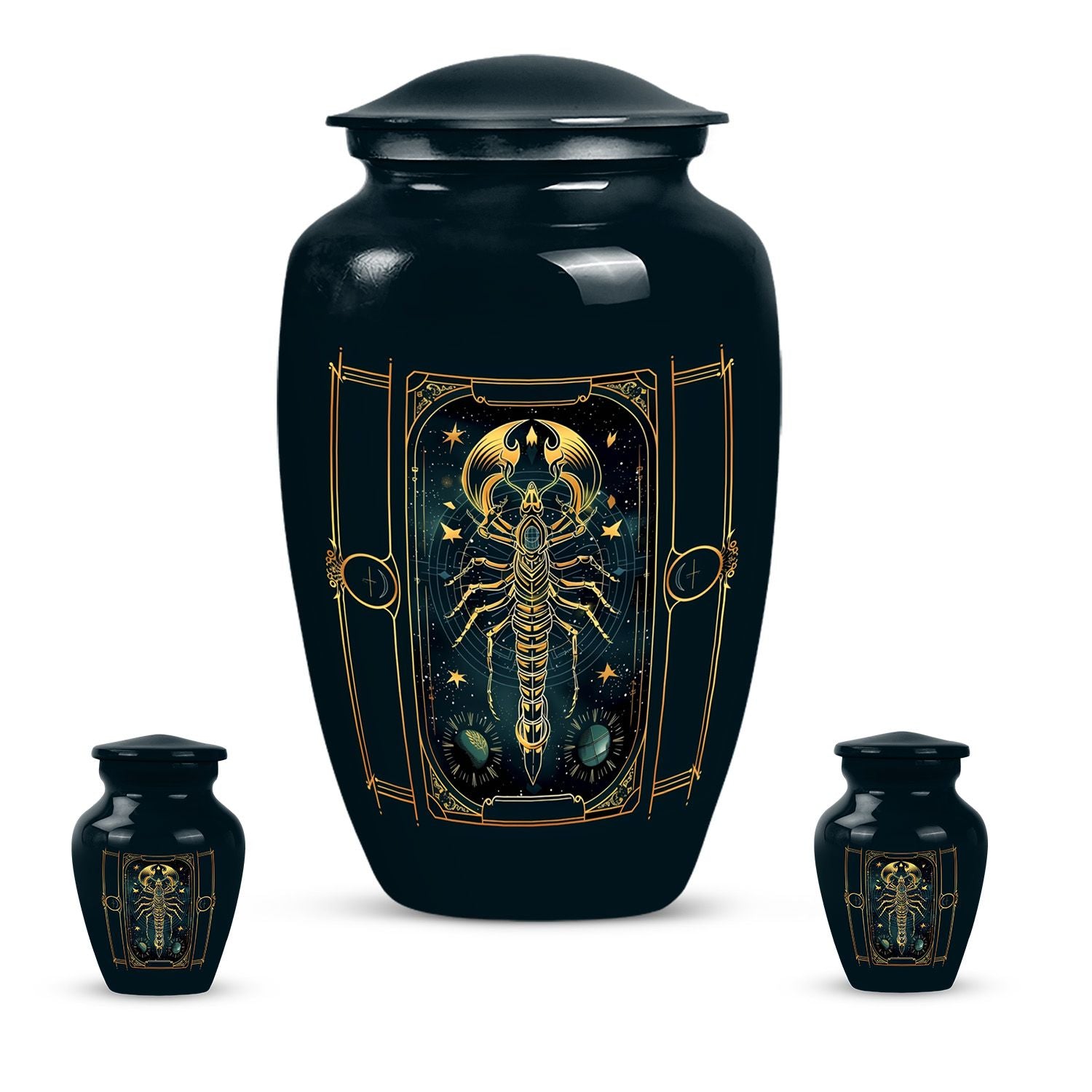 Honor the memory of your loved ones with our exquisite Zodiac Urn. Crafted from high-quality aluminium, this large-scale urn can hold up to 200 cubic inches of ashes, perfect for memorializing a beloved adult female. Resilient and subtly beautiful with an abstract theme, it bridges the gap between aesthetics and durability. The urn stands 10 inches tall, striking an imposing figure. Weighing in at just 3.3 pounds, its lightness is a testament to expert craftsmanship. The urn comes complete with a velvet pouch for the respectful containment and preservation of ashes. Extend the personal touch by customizing the urn with engraved names, making this not just a container for ashes but a personalized memento of the departed. Perfectly suited for cremation rites, this urn serves as a timely and timeless addition to any memorial ceremony supplies wish-list. Remember, this isn't just an urn - it's a lifelong keepsake.