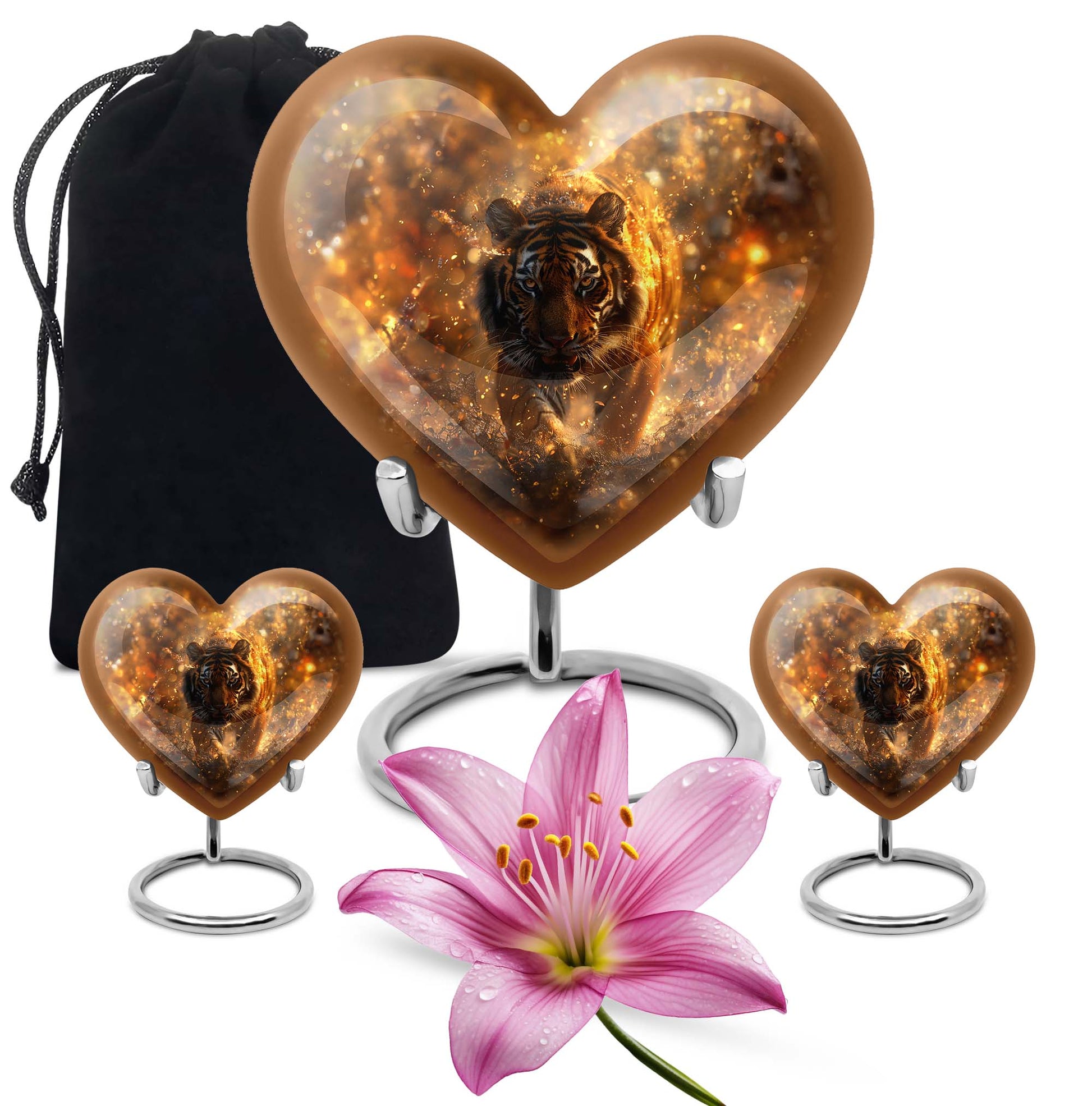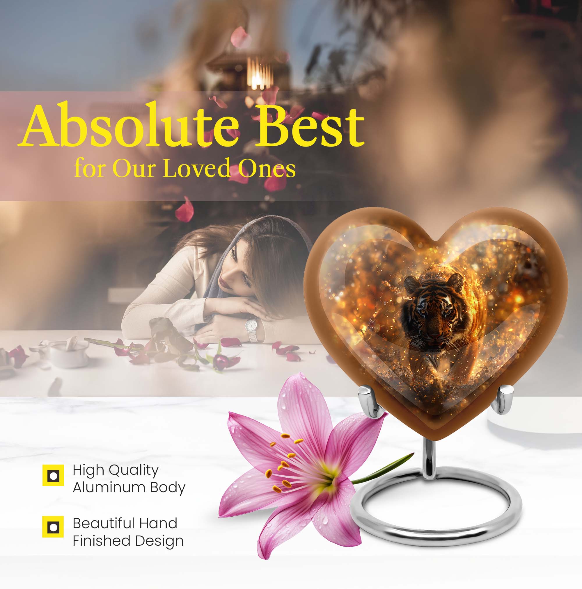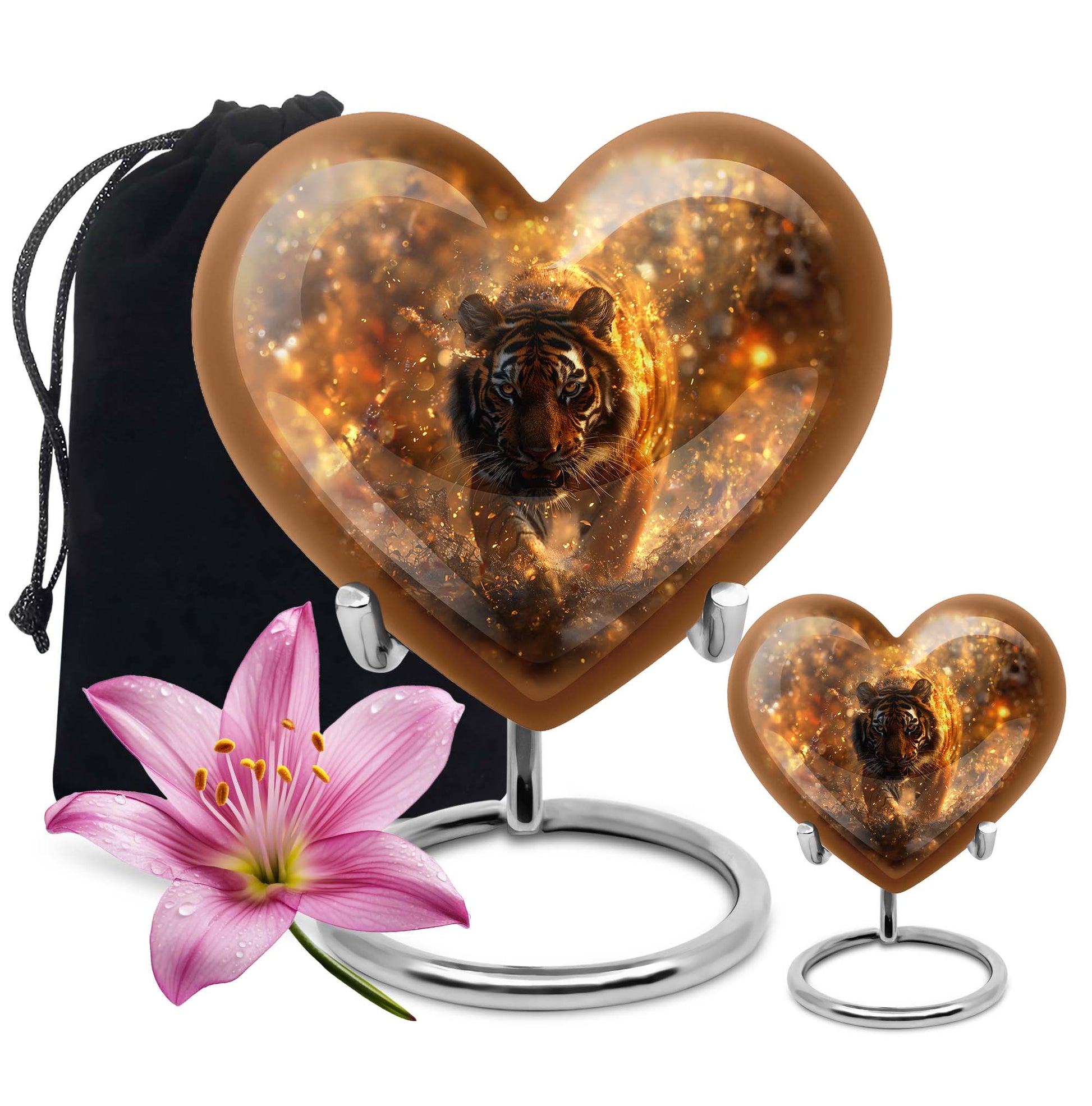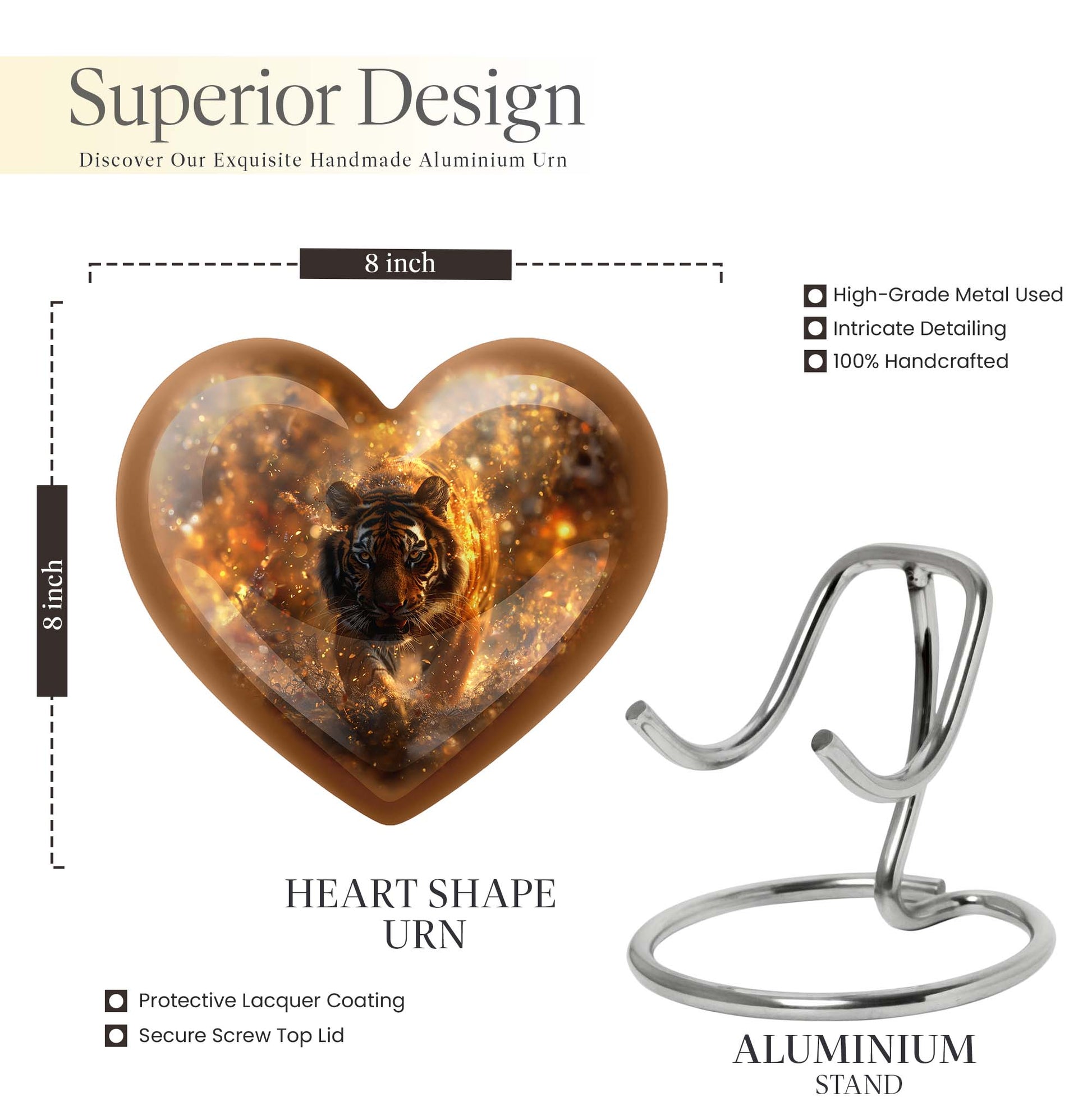 Experience the calm and serenity that this unique 10-inch Tiger Urn brings. Meticulously crafted from highest quality Aluminium, this large urn weighs 3.3 pounds and has a capacity to securely hold up to 200 cubic inches of ashes. It encapsulates a heart-shaped theme with flower motifs. This heart urn doesn't scream 'funeral urn' but whispers 'memorial', delicately encapsulating all your cherished memories. With customization option available, you can choose to personalize this funeral urn with engraved names, forever immortalizing your sentiments. Your purchase includes a cozy velvet pouch, ensuring the containment of ashes is carried out in the most respectful and tasteful way. Ideal keywords to search for this funeral urn for human ashes include 'tiger urn', 'memorial urns', 'lasting memories' and 'timeless stone urns'. Specially designed to be a rendezvous of remembrance, this urn is more than just a funeral supply - it's a celebration of life.