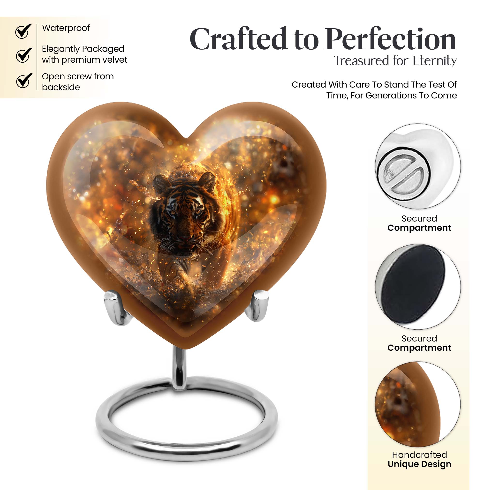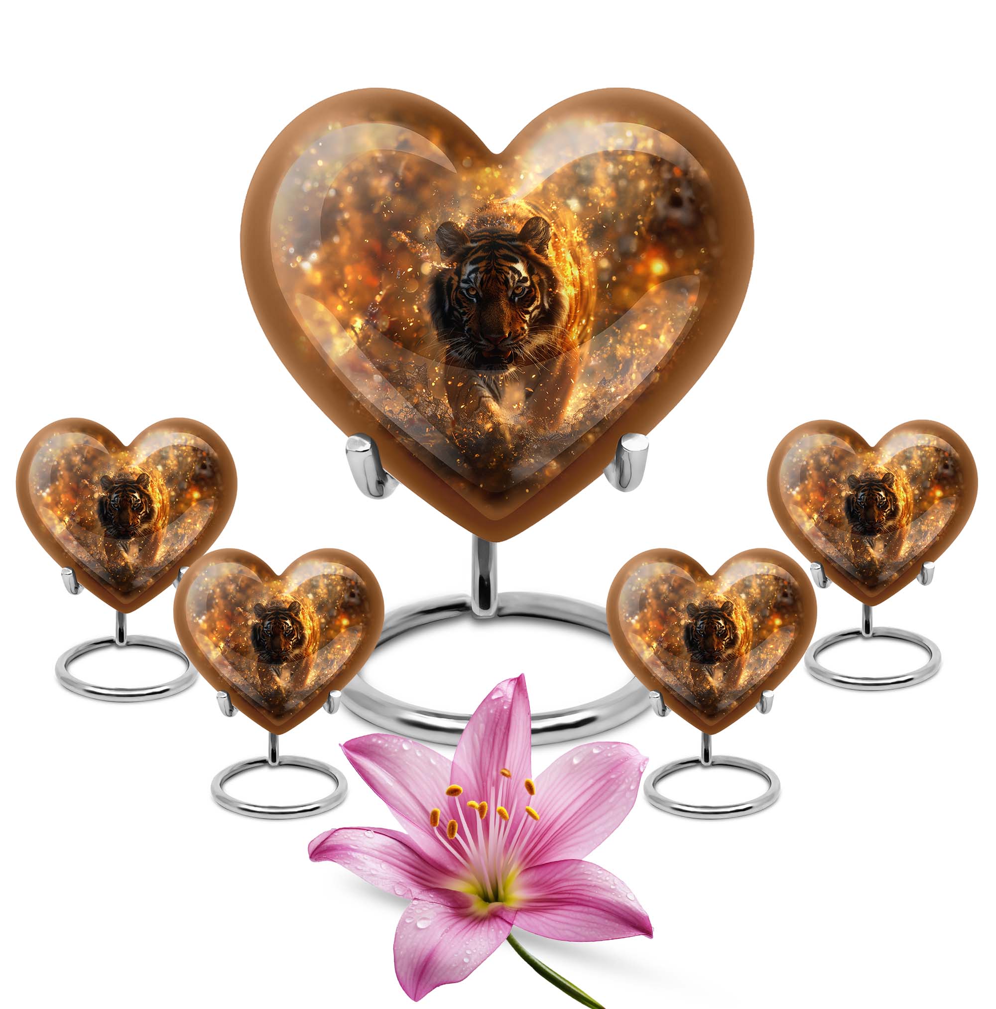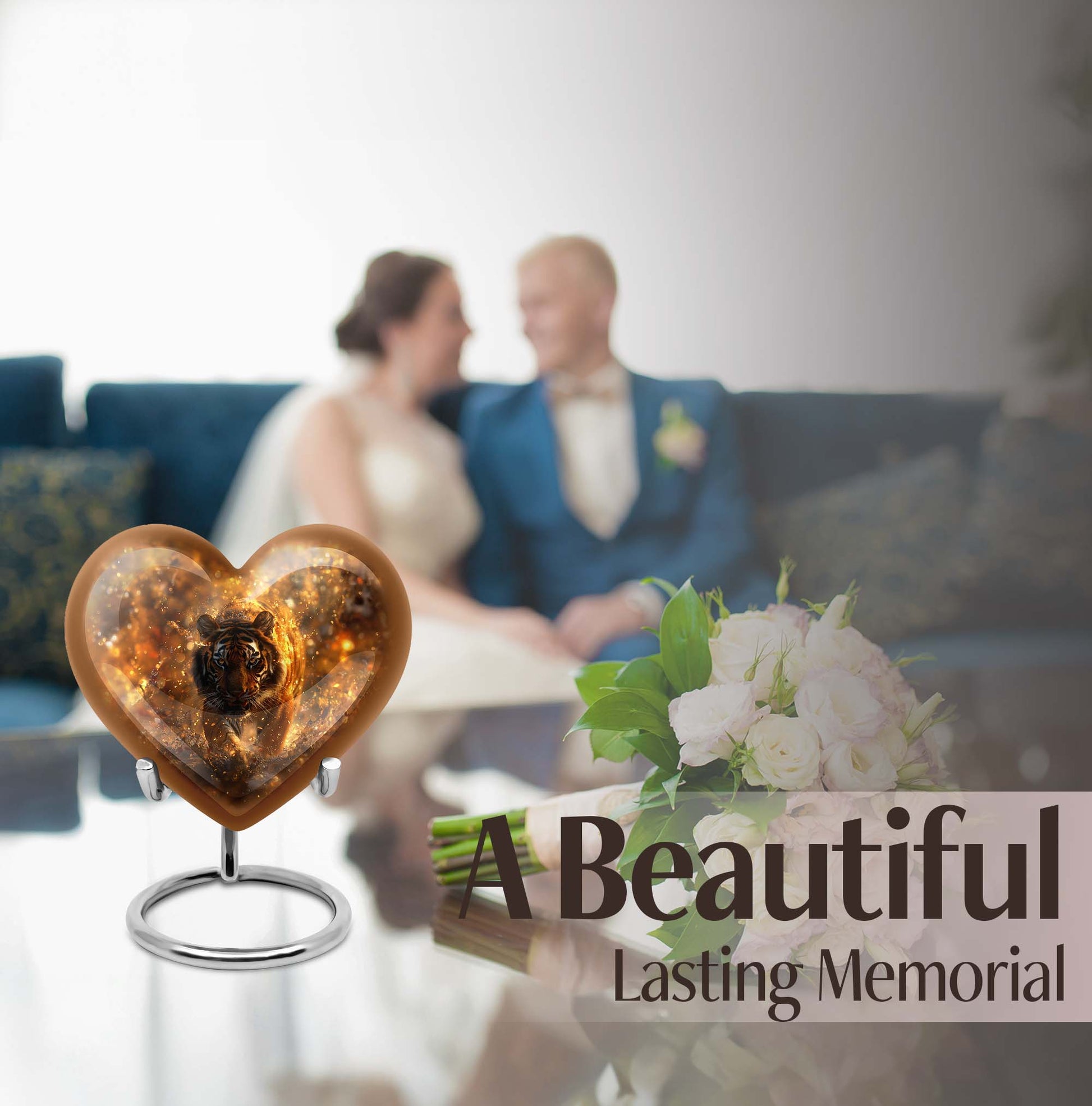 Experience the calm and serenity that this unique 10-inch Tiger Urn brings. Meticulously crafted from highest quality Aluminium, this large urn weighs 3.3 pounds and has a capacity to securely hold up to 200 cubic inches of ashes. It encapsulates a heart-shaped theme with flower motifs. This heart urn doesn't scream 'funeral urn' but whispers 'memorial', delicately encapsulating all your cherished memories. With customization option available, you can choose to personalize this funeral urn with engraved names, forever immortalizing your sentiments. Your purchase includes a cozy velvet pouch, ensuring the containment of ashes is carried out in the most respectful and tasteful way. Ideal keywords to search for this funeral urn for human ashes include 'tiger urn', 'memorial urns', 'lasting memories' and 'timeless stone urns'. Specially designed to be a rendezvous of remembrance, this urn is more than just a funeral supply - it's a celebration of life.