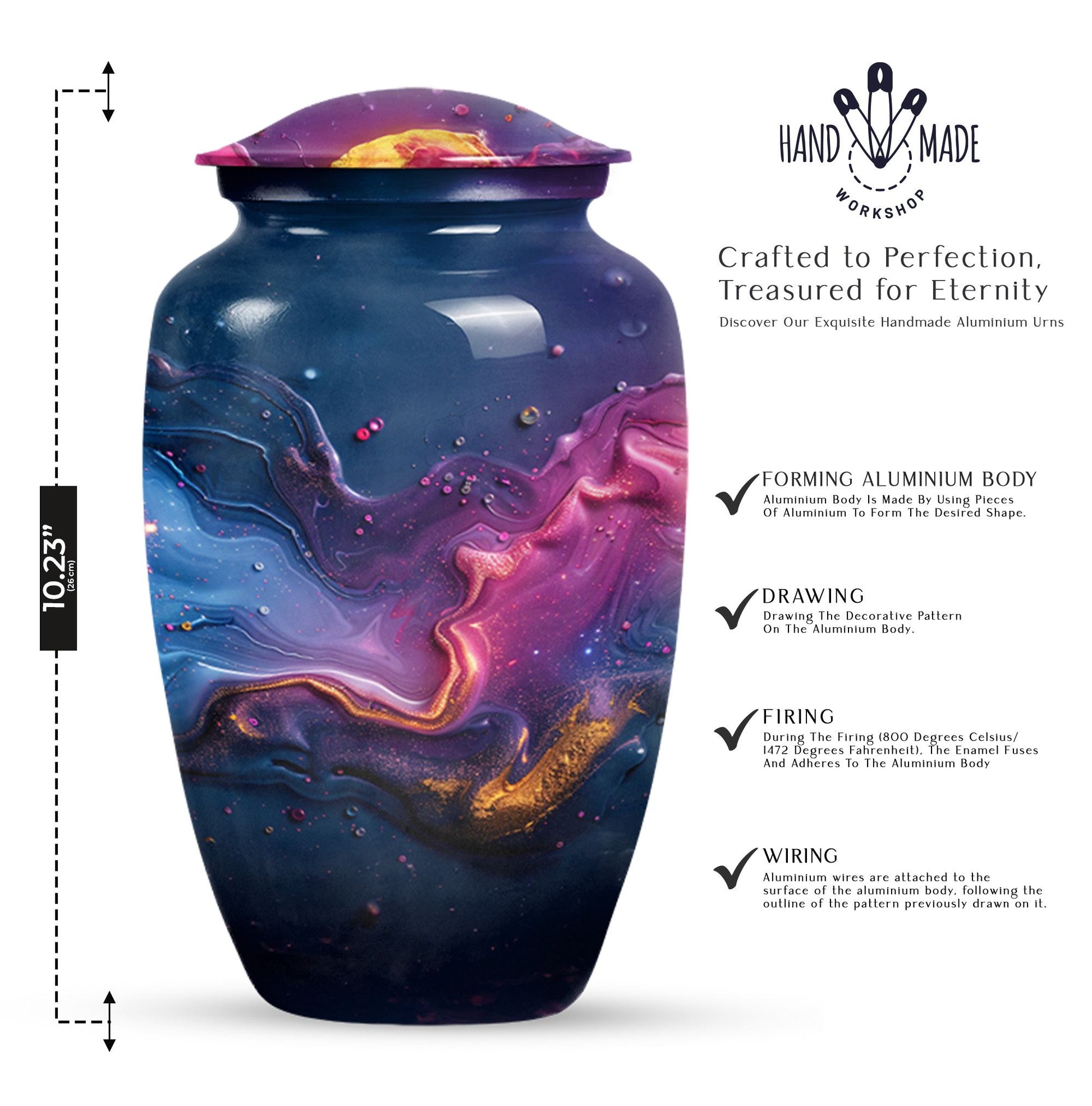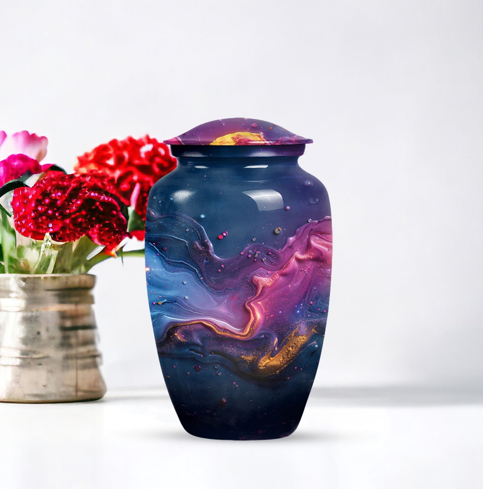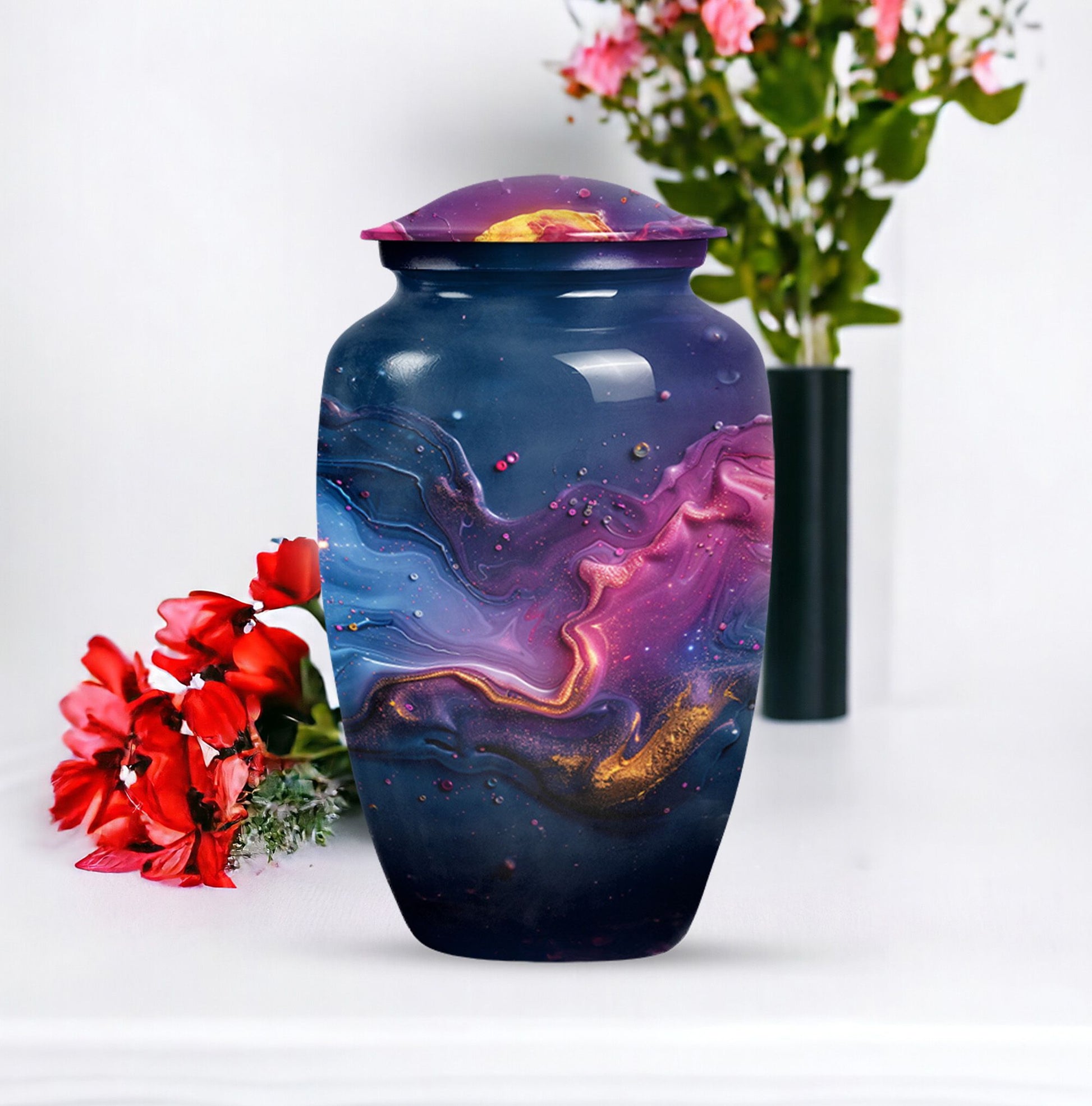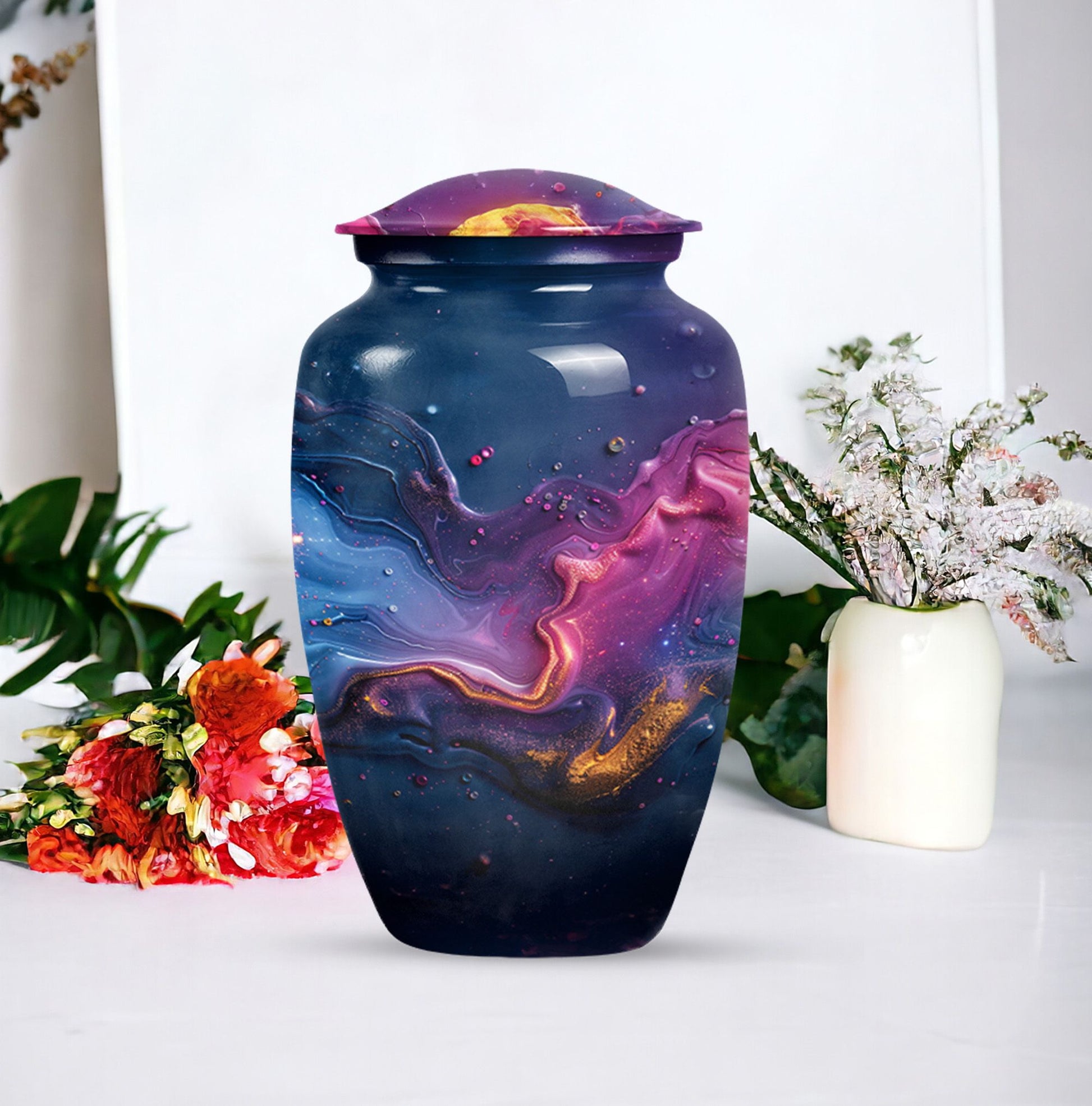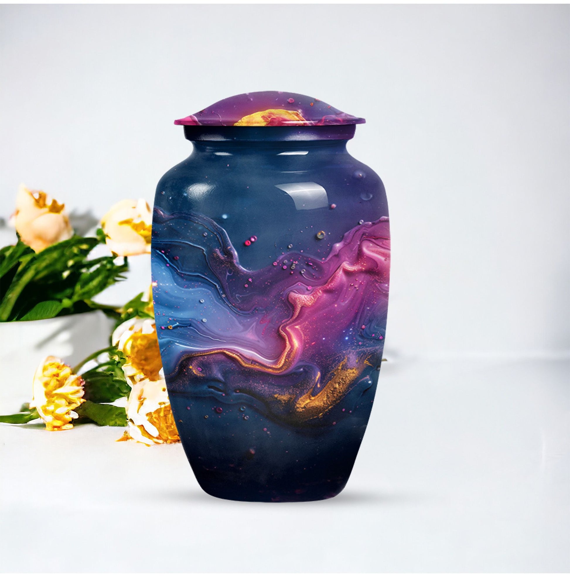 Crafted from sturdy aluminium, this large-size 10-inch Abstract Urn exhibits the perfect balance of abstract artistry and classic design. Created with a keen focus on quality, it weighs is 3.3 pounds, supporting a hefty capacity of 200 cubic inches. The notable attribute lies not just in its robust form, but also its capacity to personalize. Indeed, this captivating urn can be engraved with names, adding a significant touch to your valuable memorial. Despite size, it effortlessly fits into our velvet pouch for secure containment of ashes. A seamless blend of glamour and solemnity, our Funeral burial urn is the epitome of beauty, endurance, and provokes reminiscence, making it an ideal choice for funeral, burial situations or cremation ceremonies. Entwined within every detail, lies a story untouched by time. With words like 'memorial adult urn', 'human ash urns human ashes', 'ashes urn', and 'cremation containers for human ashes' to direct your search, locating this unique product becomes evocatively straightforward.