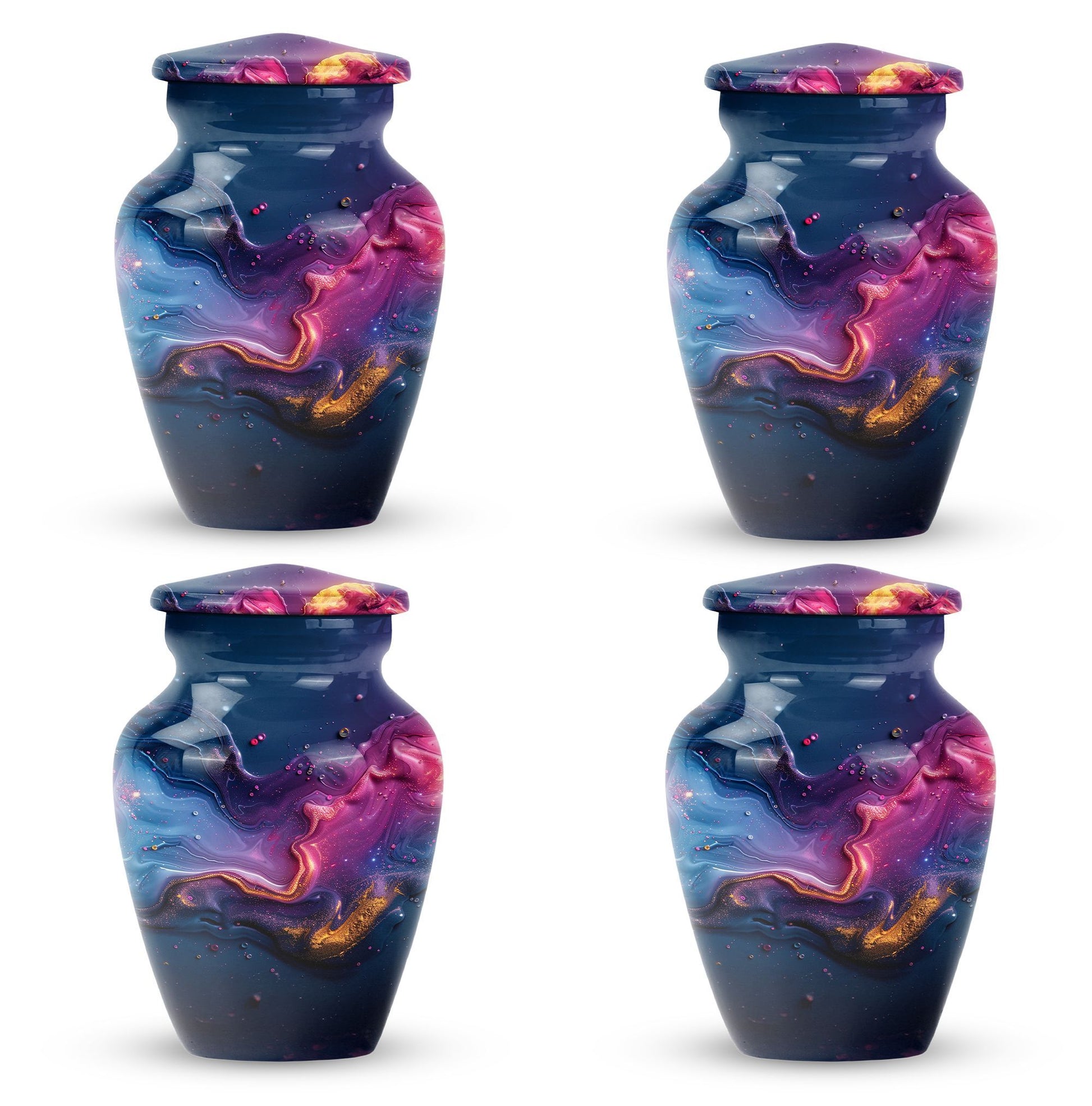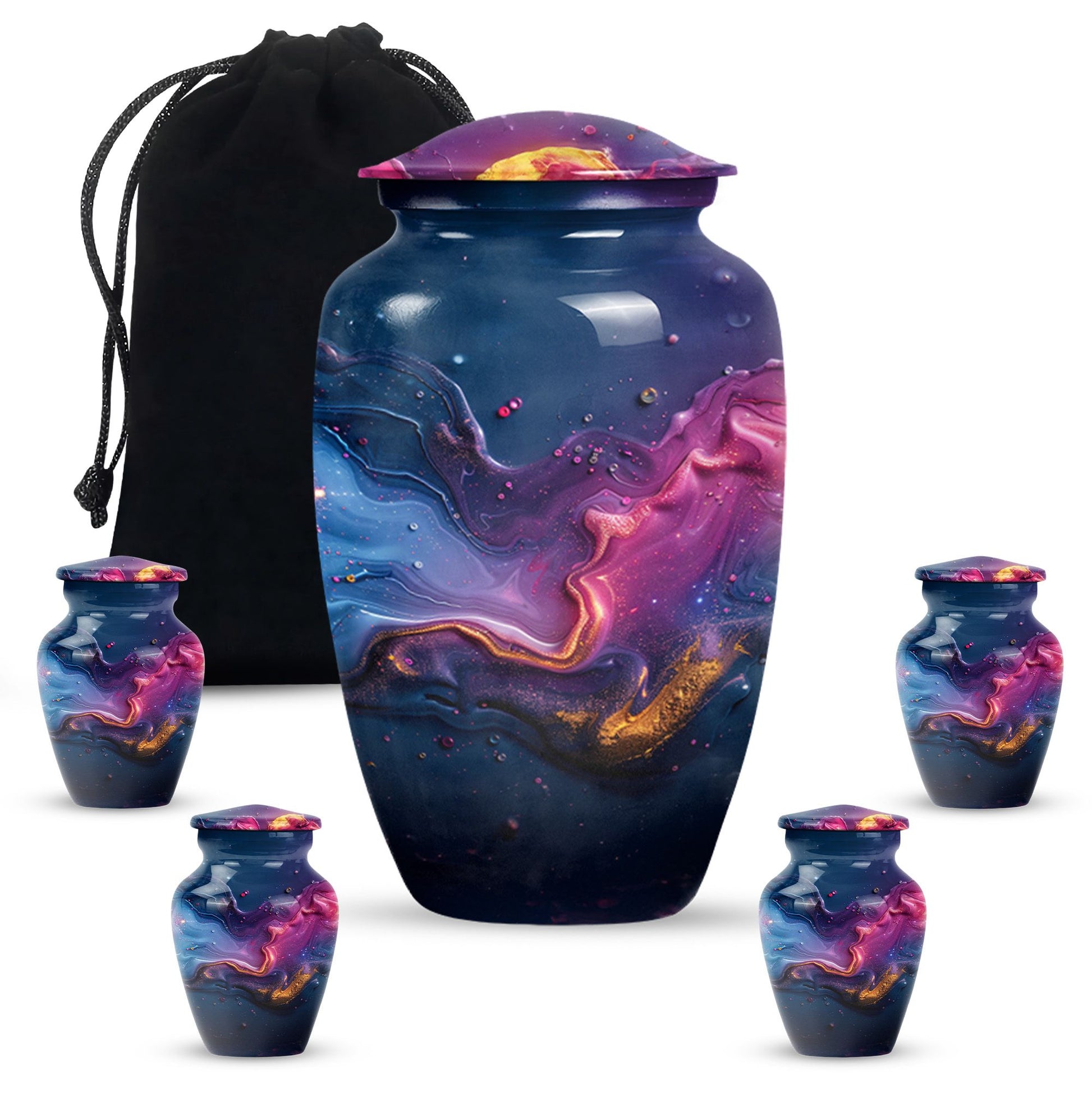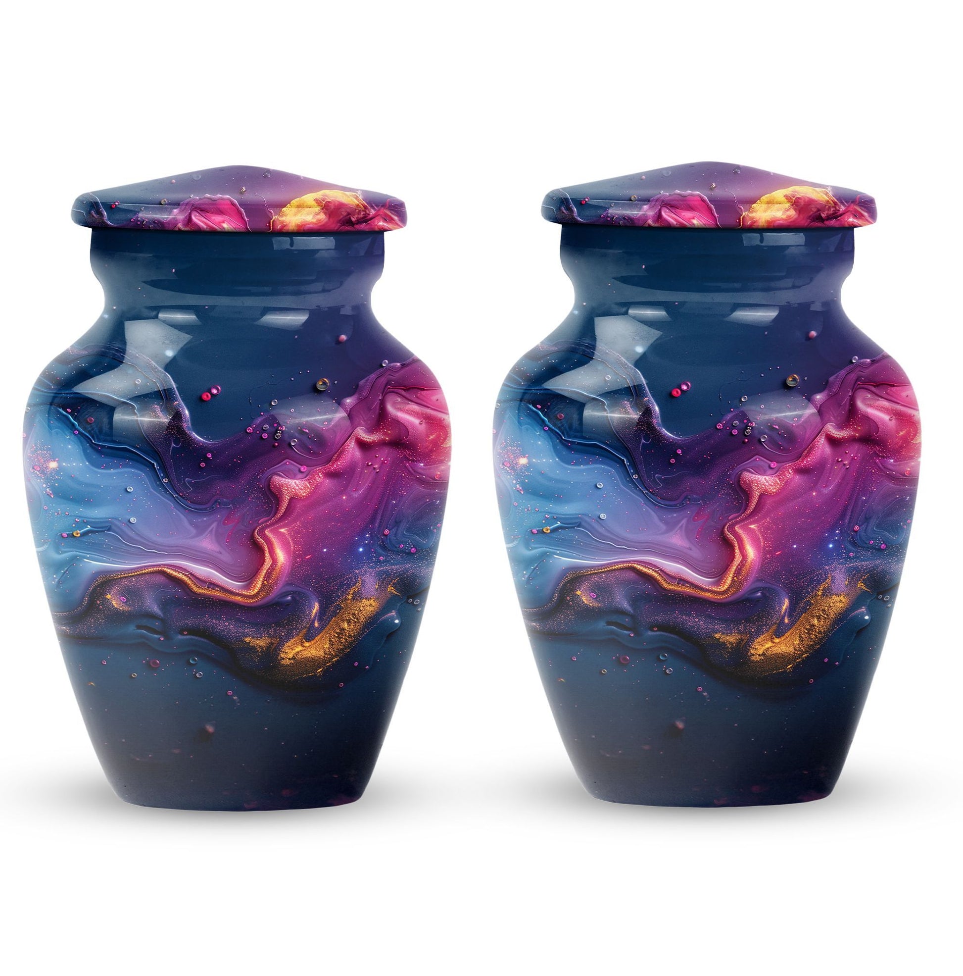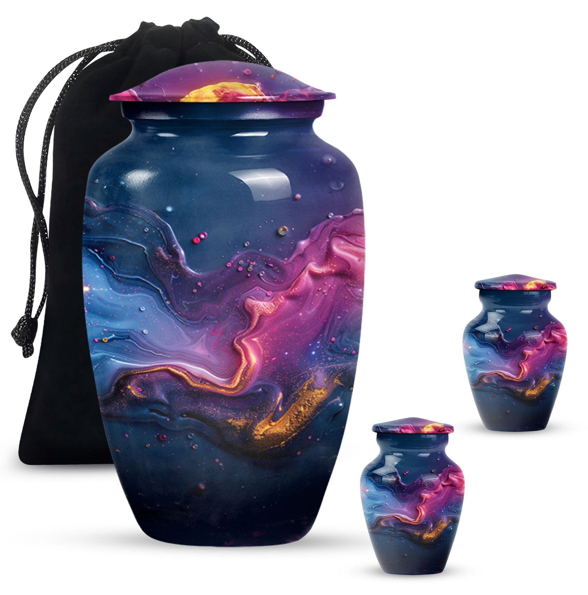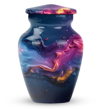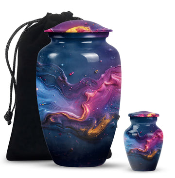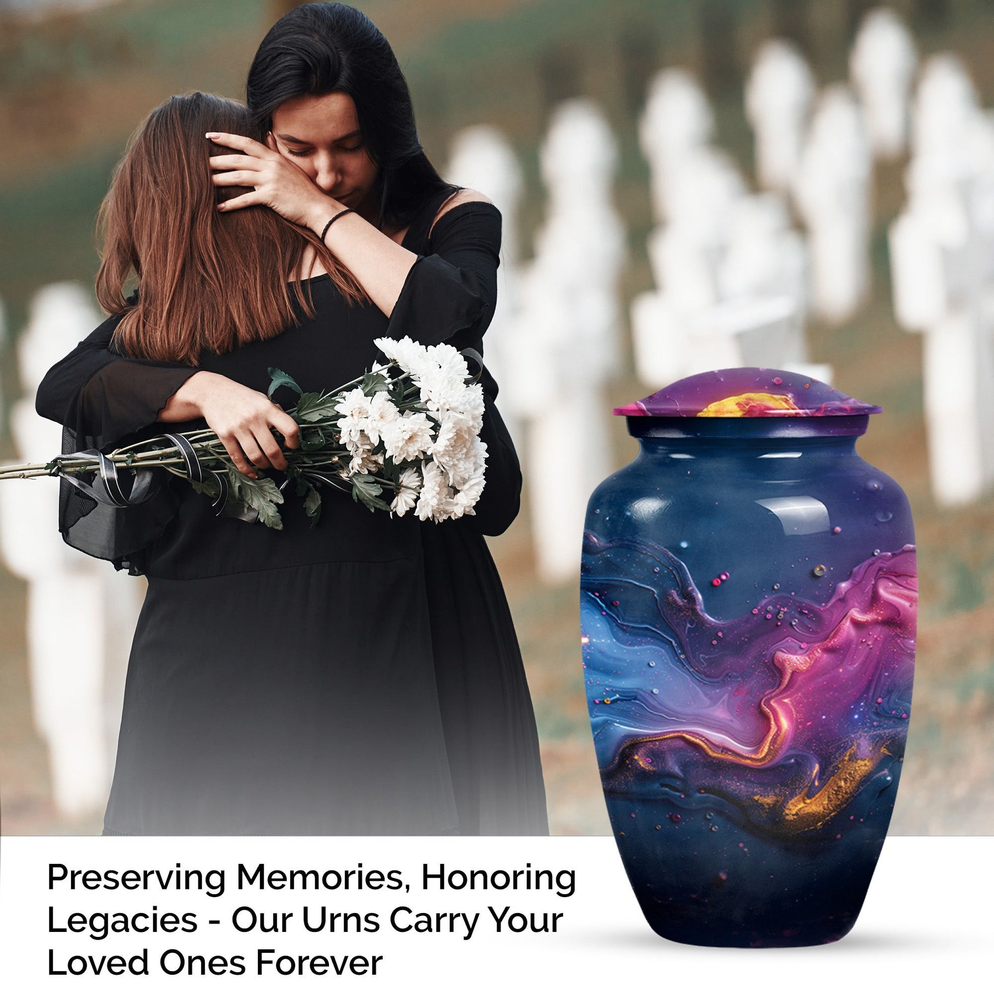 Crafted from sturdy aluminium, this large-size 10-inch Abstract Urn exhibits the perfect balance of abstract artistry and classic design. Created with a keen focus on quality, it weighs is 3.3 pounds, supporting a hefty capacity of 200 cubic inches. The notable attribute lies not just in its robust form, but also its capacity to personalize. Indeed, this captivating urn can be engraved with names, adding a significant touch to your valuable memorial. Despite size, it effortlessly fits into our velvet pouch for secure containment of ashes. A seamless blend of glamour and solemnity, our Funeral burial urn is the epitome of beauty, endurance, and provokes reminiscence, making it an ideal choice for funeral, burial situations or cremation ceremonies. Entwined within every detail, lies a story untouched by time. With words like 'memorial adult urn', 'human ash urns human ashes', 'ashes urn', and 'cremation containers for human ashes' to direct your search, locating this unique product becomes evocatively straightforward.