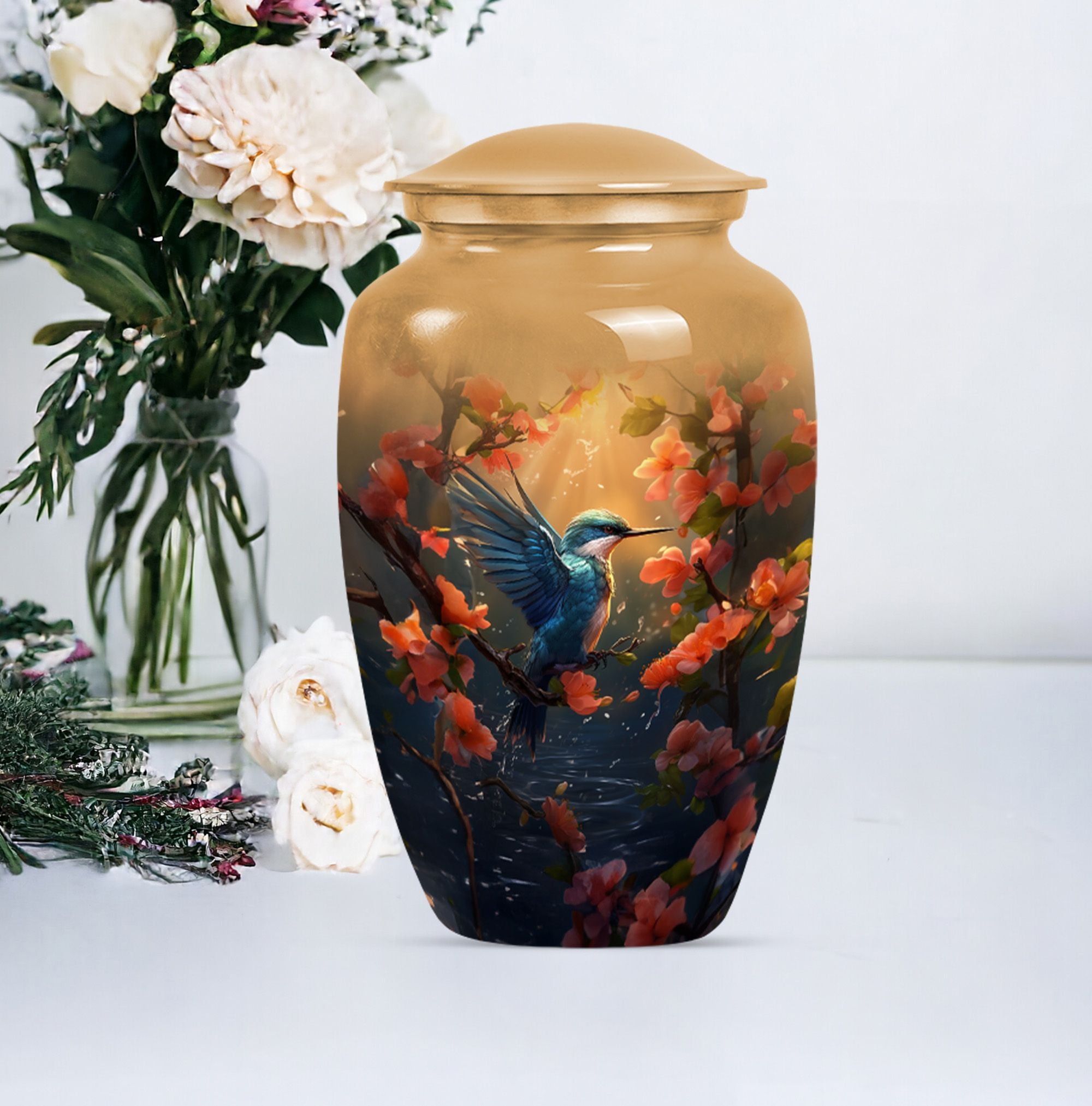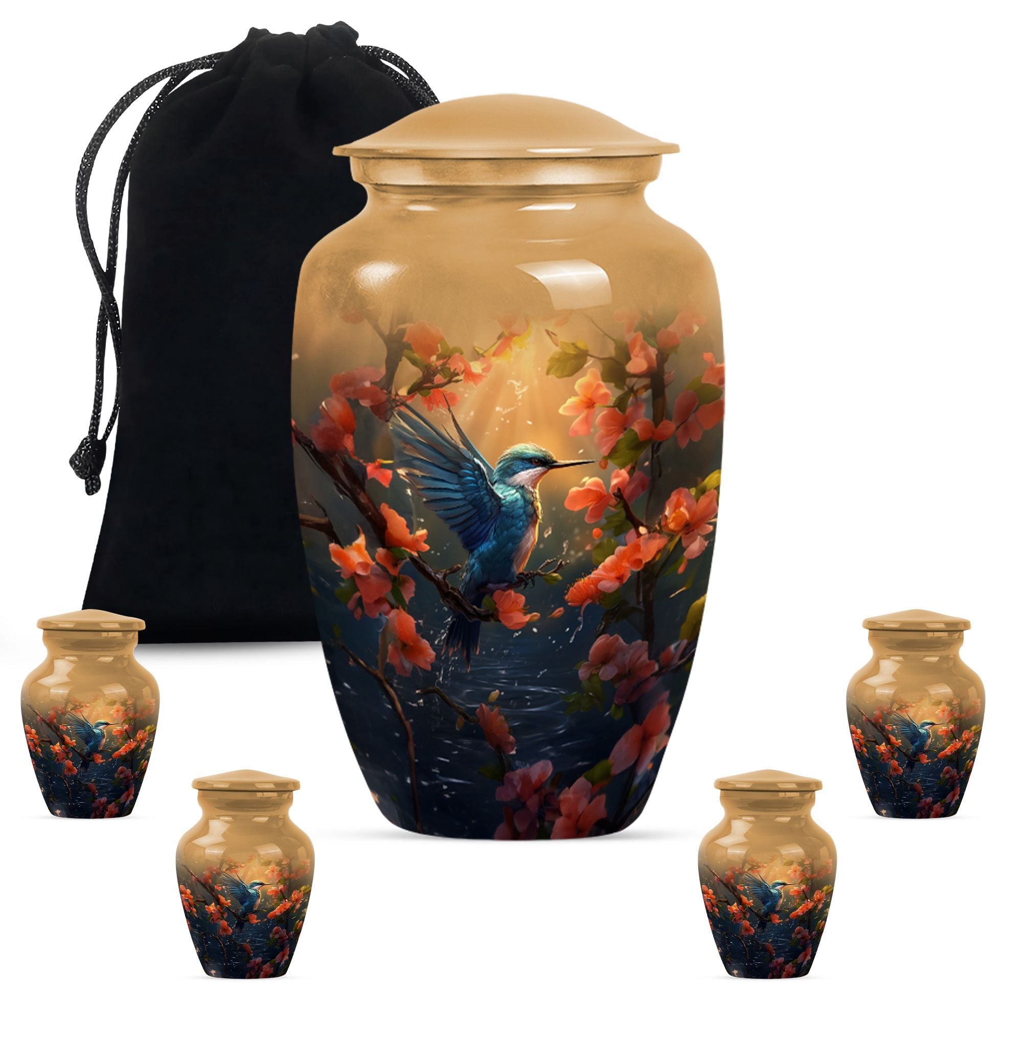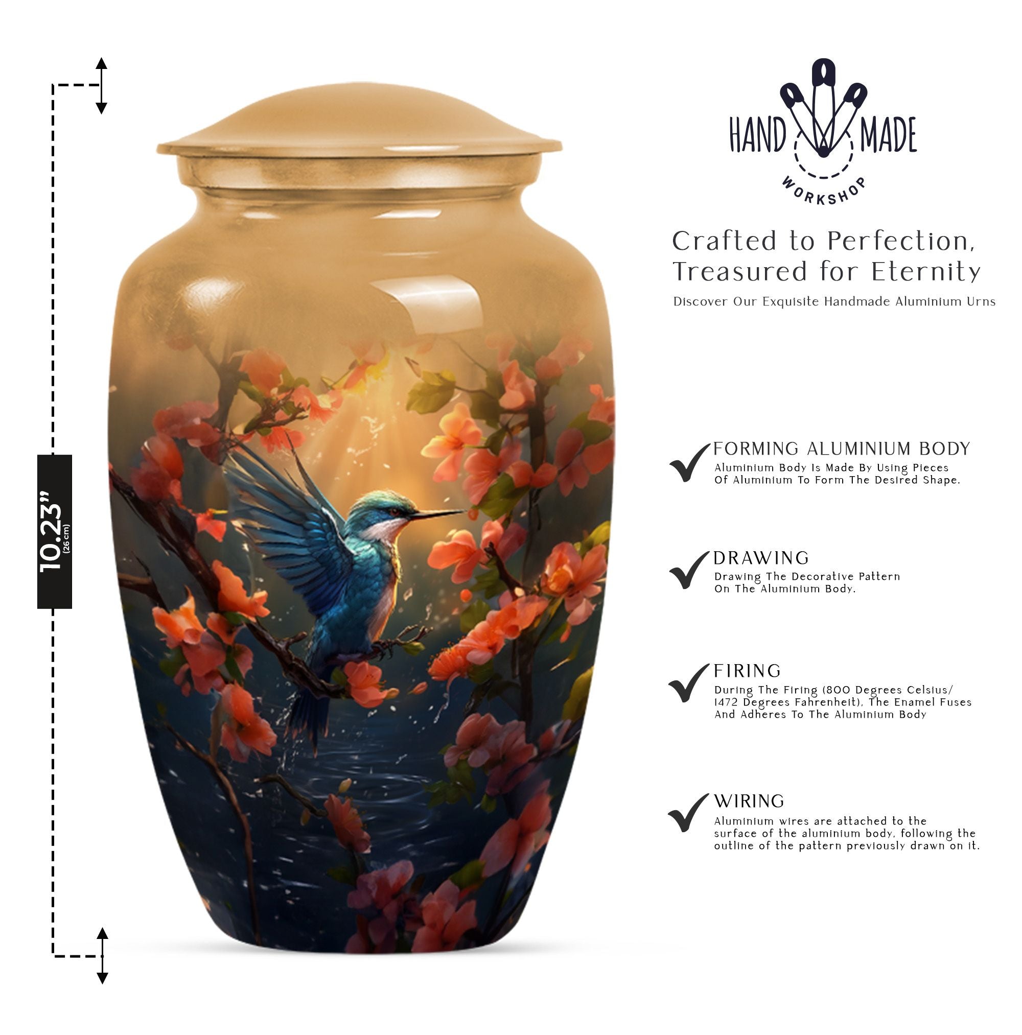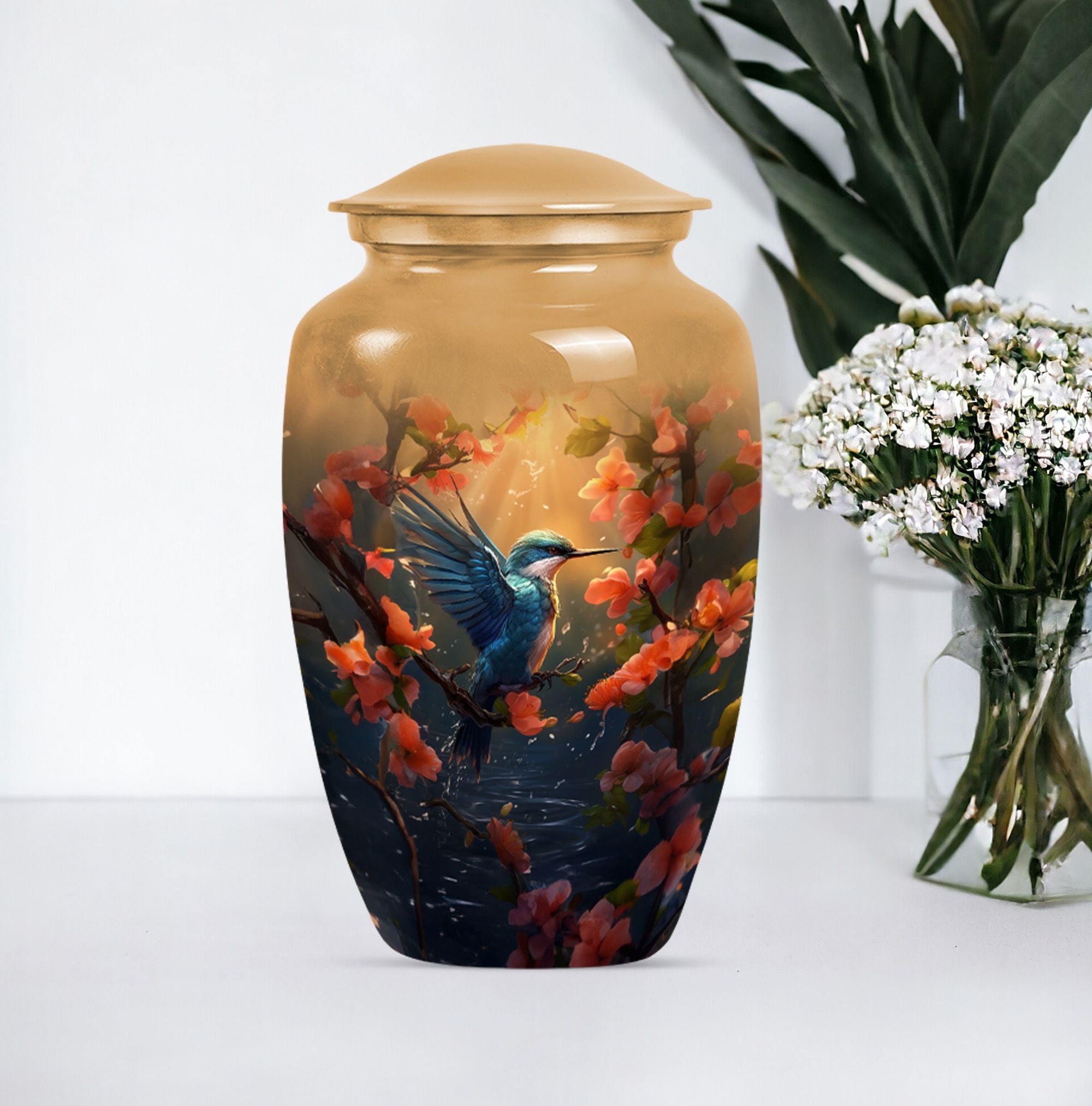 Honor the memory of your departed loved ones with our exquisite Humming Bird Urn, thoughtfully crafted for memorial purpose from high-grade aluminium exuding a classic aesthetic appeal. Measuring at a significant height of 10 inches and weighing 3.3 pounds, this large urn is suitable to hold 200 cubic inches of burial ashes. The urn portrays an abstract theme that represents the inexplicable essence of life and death in a serene way. To add a personal touch, you have the option to engrave names on it, making it a more intimate memorial piece. Our urn comes with a velvet pouch included in the package, ensuring convenient and dignified containment of ashes. The words 'cremation funeral urns' or 'urns for human cremation ashes' may feel heavy, but we believe in providing comfort and understanding during such times. Ideal for adults and seniors, our Humming Bird Urn offers a peaceful resting place for those that are forever in our hearts.
