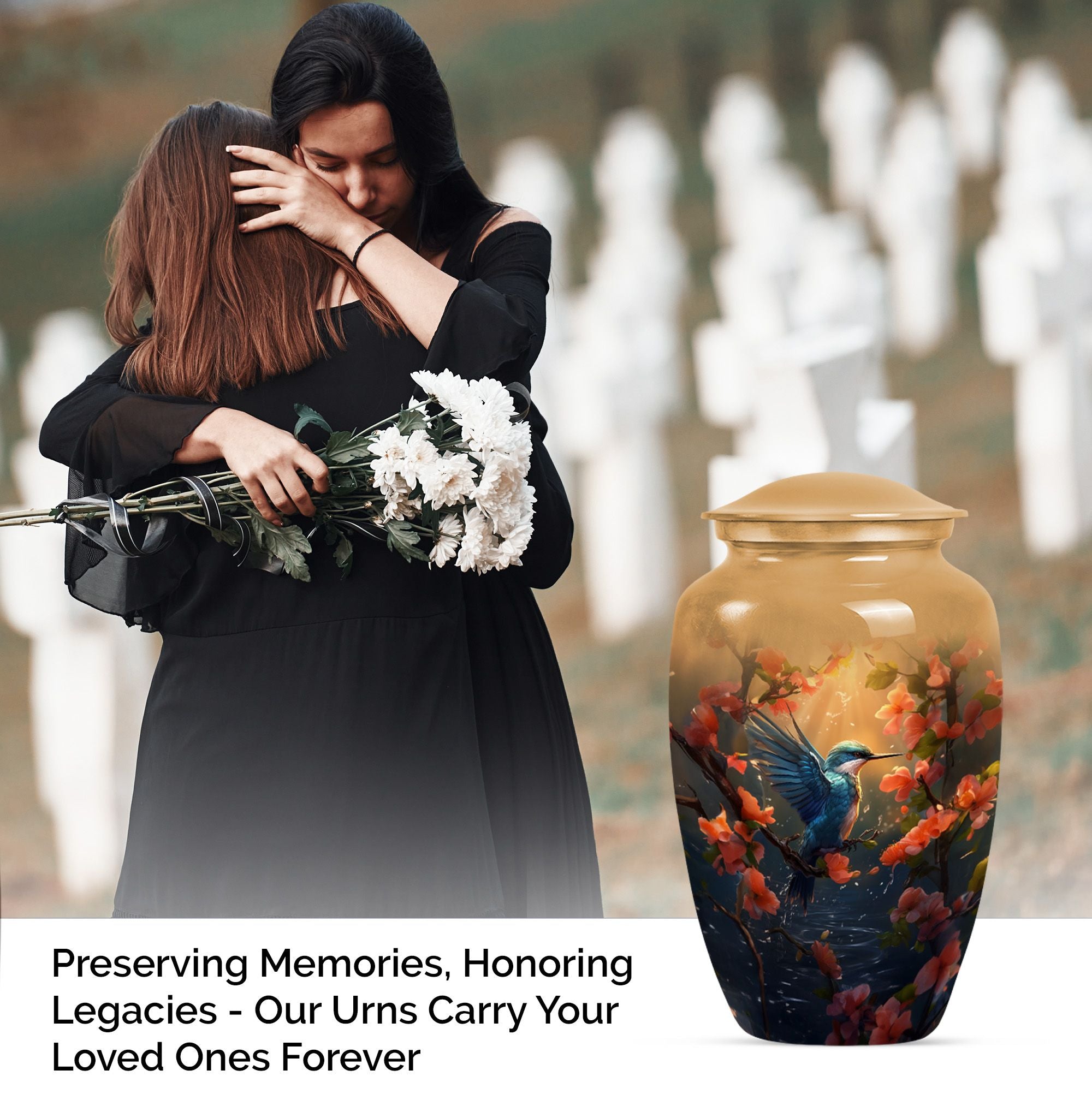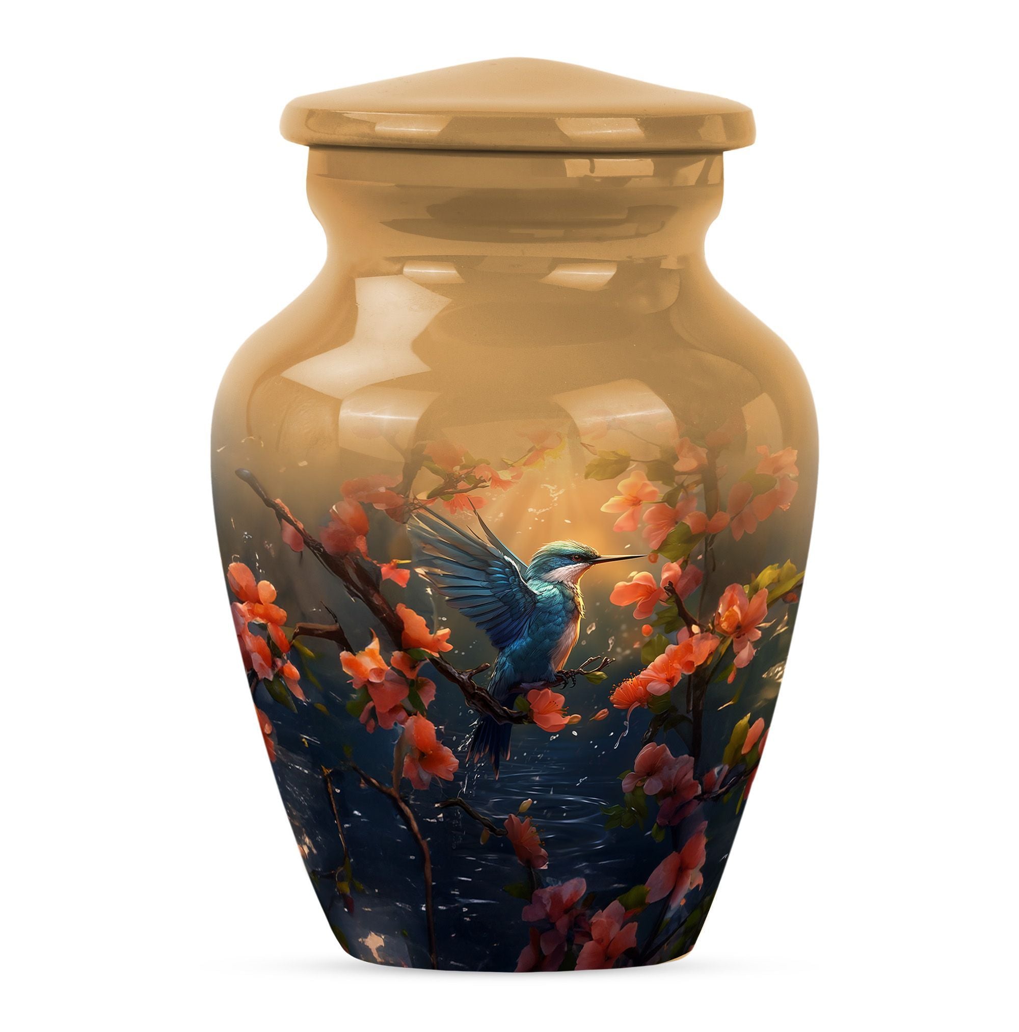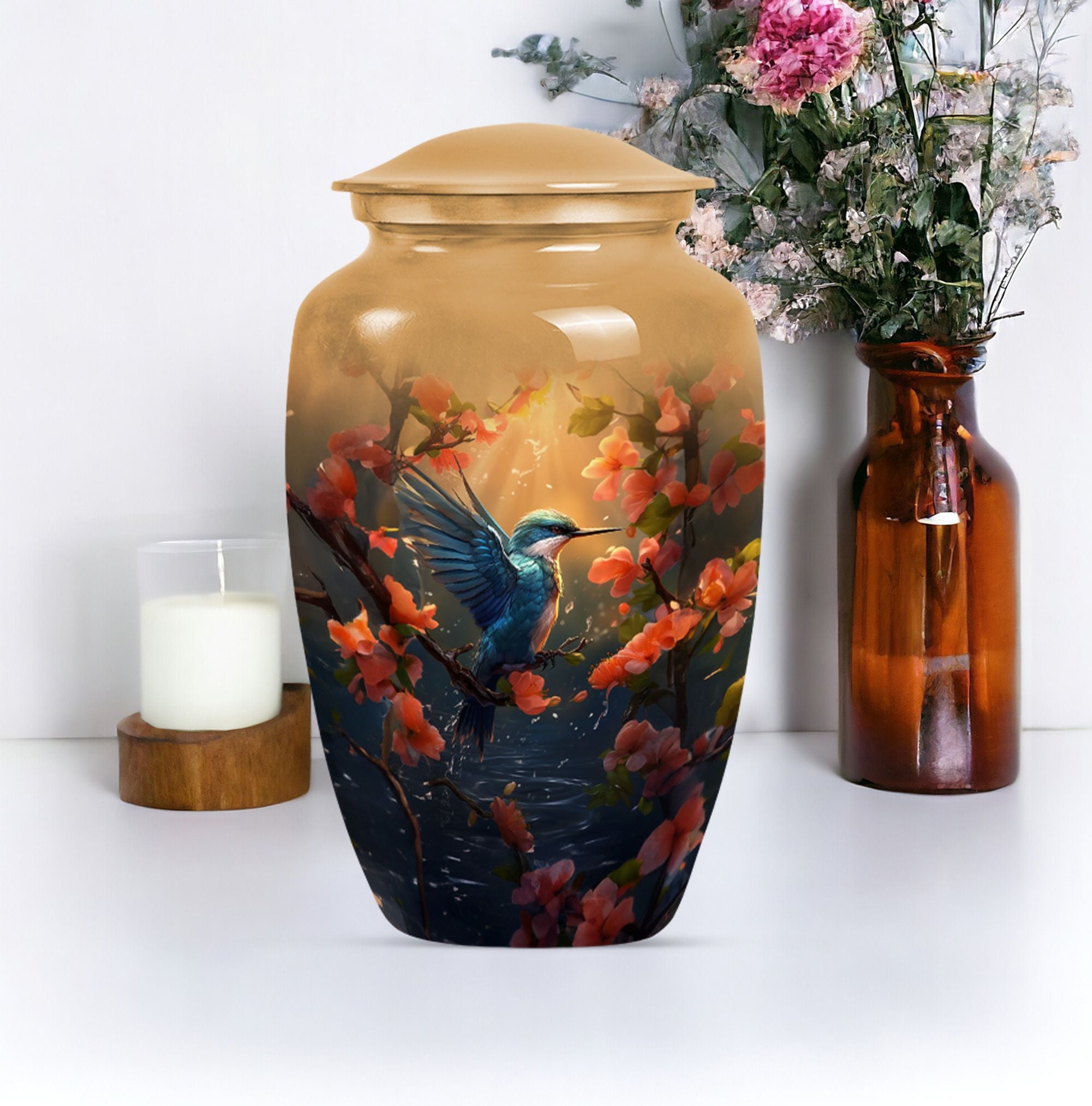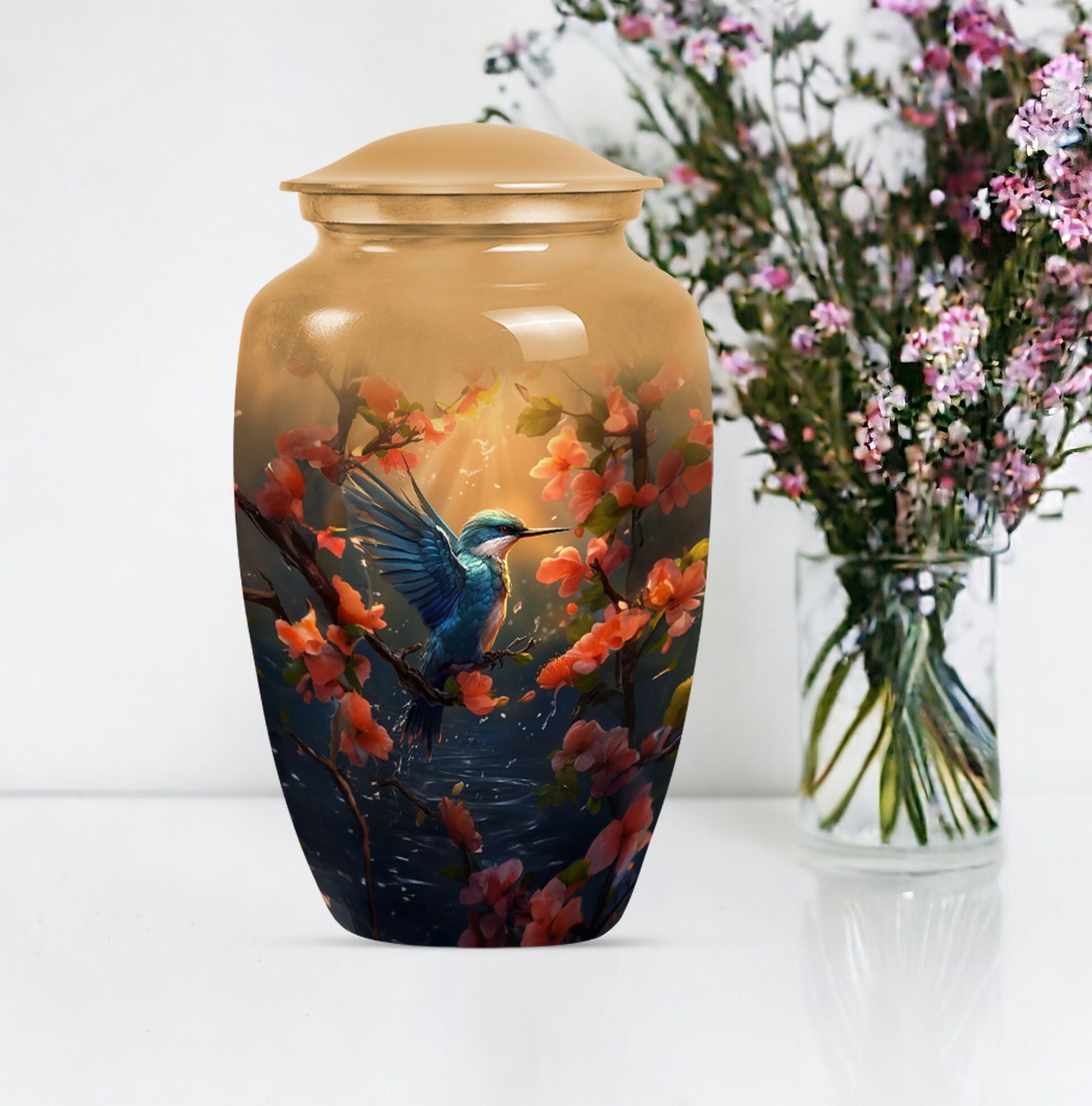 Honor the memory of your departed loved ones with our exquisite Humming Bird Urn, thoughtfully crafted for memorial purpose from high-grade aluminium exuding a classic aesthetic appeal. Measuring at a significant height of 10 inches and weighing 3.3 pounds, this large urn is suitable to hold 200 cubic inches of burial ashes. The urn portrays an abstract theme that represents the inexplicable essence of life and death in a serene way. To add a personal touch, you have the option to engrave names on it, making it a more intimate memorial piece. Our urn comes with a velvet pouch included in the package, ensuring convenient and dignified containment of ashes. The words 'cremation funeral urns' or 'urns for human cremation ashes' may feel heavy, but we believe in providing comfort and understanding during such times. Ideal for adults and seniors, our Humming Bird Urn offers a peaceful resting place for those that are forever in our hearts.