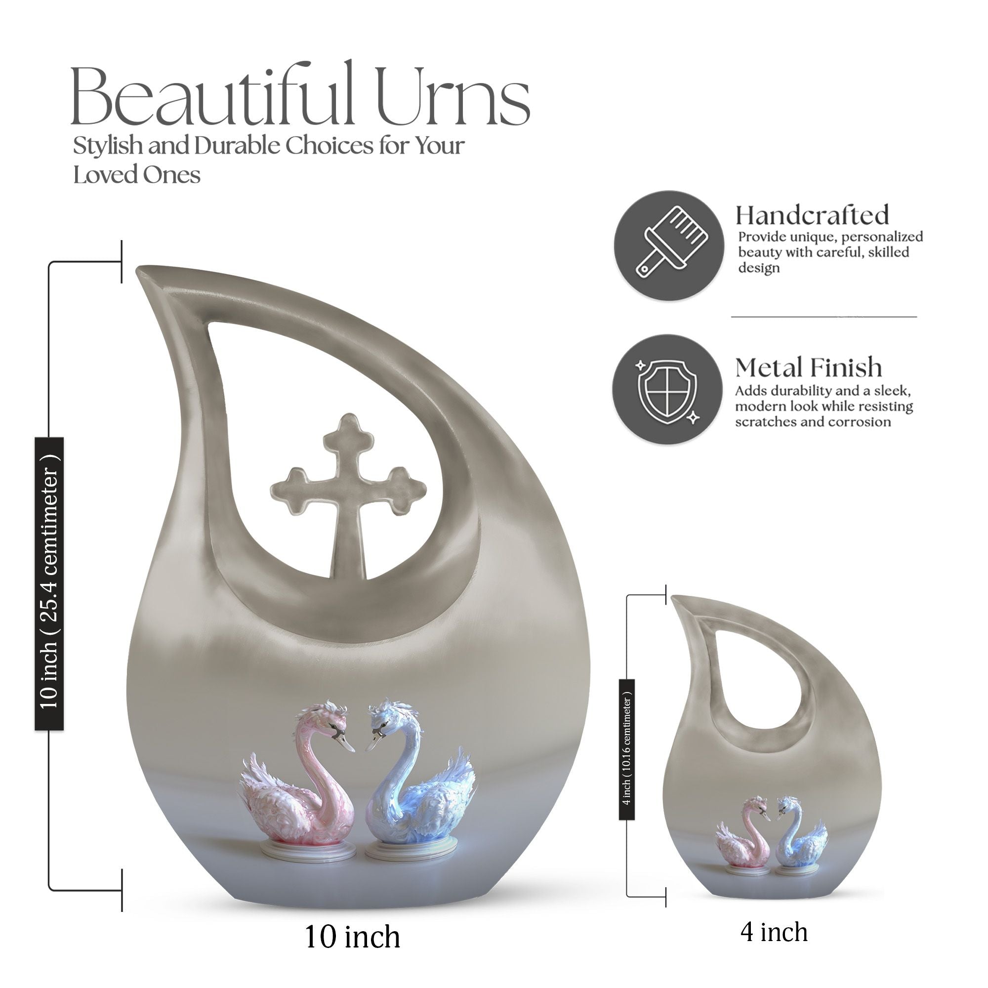 Serene and elegantly tasteful, the Iridescent Swan Duo Urn offers a unique and irreplaceable tribute in memory of your loved ones. Not just your ordinary memorial urns, this 10 Inch, 3.3 pounds, and 200 cubic inches capacity Aluminium urn is both substantial and visually enticing. Our Large urn is carefully designed with an ethereal 'Cross Drop' theme, portraying a stunning duo of swans, lending a tranquil and heartfelt symbol of love and companionship. Individuality is encouraged with the option to personalize the urn with engraved names, adding a heartfelt and unique touch to this timeless keepsake. Each urn comes with a velvet pouch for safe containment of ashes, underlining the intrinsic thoughtfulness incorporated into the design. As part of our Specialty Urns and Decorative Urns range, this urn is equally suitable as a Unique Urn for Dad. For a celebration of the extraordinary lives, lived and cherished, the Iridescent Swan Duo Urn offers an irreplaceable and dignified tribute.