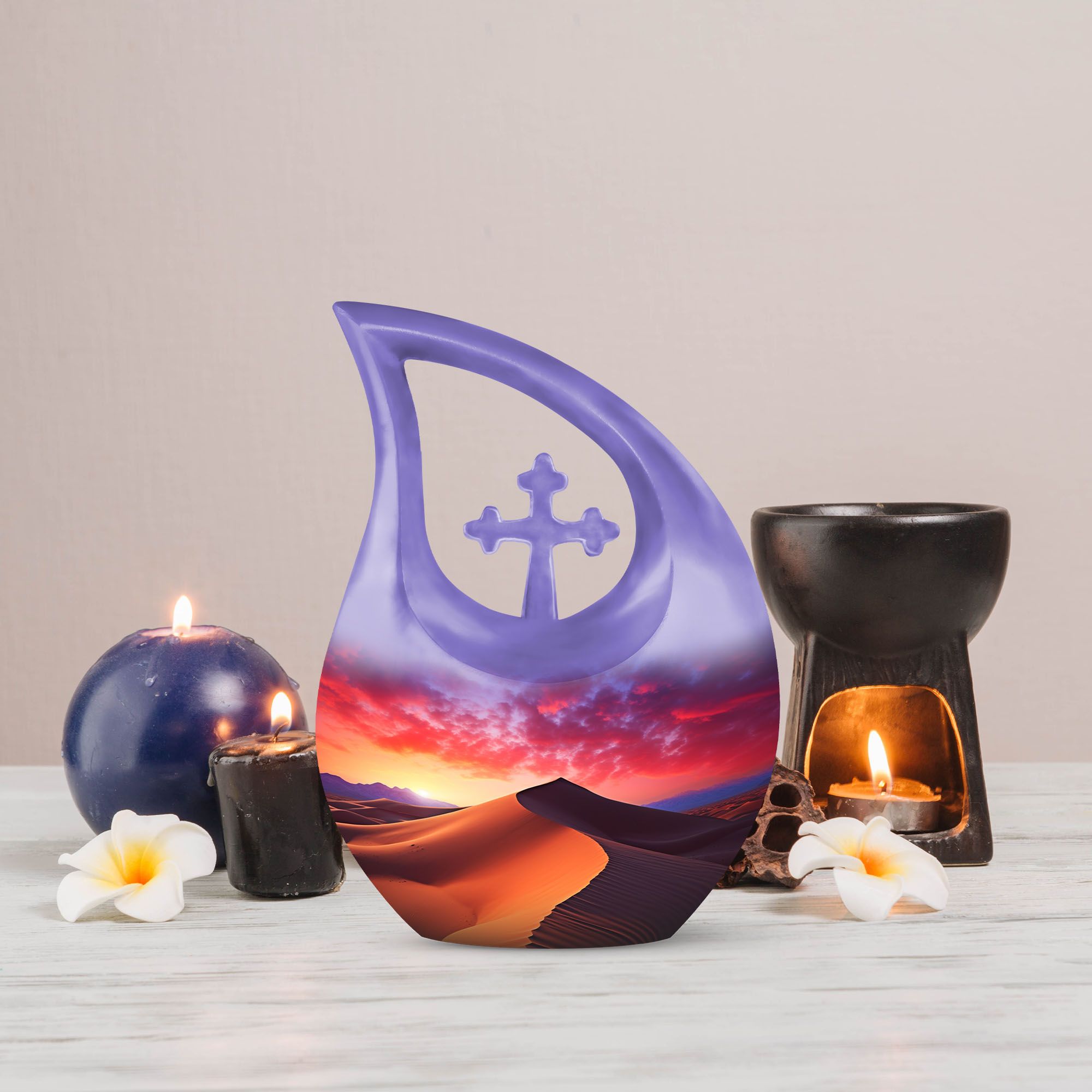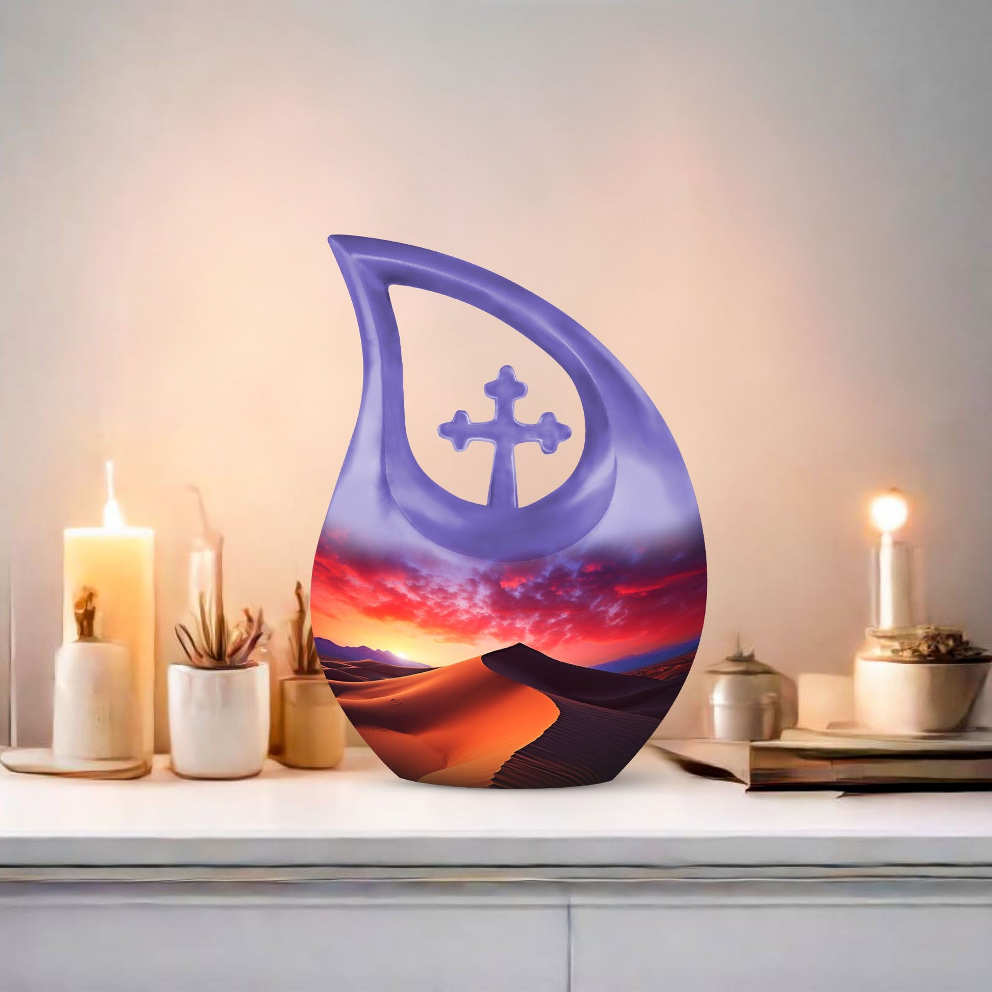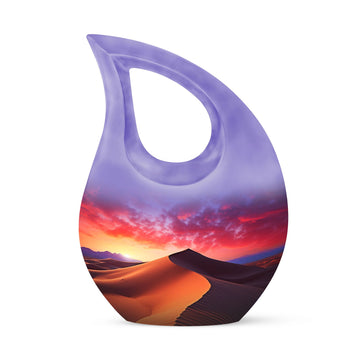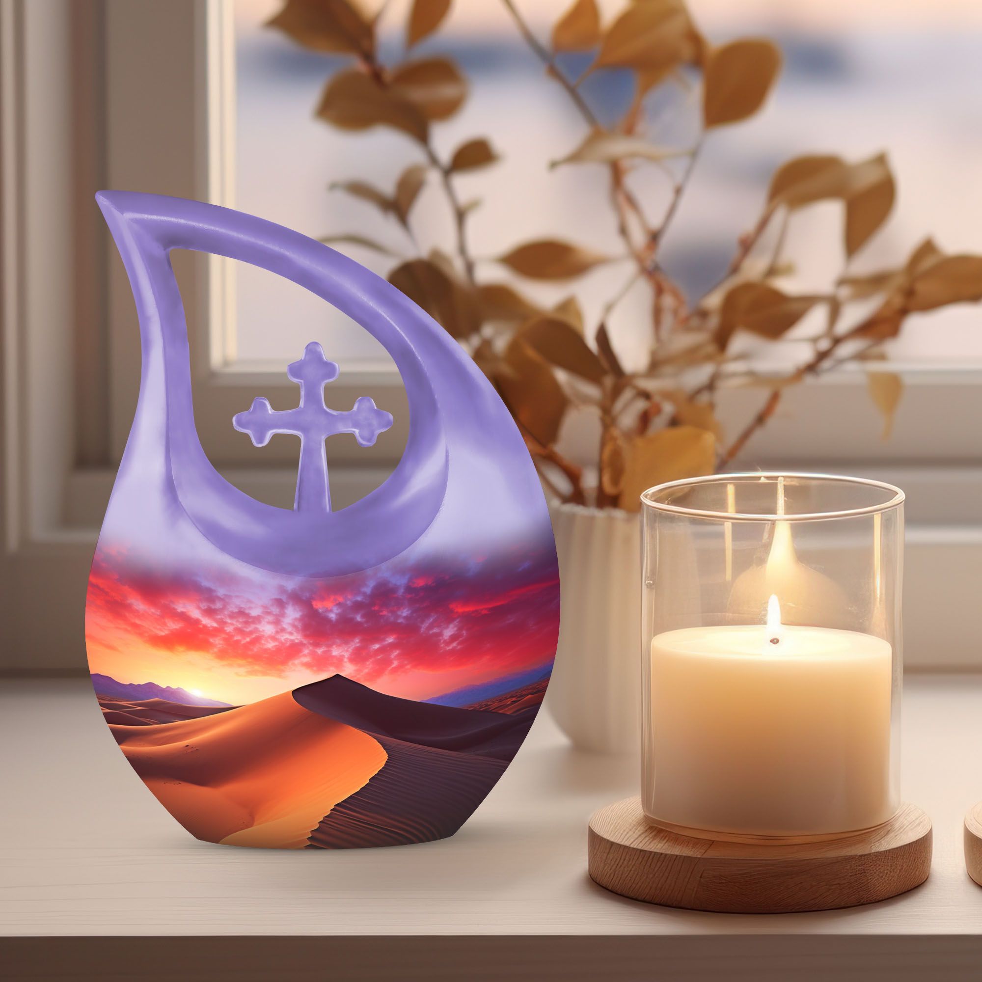 The Desert Funeral Urn for Ashes radiates warmth and peace, inspired by the rich purple tones of a desert sunset. This elegant urn serves as a heartfelt tribute to a beloved soul, perfect for both urns for adult female ashes and human urns for ashes adult male. Its design reflects serenity and strength — a symbol of love that endures beyond life’s horizon.