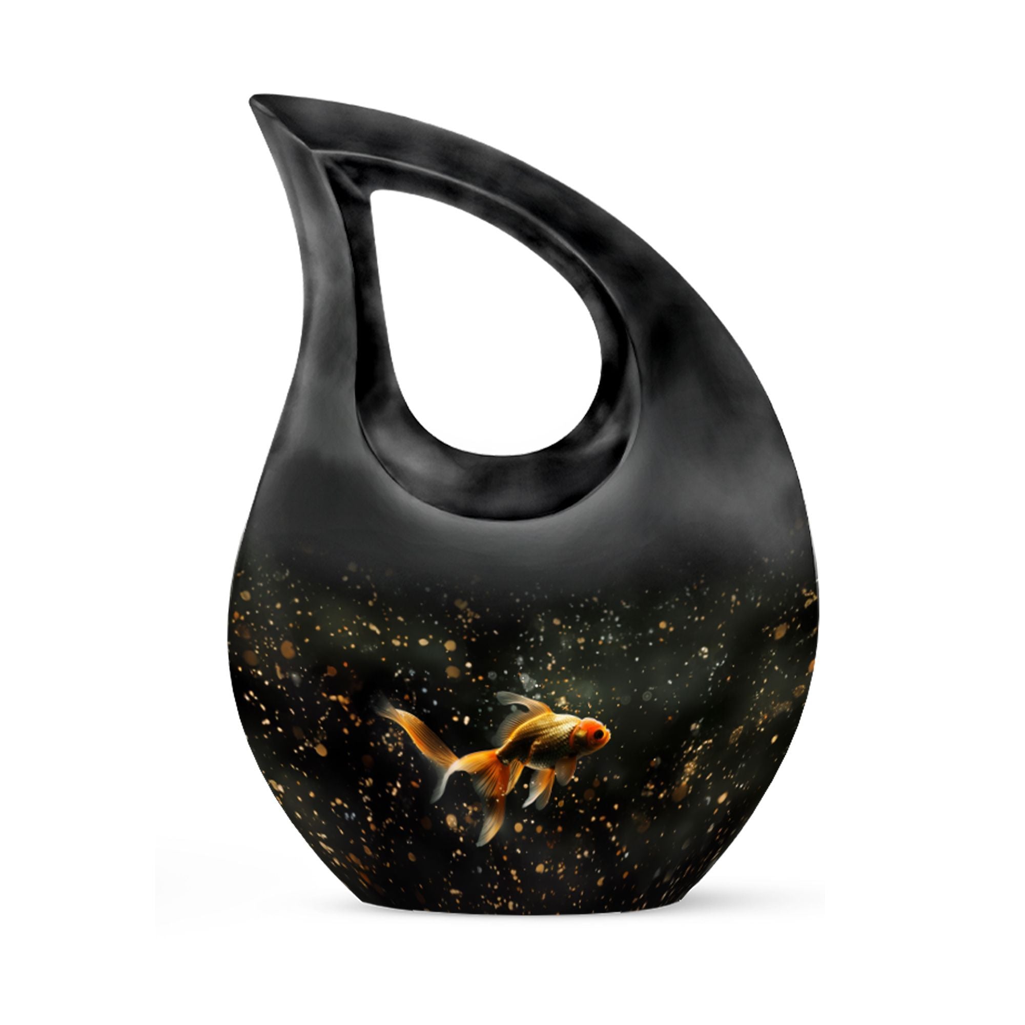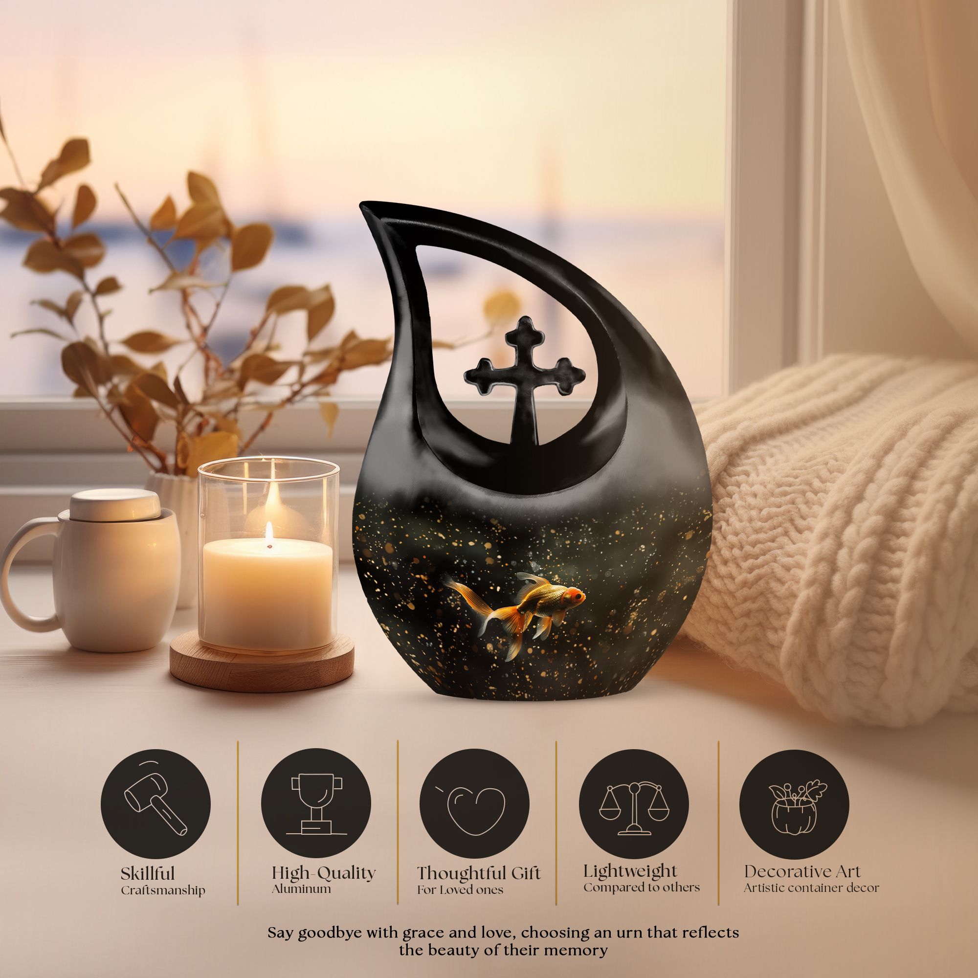 Reverently honor the memory of your loved one with our Golden Fish Urn, a stunning tribute crafted with great care. Generously sized at 10 inches, it weighs a solid 3.3 pounds, while also providing a capacity of 200 cubic inches. Constructed from high-quality aluminium, this large cremation urn strikes a balance of durability and beauty. The remarkable theme inspired by goldfish brings a comforting sense of peace and tranquility. The urn comes with a plush velvet pouch, ensuring a respectful containment for the ashes. You can also choose to further personalize this urn with engraved names, adding a deeply personal touch to the memorial. This affordable, biodegradable urn resonates with simplicity and profound respect, making it an ideal pick for both cremation ashes and burial ceremonies. Remember to search for 'Gold Fish urn', 'affordable cremation and burial urn', or 'memorial urns' to easily find this product on your next online shopping venture.