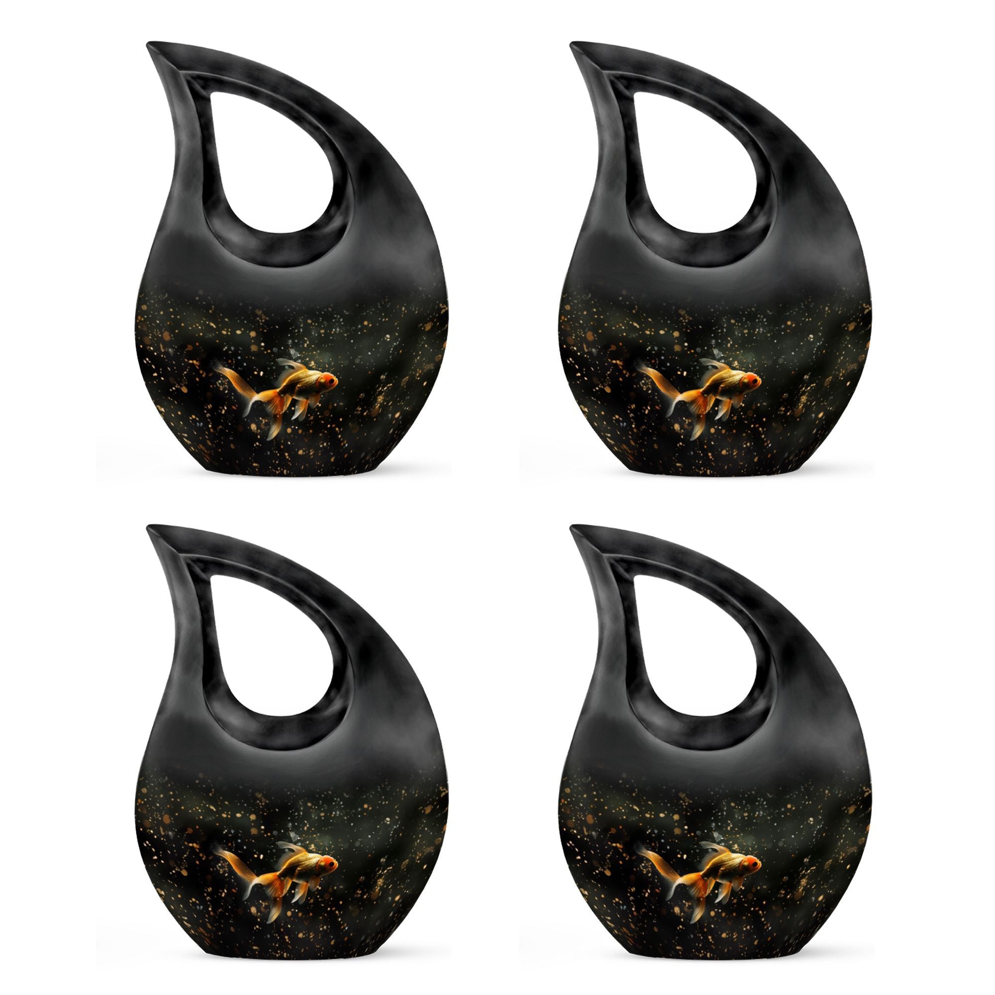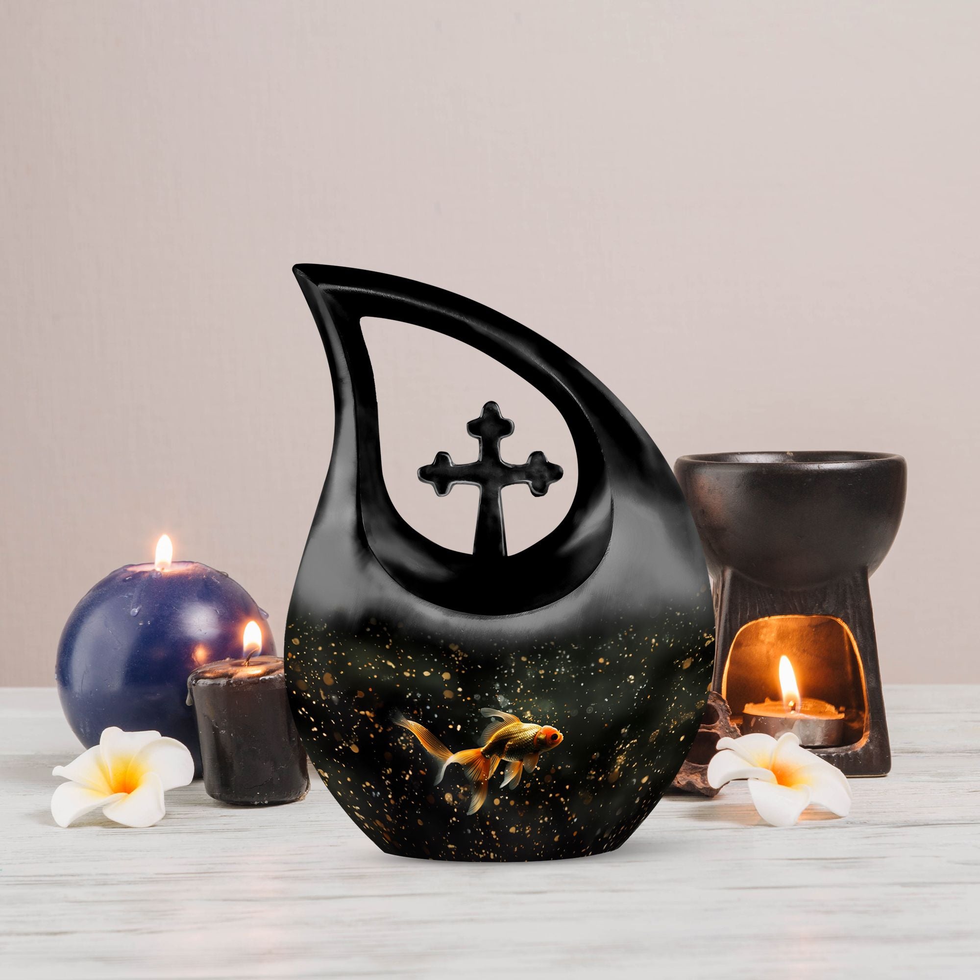 Reverently honor the memory of your loved one with our Golden Fish Urn, a stunning tribute crafted with great care. Generously sized at 10 inches, it weighs a solid 3.3 pounds, while also providing a capacity of 200 cubic inches. Constructed from high-quality aluminium, this large cremation urn strikes a balance of durability and beauty. The remarkable theme inspired by goldfish brings a comforting sense of peace and tranquility. The urn comes with a plush velvet pouch, ensuring a respectful containment for the ashes. You can also choose to further personalize this urn with engraved names, adding a deeply personal touch to the memorial. This affordable, biodegradable urn resonates with simplicity and profound respect, making it an ideal pick for both cremation ashes and burial ceremonies. Remember to search for 'Gold Fish urn', 'affordable cremation and burial urn', or 'memorial urns' to easily find this product on your next online shopping venture.