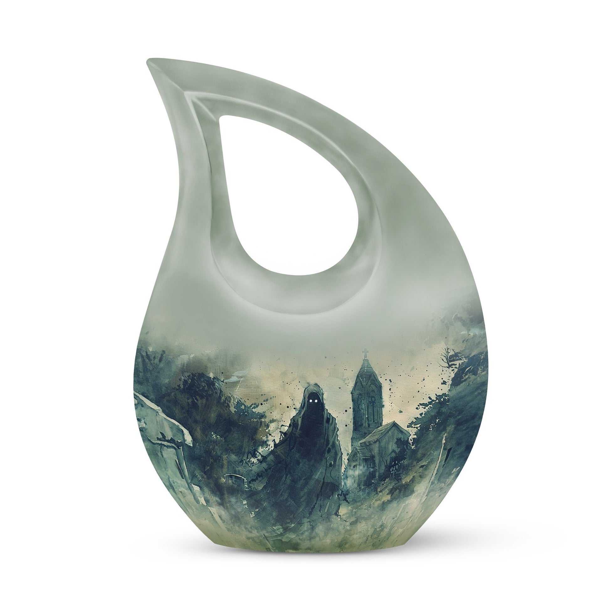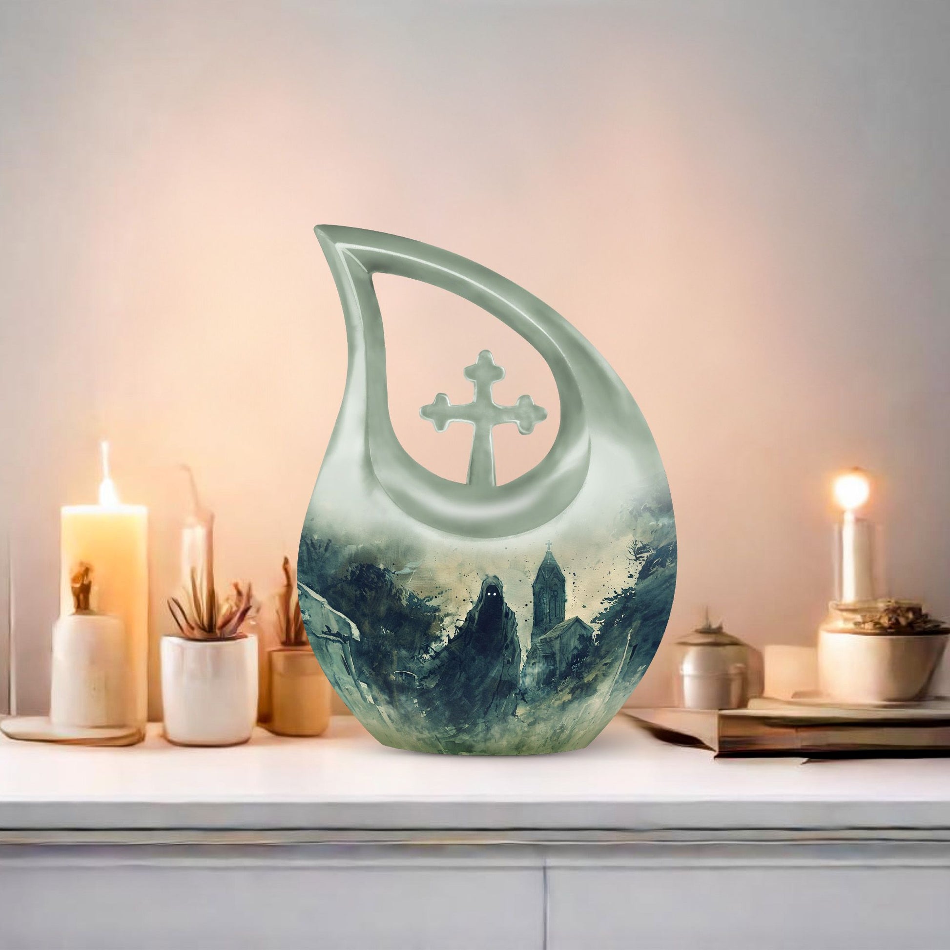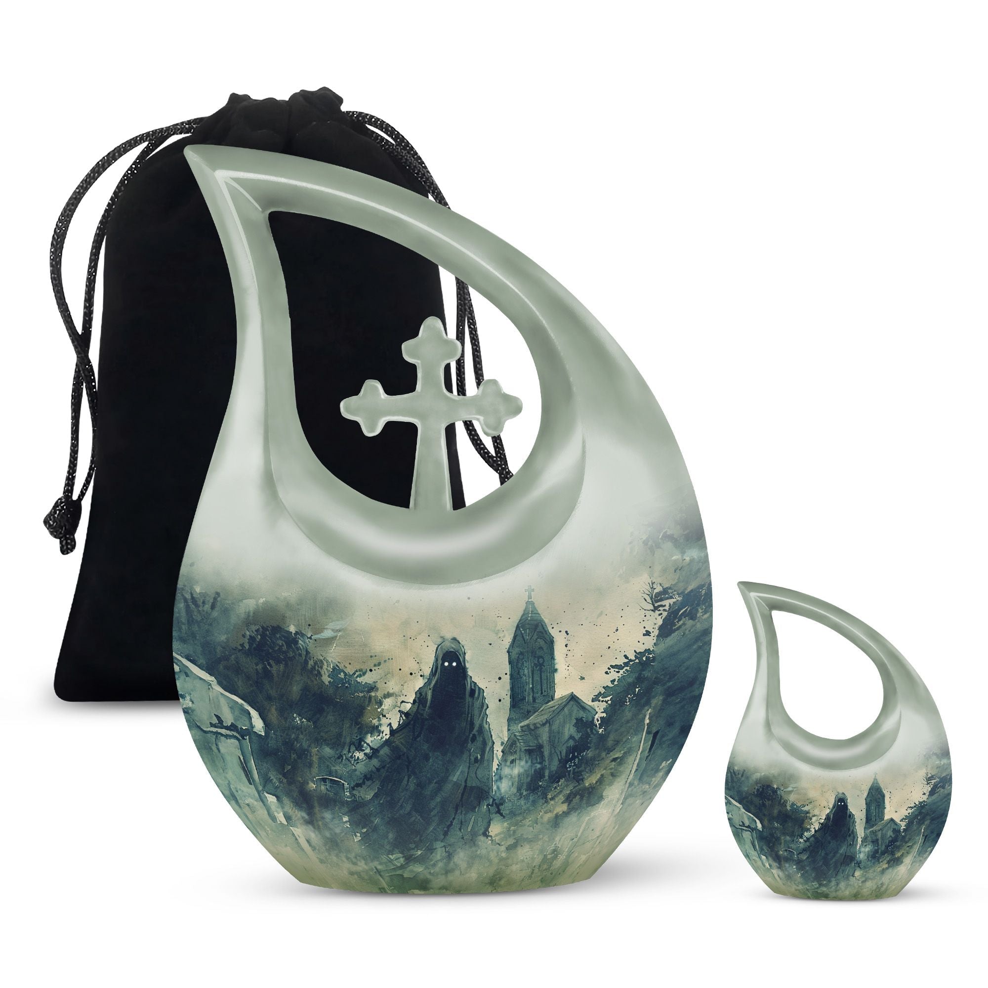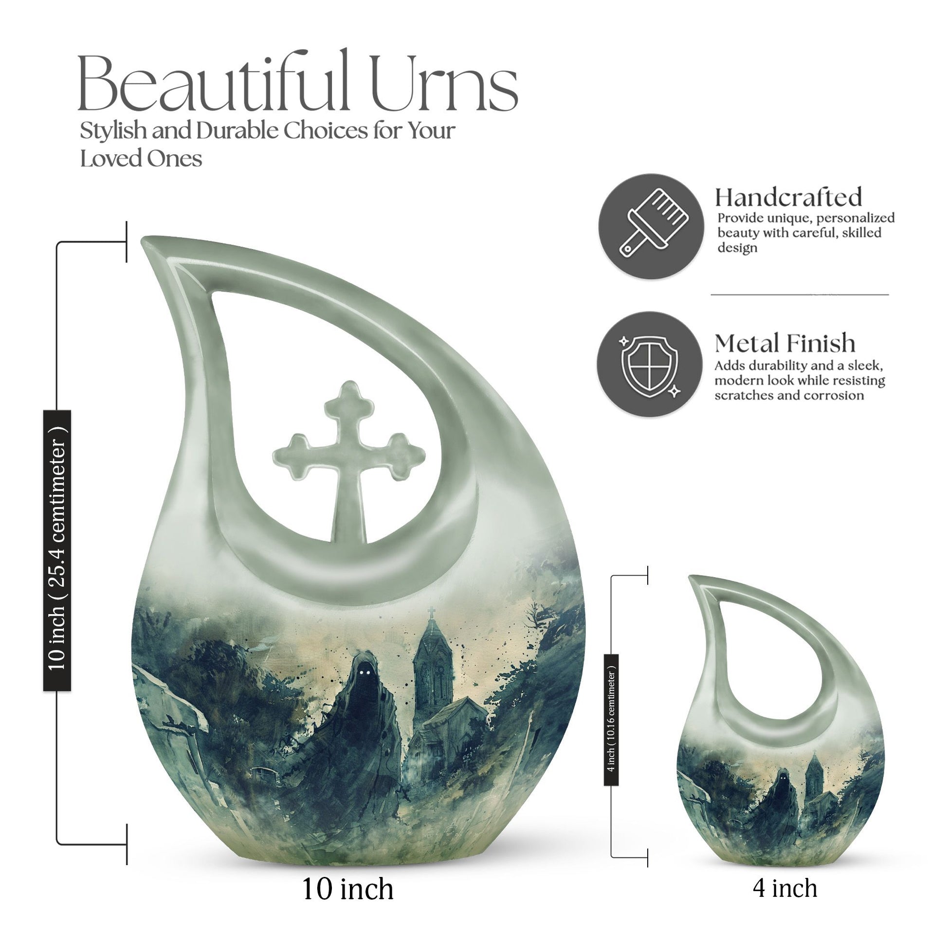 Part of our Ethereal Haunt collection, this large urn carries an air of solemn dignity, perfect for memorializing loved ones departed. It's a wonderful addition to any collection of memorial urns, adding a note of distinctiveness. The Cross Drop design brings forth unseen details in a meticulous manner, adding an air of grace and respect. This extraordinary 10-Inch urn is constructed with high-quality Aluminium, assuring its durability and long lifespan. At a weight of 3.3 pounds, its presence carries substantial weight both emotionally and physically. The dimensions affirm its immense capacity of 200 cubic inches, making it an excellent choice for both 'Mother's ashes' or 'Dad’s ashes'. Alongside this large urn, a velvet pouch is provided for the respectful containment of ashes. The urn offers a unique customization option, where you can personalize with engraved names, lending a more intimate touch to your memory. This 'Ethereal Haunt Urn' along with other related products like 'Extra Large Companion Urns', and 'Small Urns for Dad' are perfect examples of our commitment to preserving memories beautifully.