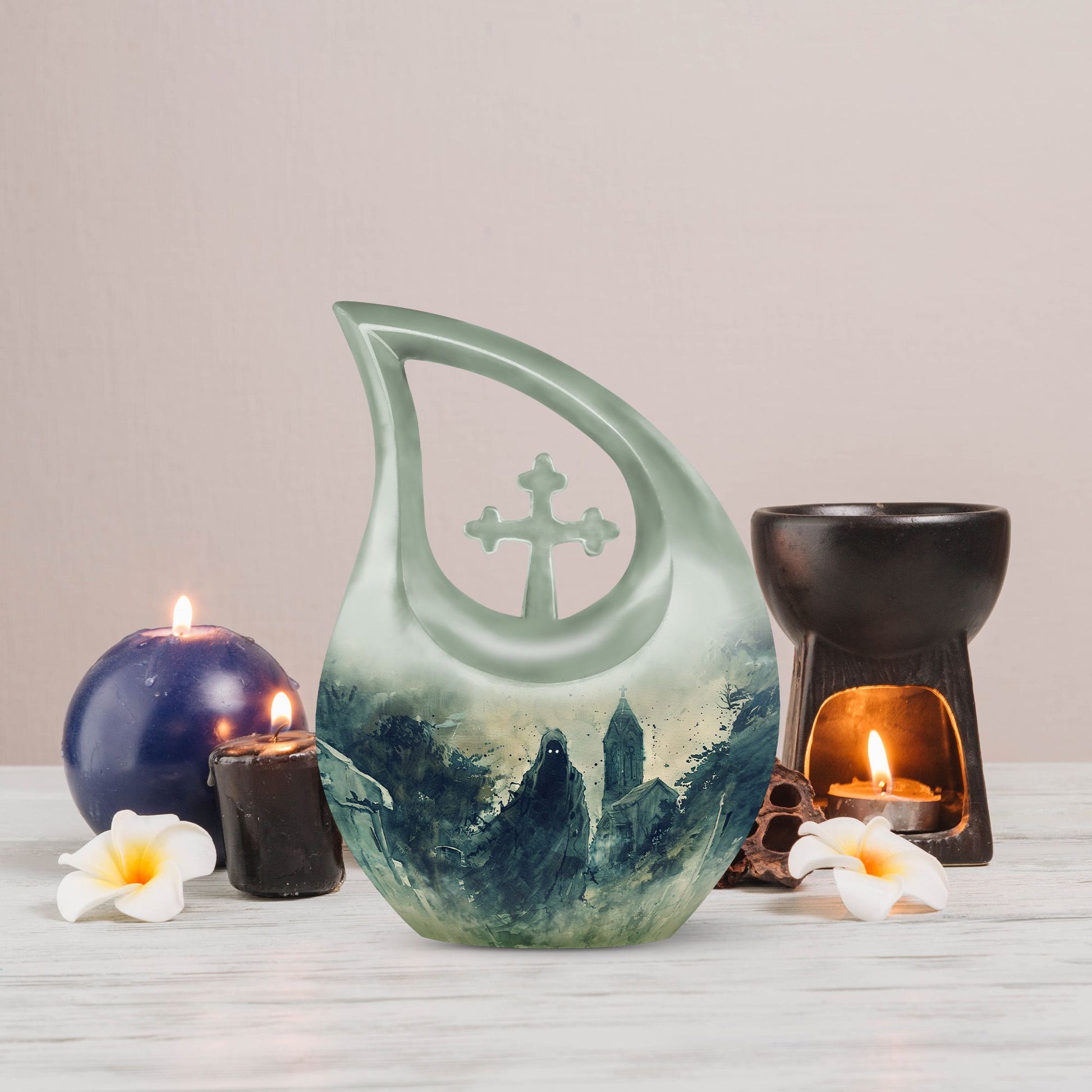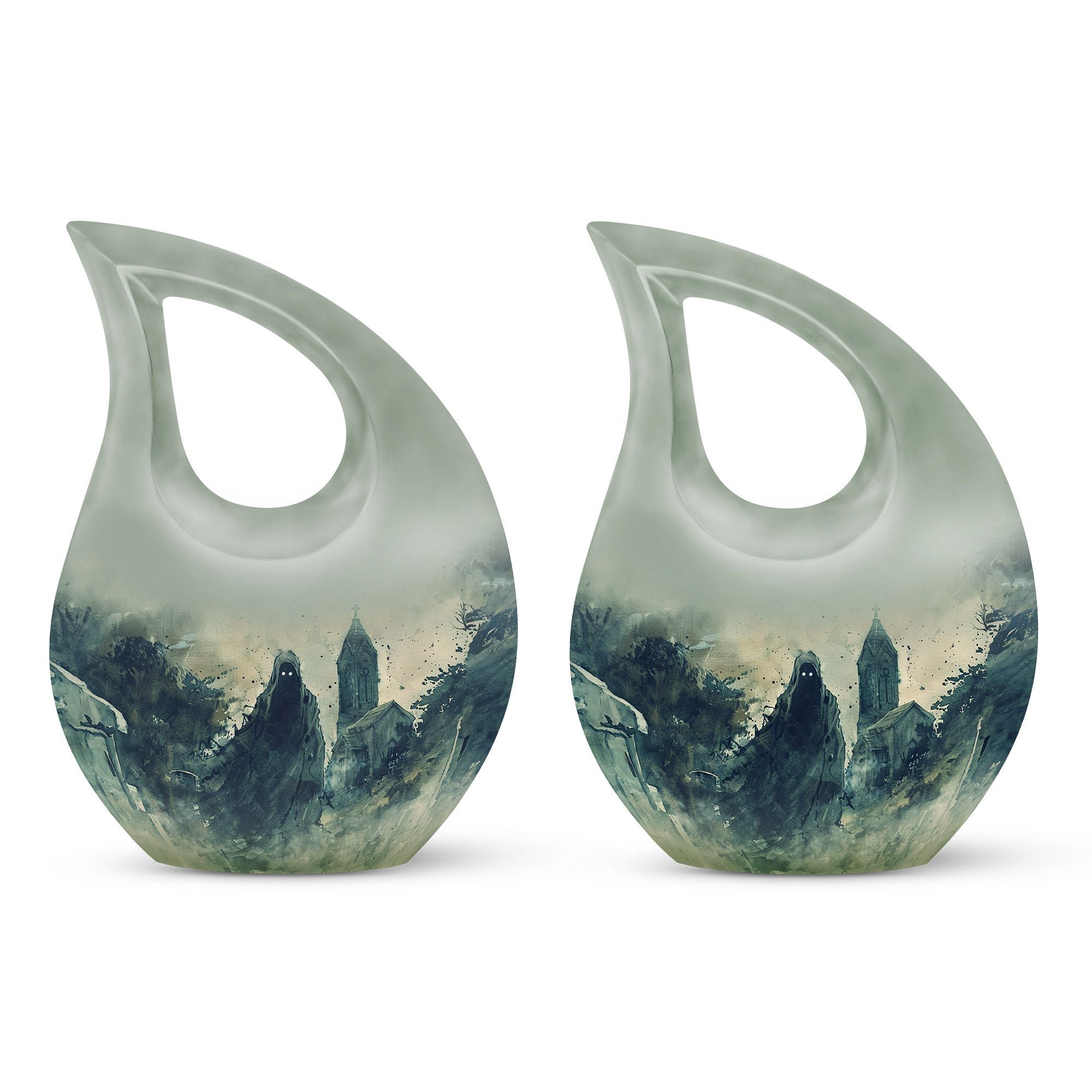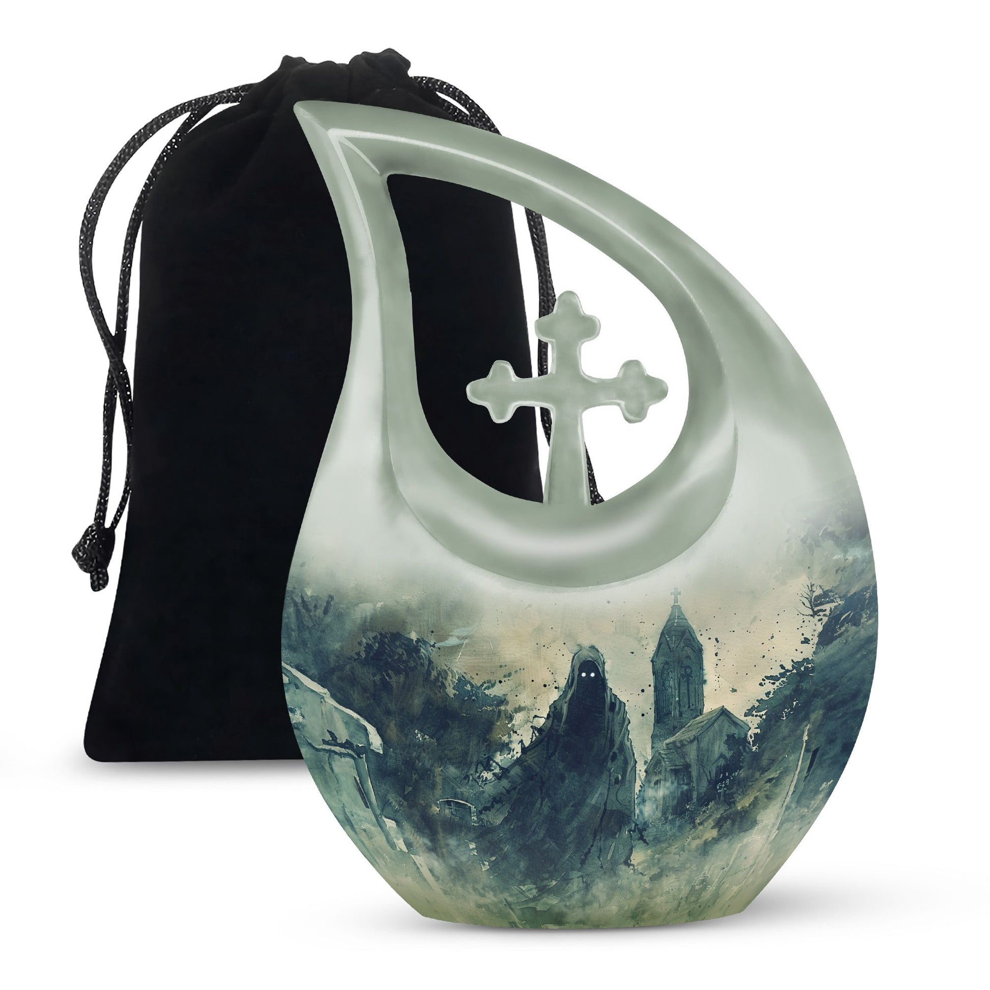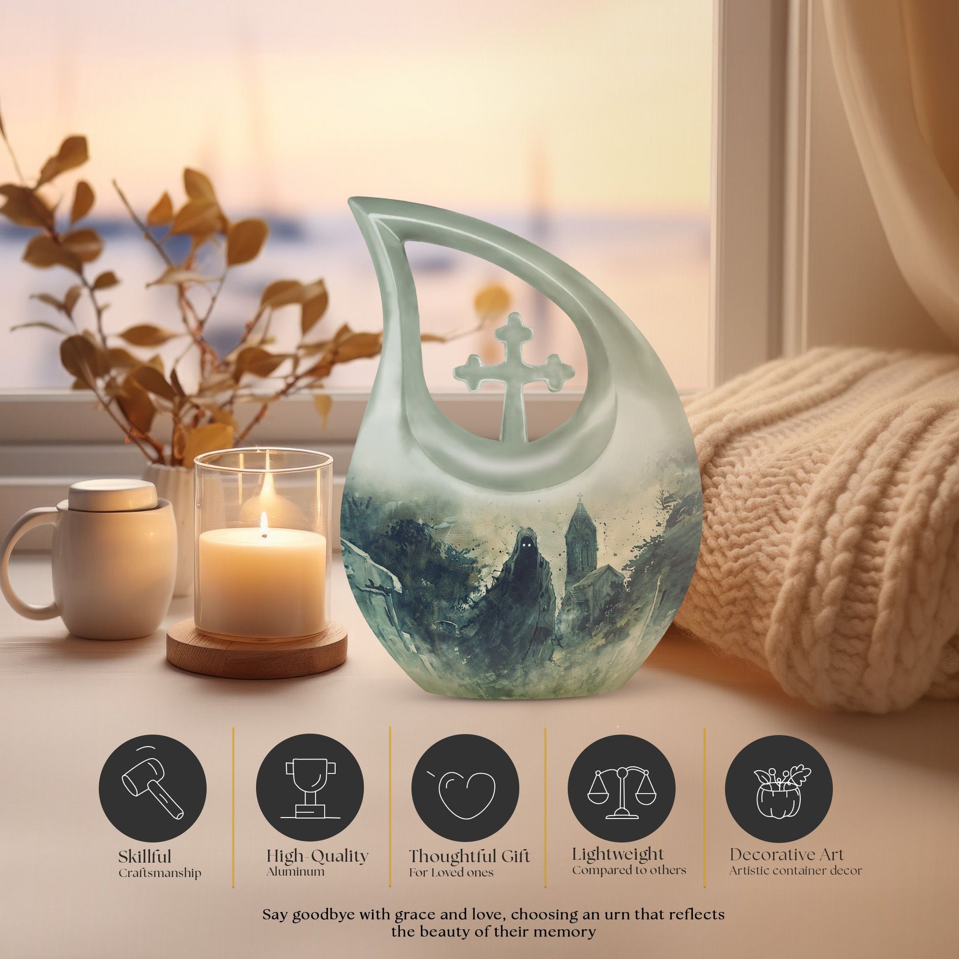Part of our Ethereal Haunt collection, this large urn carries an air of solemn dignity, perfect for memorializing loved ones departed. It's a wonderful addition to any collection of memorial urns, adding a note of distinctiveness. The Cross Drop design brings forth unseen details in a meticulous manner, adding an air of grace and respect. This extraordinary 10-Inch urn is constructed with high-quality Aluminium, assuring its durability and long lifespan. At a weight of 3.3 pounds, its presence carries substantial weight both emotionally and physically. The dimensions affirm its immense capacity of 200 cubic inches, making it an excellent choice for both 'Mother's ashes' or 'Dad’s ashes'. Alongside this large urn, a velvet pouch is provided for the respectful containment of ashes. The urn offers a unique customization option, where you can personalize with engraved names, lending a more intimate touch to your memory. This 'Ethereal Haunt Urn' along with other related products like 'Extra Large Companion Urns', and 'Small Urns for Dad' are perfect examples of our commitment to preserving memories beautifully.