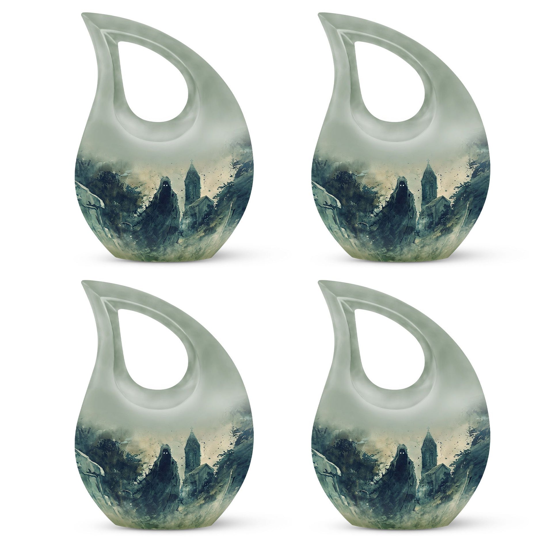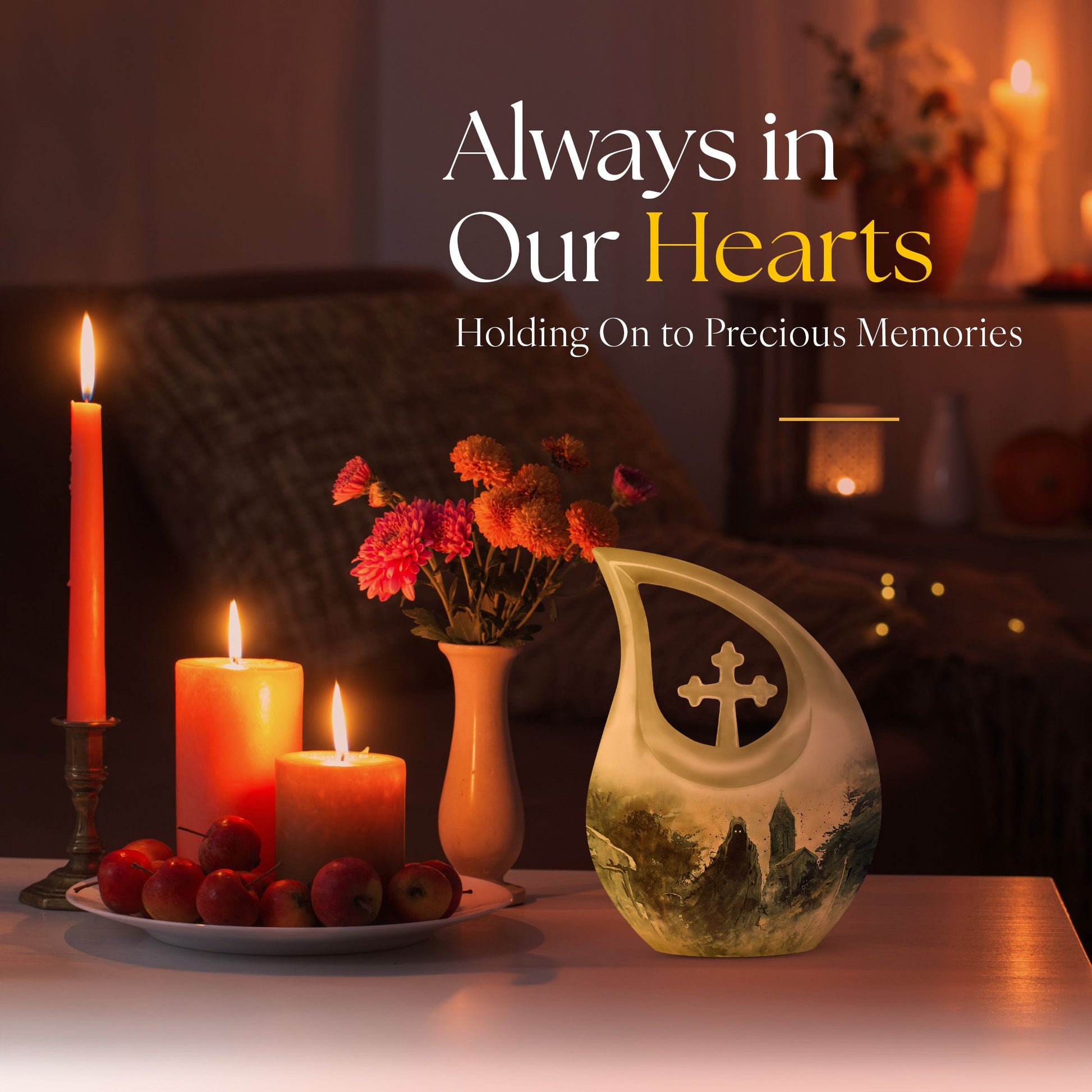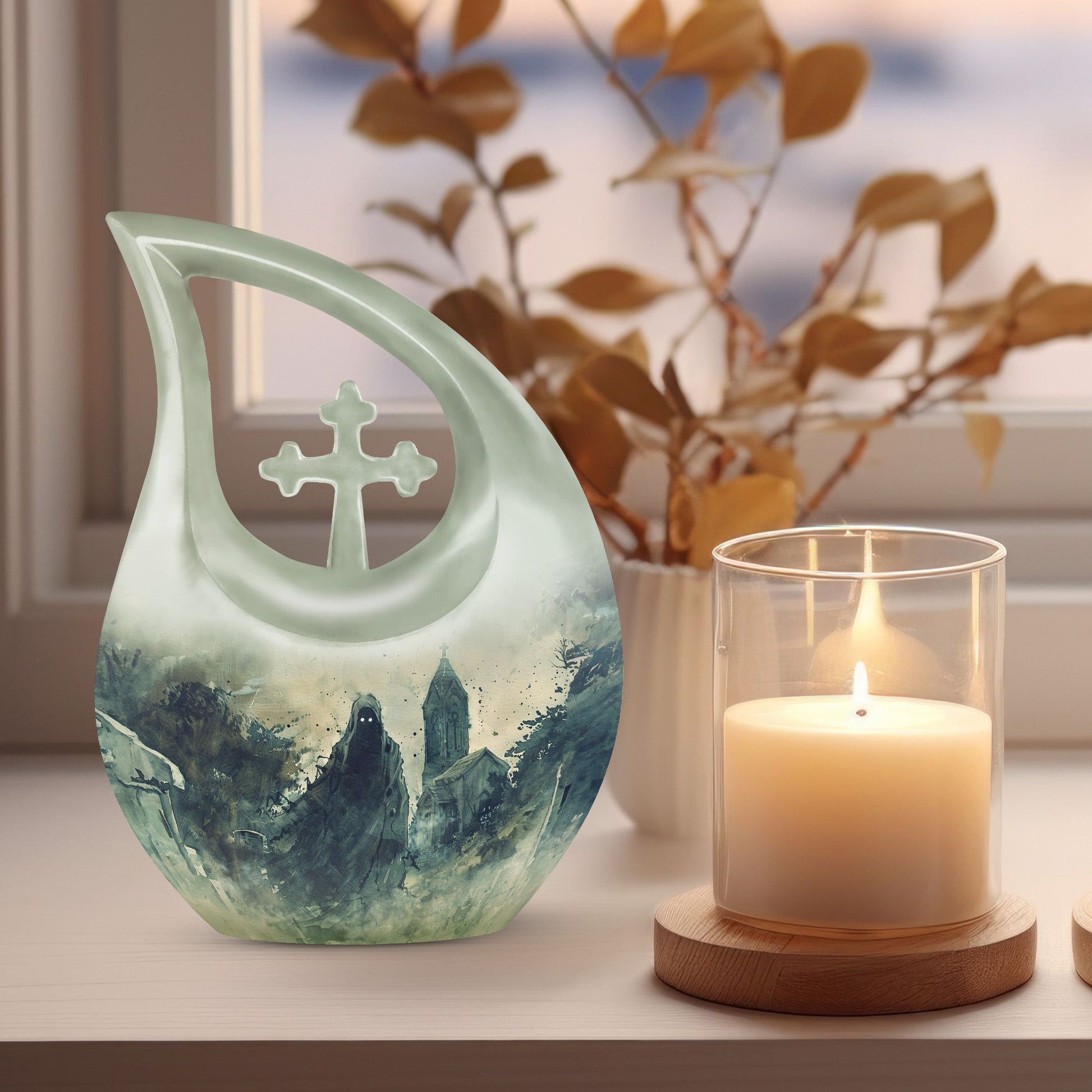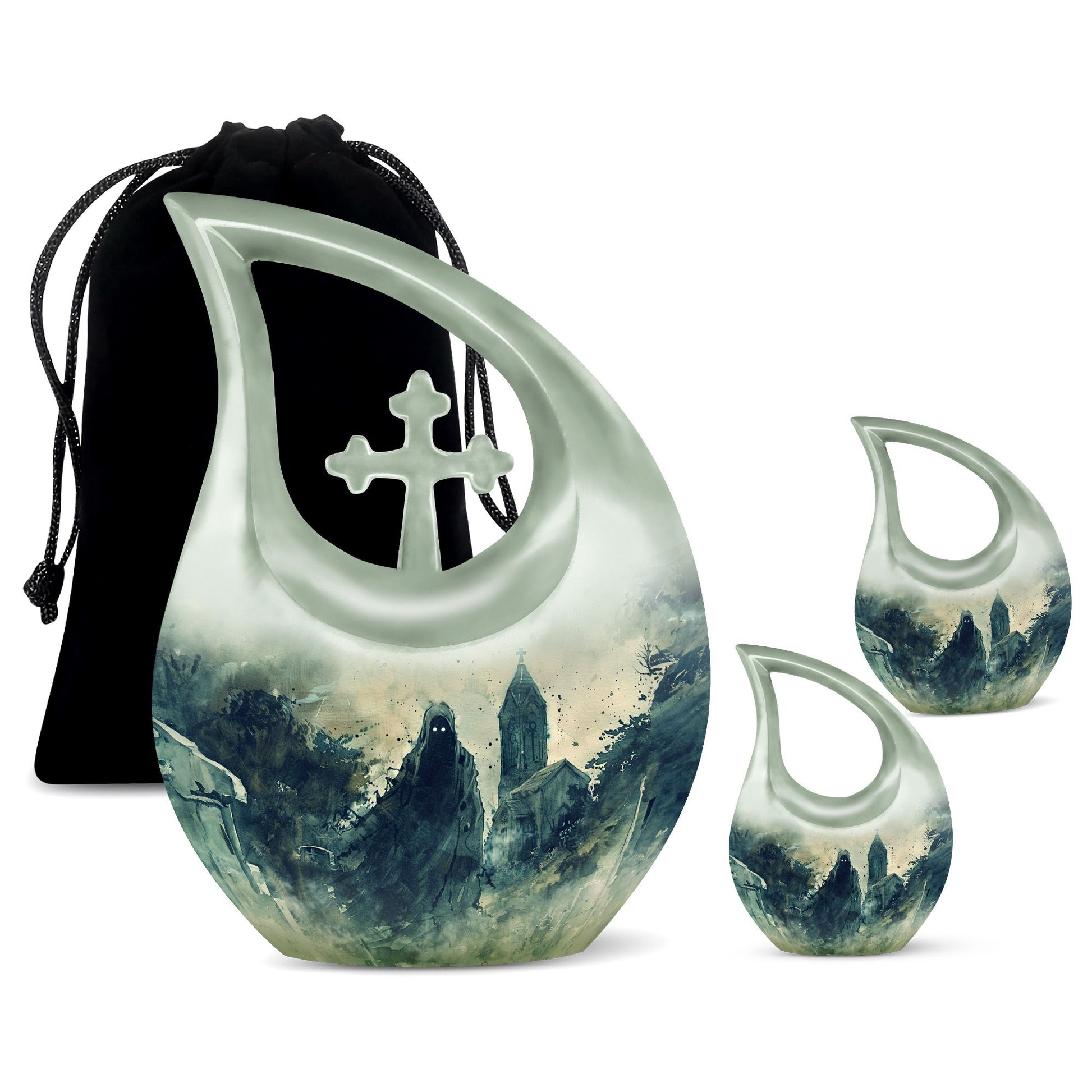 Part of our Ethereal Haunt collection, this large urn carries an air of solemn dignity, perfect for memorializing loved ones departed. It's a wonderful addition to any collection of memorial urns, adding a note of distinctiveness. The Cross Drop design brings forth unseen details in a meticulous manner, adding an air of grace and respect. This extraordinary 10-Inch urn is constructed with high-quality Aluminium, assuring its durability and long lifespan. At a weight of 3.3 pounds, its presence carries substantial weight both emotionally and physically. The dimensions affirm its immense capacity of 200 cubic inches, making it an excellent choice for both 'Mother's ashes' or 'Dad’s ashes'. Alongside this large urn, a velvet pouch is provided for the respectful containment of ashes. The urn offers a unique customization option, where you can personalize with engraved names, lending a more intimate touch to your memory. This 'Ethereal Haunt Urn' along with other related products like 'Extra Large Companion Urns', and 'Small Urns for Dad' are perfect examples of our commitment to preserving memories beautifully.