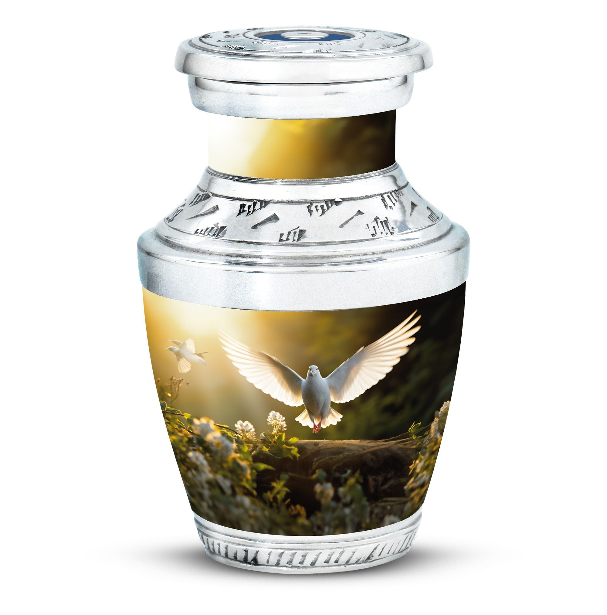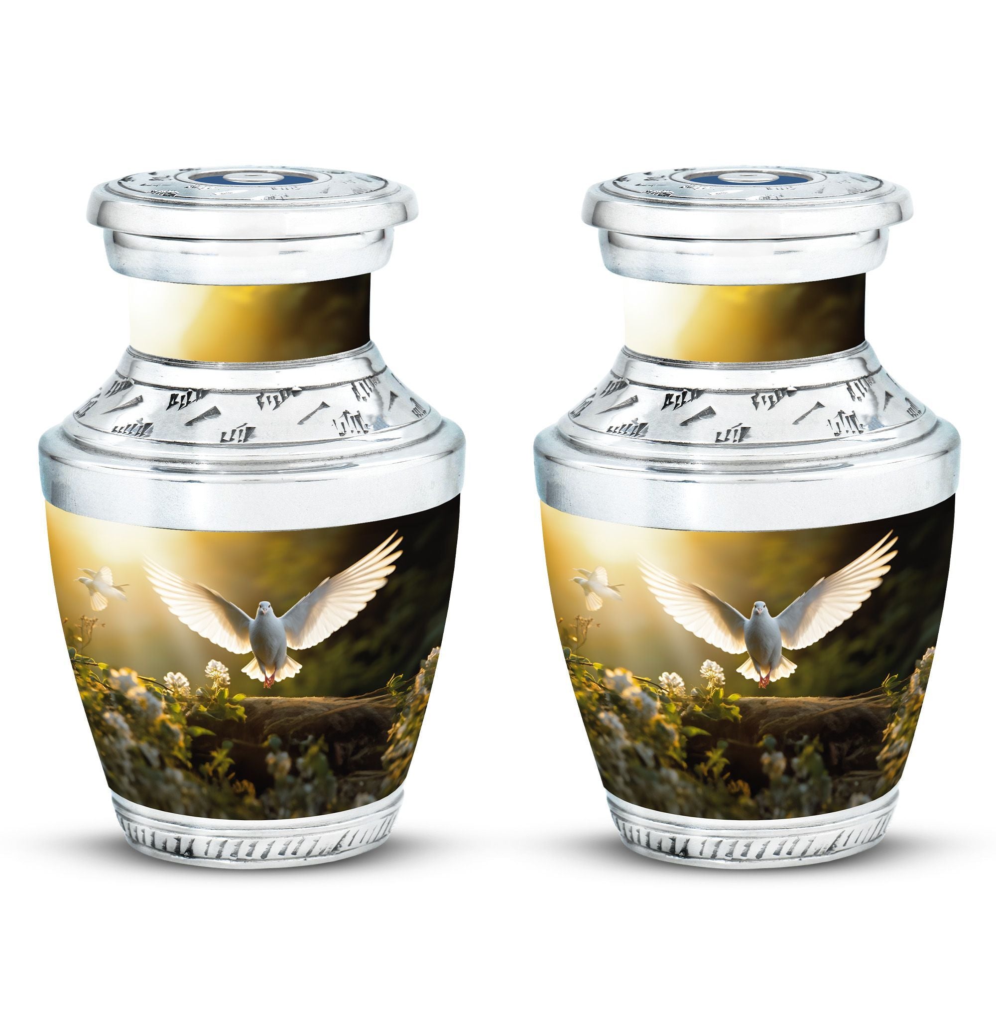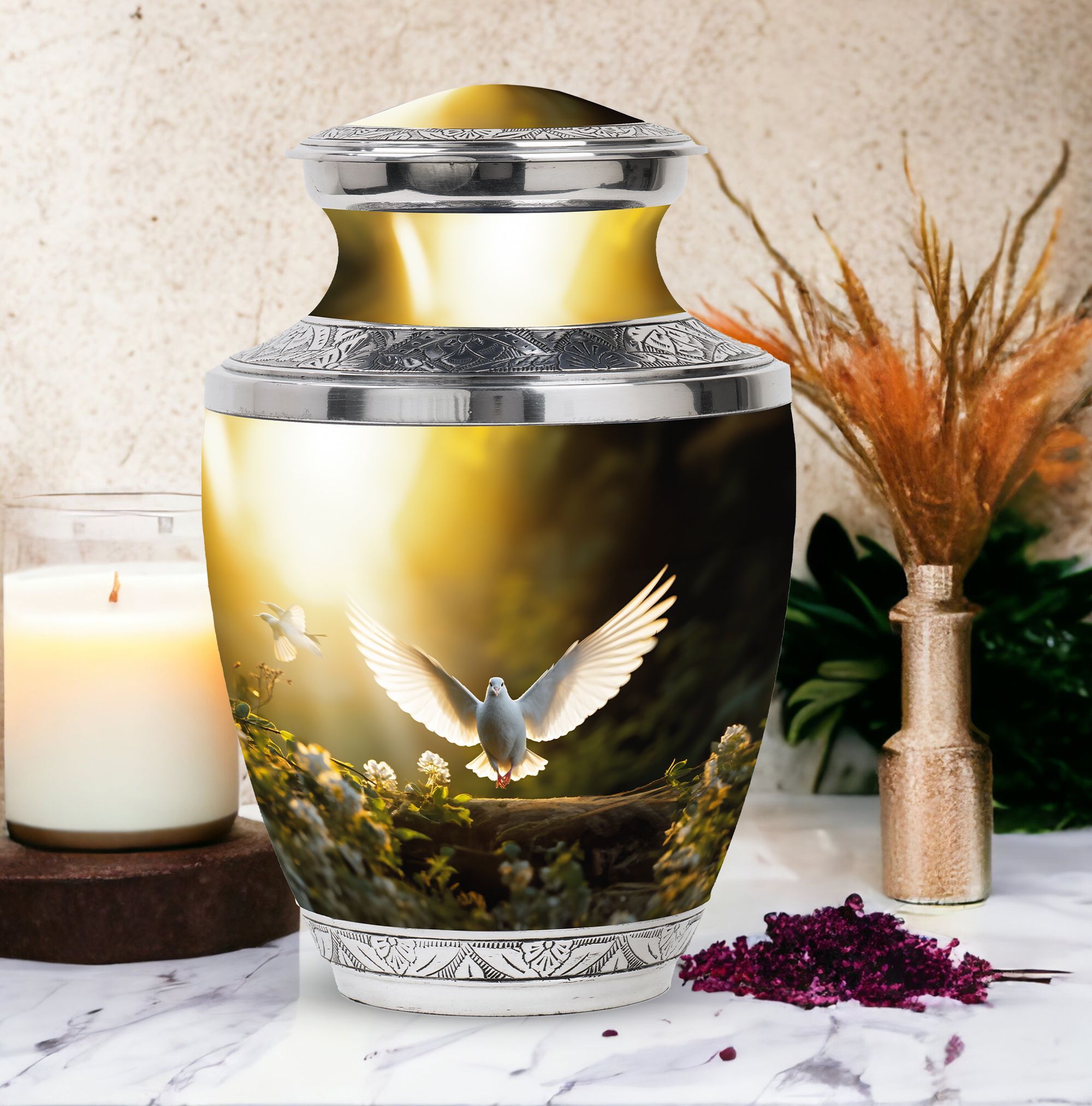 Embrace the sentiment of homage and respect with our Dove Urns for Human Ashes. Adding a distinctive touch to the traditional mourning process, these Aluminum Large Urns radiate an aura of tranquility and calmness. Standing tall at 10 inches, and boasting a weight of 3.3 pounds, this cremation urn functions as a grand testament to your loved one's life. Personalize your urn with engraved names to elevate your tribute. Its classic urn style blends these attributes seamlessly, while providing a hefty capacity of 200 cubic inches for the containment of ashes. Each order includes a velvet pouch, offering an additional layer of protection. Measuring a compact 3 inches in size, they are delicate enough for a subtle display or placement. Durable, poignant, and truly one-of-kind - these Metal Cremation Urns, Burial Urns for Adults offer a lasting memorial for your loved one.