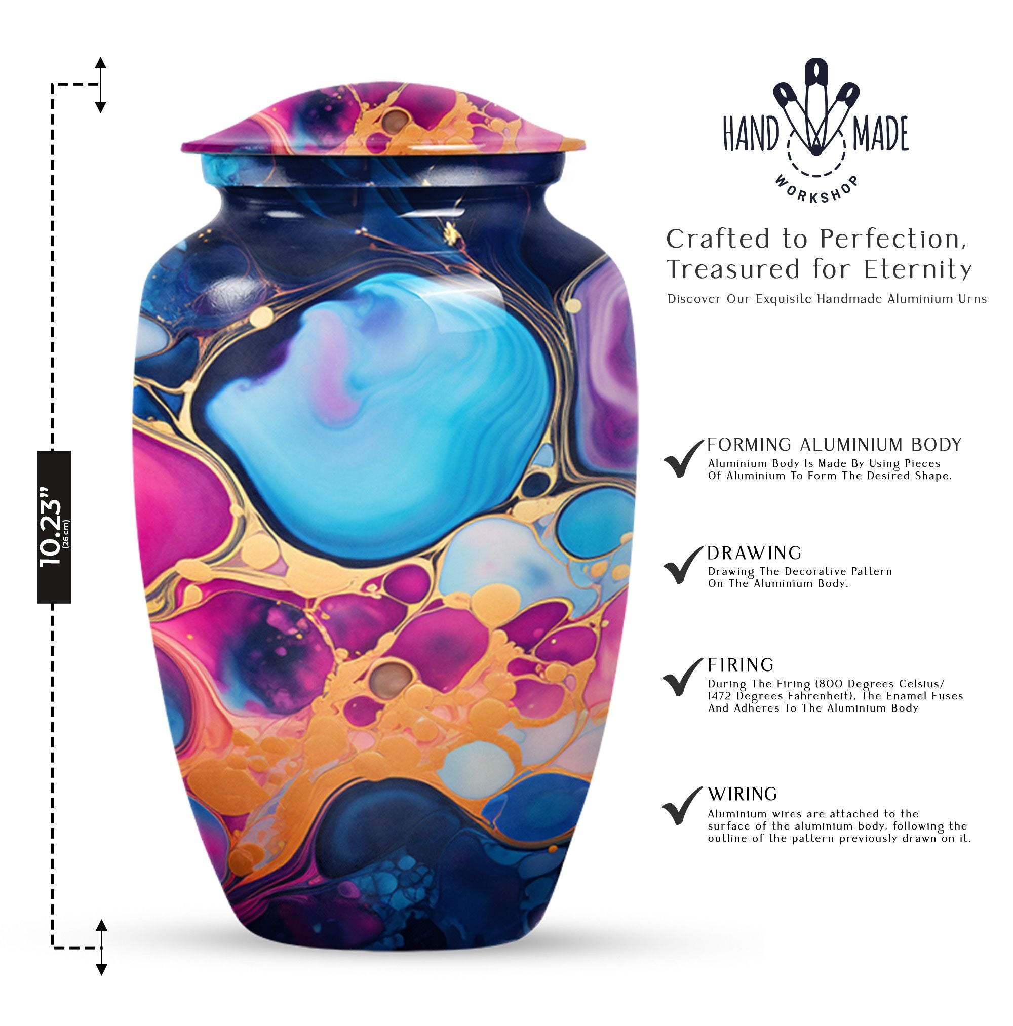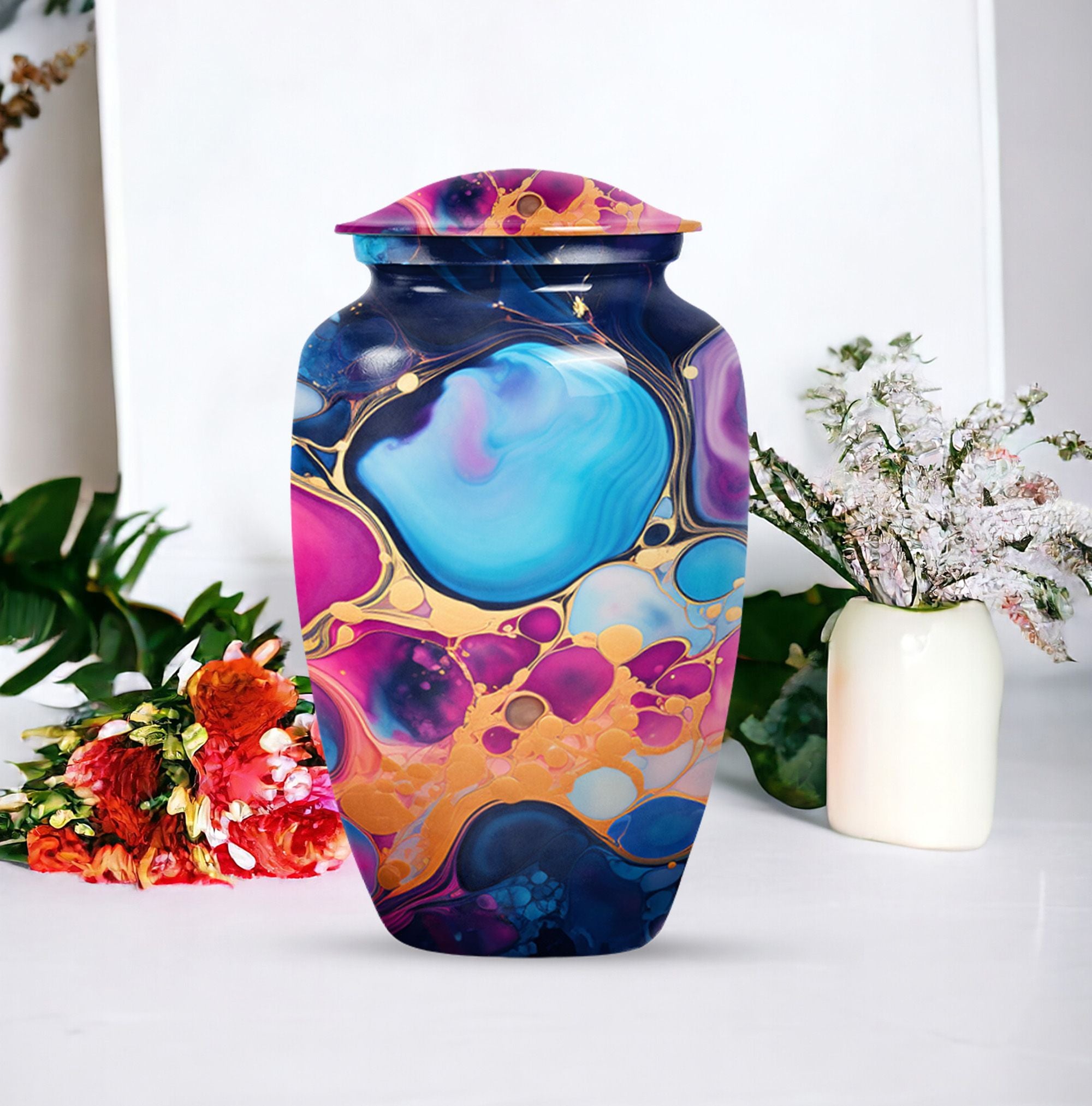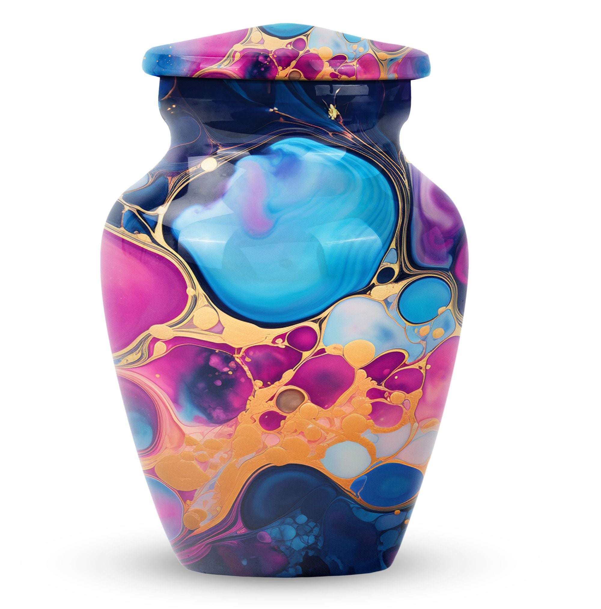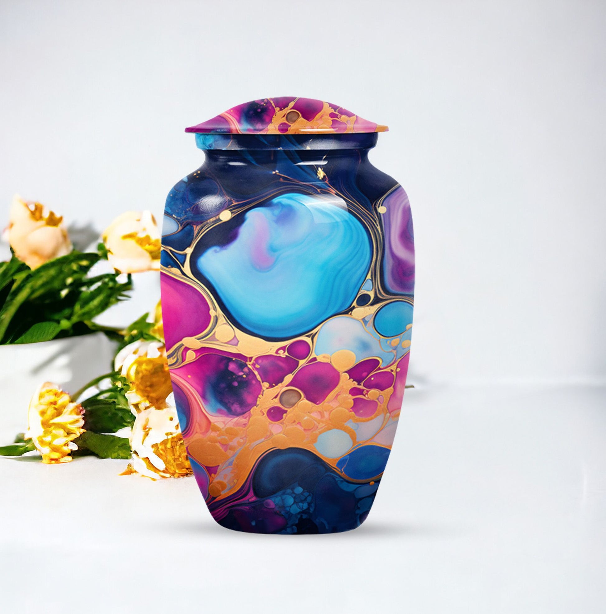 Presenting the Pastel Swirl Urn, a surpassingly dignified piece for memorial ceremonies. Measuring at a sizeable 10 inches in height, it has the capacity to contain 200 cubic inches worth - a suitable urn for ashes of an adult female. The urn is a subtly abstract themed, demonstrating a unique expression of remembrance. Made from durable aluminium, this urn is meticulously crafted for weight and stability, weighing at 3.3 pounds. It can also be personalized with engraved names, adding a touch of heartfelt sentiment. This urn comes with a velvet pouch, helping you to maintain the sanctity and safety of the ashes. Therefore where your search for cremation medium urns for human ashes ends, our product shines as an ideal solution. Synonymous with funeral cremation urns, the large urn adds an understated sophistication to the loving memory of your departed one.