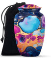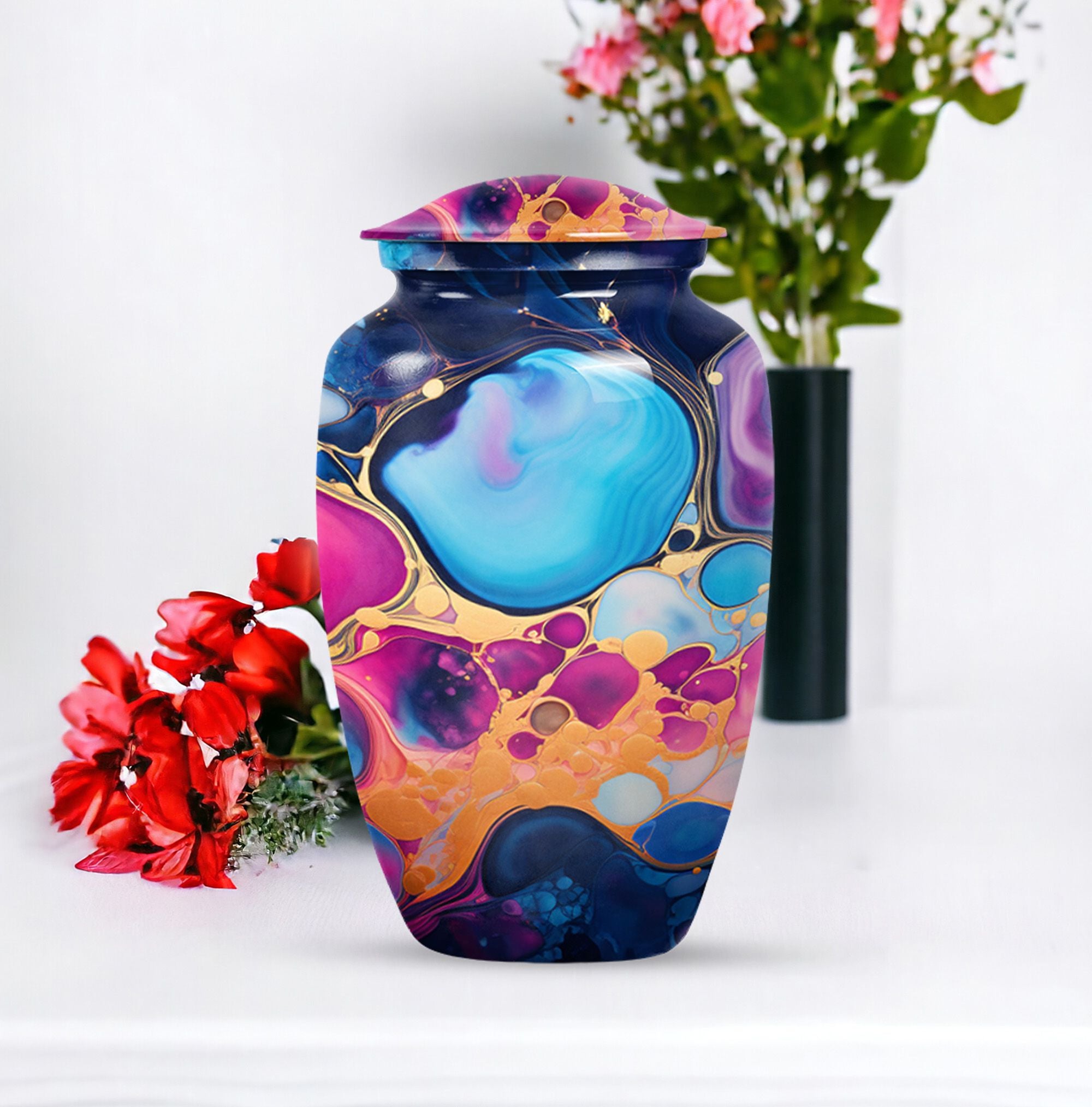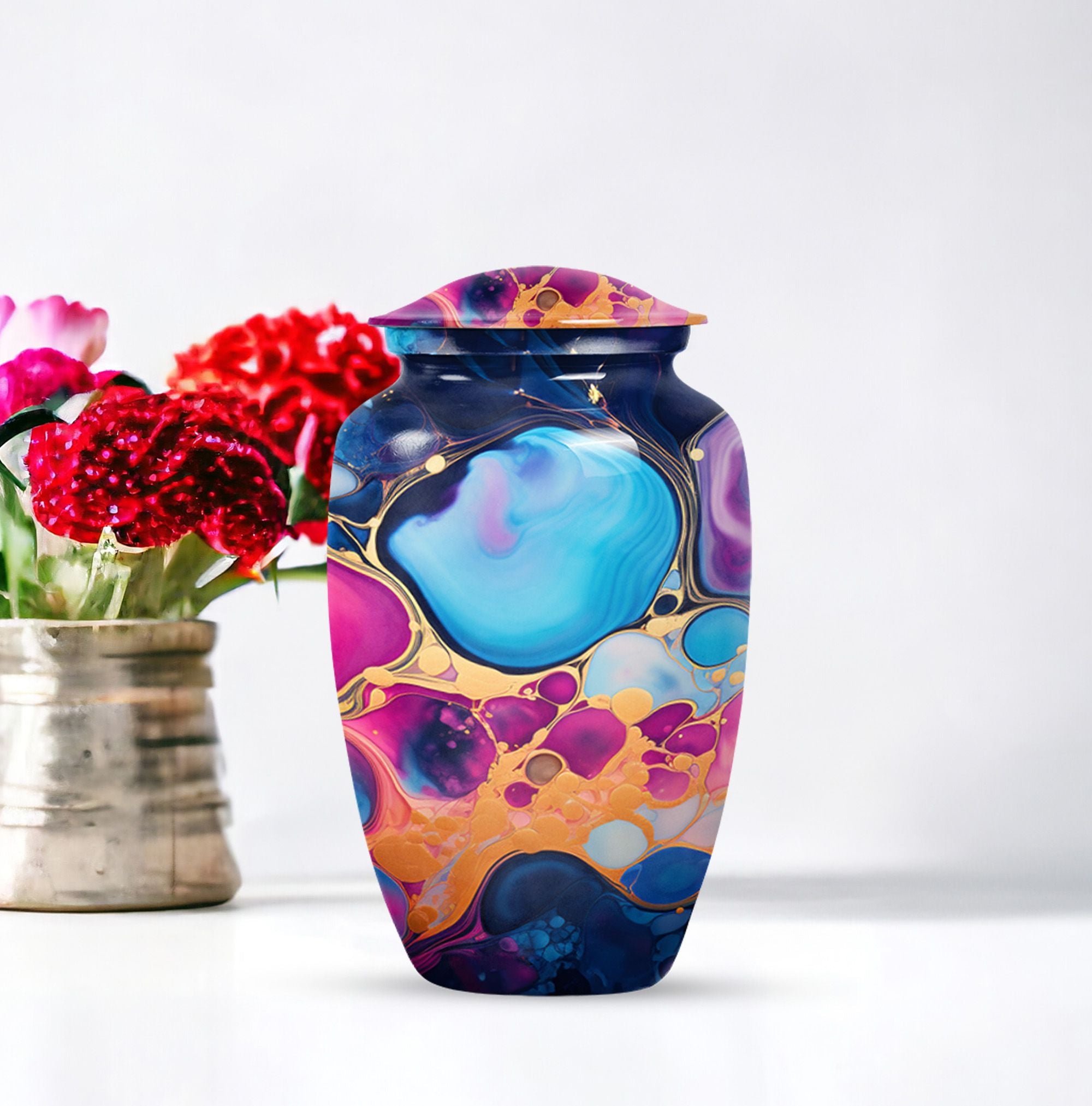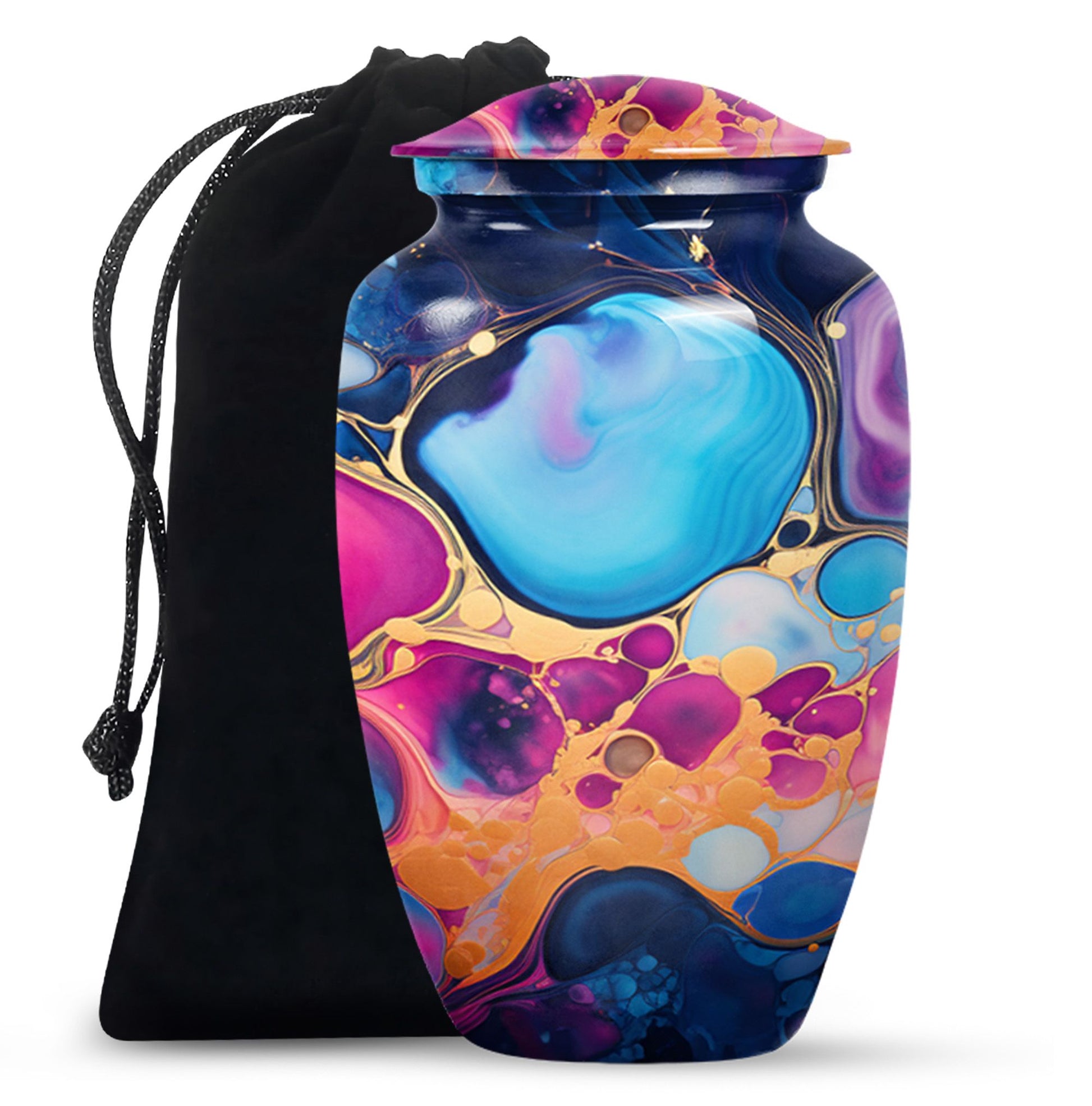 Presenting the Pastel Swirl Urn, a surpassingly dignified piece for memorial ceremonies. Measuring at a sizeable 10 inches in height, it has the capacity to contain 200 cubic inches worth - a suitable urn for ashes of an adult female. The urn is a subtly abstract themed, demonstrating a unique expression of remembrance. Made from durable aluminium, this urn is meticulously crafted for weight and stability, weighing at 3.3 pounds. It can also be personalized with engraved names, adding a touch of heartfelt sentiment. This urn comes with a velvet pouch, helping you to maintain the sanctity and safety of the ashes. Therefore where your search for cremation medium urns for human ashes ends, our product shines as an ideal solution. Synonymous with funeral cremation urns, the large urn adds an understated sophistication to the loving memory of your departed one.