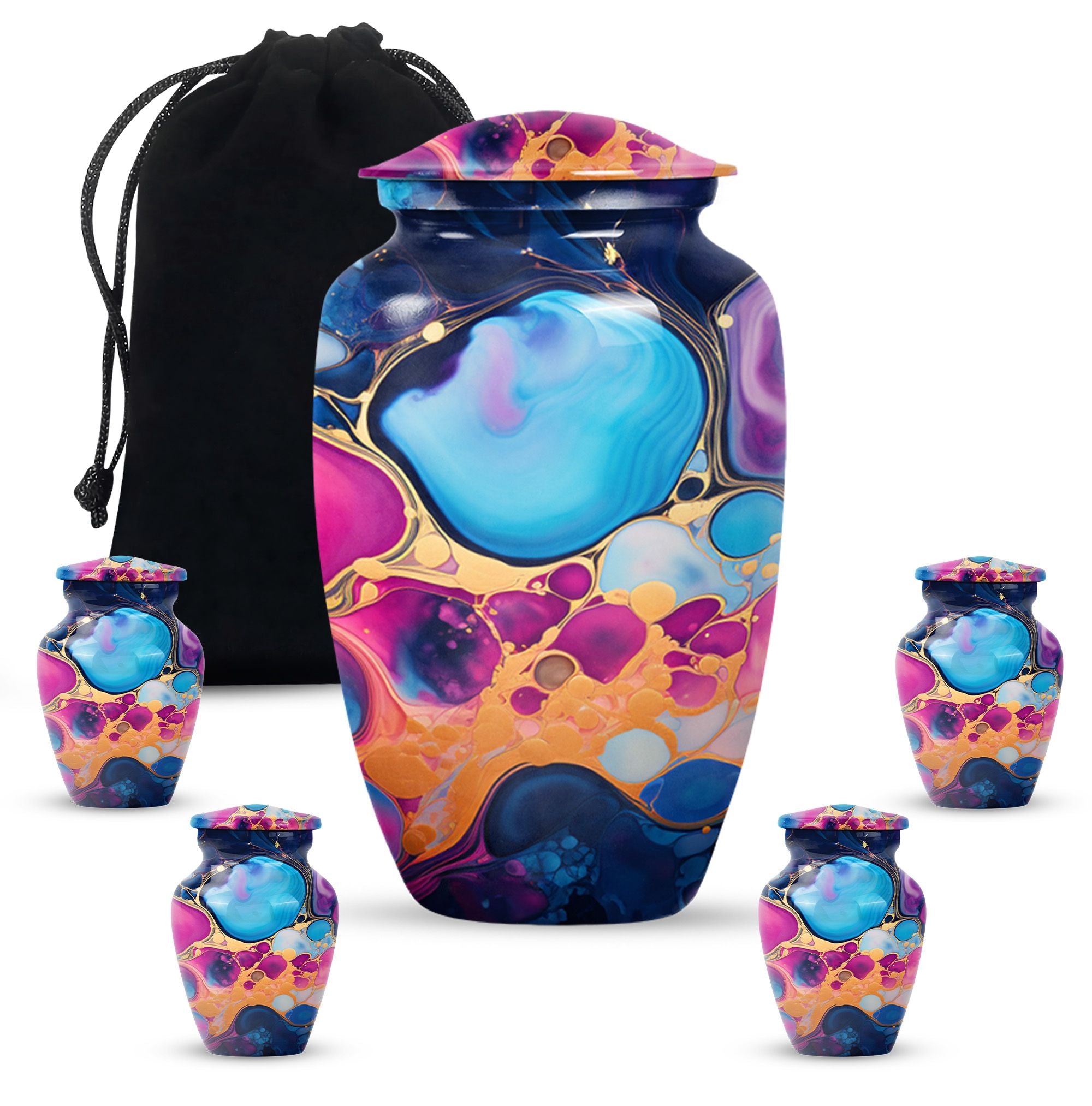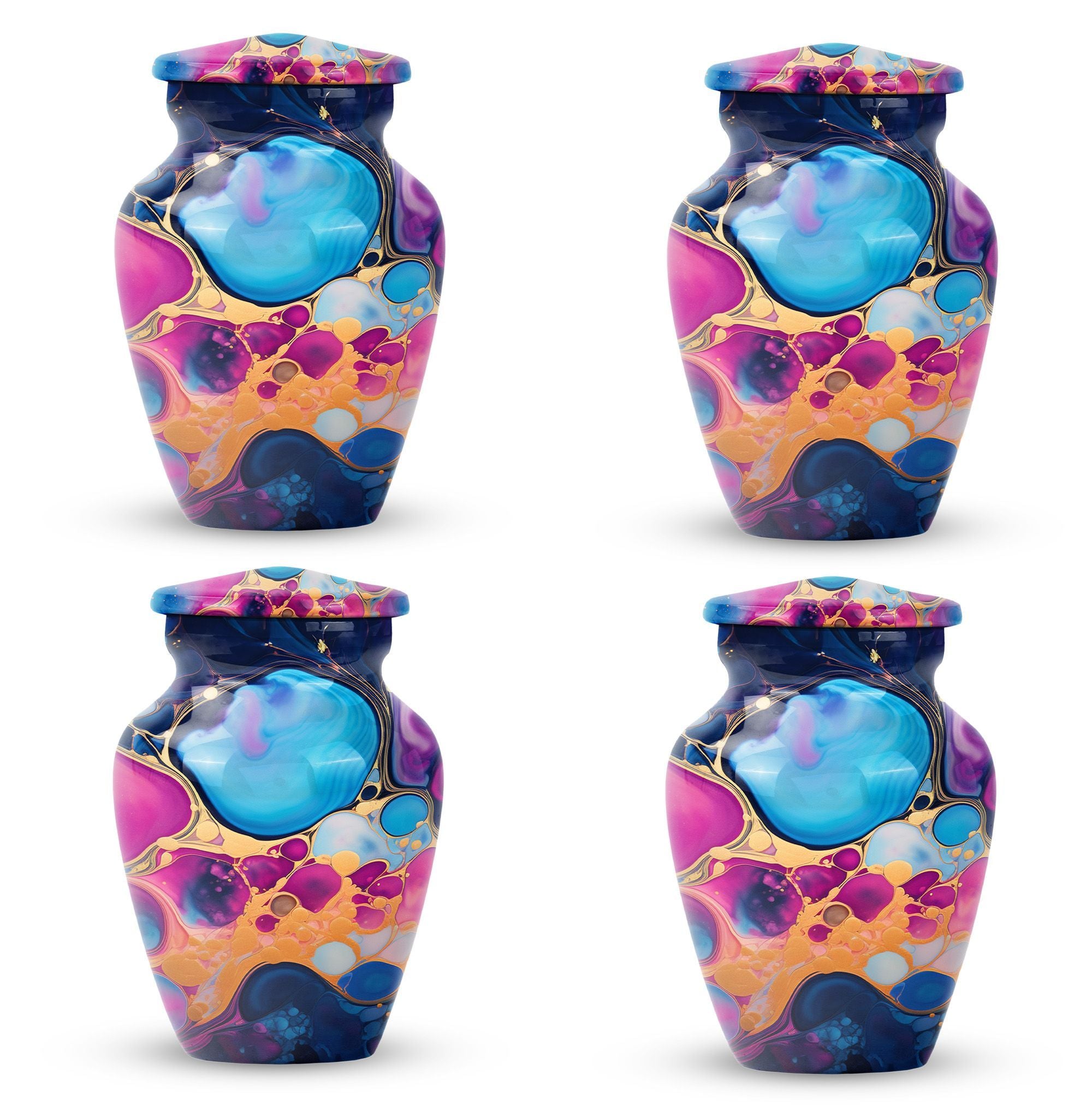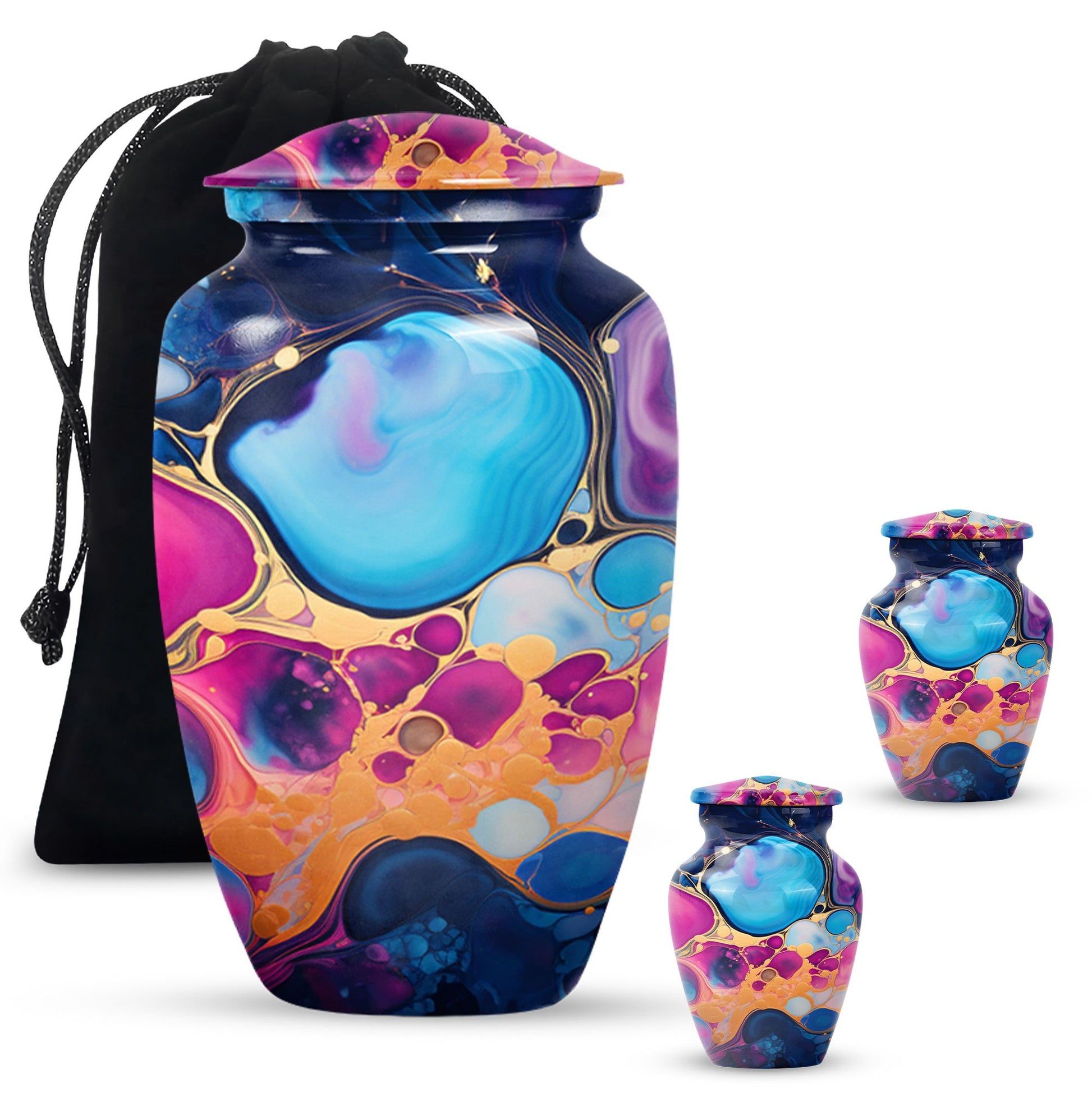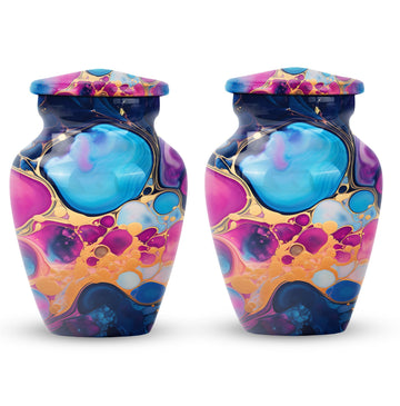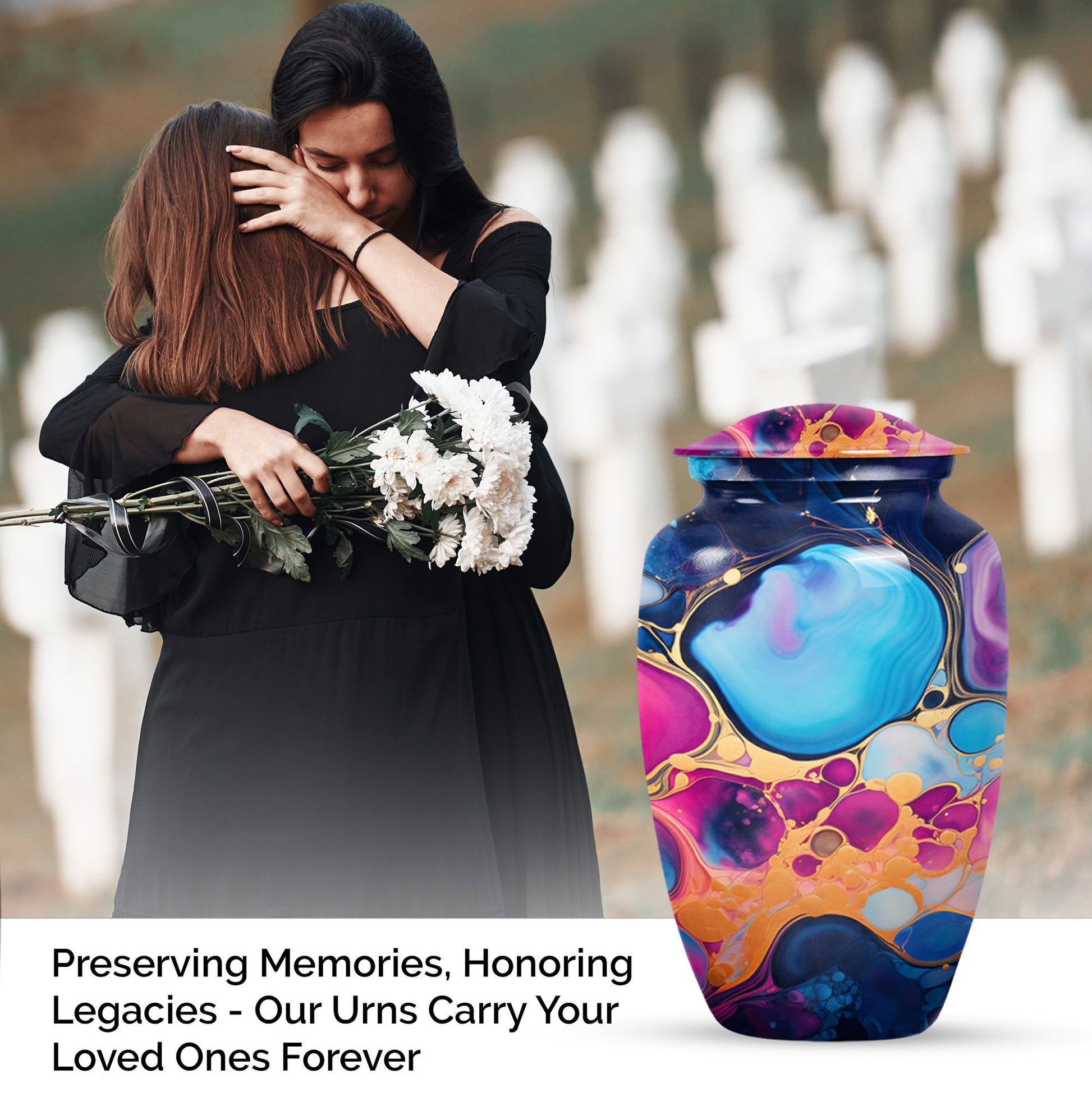 Presenting the Pastel Swirl Urn, a surpassingly dignified piece for memorial ceremonies. Measuring at a sizeable 10 inches in height, it has the capacity to contain 200 cubic inches worth - a suitable urn for ashes of an adult female. The urn is a subtly abstract themed, demonstrating a unique expression of remembrance. Made from durable aluminium, this urn is meticulously crafted for weight and stability, weighing at 3.3 pounds. It can also be personalized with engraved names, adding a touch of heartfelt sentiment. This urn comes with a velvet pouch, helping you to maintain the sanctity and safety of the ashes. Therefore where your search for cremation medium urns for human ashes ends, our product shines as an ideal solution. Synonymous with funeral cremation urns, the large urn adds an understated sophistication to the loving memory of your departed one.