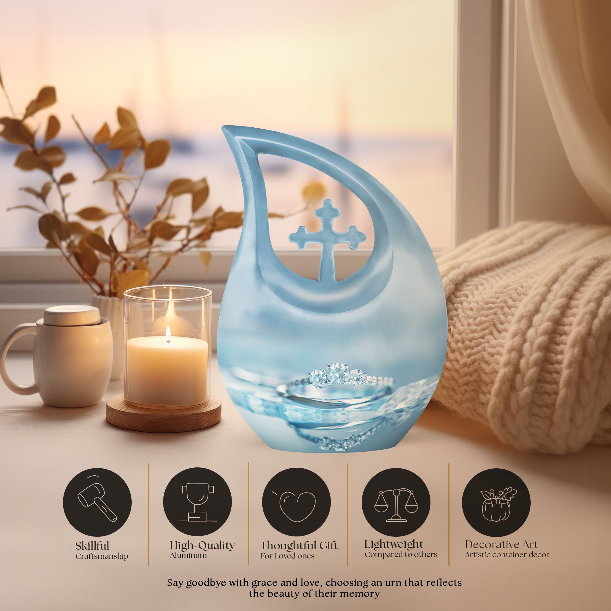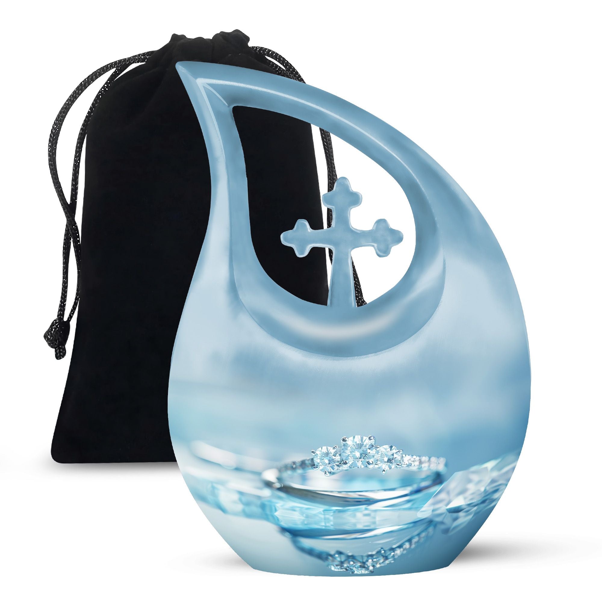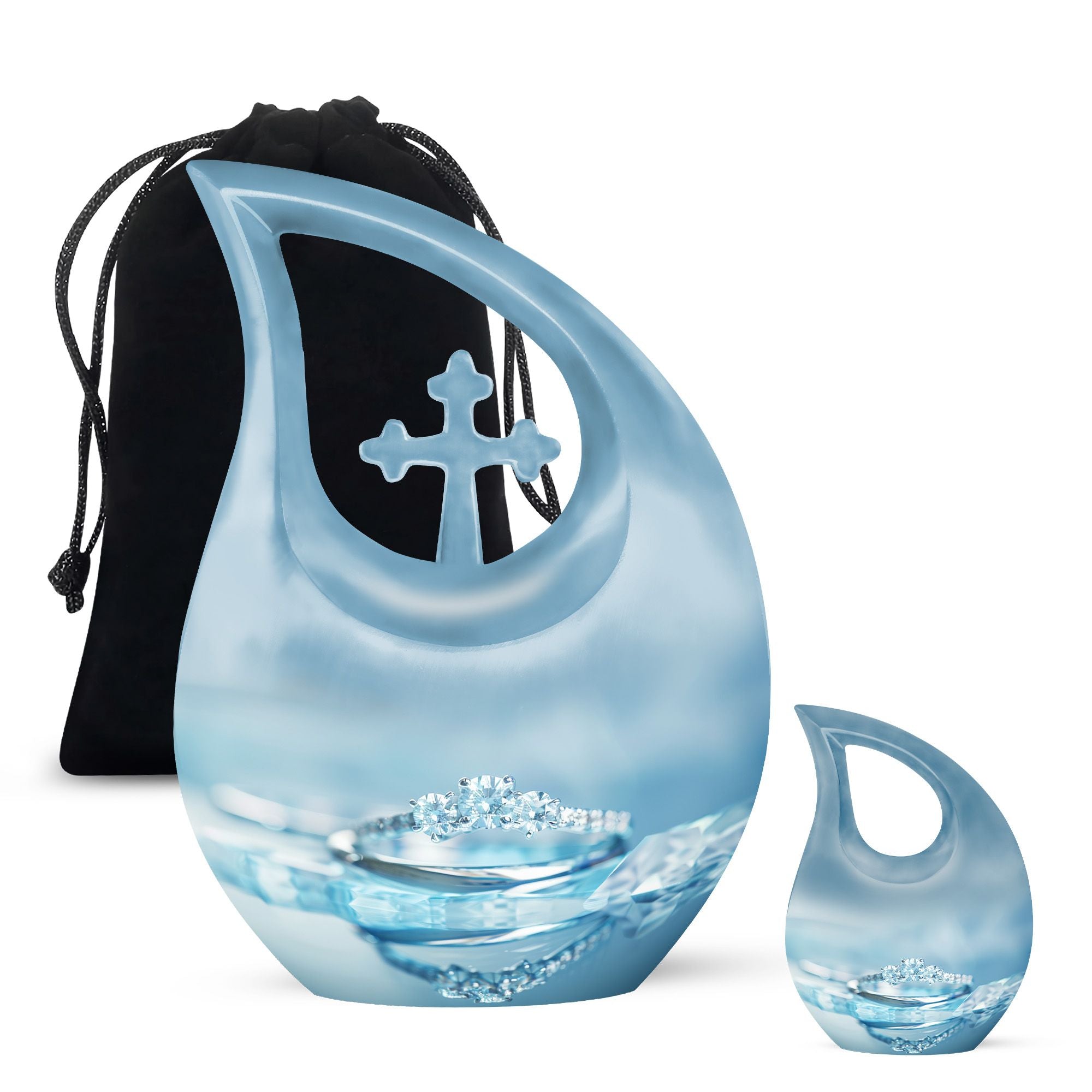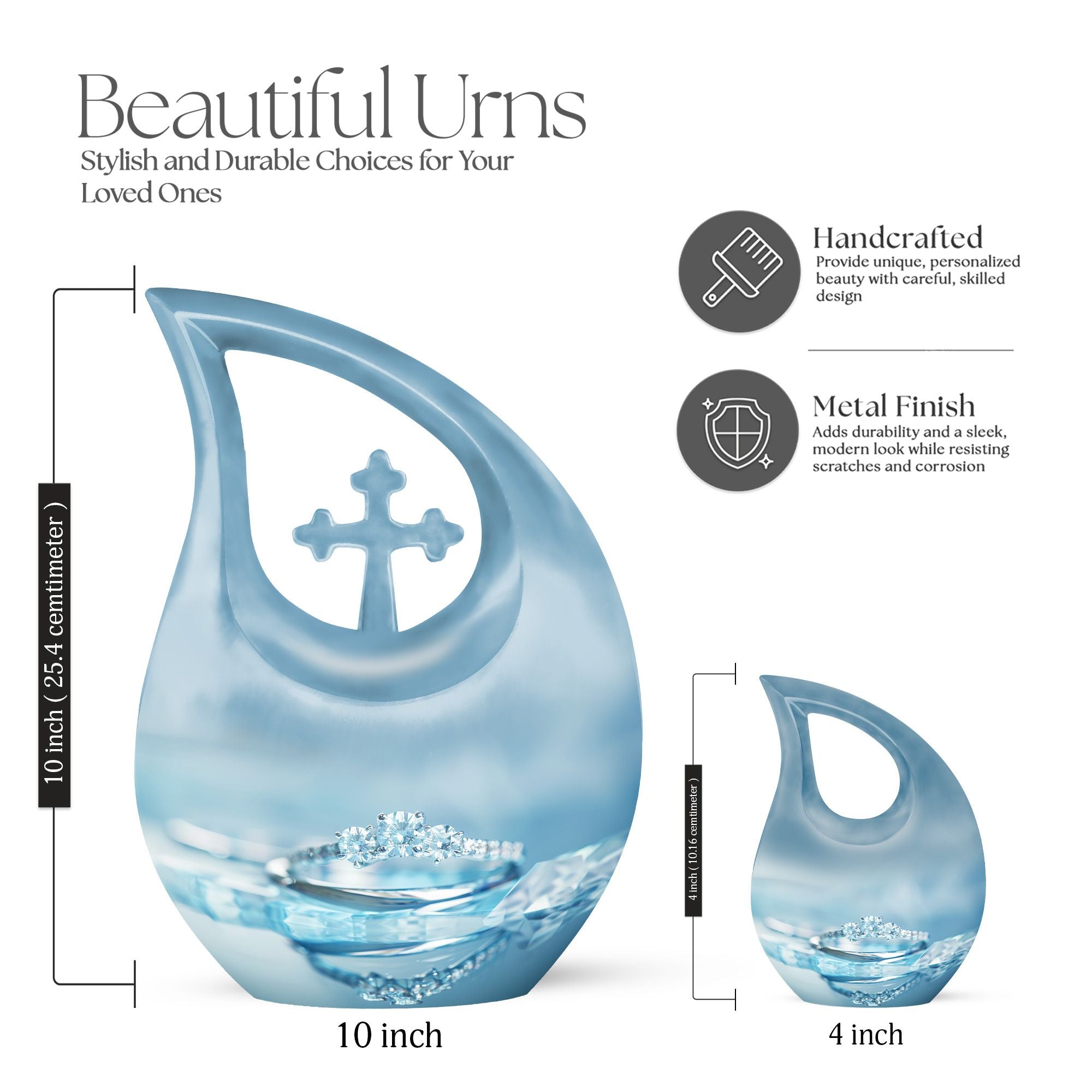 Presenting our treasured 10-inch Ring Urn, a vital choice for a precious remembrance. Distinguished from the common urns, this piece brings to light a unique 'Cross Drop' theme, illustrating a subtle connection between the worshipped realms. Cast from sturdy aluminium, this 'Large Urn' weighs 3.3 pounds, ensuring its durability and lastingness. Holding up to 200 cubic inches capacity, the urn accommodates ashes of adults keeping their spirit eternally alive. The package also includes a velvety pouch ideal for safeguarding the residual ashes. Further, we offer the option to customize this funeral urn by personalizing it with engraved names, giving a poignant touch to this memorial tribute. Ideal for a funeral ceremony of any faith, these urns seamlessly adapt to become miniature urns. So, remember your loved one with this exquisite Ring Urn, a class above the standard memorial urns.