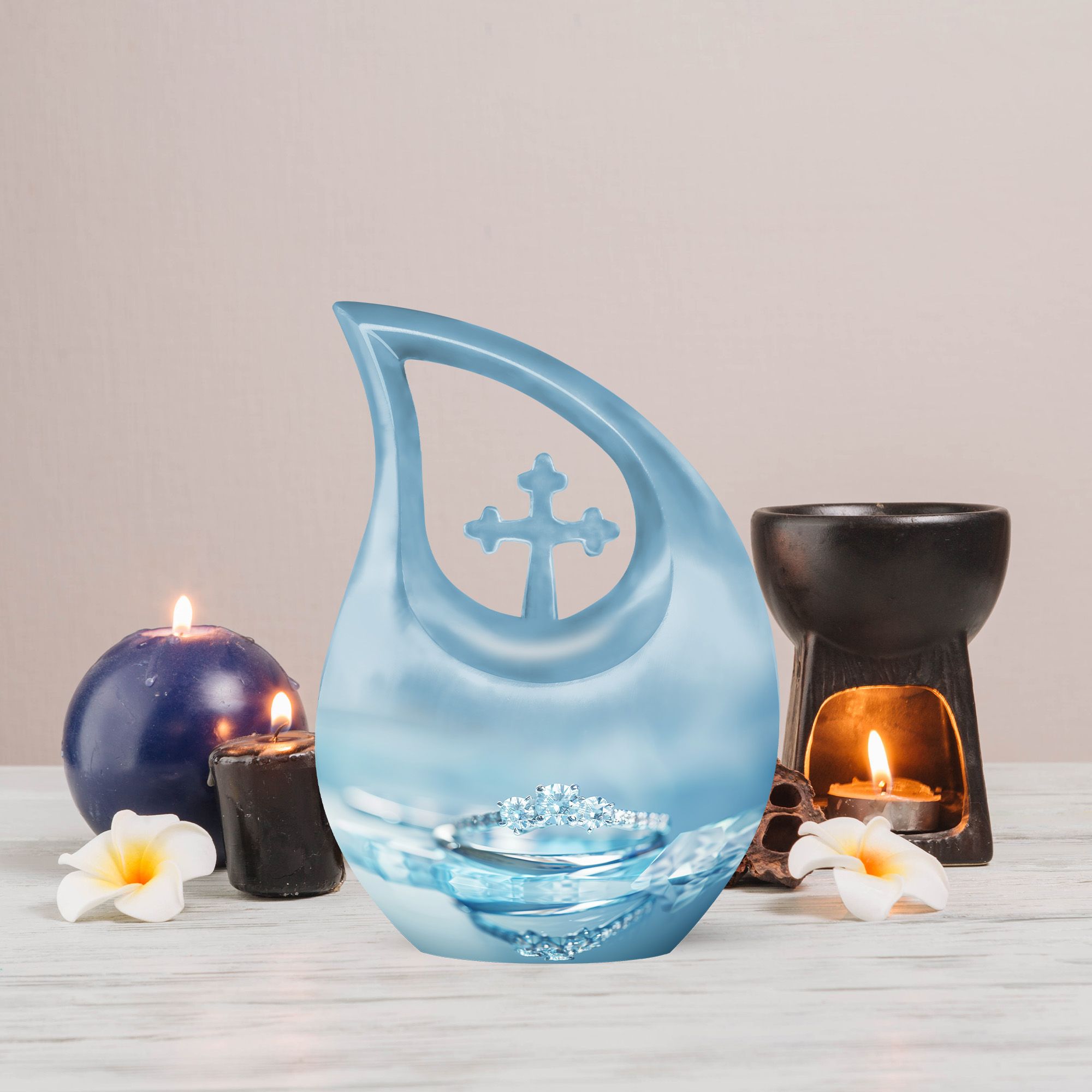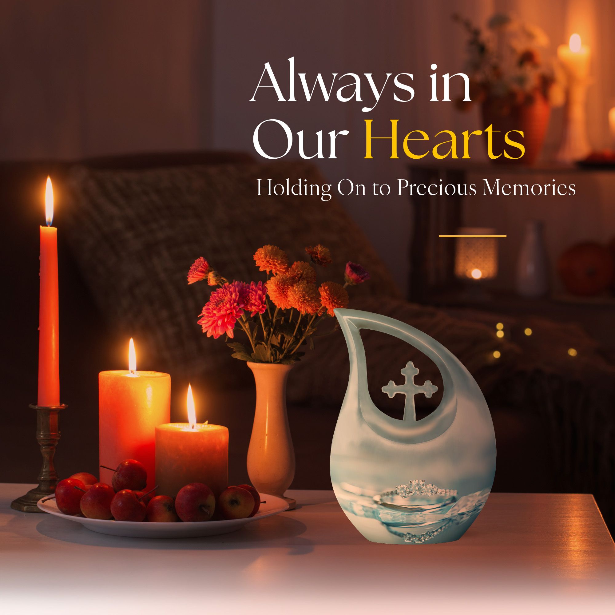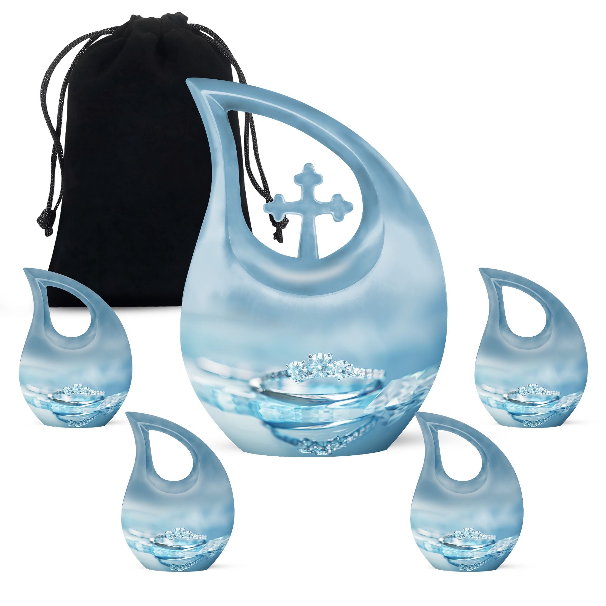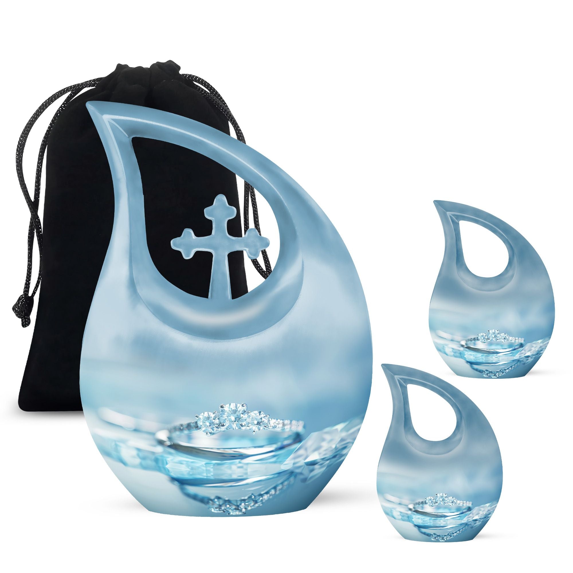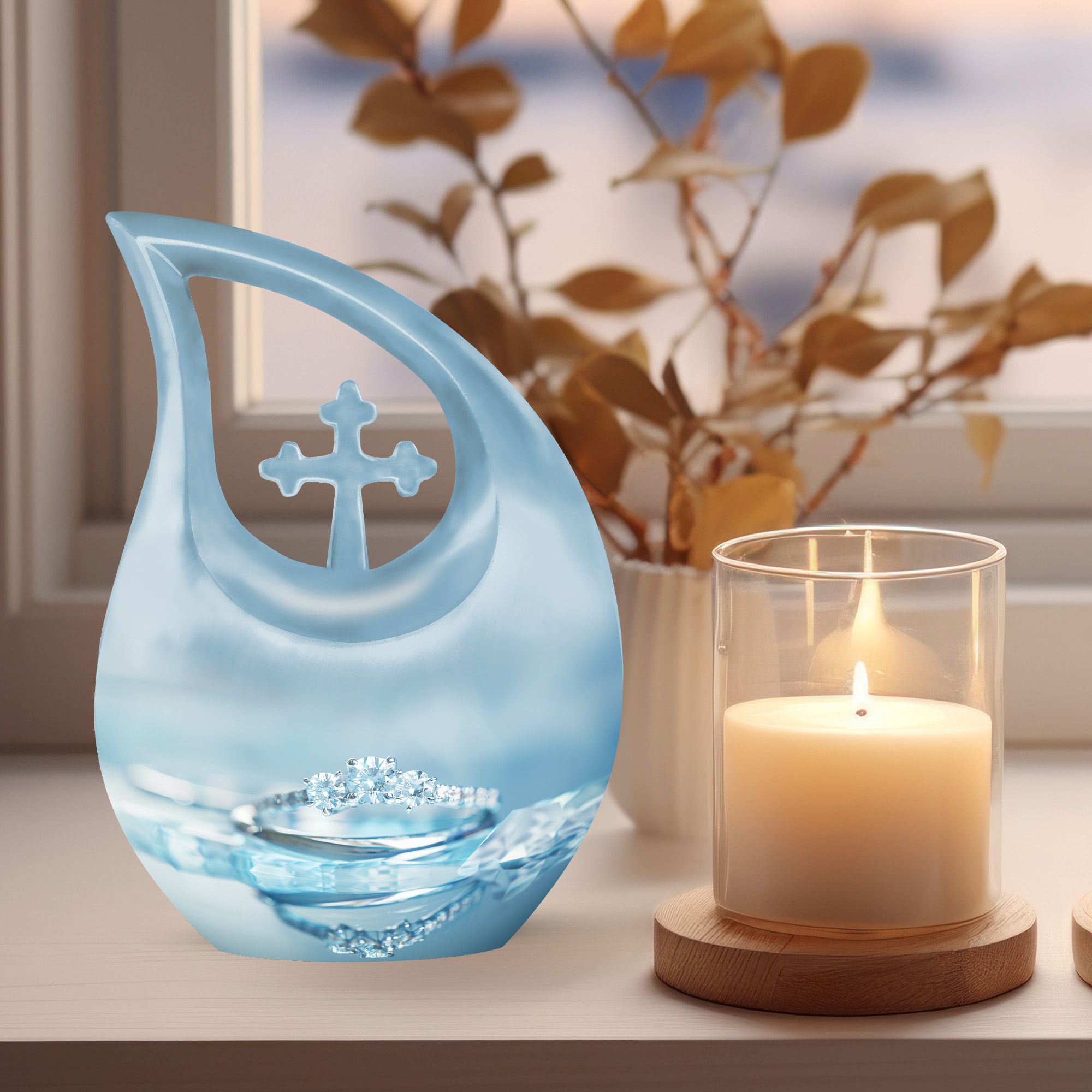 Presenting our treasured 10-inch Ring Urn, a vital choice for a precious remembrance. Distinguished from the common urns, this piece brings to light a unique 'Cross Drop' theme, illustrating a subtle connection between the worshipped realms. Cast from sturdy aluminium, this 'Large Urn' weighs 3.3 pounds, ensuring its durability and lastingness. Holding up to 200 cubic inches capacity, the urn accommodates ashes of adults keeping their spirit eternally alive. The package also includes a velvety pouch ideal for safeguarding the residual ashes. Further, we offer the option to customize this funeral urn by personalizing it with engraved names, giving a poignant touch to this memorial tribute. Ideal for a funeral ceremony of any faith, these urns seamlessly adapt to become miniature urns. So, remember your loved one with this exquisite Ring Urn, a class above the standard memorial urns.