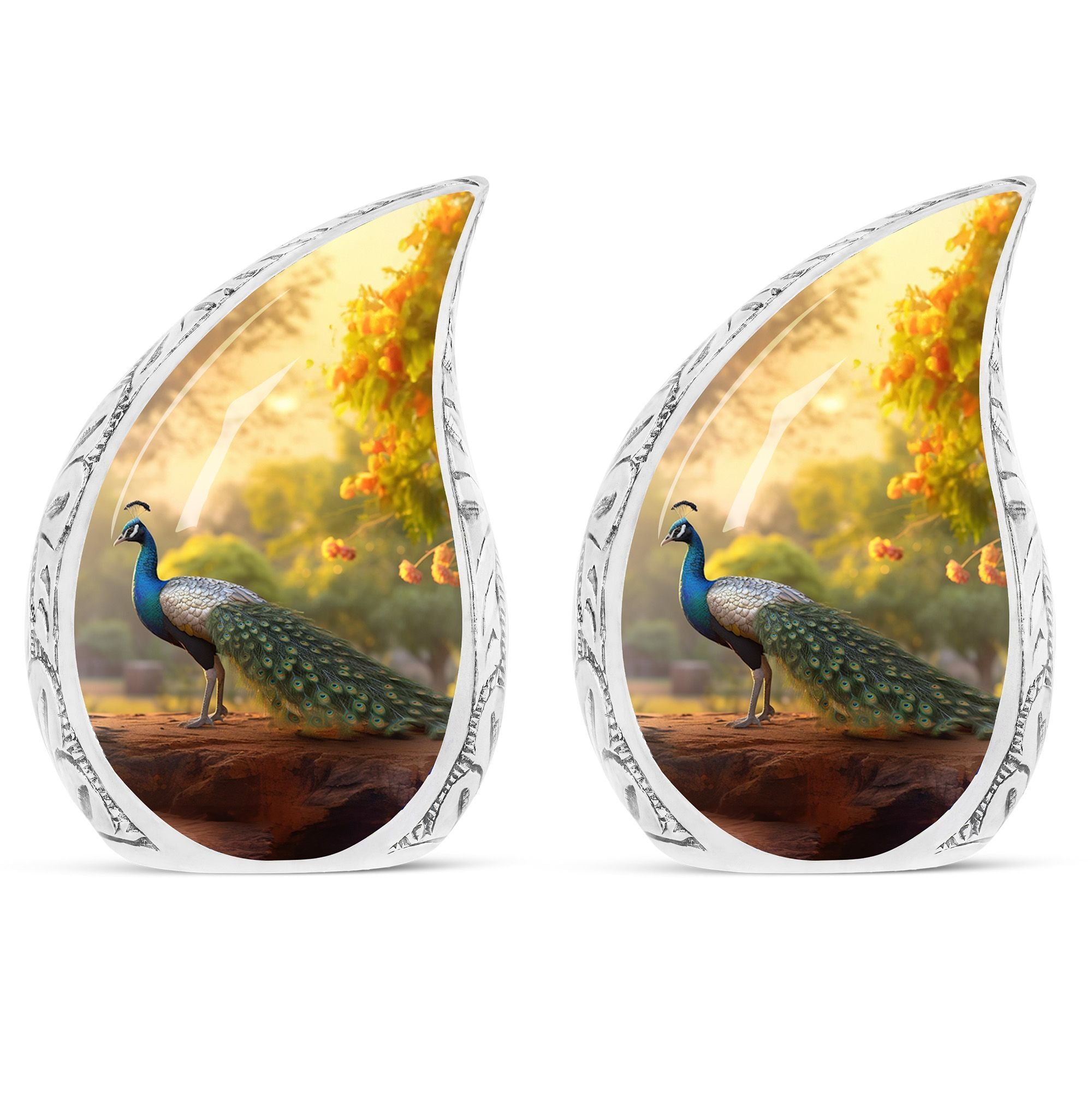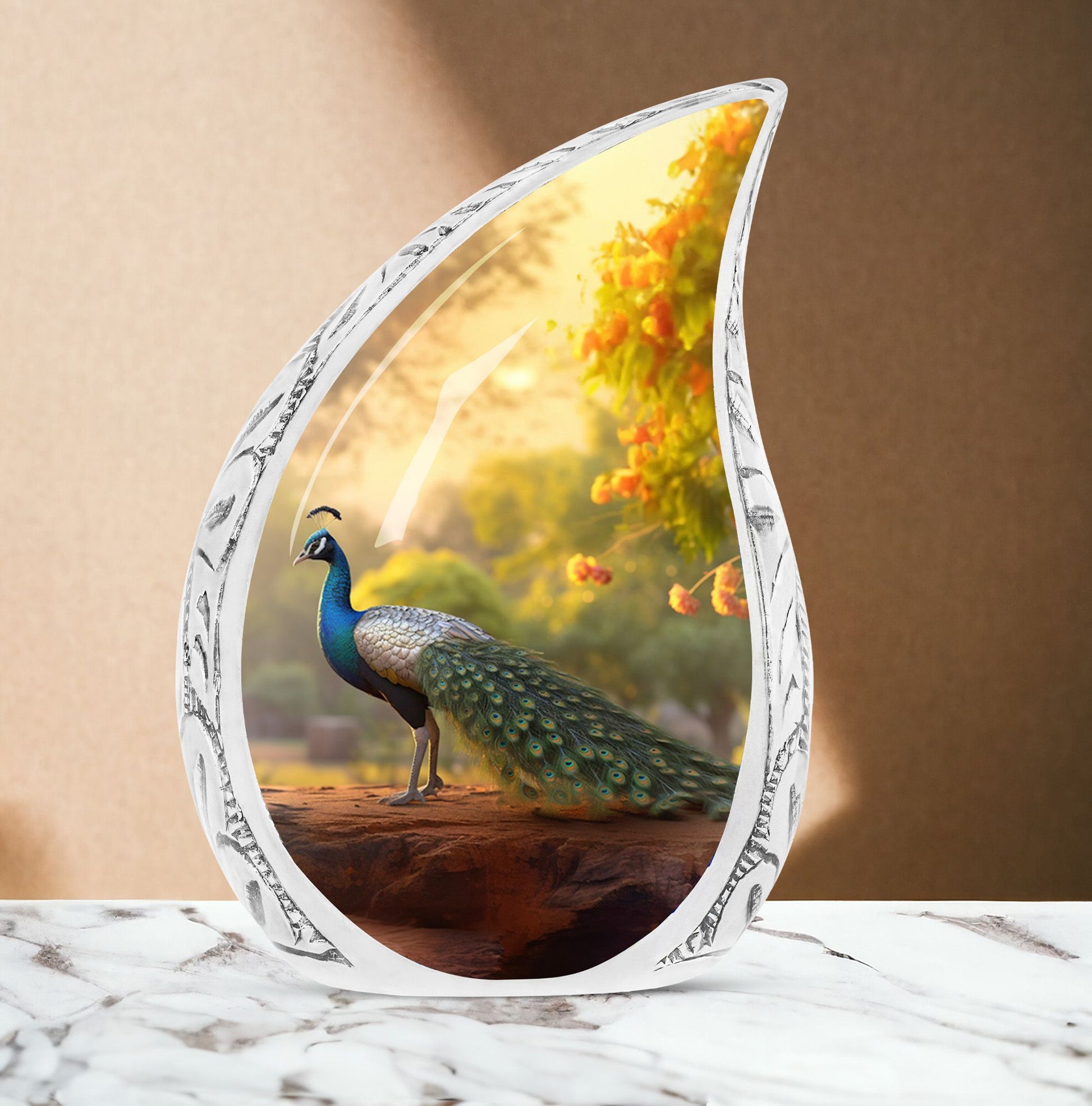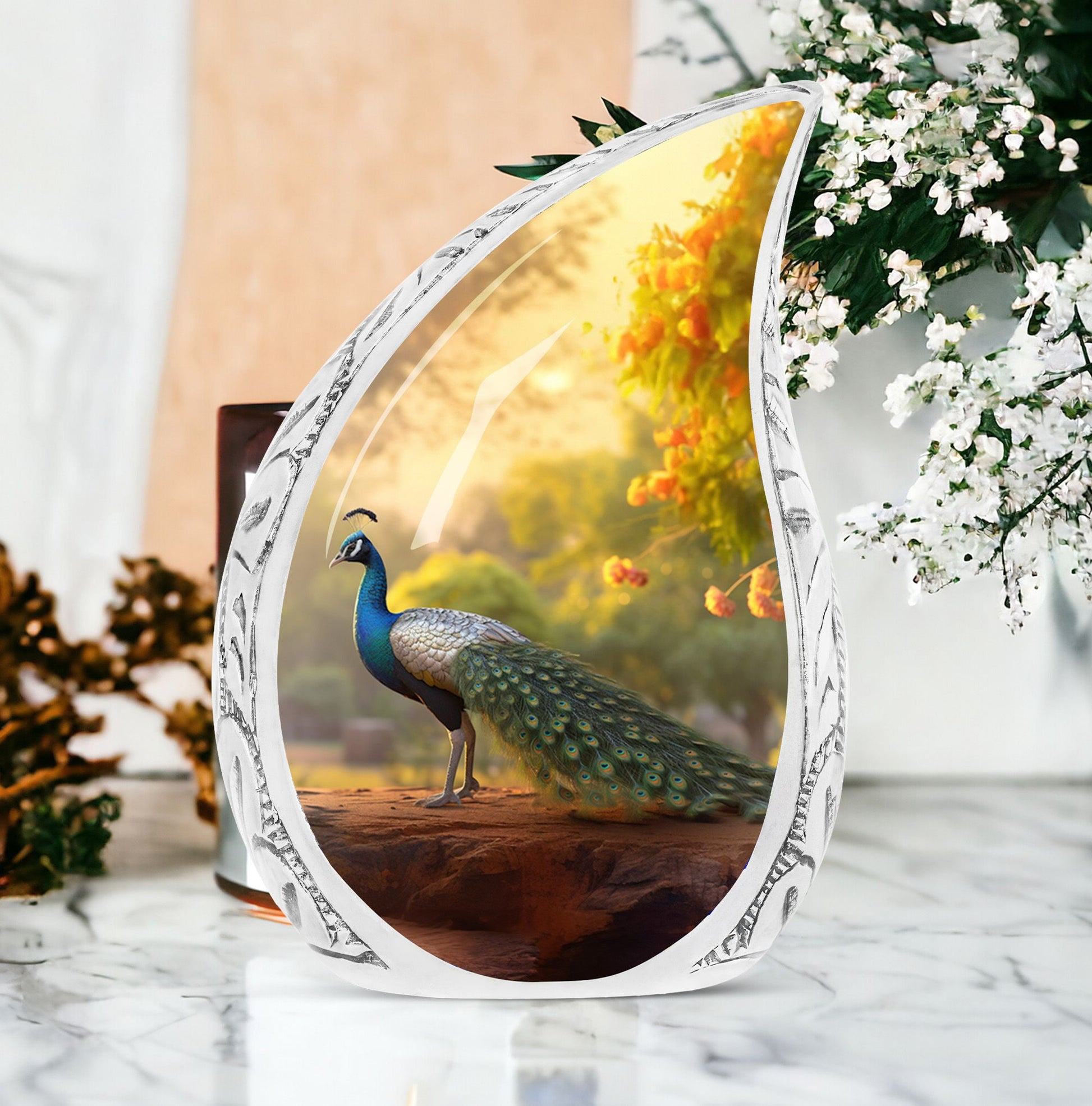 Keep the essence of your deceased loved ones alive with our classically designed 3-inch Peacock Urn. This substantial and sturdy memorial urn, weighing 3.3 pounds and standing 10 inches tall, is ideal for adults and seniors seeking an honorable resting place for the departed. With an ability to contain up to 200 cubic inches of ashes, it holds significant meaning in the ceremony of remembrance. Carefully cast in Aluminium, our Large Urn is a beautiful rendition of the traditional human cremation urn, blending seamlessly into your everyday life. Every package comes with a luxurious velvet pouch to comfortably contain the ashes. Add a personal touch to your memorial gift by making use of our customization feature, which allows for names to be intricately engraved. This modern urn for human ashes is not just an ashes holder – it’s a remembrance, a tribute, and a loving gesture for those who are no longer in our lives but forever in our hearts. Its simple yet elegant design makes it a perfect burial urn for ashes.