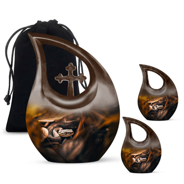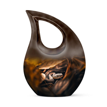 The Snake Urn is a striking embodiment of serenity and solemnity, crafted for those seeking meaningful memorial urns. Our 10-inch urn provides plenty of space, holding up to 200 cubic inches, capable of containing the ashes of an adult. Weighing a sturdy 3.3 pounds, this aluminium-built urn exhibits the resilience and nobility of a snake, signifying the relentless spirit of the one it represents. The distinctive Cross Drop design adds an element of reverence, fostering a profound sense of respect and remembrance. This comes in a velvet pouch, providing secure containment for the ashes of your loved ones. Our urn embraces customization - personalize it with engraved names to create a unique remembrance. This Snake urn is an example of Large Urns, designed with the ease of usage for adults and seniors. Suitable for Urns for Angels, Urn for Mom, Remembrance Urns for Ashes, Modern Urns for Ashes, or Burial Urns for Human Ashes. An excellent tribute to the unforgettable souls that have graced your life.