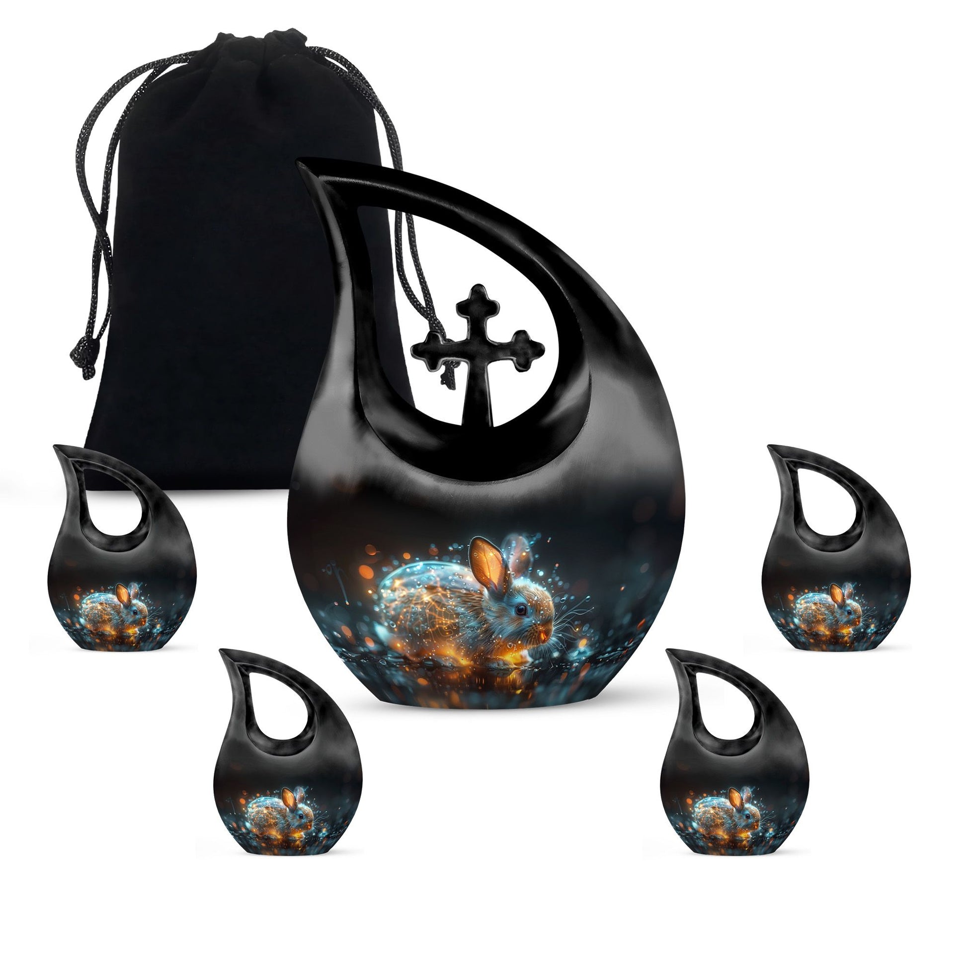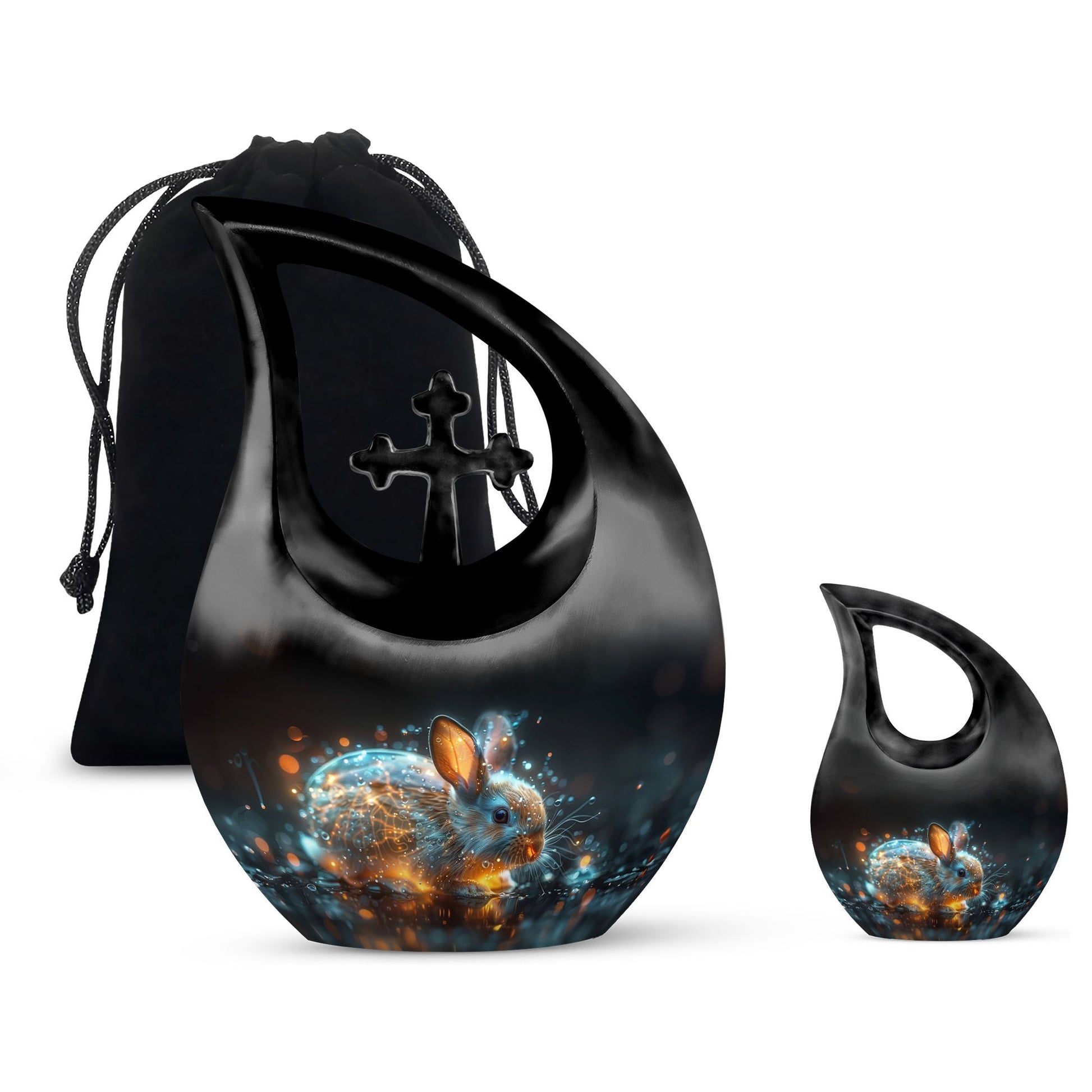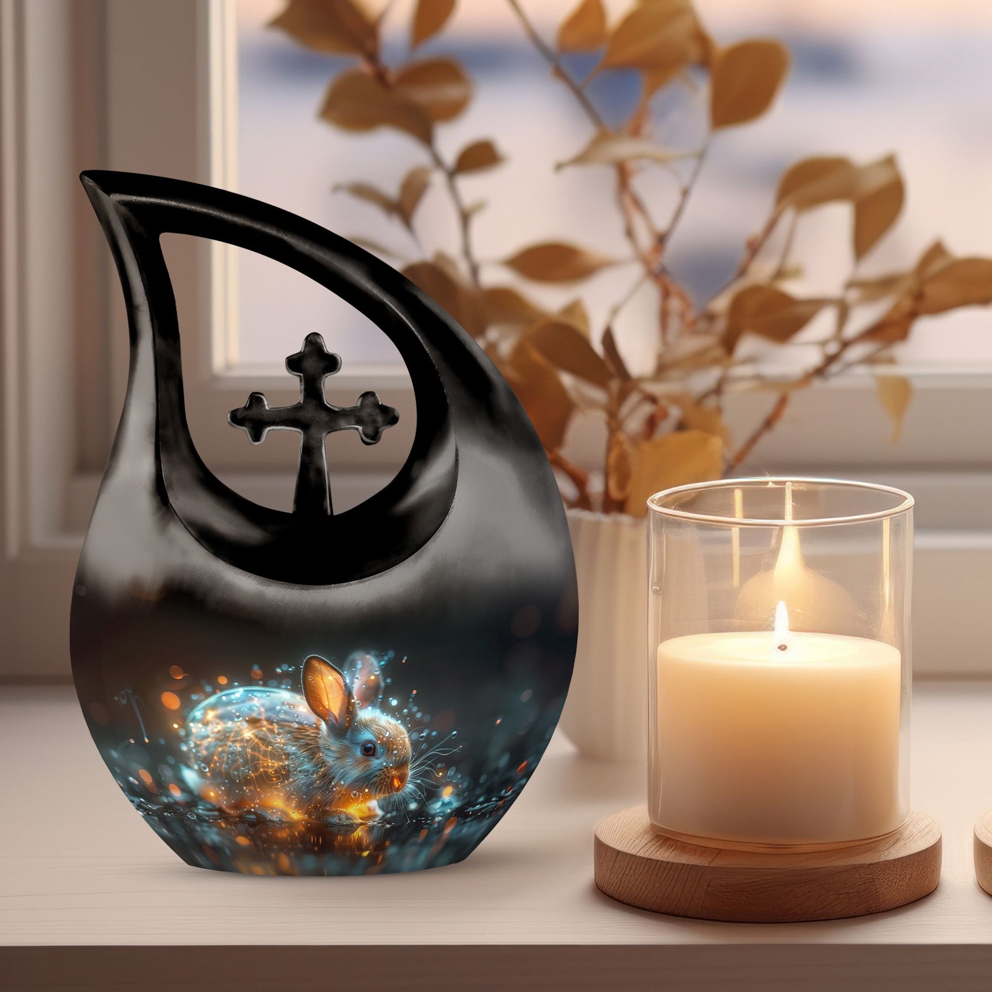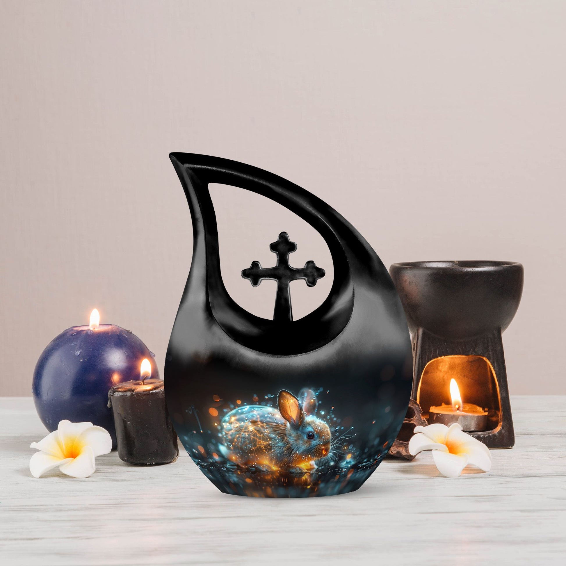 Lend tranquility and acceptance to your memorial ceremonies with our Luminous Mystic Hare Urn, an exceptional piece among large urns designed for adults and seniors. Themed around the ‘Luminous Mystic Hare', this 10-inch tall urn creates a profound ambiance. Crafted meticulously from sturdy aluminium, this urn weighs a modest 3.3 pounds and can hold up to 200 cubic inches of ashes. Its unique Cross Drop urn design further enhances its spiritual charm. With the ability to personalize via engraved names, you can make this urn a heartfelt tribute to your loved ones. Each purchase comes packaged with a velvet pouch for discrete and respectful containment of ashes. While this urn discreetly serves its purpose, it also blends seamlessly into your decor. This listing is for the 'Luminous Mystic Hare Urn', highly sought after in small urns for ashes for adults, cheap cremation urns for adults, and cremation options for ashes categories, providing both a respectful memorial and a beautiful artefact.