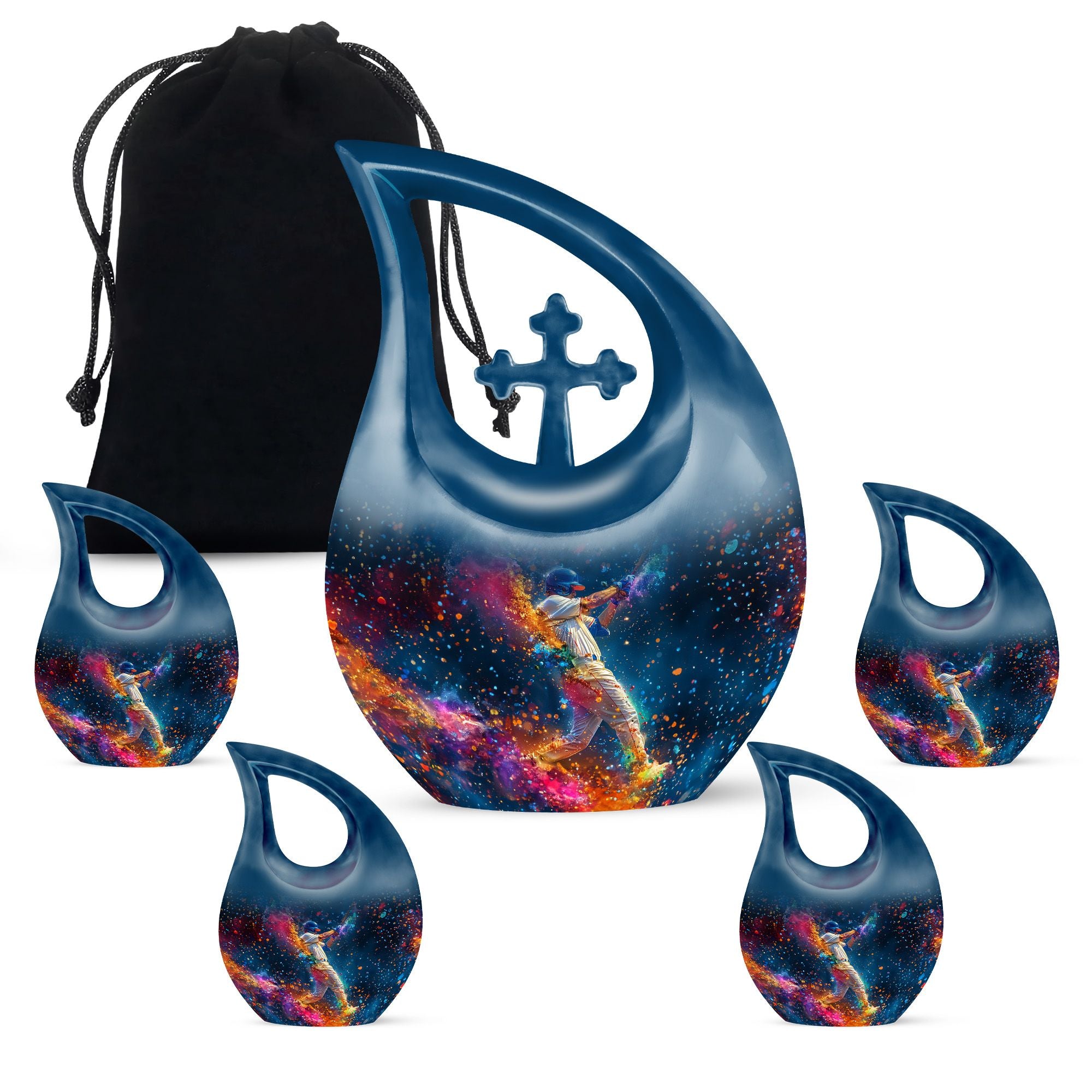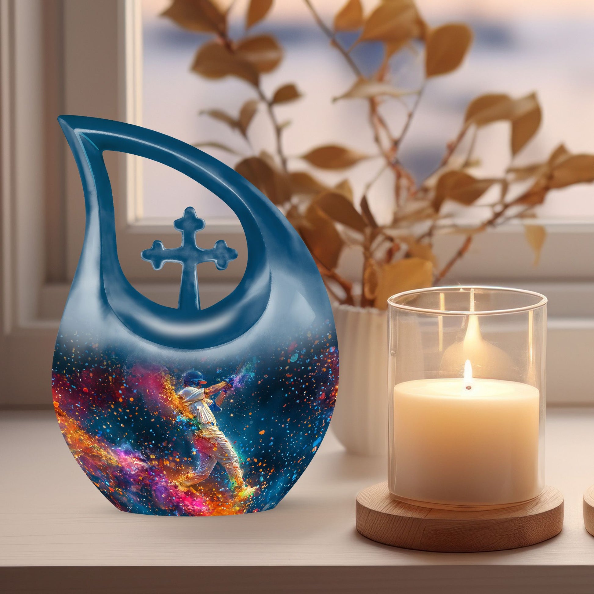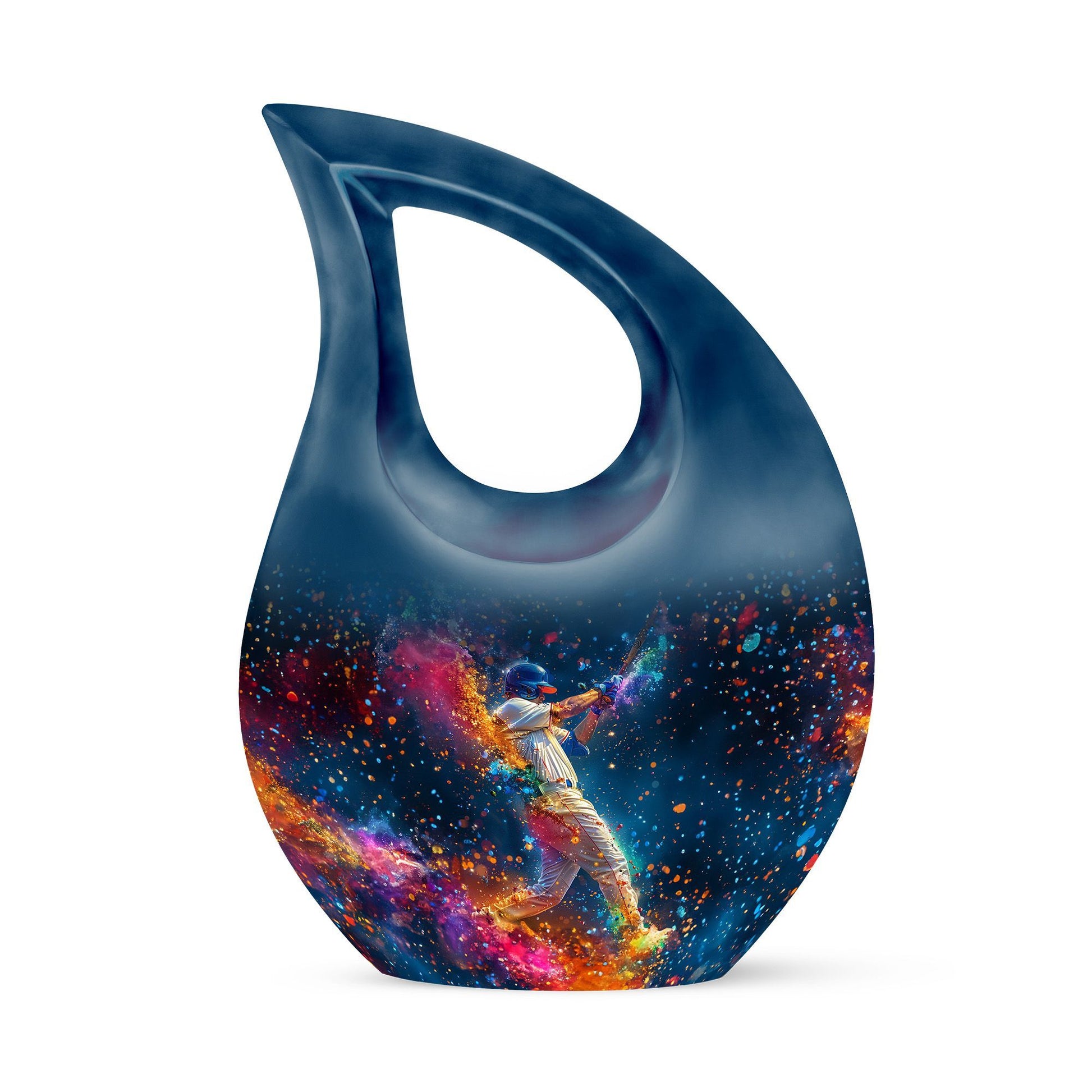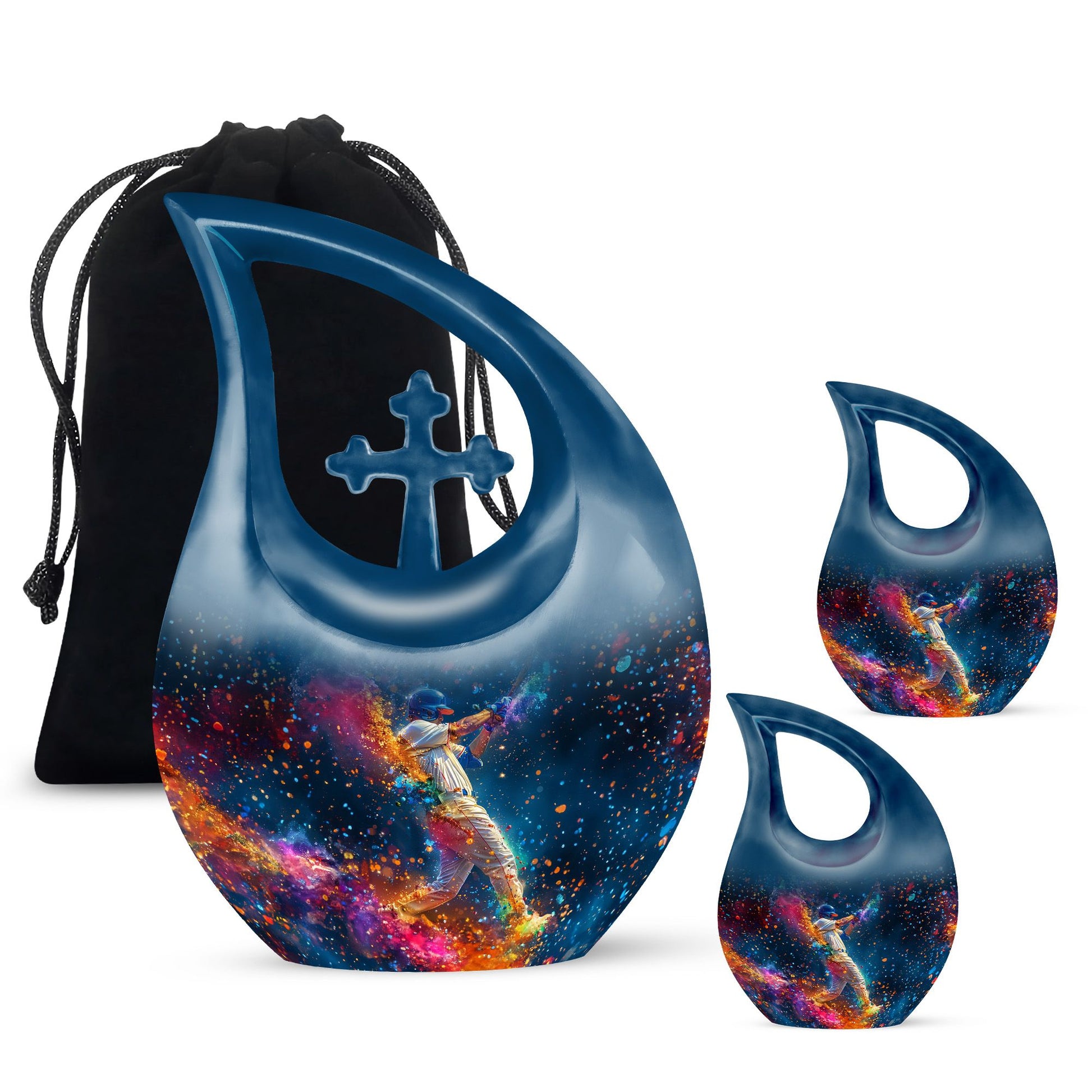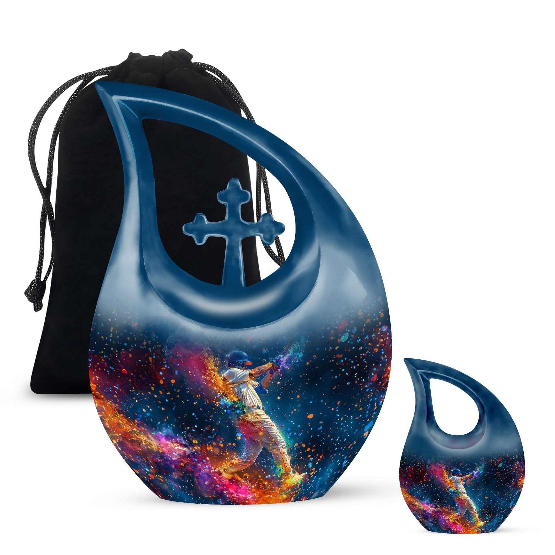 Honor your cherished one's memory with our 10 Inch Cross Drop Baseball Urn, an exquisite tribute designed meticulously to hold precious ashes. Crafted from robust aluminium, these extra-large cremation urns are substantial, with a weight of 3.3 pounds, and feature poised dimensions of 10 inches in height. Accepting a remarkable 200 cubic inches in capacity, our urns deliver solace and respect, paying homage to the departed soul. Personalization is available, allowing the engraving of names to maintain a connection beyond the veil. The urn comes with a comforting velvet pouch, ensuring safe containment of the fine ashes. This urn, symbolic of baseball's resilience and spirit, provides an earnest way to preserve the memory of your loved ones. Whether you're seeking to buy an urn or seeking companion options, our collection is unconditionally reliable. Promote peace with these metal urns for ashes, often rendered as the ultimate memorial urns.