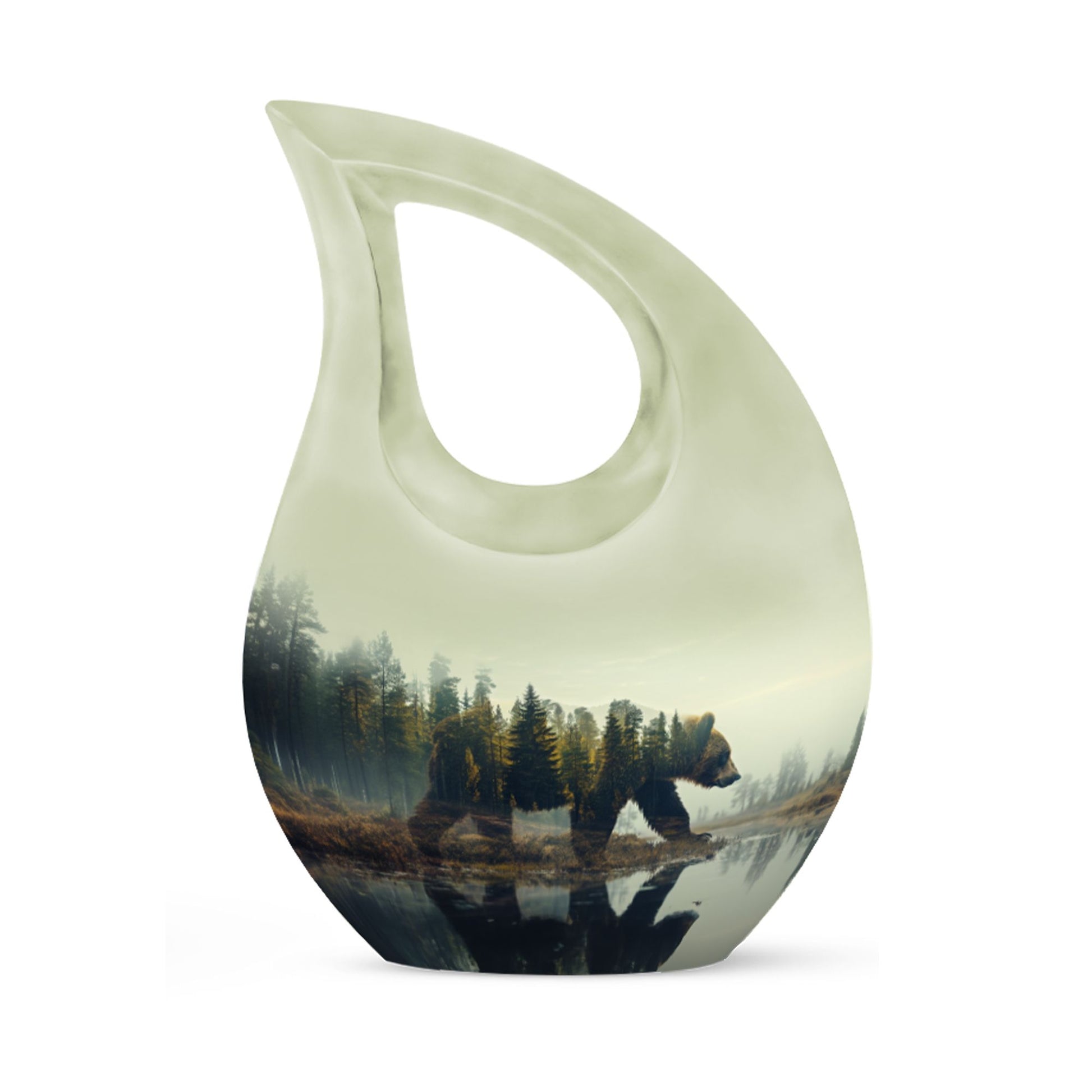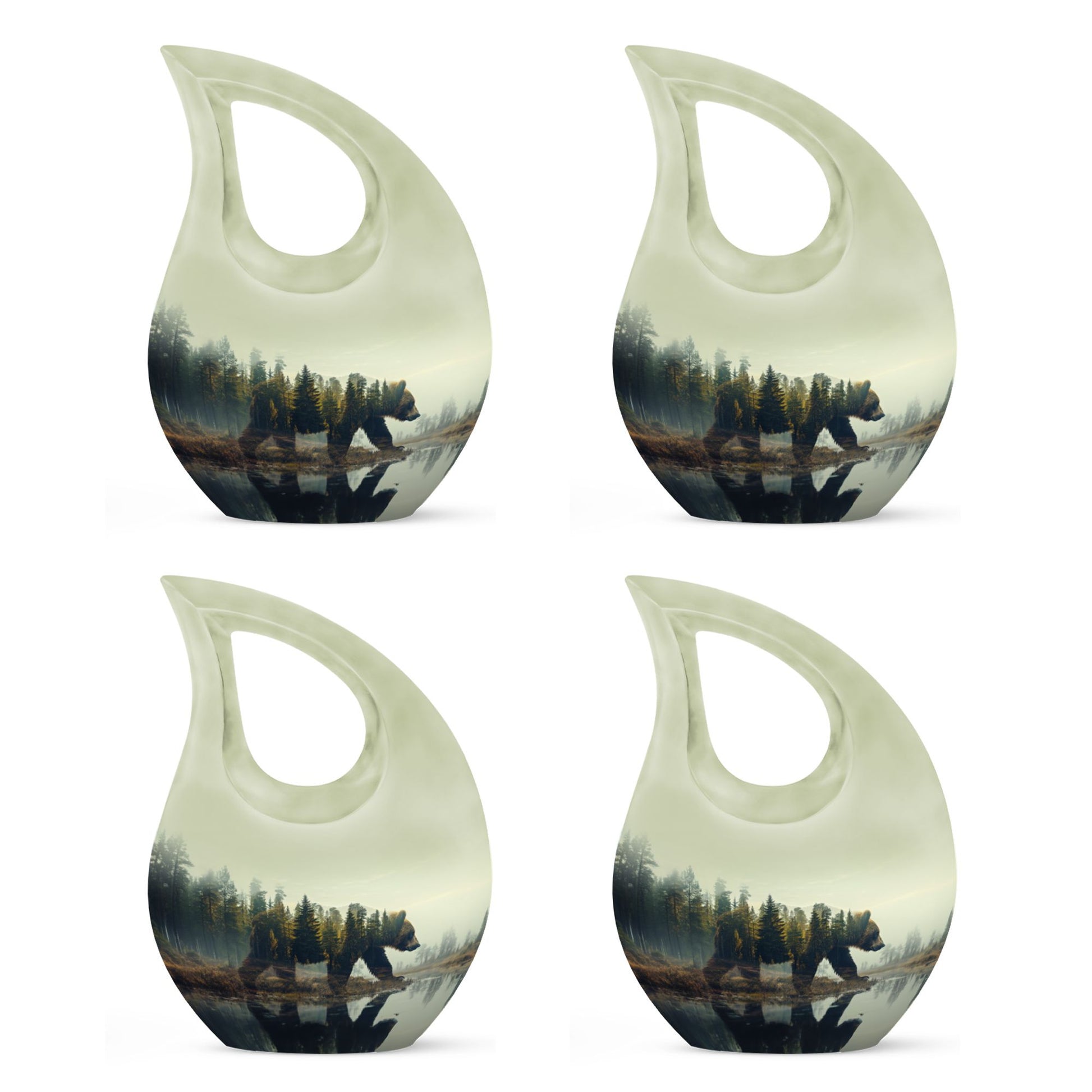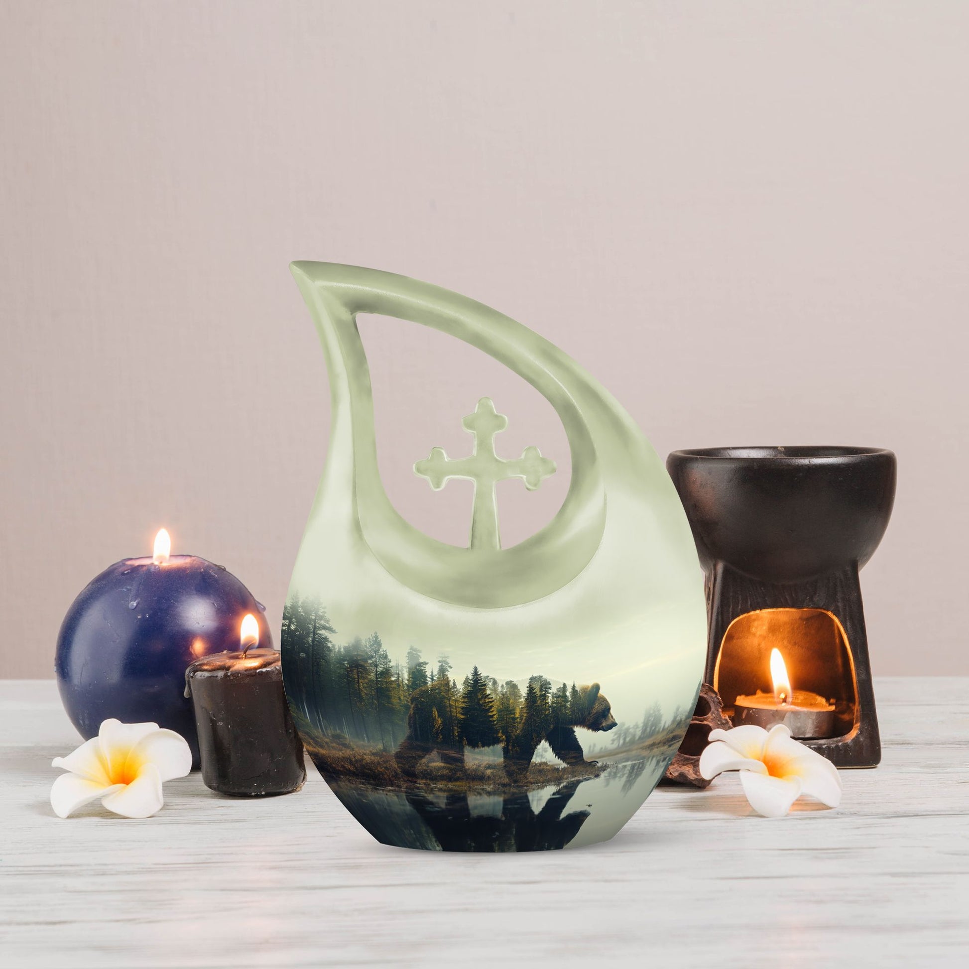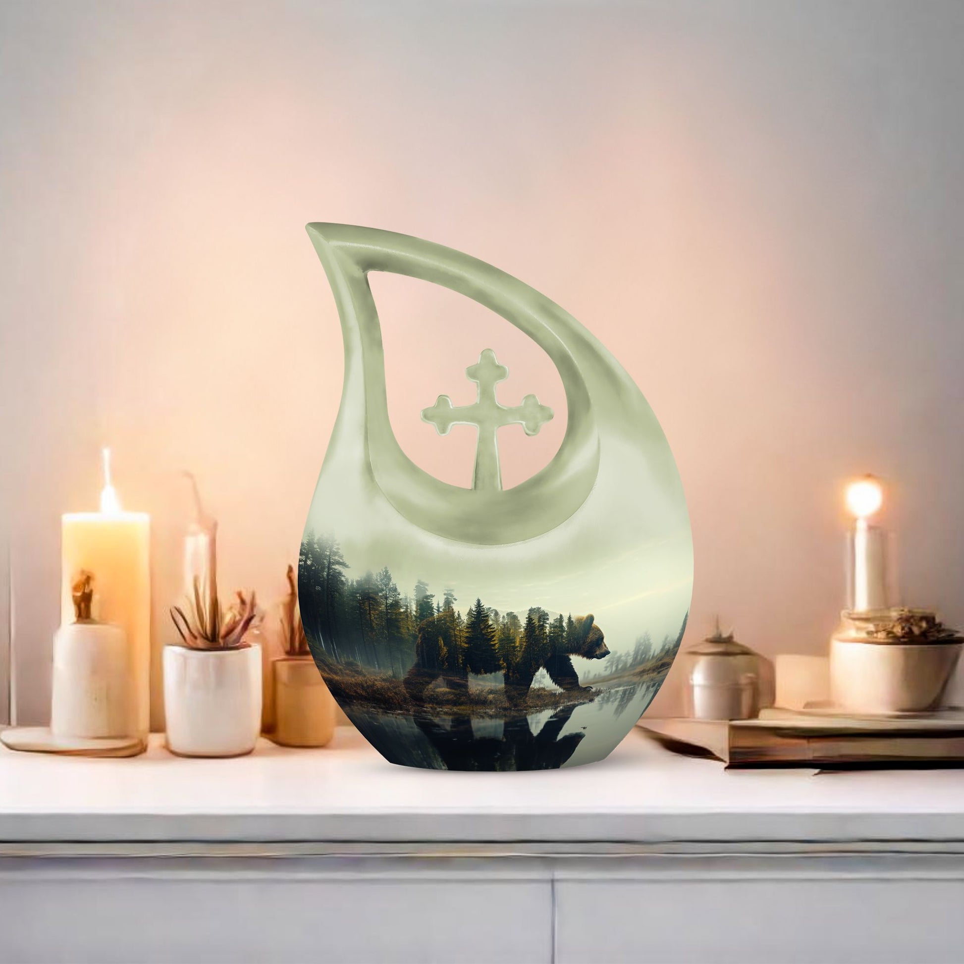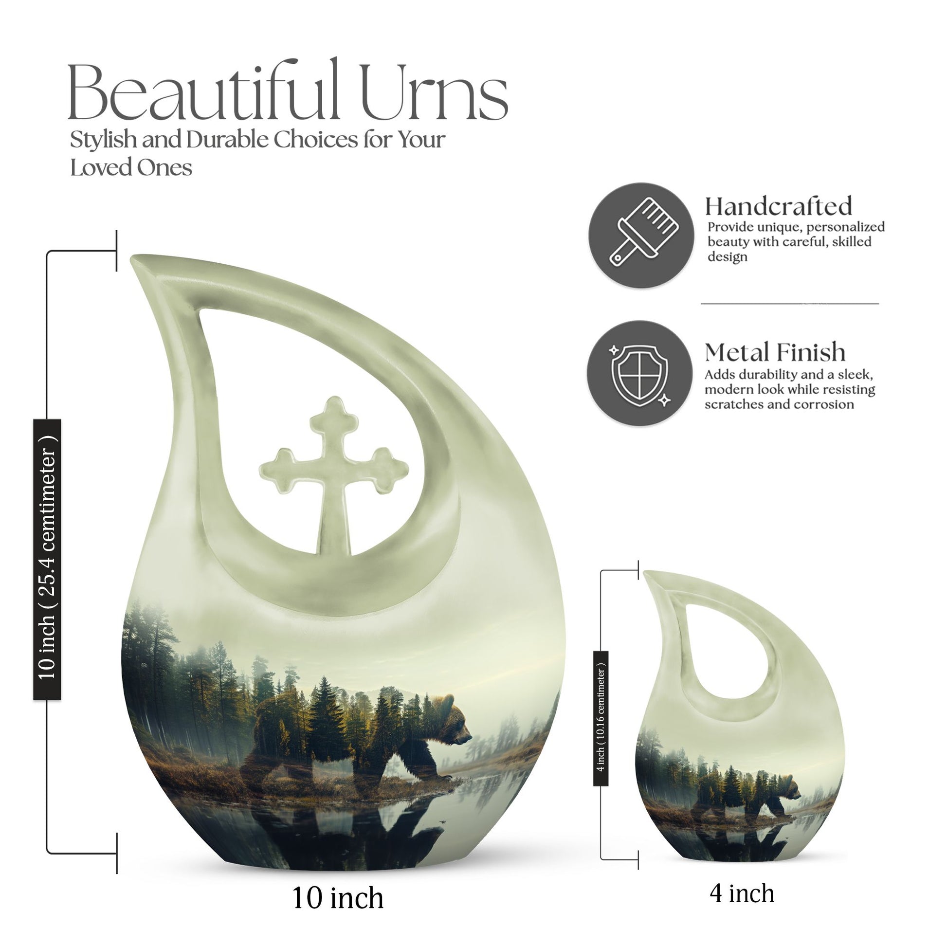 Preserve memory intact with our 10-inch Bear Urn, a masterpiece among Extra Large Cremation Urns. Delicately crafted in aluminium, this large urn weighs 3.3 pounds and can gracefully hold up to 200 cubic inches of remains within. Its 10-inch stature showcases a significant presence and is conveniently sized for display on mantels or shelves. The defining feature of this urn, the 'Cross Drop' pattern, adds a prominent heraldic touch to its overall aesthetics. To make this urn uniquely yours, we offer the ability to personalize it with engraved names. Each urn comes with a velvet pouch to gently encase the ashes, furthering its appeal. Brought together, these elements resonate with the symbolic sanctity of memorial urns, creating an enduring tribute to those departed. It's not just about buying an urn; it's about finding the best urn that stands as a testament to the cherished bond you shared. Whether you are seeking metal urns for ashes or companion urns for ashes, our Bear urn elegantly embraces the epitome of memorial ceremony supplies.