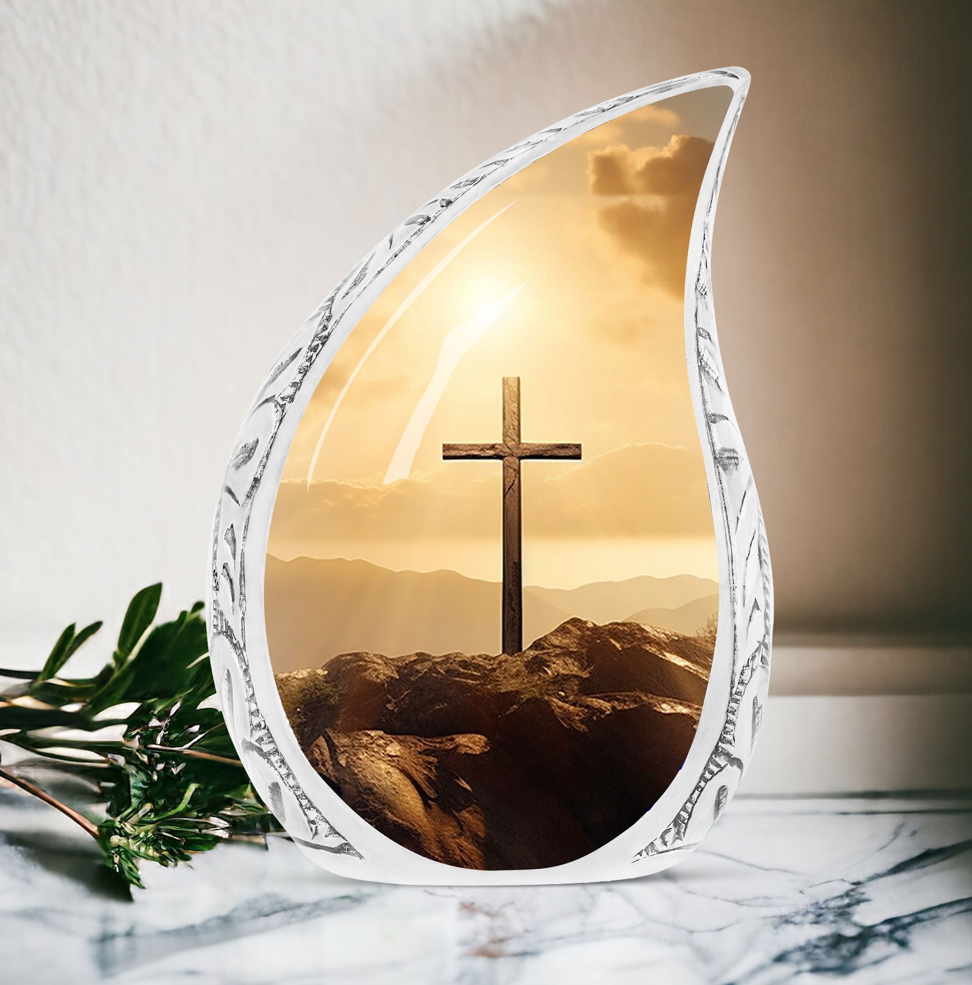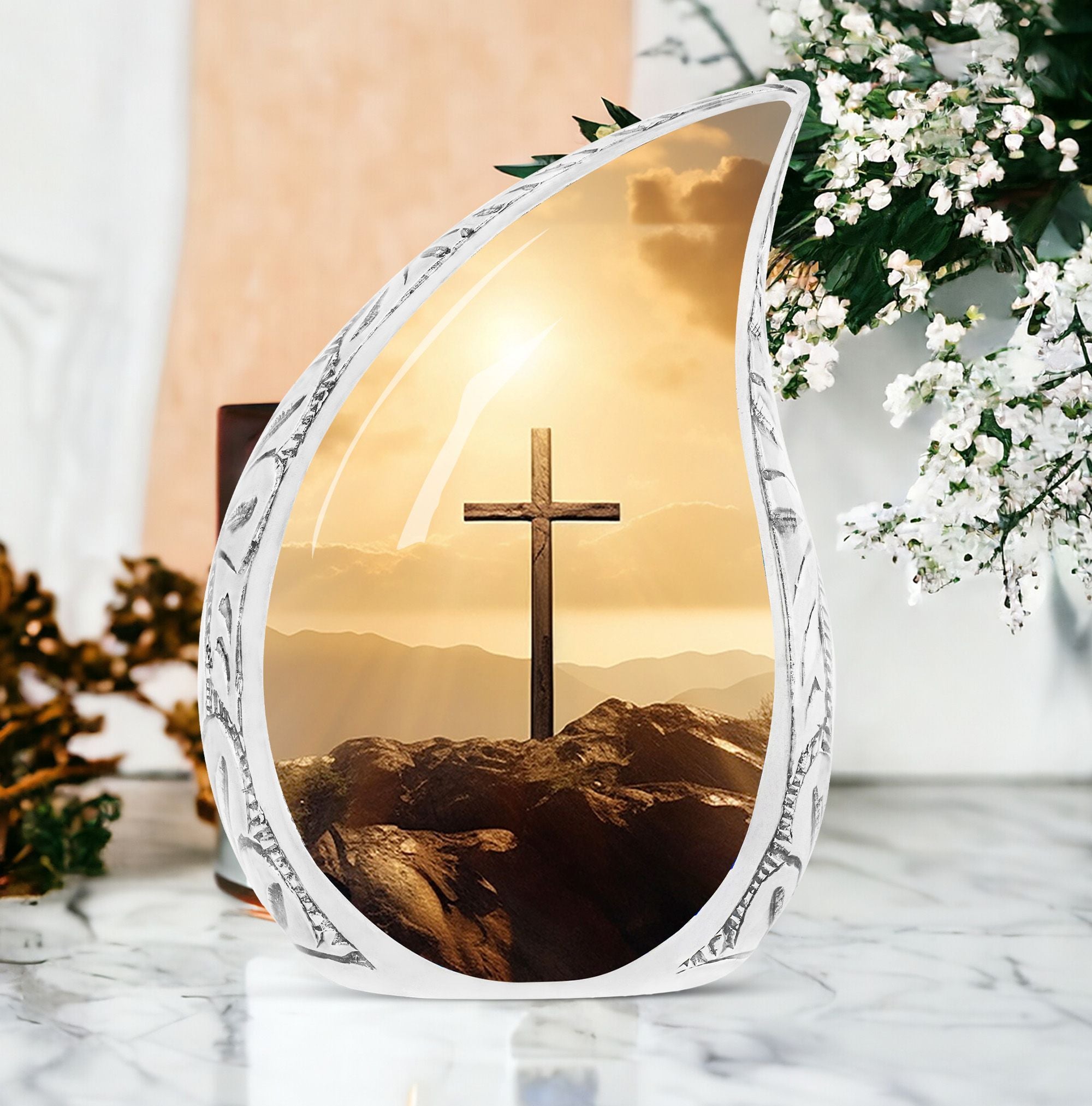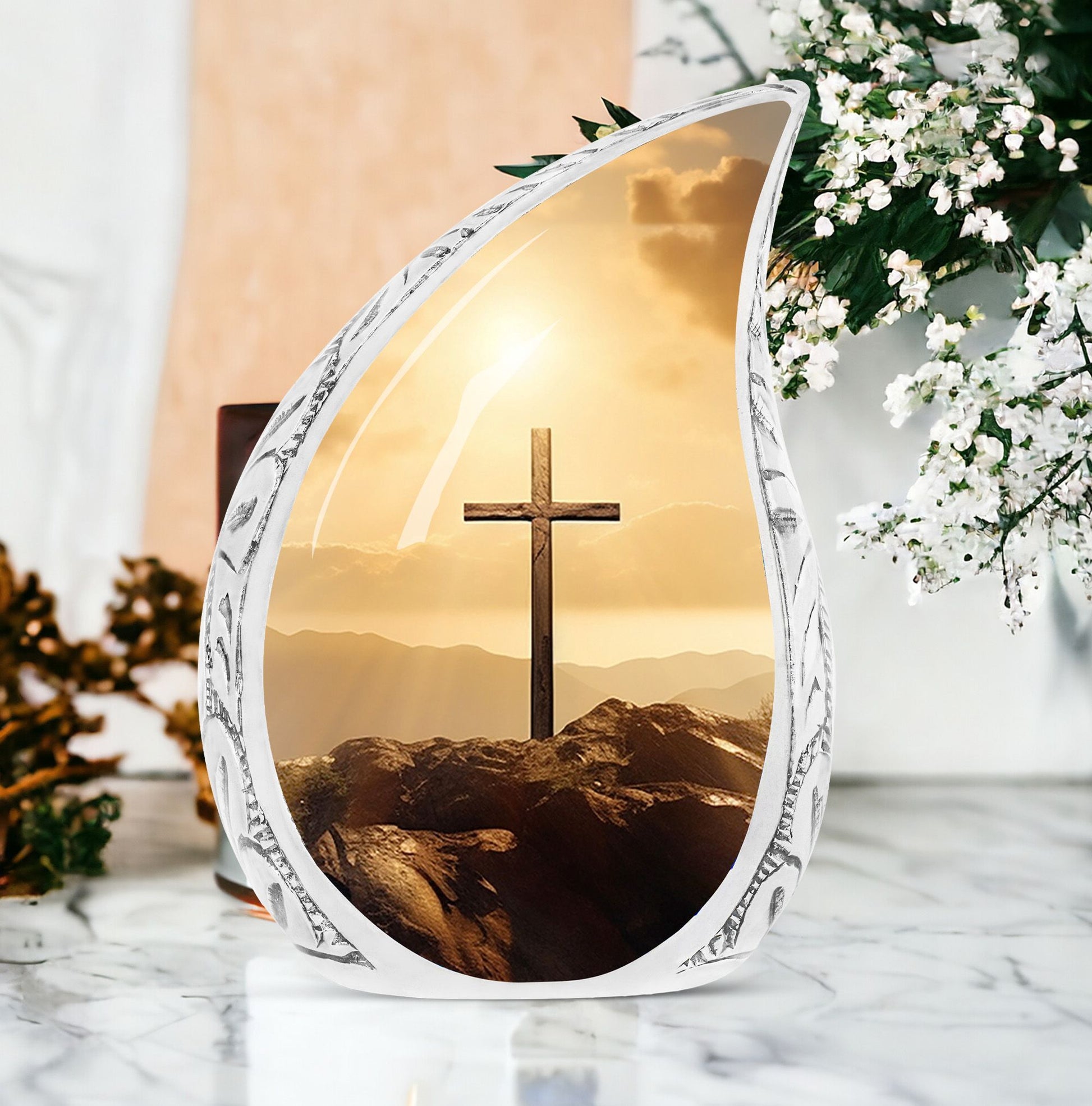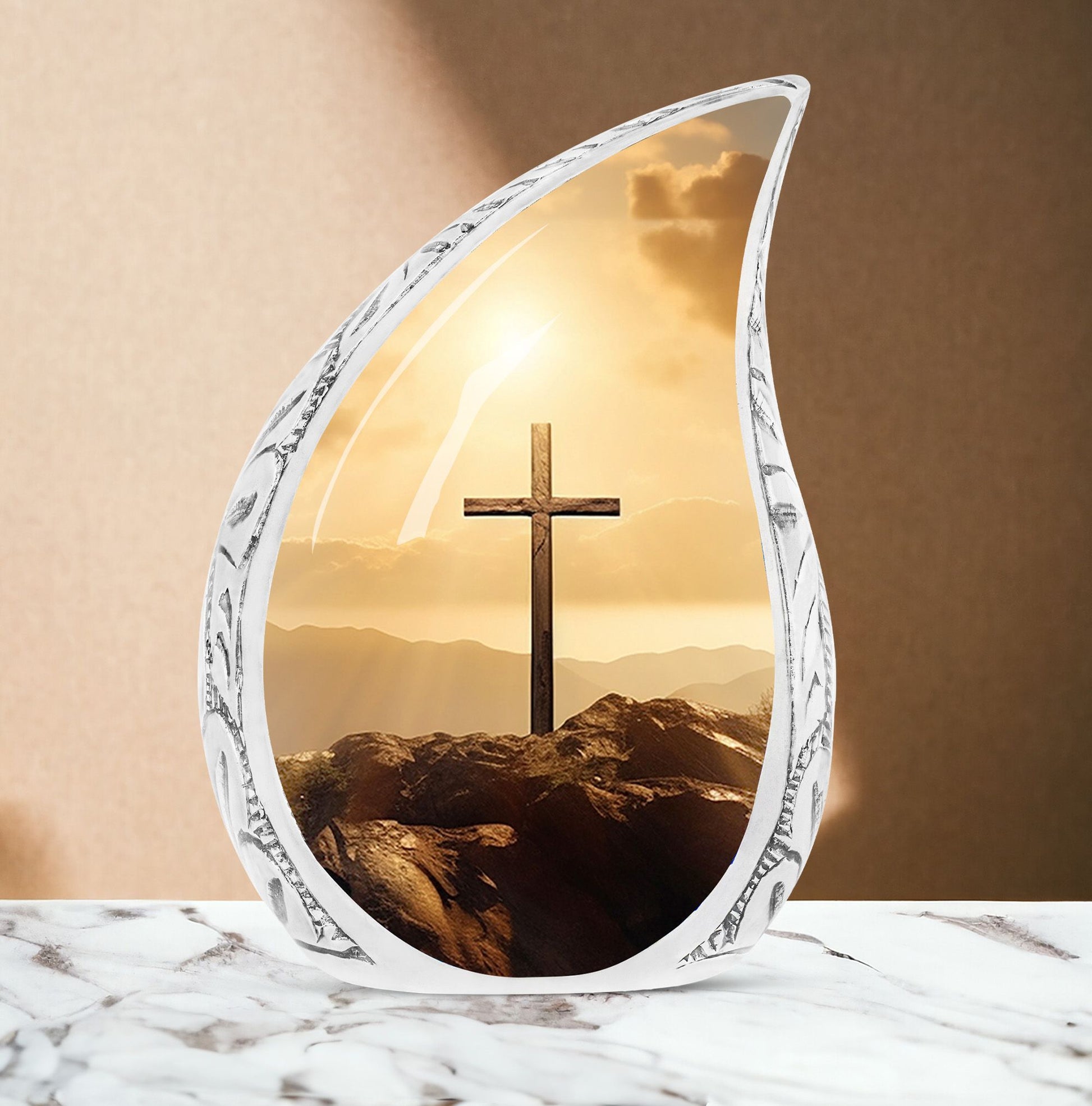Honor your departed loved one with our Jesus Cross Memorial Urn. A symbol of faith and hope, it offers a poignant and respectful way to pay homage. Constructed with aluminum, this large urn defines durability, promising to enshrine memories forever. Measuring in at a hefty 3.3 pounds with dimensions of 10 inches in height, it boasts a capacity of 200 cubic inches. This ensures adequate room to store precious ashes securely. It is not just the material robustness that sets this piece apart, but the customizable aspect as well. Personalize it with engraved names adding an intimate touch that truly celebrates the individual. The Jesus Cross Memorial Urn comes with a velvet pouch, providing an elegant containment solution for the ashes. An essential in Memorial Ceremony Supplies, this large urn is a solemn reminder of fond memories, regardless if you're looking for burial urns for adults, a unique urn container, or customized cremation urns.