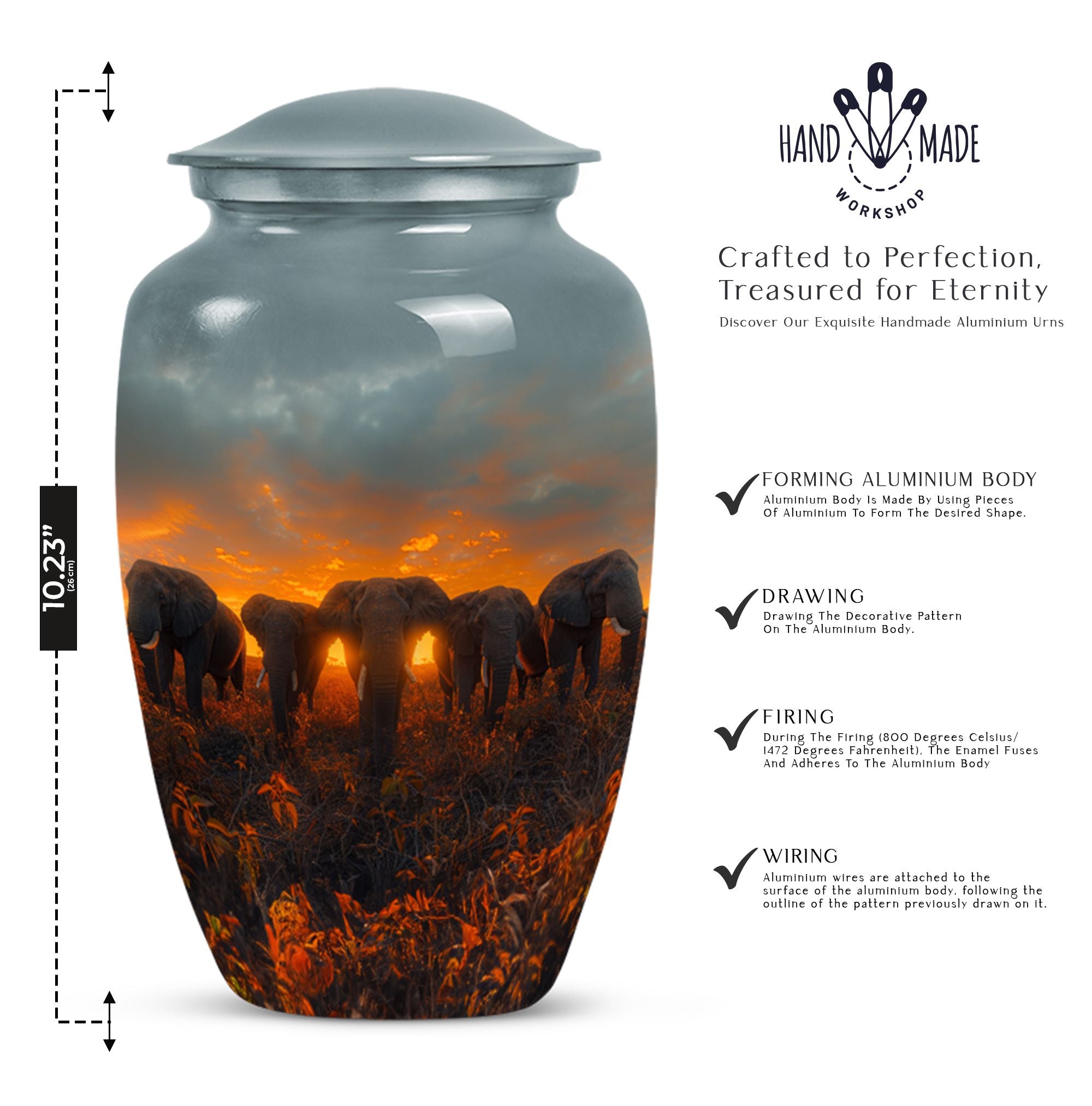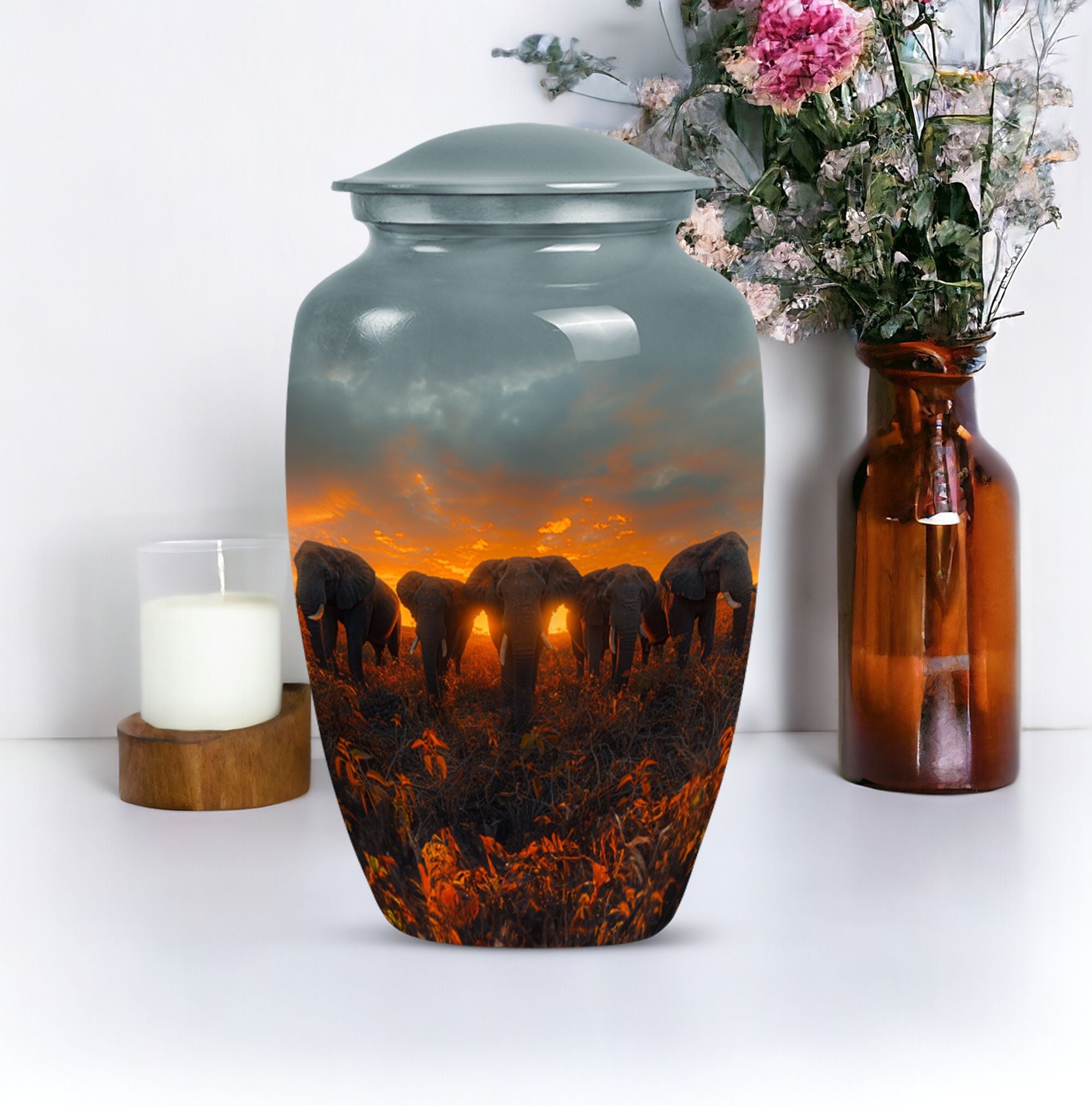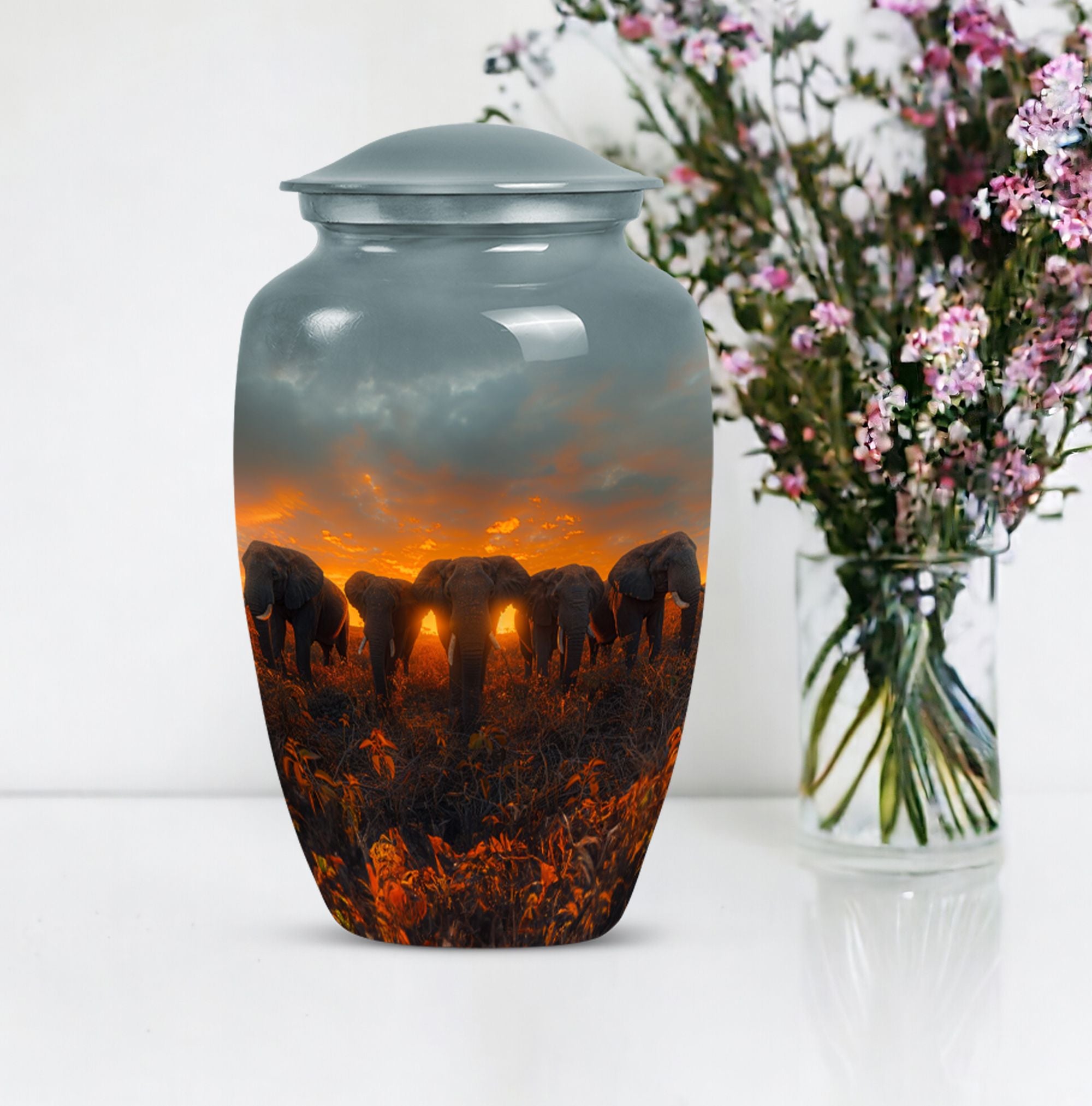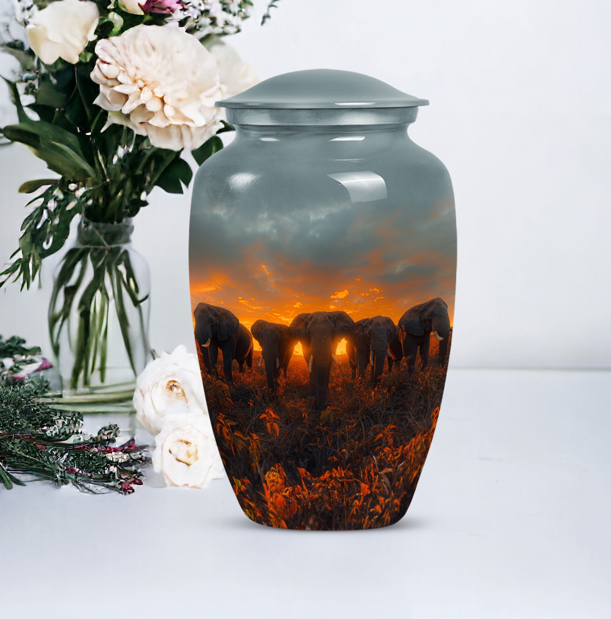 Discover the dignified beauty of our Elephant Family Urn, a notable choice among funeral cremation urns for women. This distinguished 10-inch urn showcases a delicate butterfly theme that harmoniously blends love and remembrance. Crafted from high-quality aluminium, it features dimensions of 10 inches in height and a weight of 3.3 pounds. This large urn an exceptional capacity of 200 cubic inches, ensuring it's adequately spacious to hold the treasured ashes of a loved one. We understand the solace that personalization can bring, and this urn proffers the option to personalize with engraved names, making it that much more special. The Elephant Family Urn comes with a plush velvet pouch for the respectful containment of ashes. This beautiful urn is a token of remembrance that will resonate deeply, offering a thoughtful and poignant way to commemorate those we've lost. If you're searching for 'memorial urns' or 'memorial large urns for ashes', don't look further than our classic urn, the perfect blend of tasteful aesthetics and heartfelt tribute.