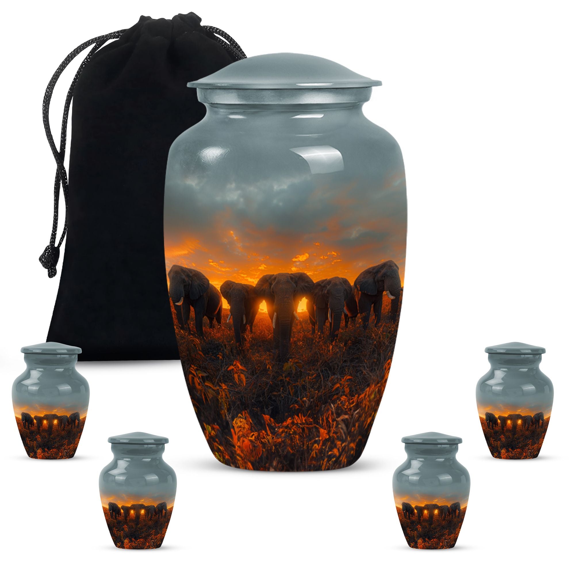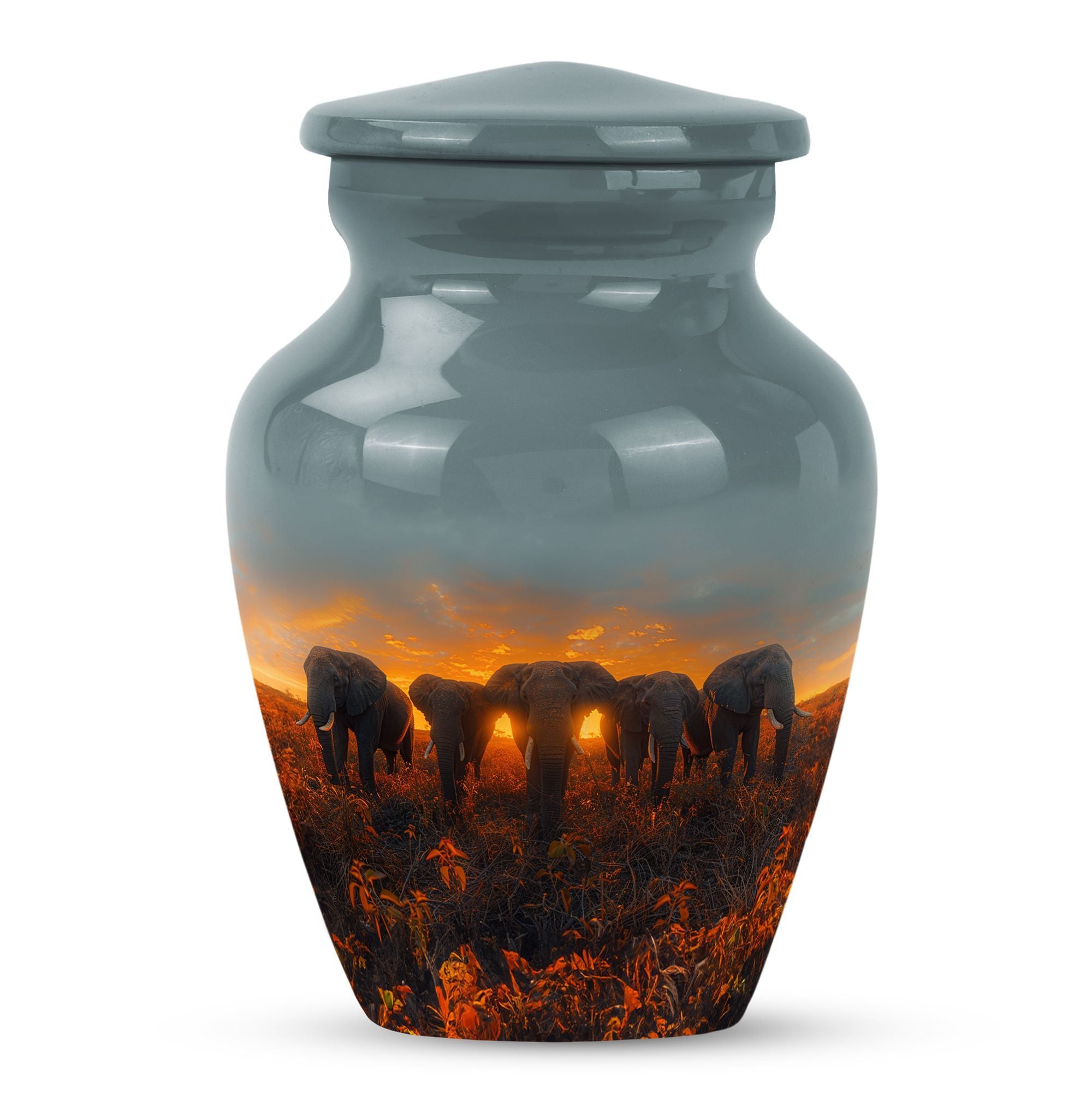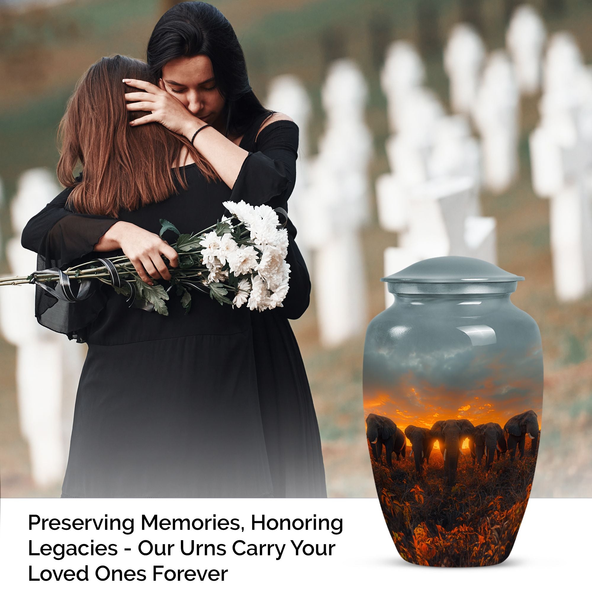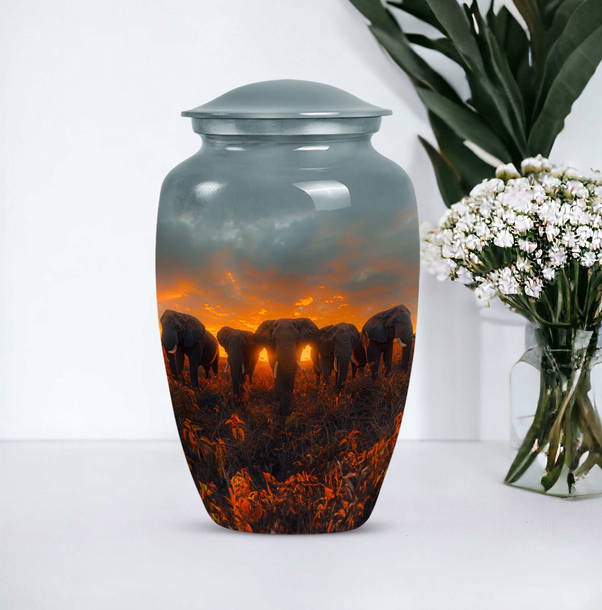 Discover the dignified beauty of our Elephant Family Urn, a notable choice among funeral cremation urns for women. This distinguished 10-inch urn showcases a delicate butterfly theme that harmoniously blends love and remembrance. Crafted from high-quality aluminium, it features dimensions of 10 inches in height and a weight of 3.3 pounds. This large urn an exceptional capacity of 200 cubic inches, ensuring it's adequately spacious to hold the treasured ashes of a loved one. We understand the solace that personalization can bring, and this urn proffers the option to personalize with engraved names, making it that much more special. The Elephant Family Urn comes with a plush velvet pouch for the respectful containment of ashes. This beautiful urn is a token of remembrance that will resonate deeply, offering a thoughtful and poignant way to commemorate those we've lost. If you're searching for 'memorial urns' or 'memorial large urns for ashes', don't look further than our classic urn, the perfect blend of tasteful aesthetics and heartfelt tribute.