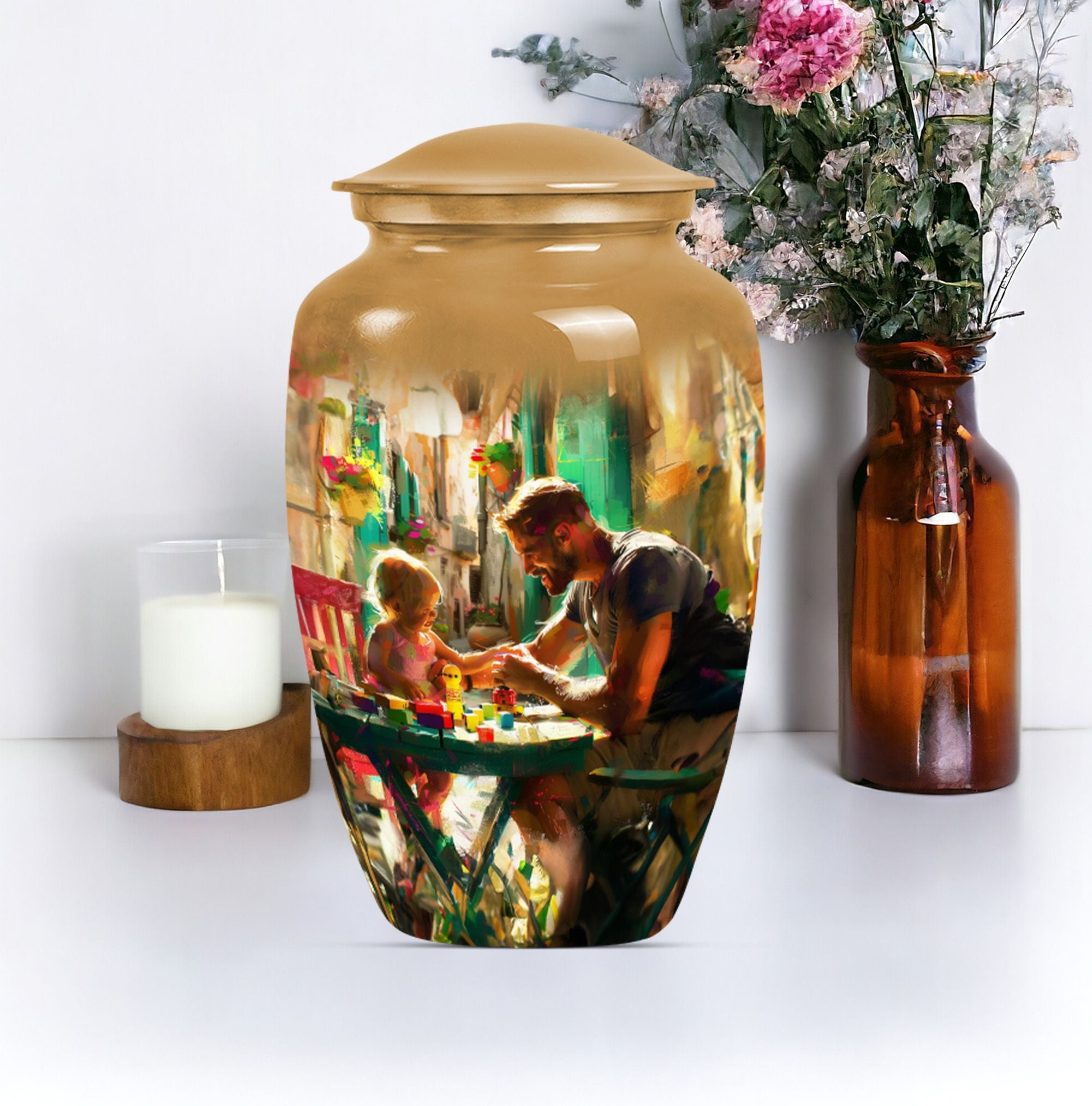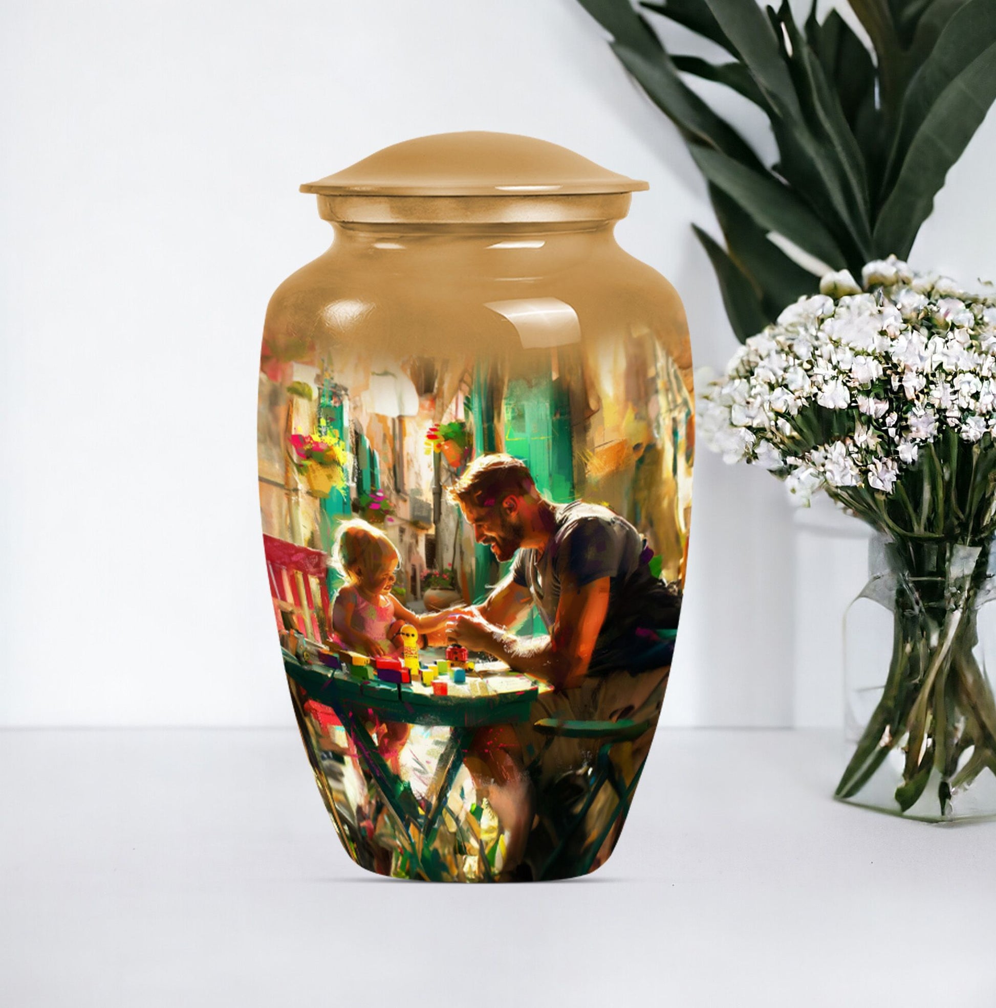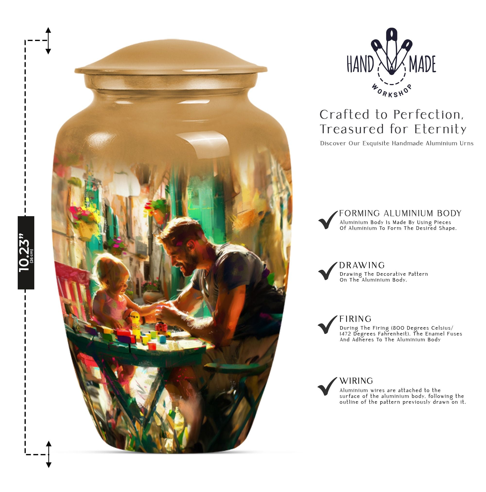 Our 10-inch classic urn, conscientiously crafted from enduring aluminium and adorned with an abstract theme, epitomizes a treasured keepsake for honoring your beloved father. With a capacity of 200 cubic inches, it can compassionately contain ashes, making it a fitting selection among large burial medium size urns. Despite its substantial size, it maintains a comfortable weight of 3.3 pounds, tenderly designed with balance and grace in mind. The package is complete with a velvet pouch, giving you a secure and dignified containment for the ashes. Further impart sentimentality by customizing this cremation urn with engraved names – a meaningful touch for a lasting remembrance. While this product satisfies the search for 'Cremation urns for women', it equally answers to those hunting for 'Artistic urns' and 'metal urns for burial in ground large' - making it a versatile choice in memorial ceremony supplies.