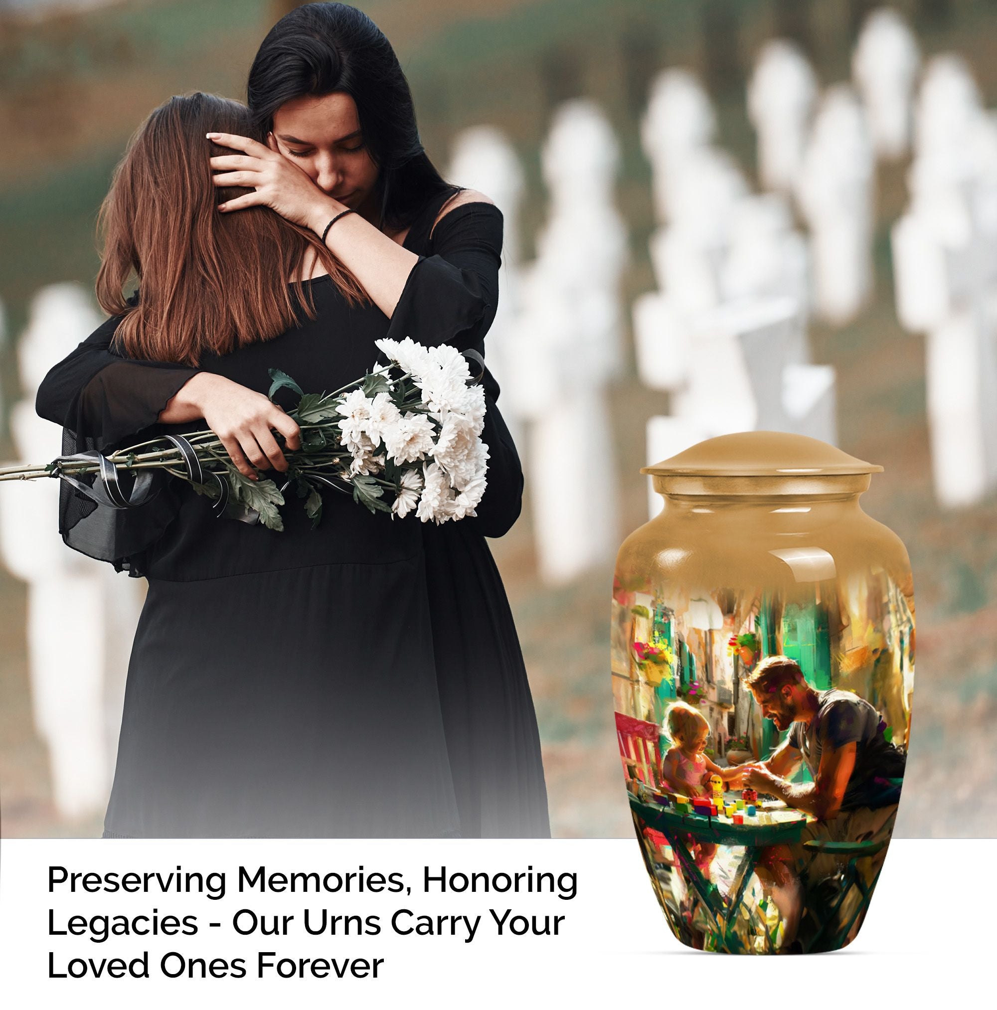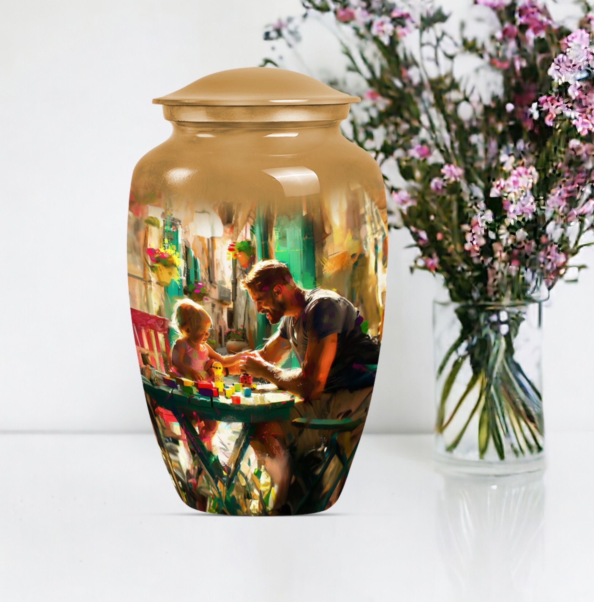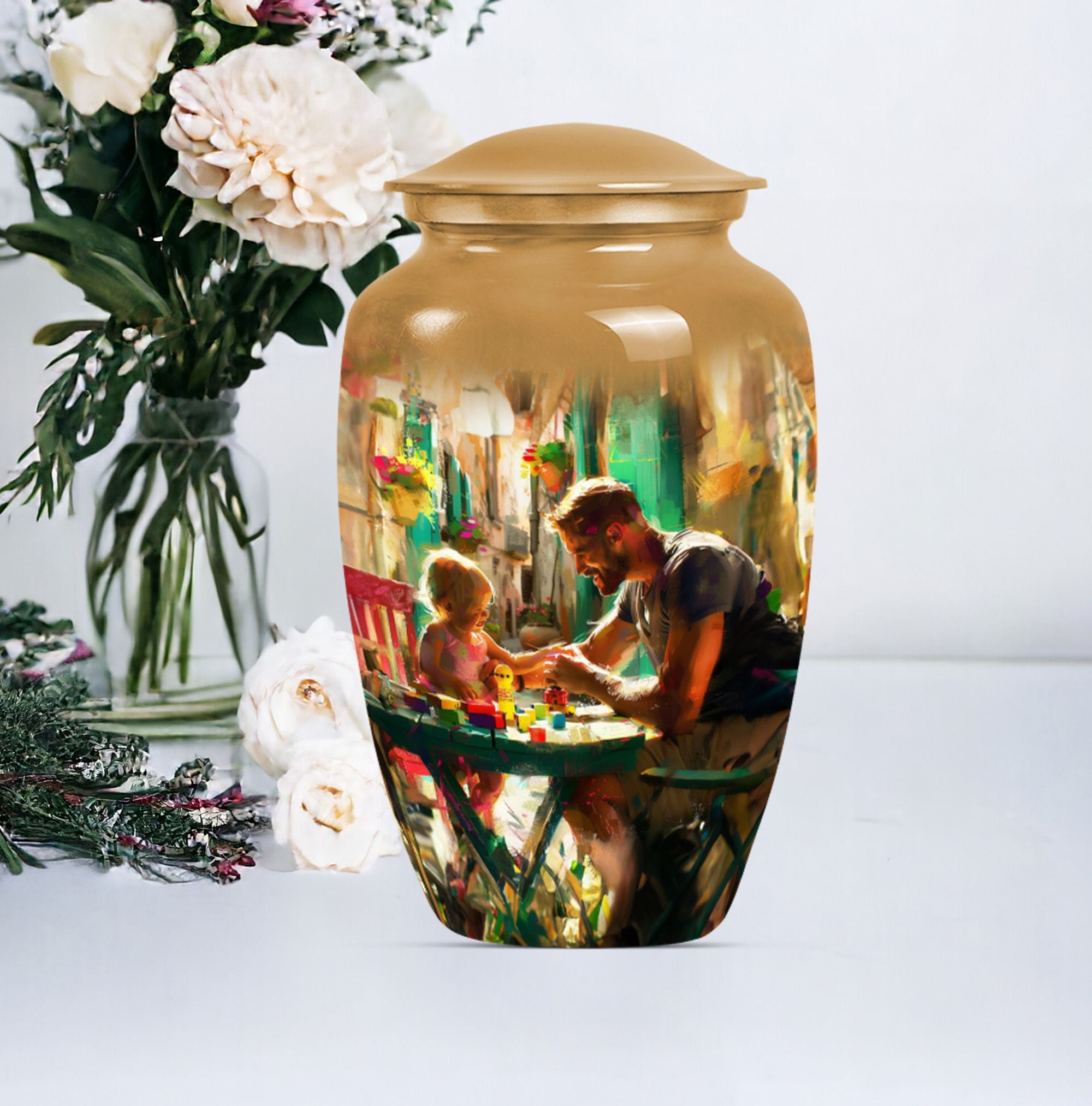 Our 10-inch classic urn, conscientiously crafted from enduring aluminium and adorned with an abstract theme, epitomizes a treasured keepsake for honoring your beloved father. With a capacity of 200 cubic inches, it can compassionately contain ashes, making it a fitting selection among large burial medium size urns. Despite its substantial size, it maintains a comfortable weight of 3.3 pounds, tenderly designed with balance and grace in mind. The package is complete with a velvet pouch, giving you a secure and dignified containment for the ashes. Further impart sentimentality by customizing this cremation urn with engraved names – a meaningful touch for a lasting remembrance. While this product satisfies the search for 'Cremation urns for women', it equally answers to those hunting for 'Artistic urns' and 'metal urns for burial in ground large' - making it a versatile choice in memorial ceremony supplies.