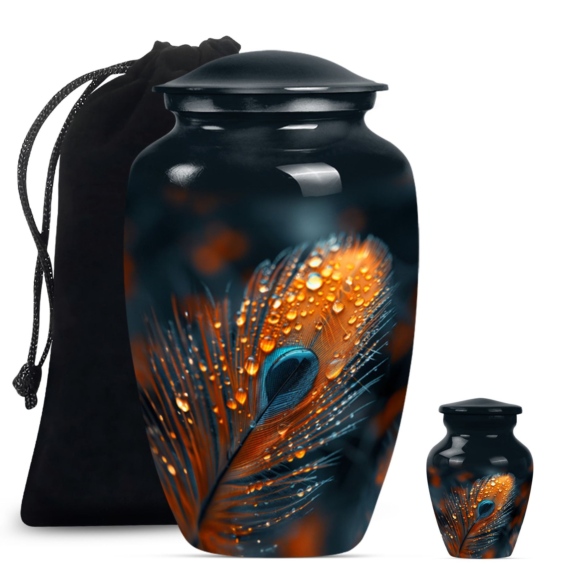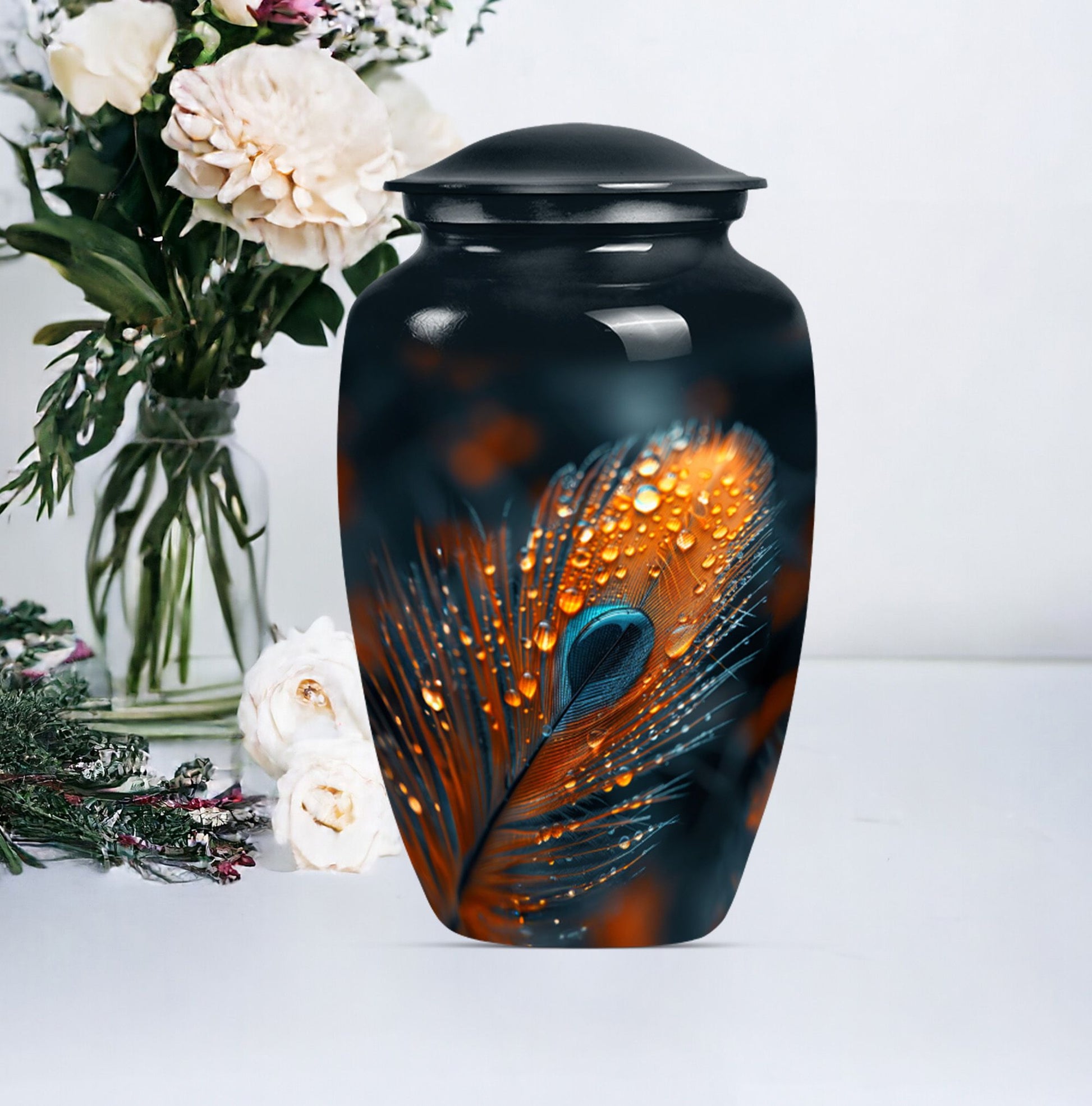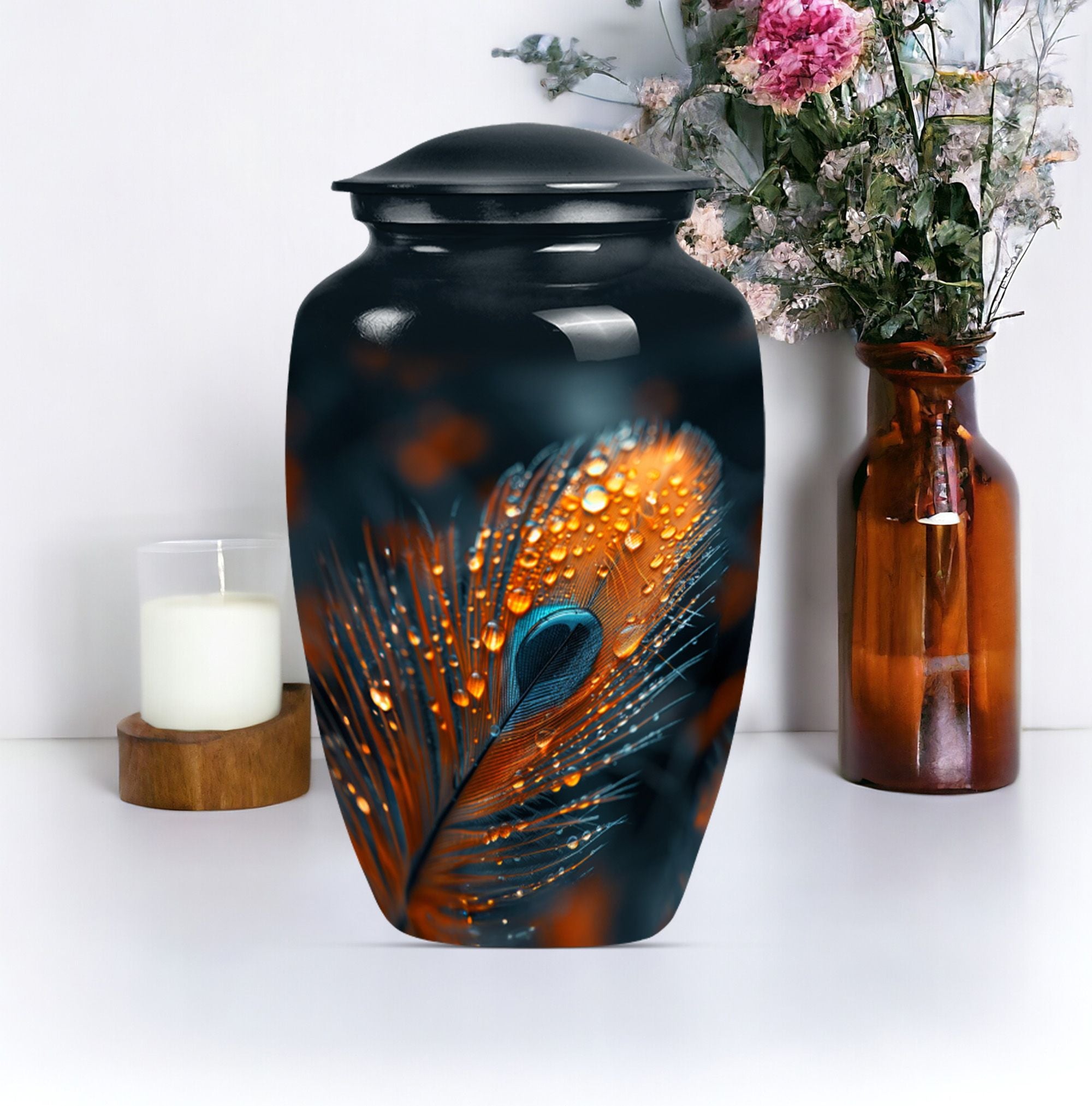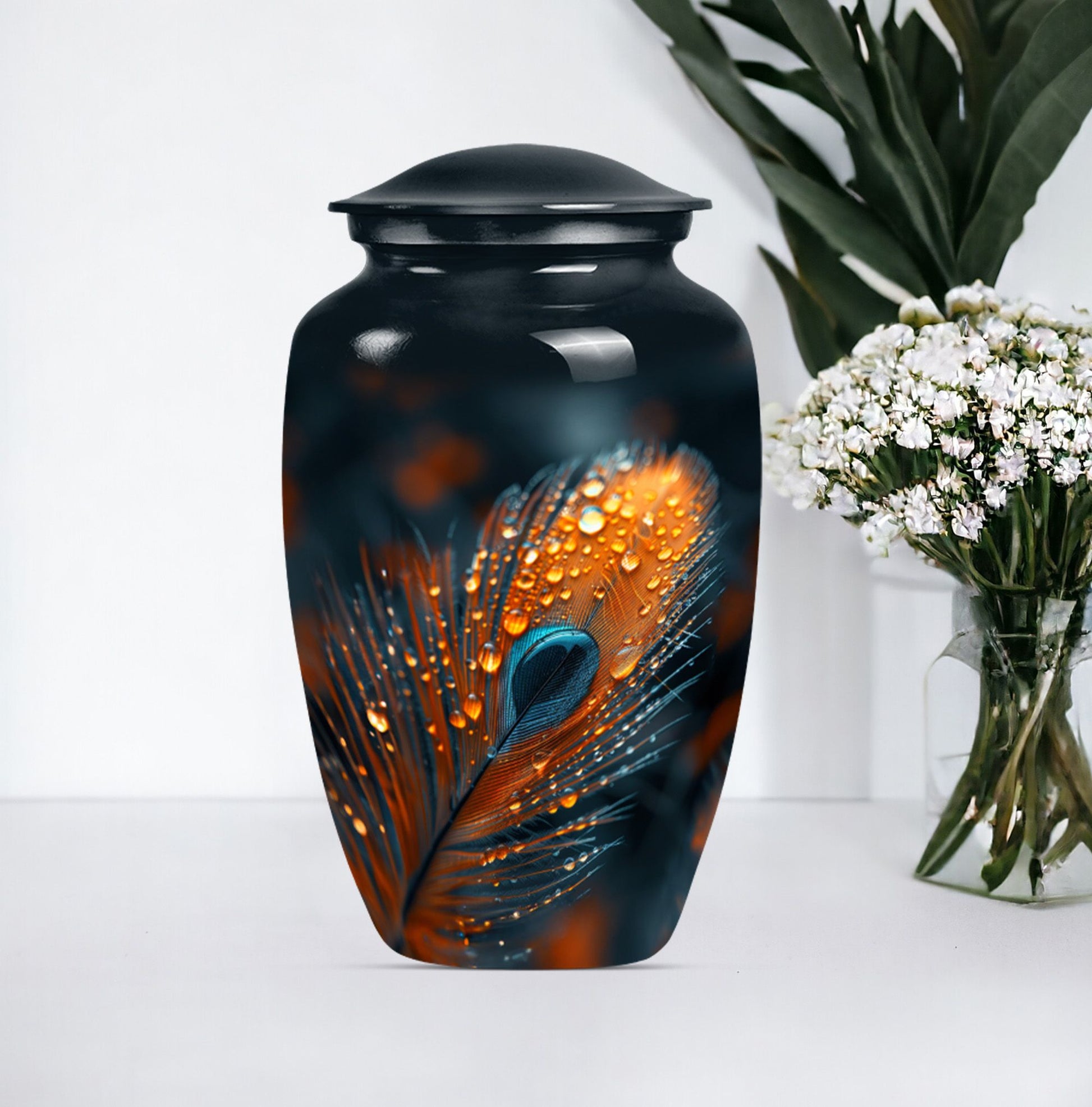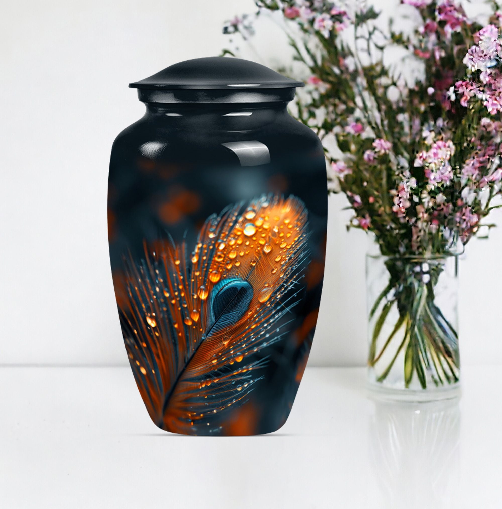 Exquisitely crafted to honor the memory of your loved ones, this purple meadow themed feather urn is a distinctive and respectful keepsake. Tailored specifically for adults and seniors intrigued in religious and memorial ceremony supplies, this unique piece has splendid practical and aesthetic qualities. Measuring 10 inches in height and weighing 3.3 pounds, this large urn accommodates up to 200 cubic inches of ashes, allowing a remembrance of dignity and respect. Crafted from durable aluminum, the longevity and resilience of this urn ensure its pristine condition for ages. The revered burial cremation urns come with a plush velvet pouch for containment of ashes, acknowledging your need for privacy. To add a heartfelt touch, you have the option to personalize it with engraved names. With unique terminology such as 'feather urn', 'memorial urns', 'cremation urns for men,' and 'urns for human ashes adult female,' it stands as an intricate commemoration of your loved one's journey.