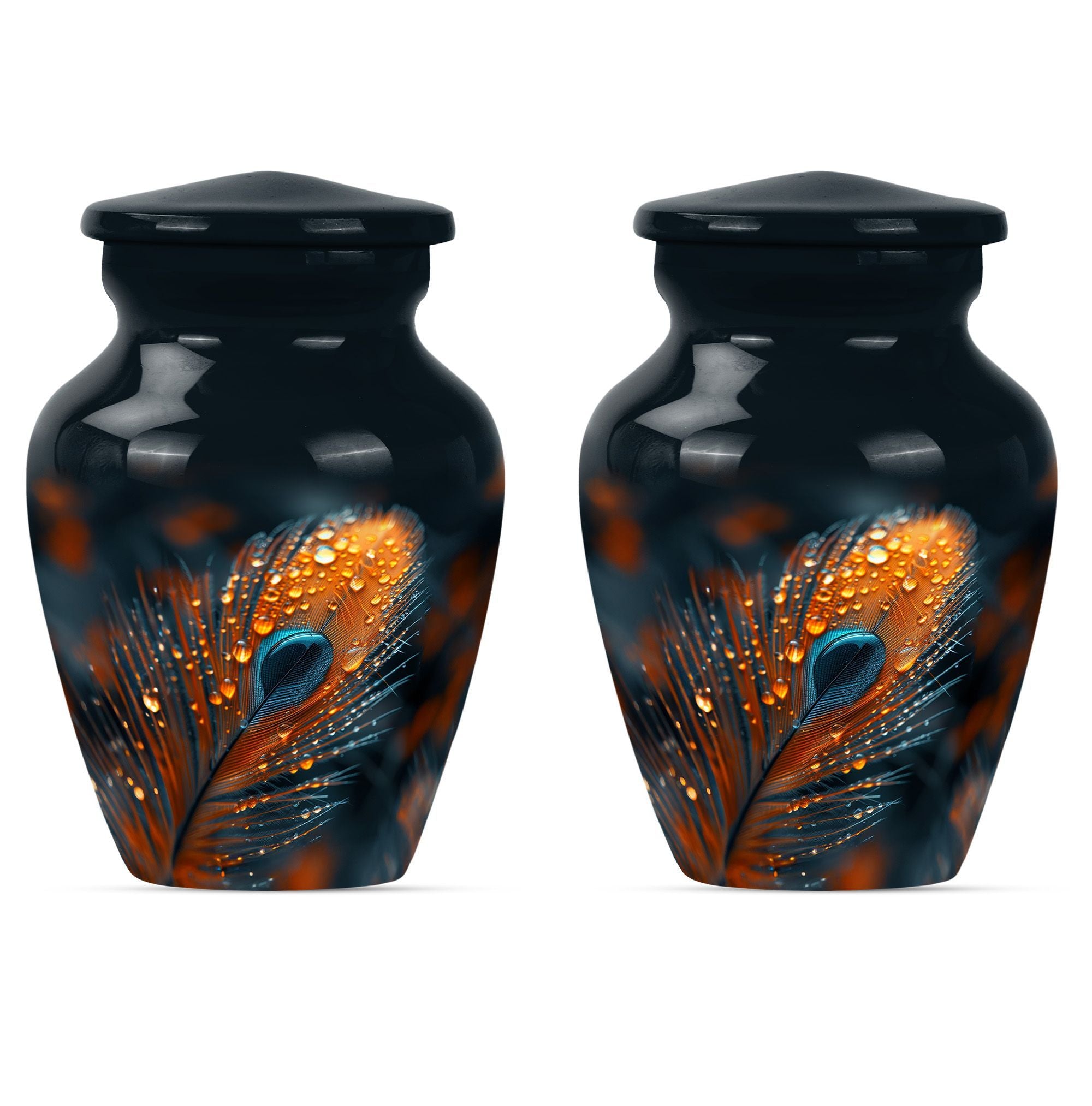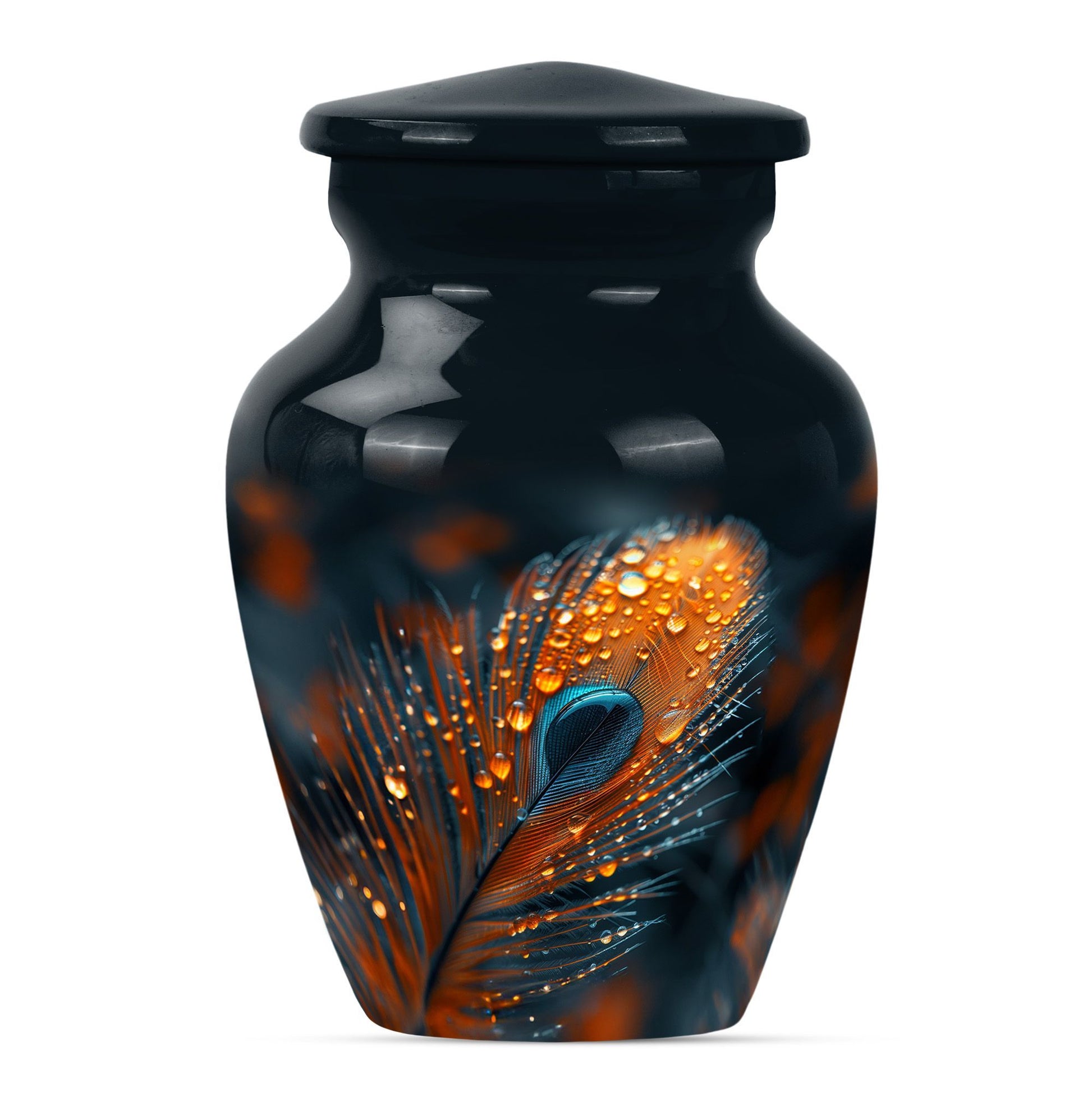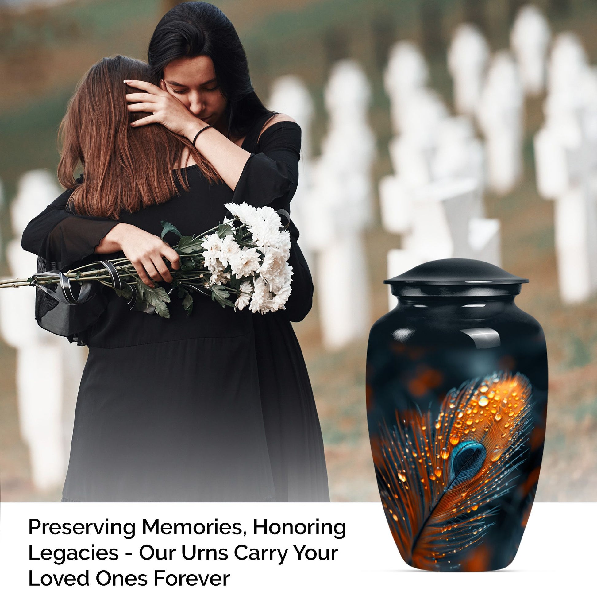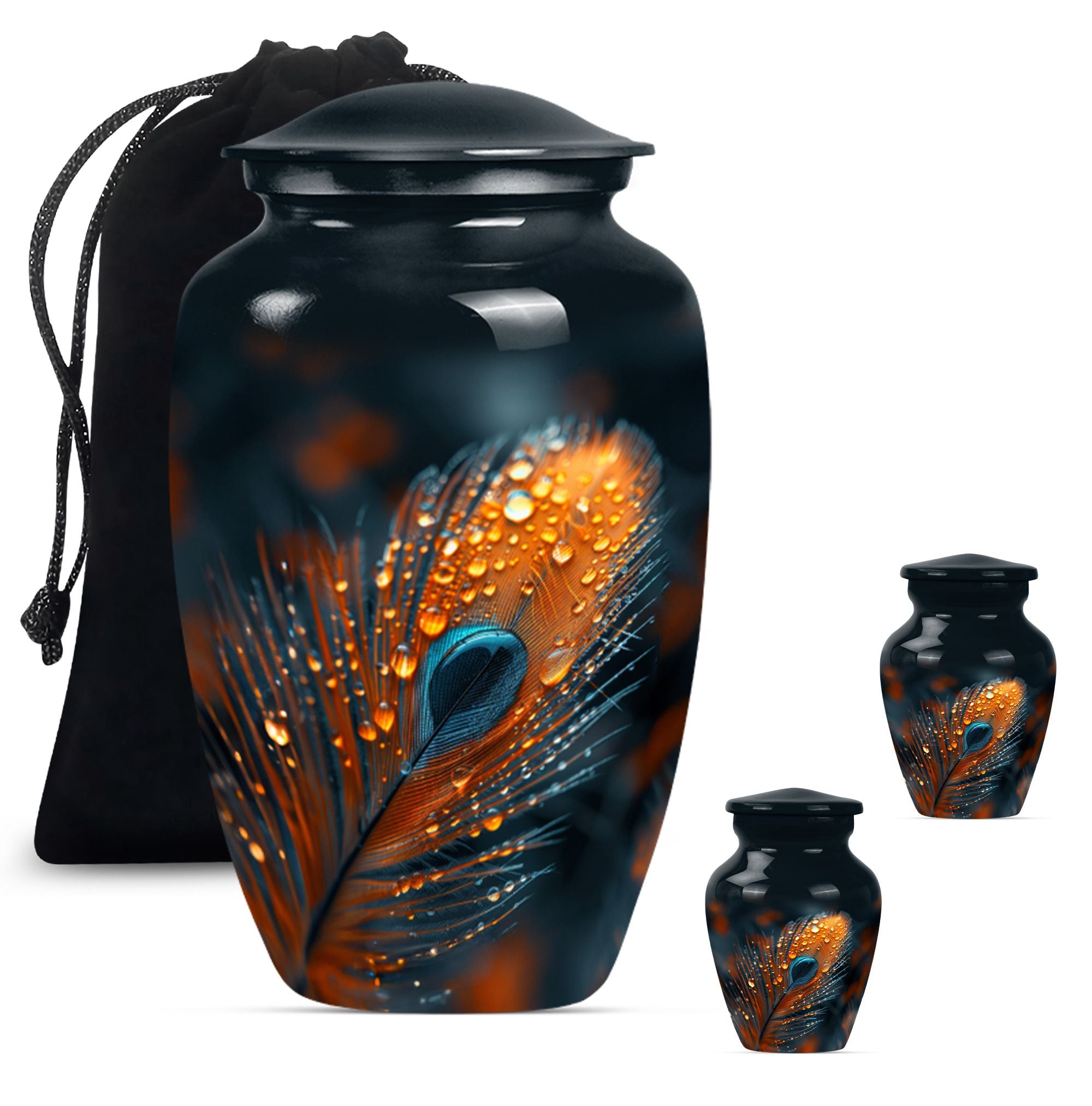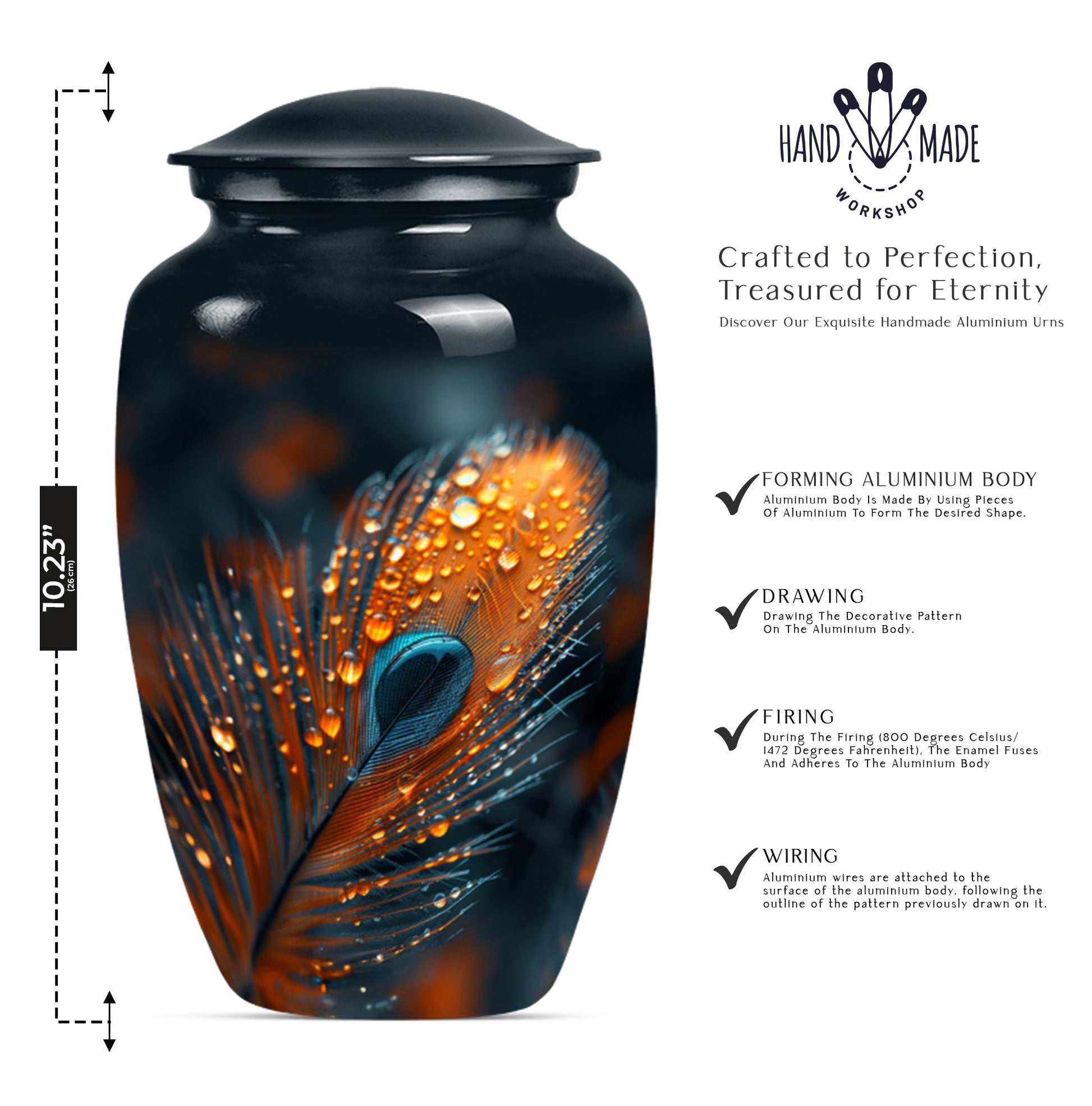 Exquisitely crafted to honor the memory of your loved ones, this purple meadow themed feather urn is a distinctive and respectful keepsake. Tailored specifically for adults and seniors intrigued in religious and memorial ceremony supplies, this unique piece has splendid practical and aesthetic qualities. Measuring 10 inches in height and weighing 3.3 pounds, this large urn accommodates up to 200 cubic inches of ashes, allowing a remembrance of dignity and respect. Crafted from durable aluminum, the longevity and resilience of this urn ensure its pristine condition for ages. The revered burial cremation urns come with a plush velvet pouch for containment of ashes, acknowledging your need for privacy. To add a heartfelt touch, you have the option to personalize it with engraved names. With unique terminology such as 'feather urn', 'memorial urns', 'cremation urns for men,' and 'urns for human ashes adult female,' it stands as an intricate commemoration of your loved one's journey.