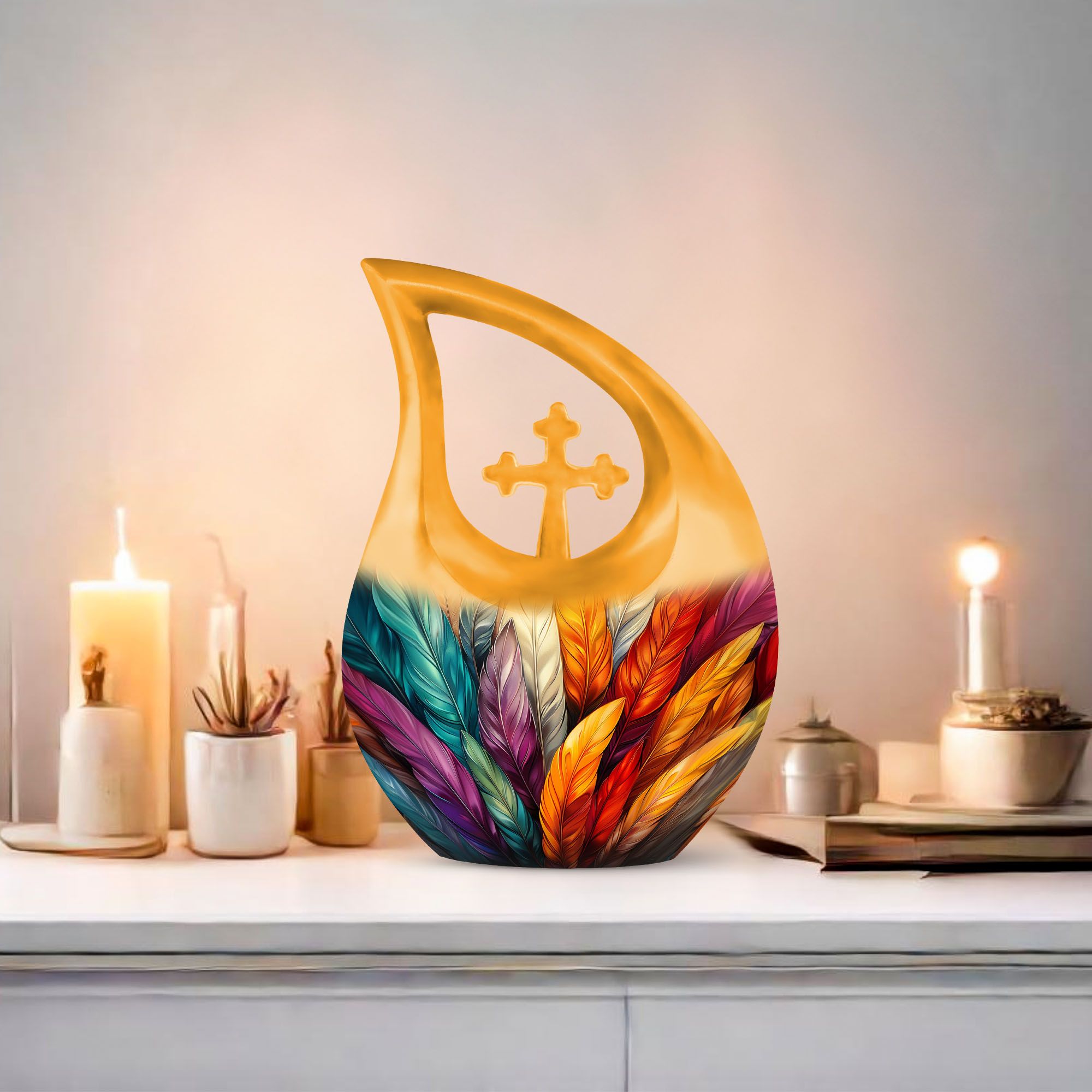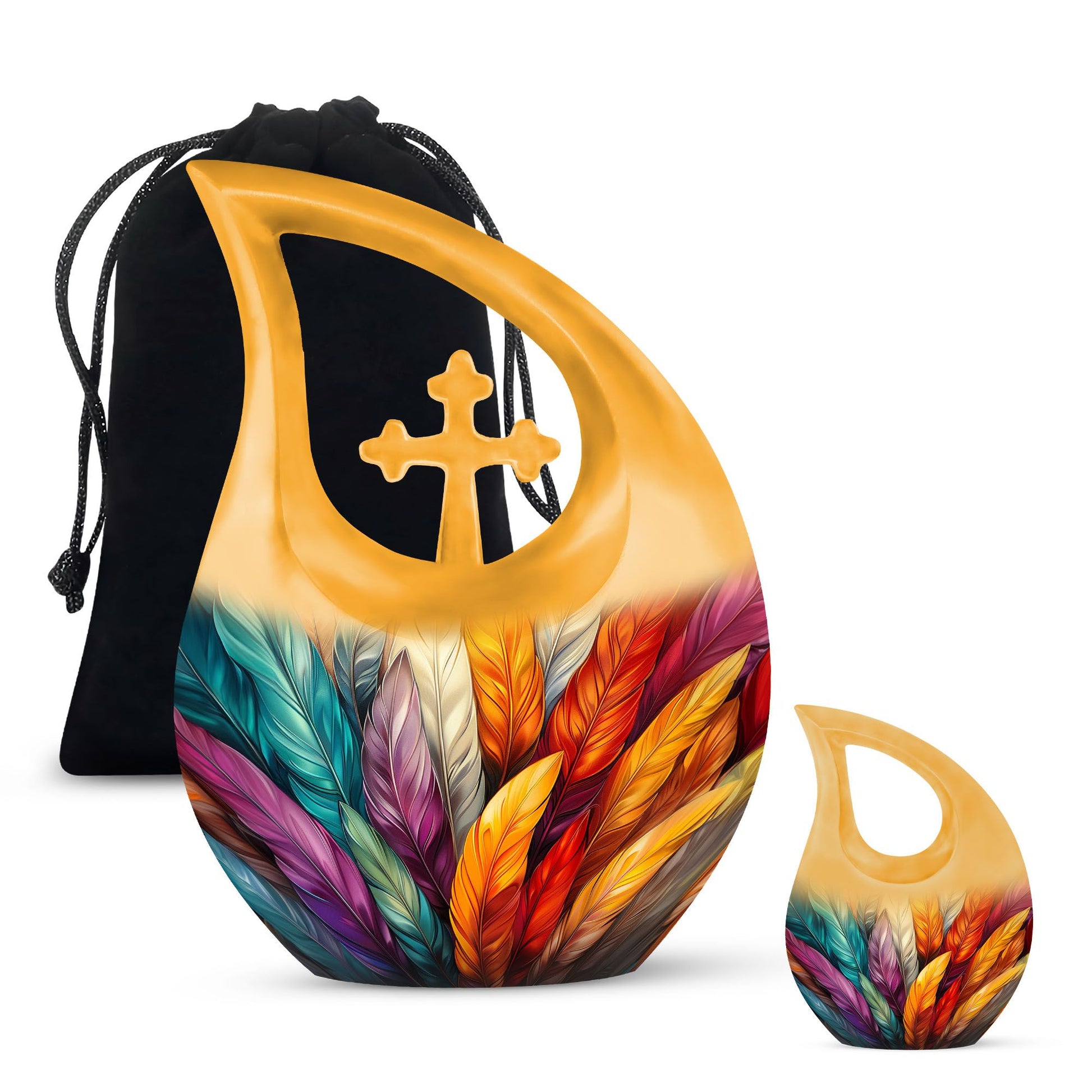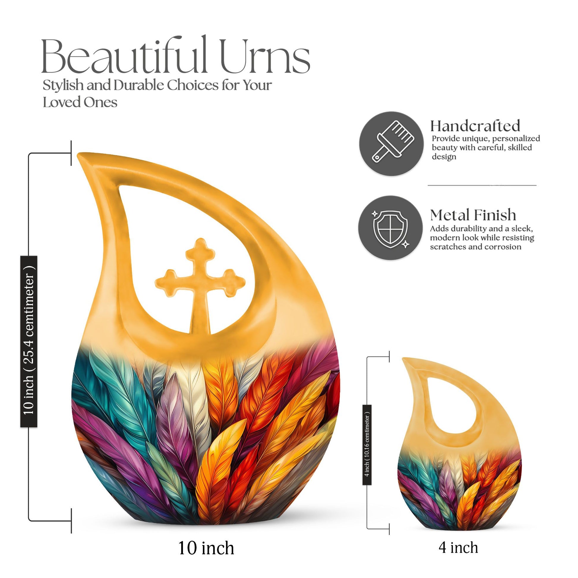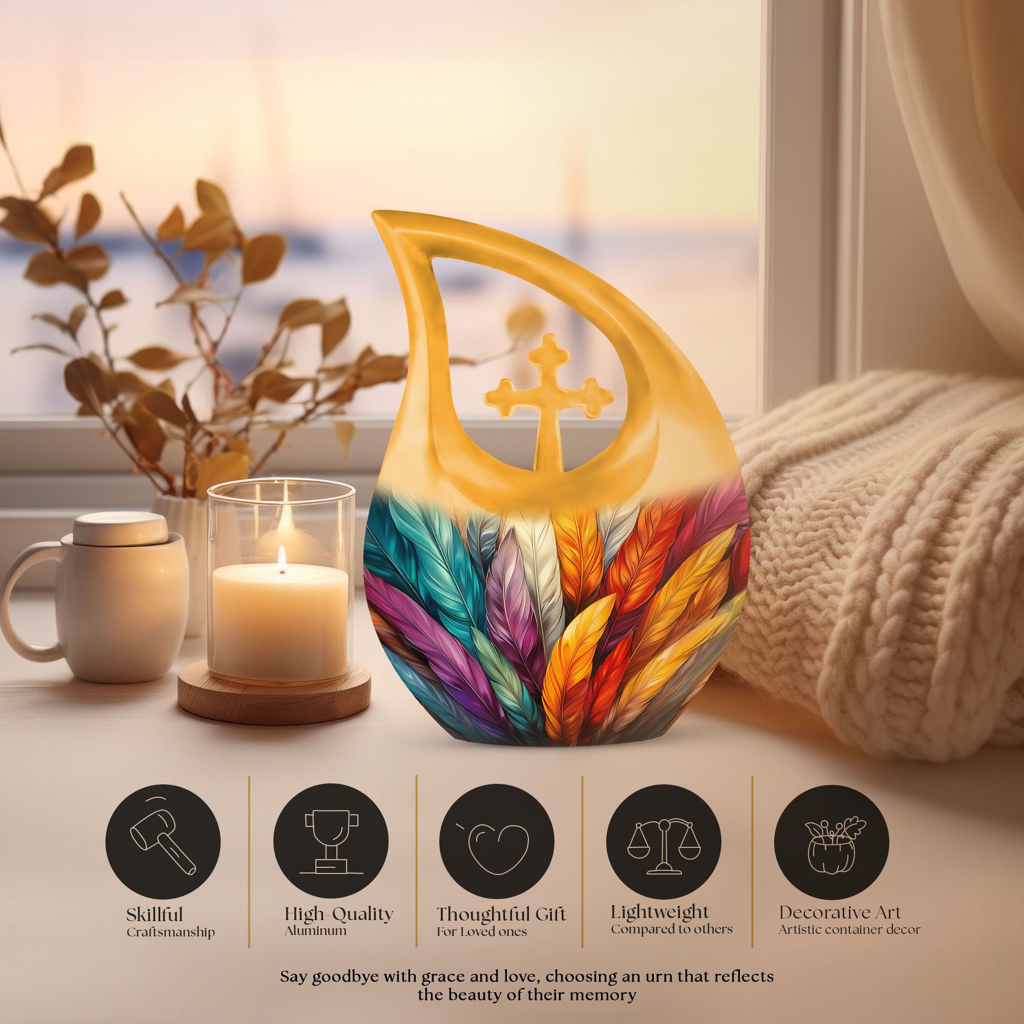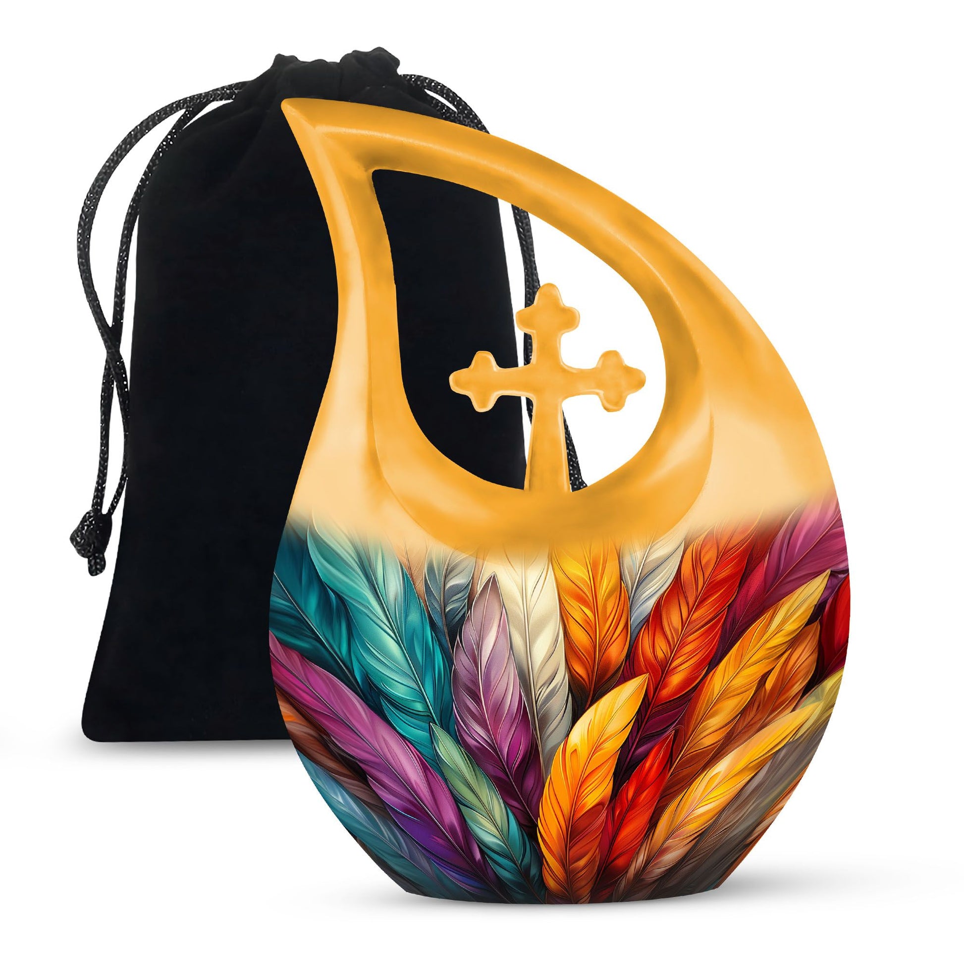 An exquisite and unique 'Feather Urn', this 10-inch, aluminium-crafted commemorative piece is perfect for respectfully preserving your departed loved one's ashes. Our Cross Drop Urn optimized for adults, has a capacity of 200 cubic inches to safely retain the ashes weighing approximately 3.3 pounds. Along with the urn, we provide a velvet pouch to securely contain the ashes. Infused with a Feather theme, our urn transcends the regular, giving you a unique and intimate way of remembering your loved ones. Ideal as a 'Personal Urn', every piece we create is customizable with engraved names, making each urn a special tribute to the memory of your beloved. Commonly referred to as a 'Cremation Monument', this Large Urn takes a significant place in the realm of Memorial Ceremony Supplies, particularly for those seeking 'Unique Urns for Dad' or 'Customized Urns For Ashes For Adults'. This product stands as an enduring symbol of immortality, connecting us with the divine.