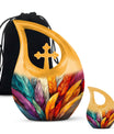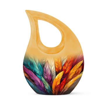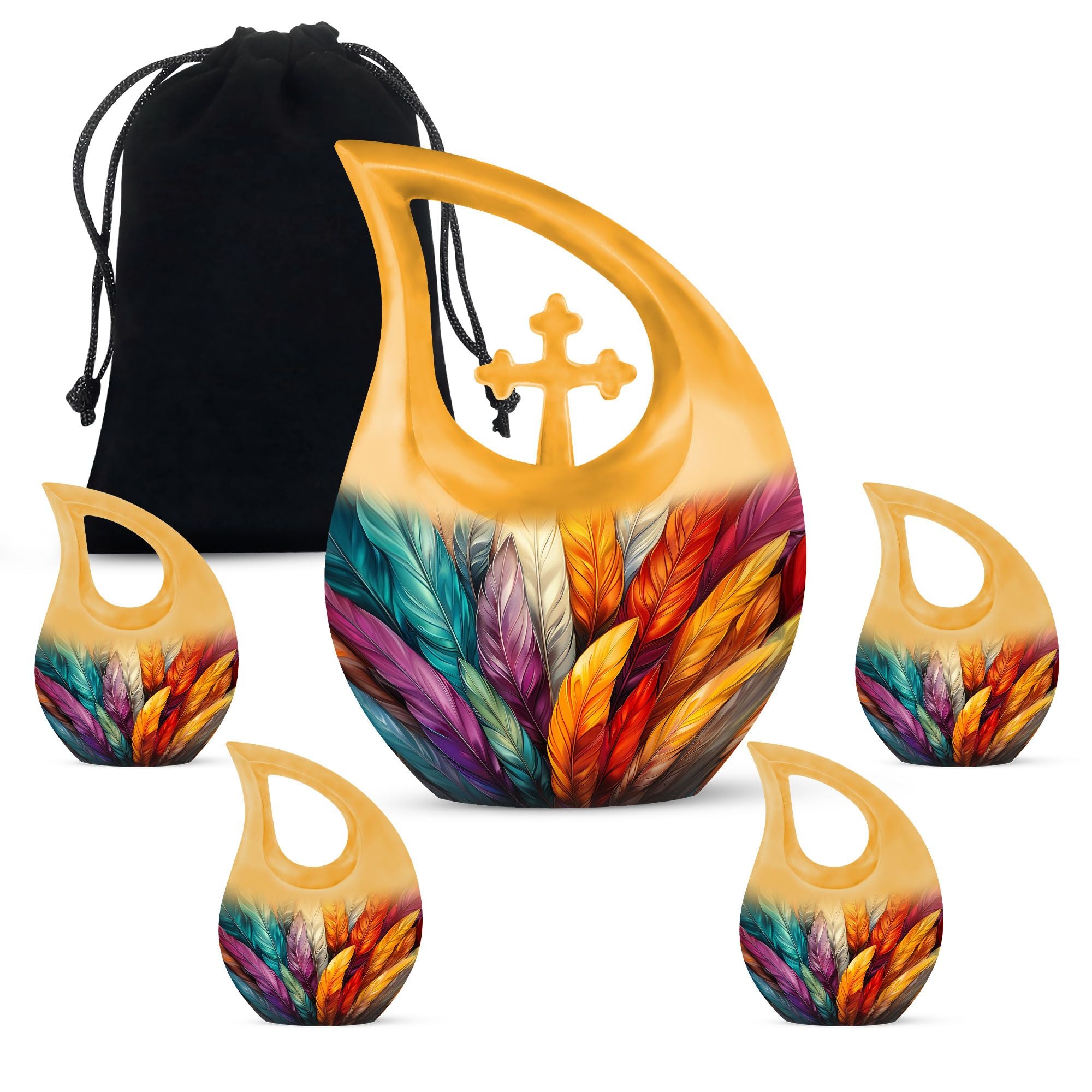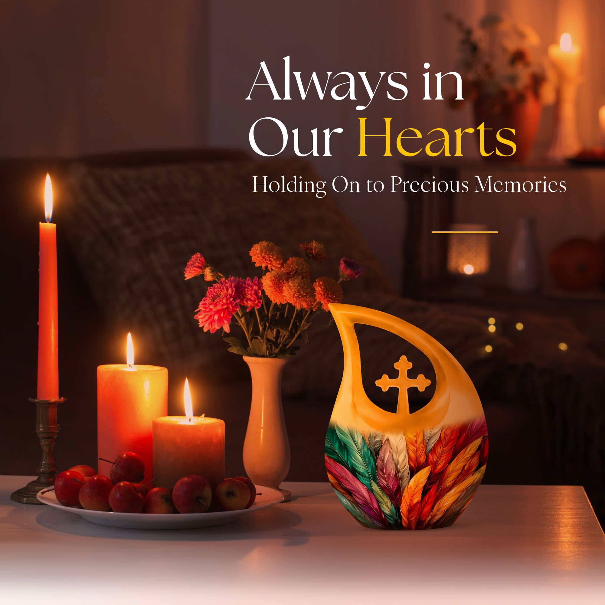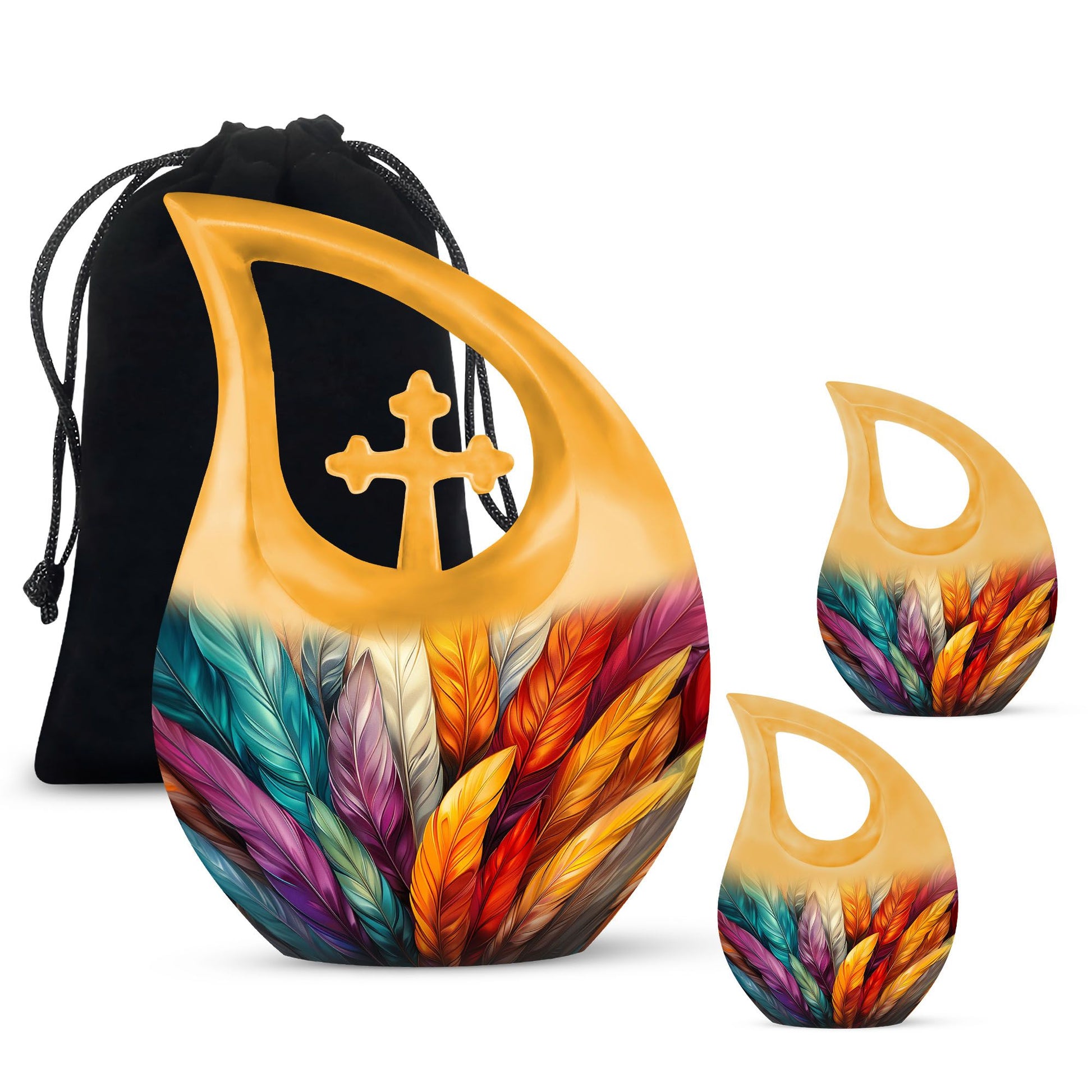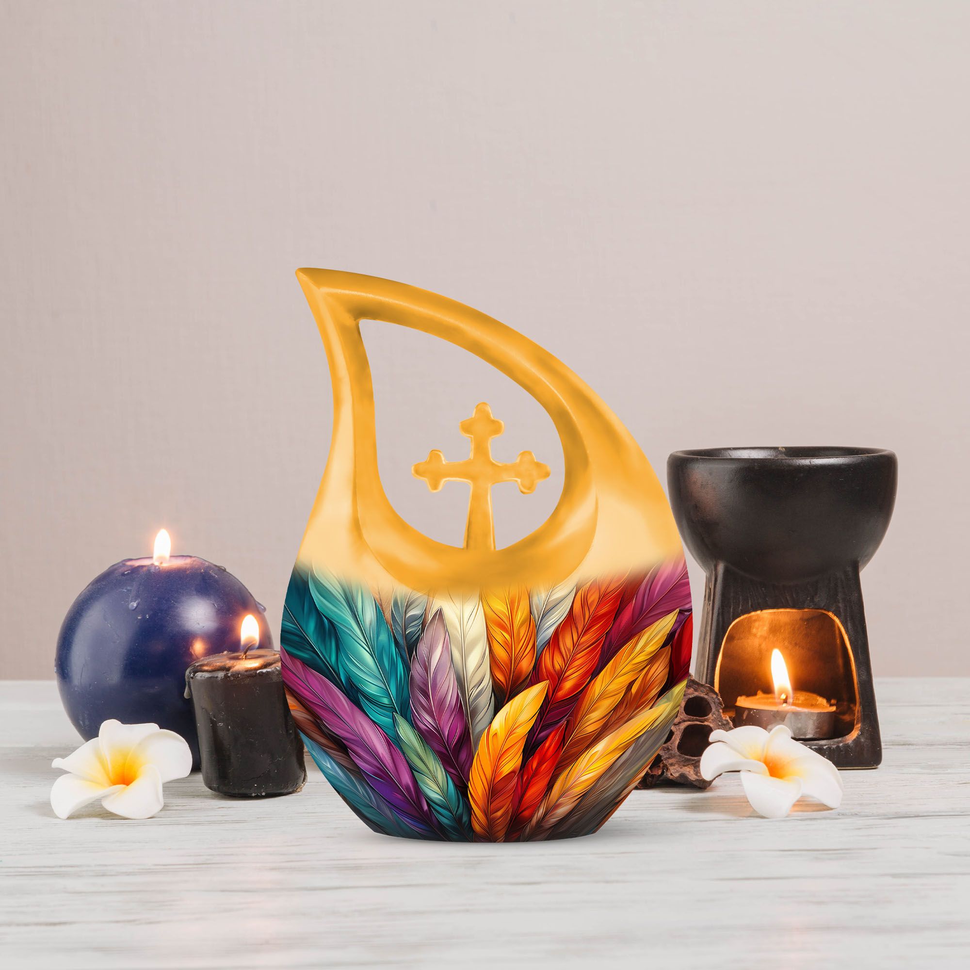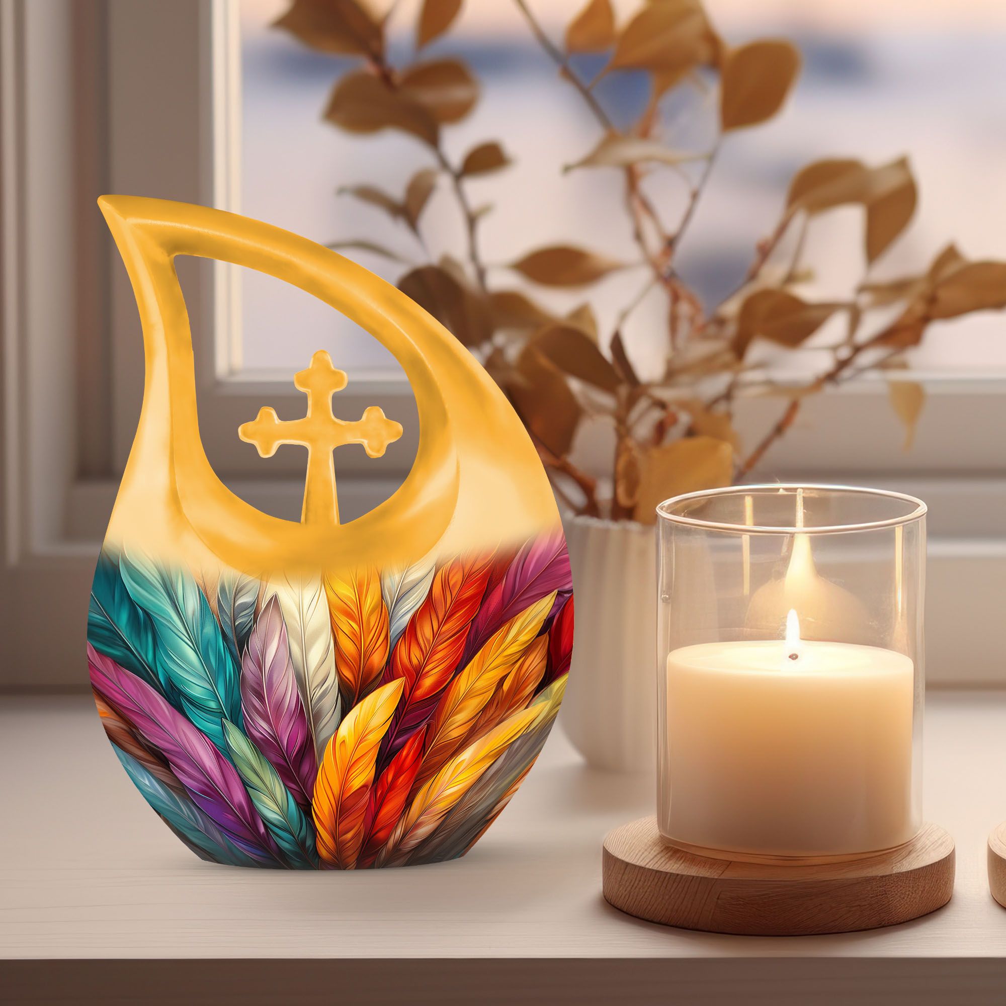 An exquisite and unique 'Feather Urn', this 10-inch, aluminium-crafted commemorative piece is perfect for respectfully preserving your departed loved one's ashes. Our Cross Drop Urn optimized for adults, has a capacity of 200 cubic inches to safely retain the ashes weighing approximately 3.3 pounds. Along with the urn, we provide a velvet pouch to securely contain the ashes. Infused with a Feather theme, our urn transcends the regular, giving you a unique and intimate way of remembering your loved ones. Ideal as a 'Personal Urn', every piece we create is customizable with engraved names, making each urn a special tribute to the memory of your beloved. Commonly referred to as a 'Cremation Monument', this Large Urn takes a significant place in the realm of Memorial Ceremony Supplies, particularly for those seeking 'Unique Urns for Dad' or 'Customized Urns For Ashes For Adults'. This product stands as an enduring symbol of immortality, connecting us with the divine.