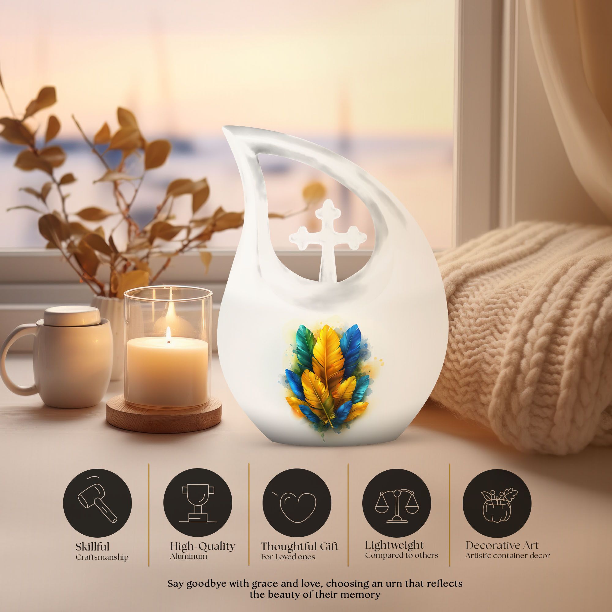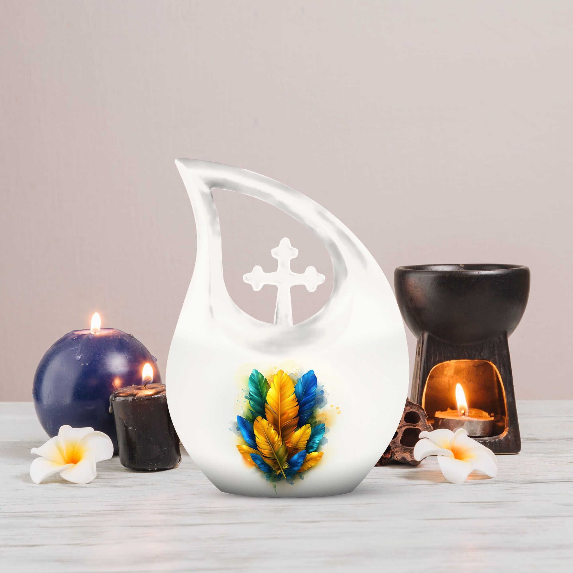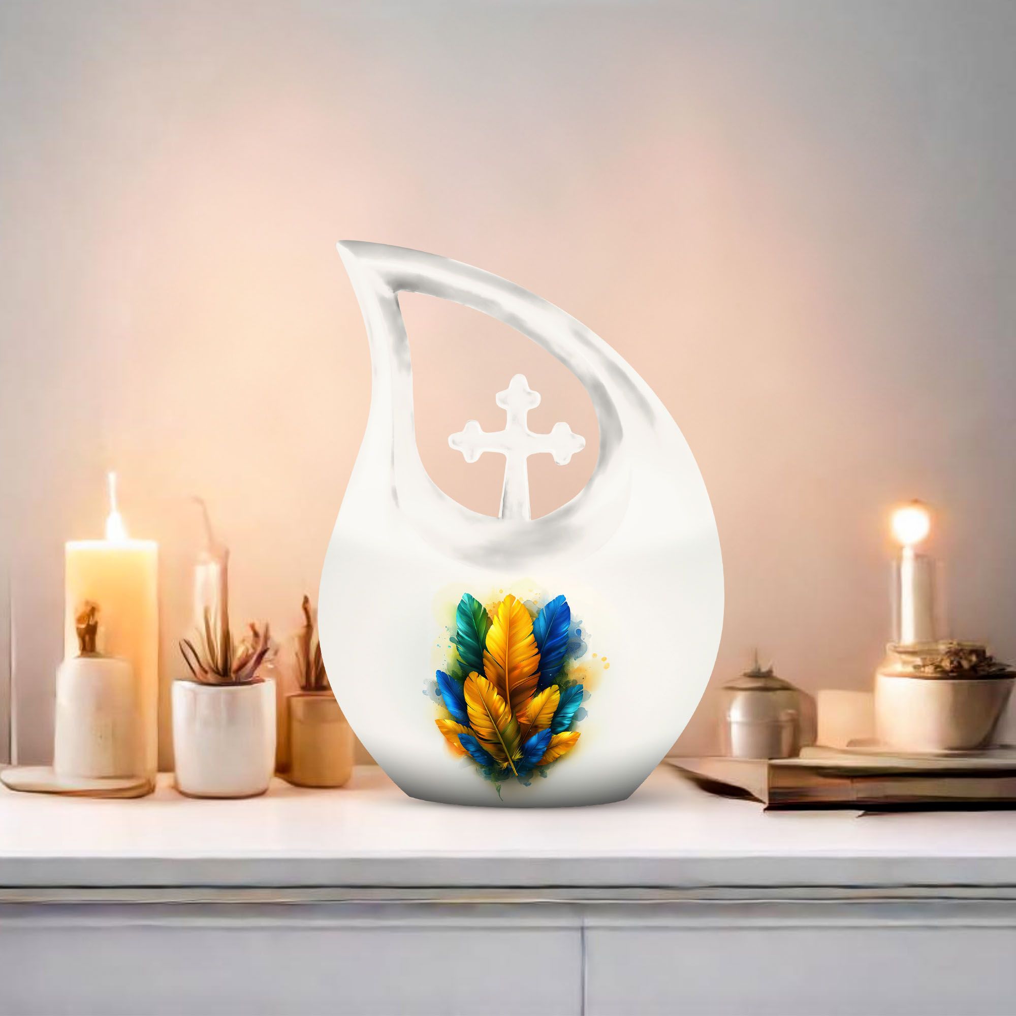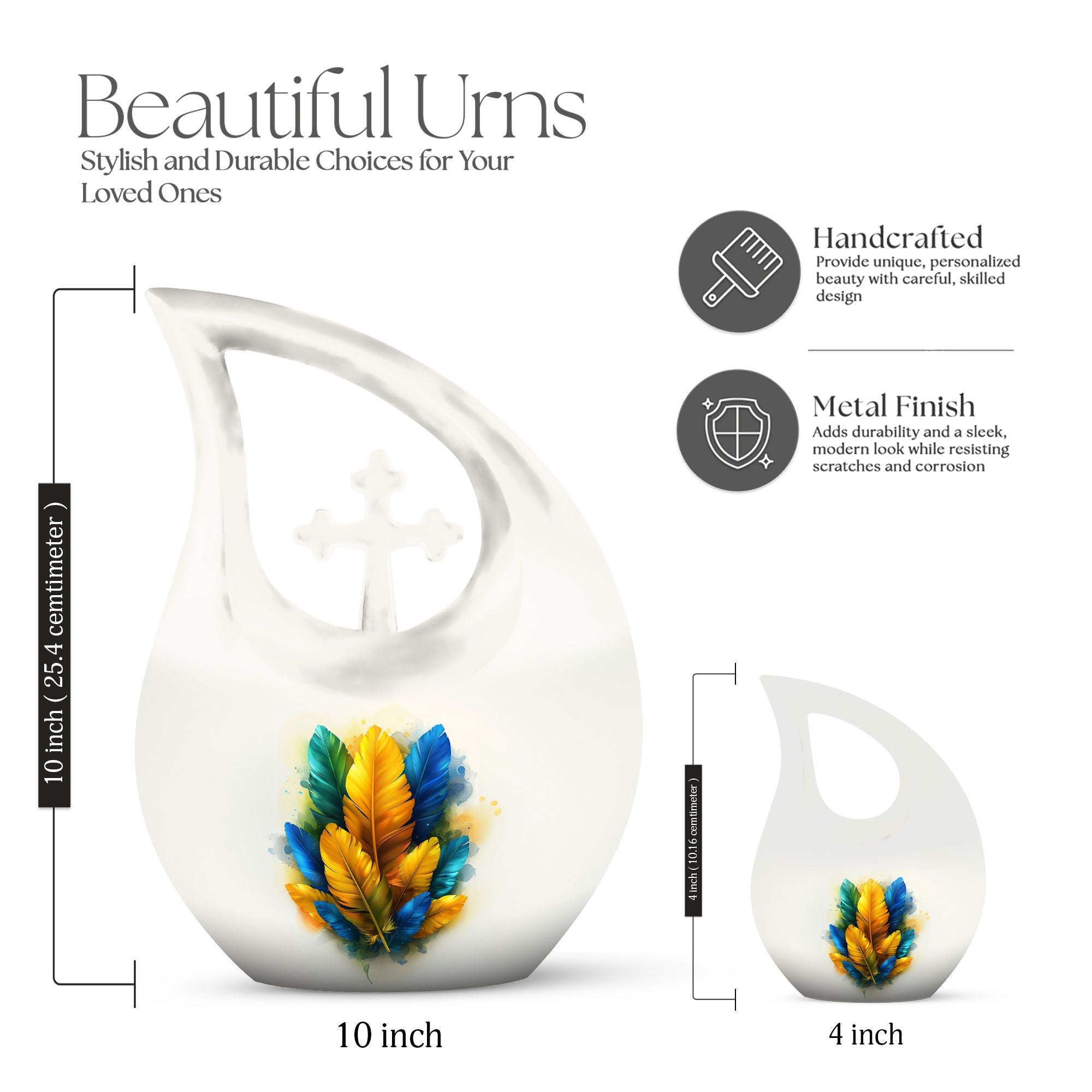 Immerse yourself in the gentle elegance of our irresistible Feather Urn. Expertly wrought from sturdy Aluminium, this 10-inch tall Large Urn offers an exceptional way to honour and remember a much-loved individual. The Feather themed, Cross Drop designed urn has a generous capacity of 200 cubic inches, meticulously crafted to contain the ashes of adults and seniors. Weighing in at 3.3 pounds, its enduring structure is meant to withstand the test of time. Thoughtfully included in the package is a delicately plush velvet pouch, providing an additional layer of protection to the cremains. As a unique touch, the urn can also be personalized with engraved names, letting you add an intimate reminder of the person who lightened up your life. These distinctively appealing cremation containers are not just simple burial urns, they are a charming epitome of fond memories and love. With prominence on keywords such as 'Feather Urn', 'Cremation Containers', 'Best Urns For Ashes', 'Personalized Urns For Ashes', and 'Burial Urns', this product stands as the perfect choice for memorial urns crafted with a matchless blend of beauty, efficiency, and sentiment.