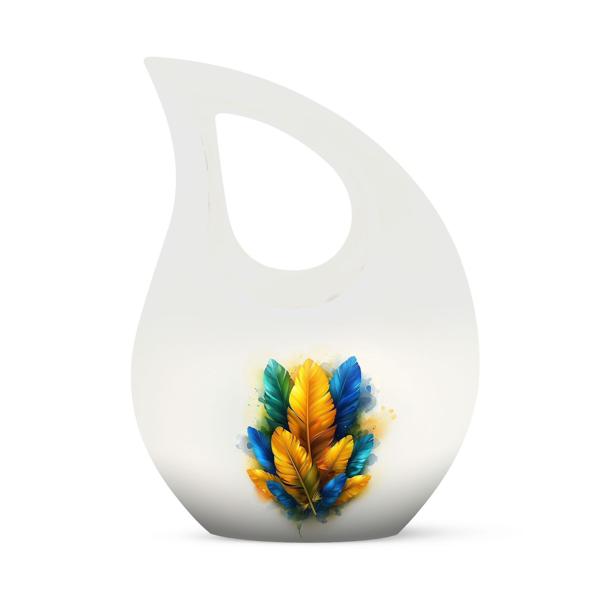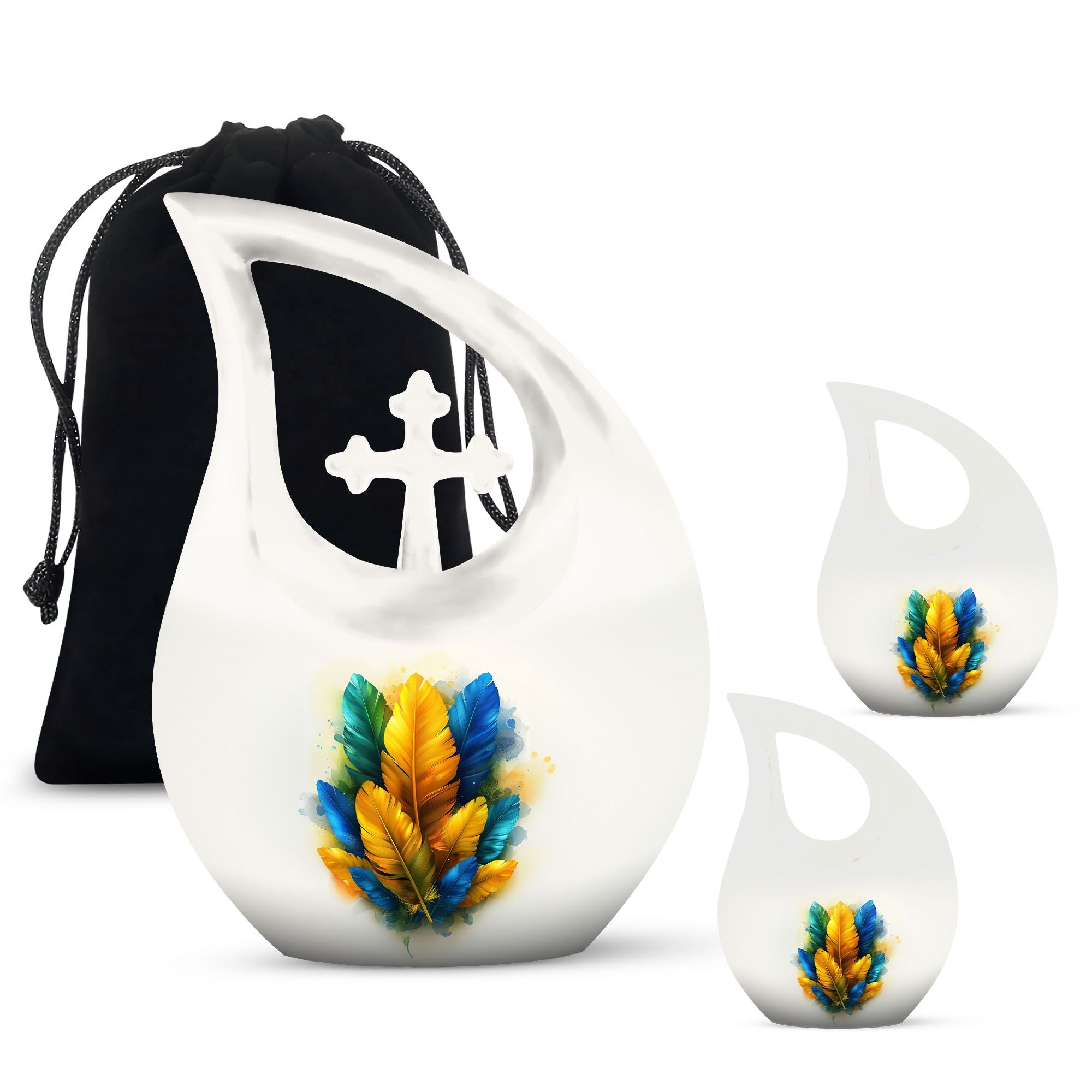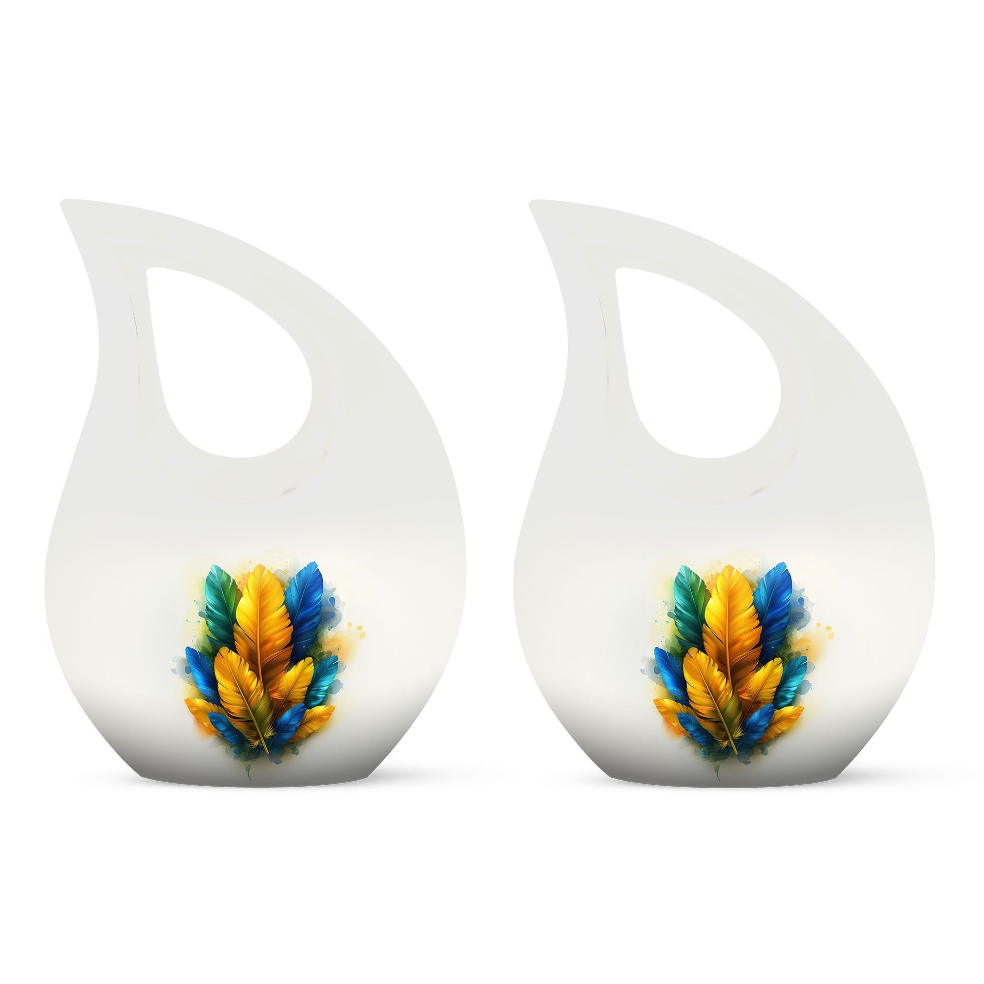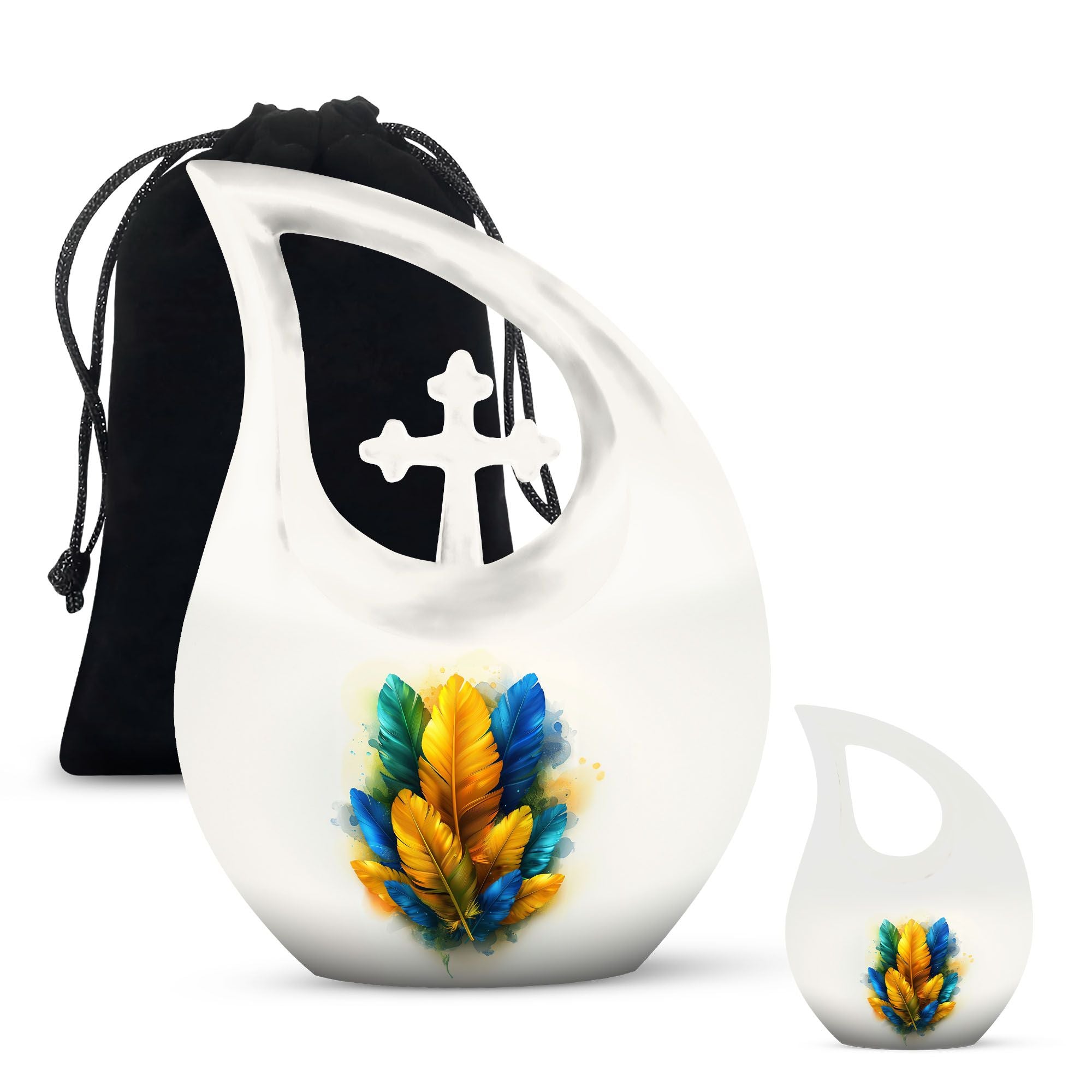 Immerse yourself in the gentle elegance of our irresistible Feather Urn. Expertly wrought from sturdy Aluminium, this 10-inch tall Large Urn offers an exceptional way to honour and remember a much-loved individual. The Feather themed, Cross Drop designed urn has a generous capacity of 200 cubic inches, meticulously crafted to contain the ashes of adults and seniors. Weighing in at 3.3 pounds, its enduring structure is meant to withstand the test of time. Thoughtfully included in the package is a delicately plush velvet pouch, providing an additional layer of protection to the cremains. As a unique touch, the urn can also be personalized with engraved names, letting you add an intimate reminder of the person who lightened up your life. These distinctively appealing cremation containers are not just simple burial urns, they are a charming epitome of fond memories and love. With prominence on keywords such as 'Feather Urn', 'Cremation Containers', 'Best Urns For Ashes', 'Personalized Urns For Ashes', and 'Burial Urns', this product stands as the perfect choice for memorial urns crafted with a matchless blend of beauty, efficiency, and sentiment.