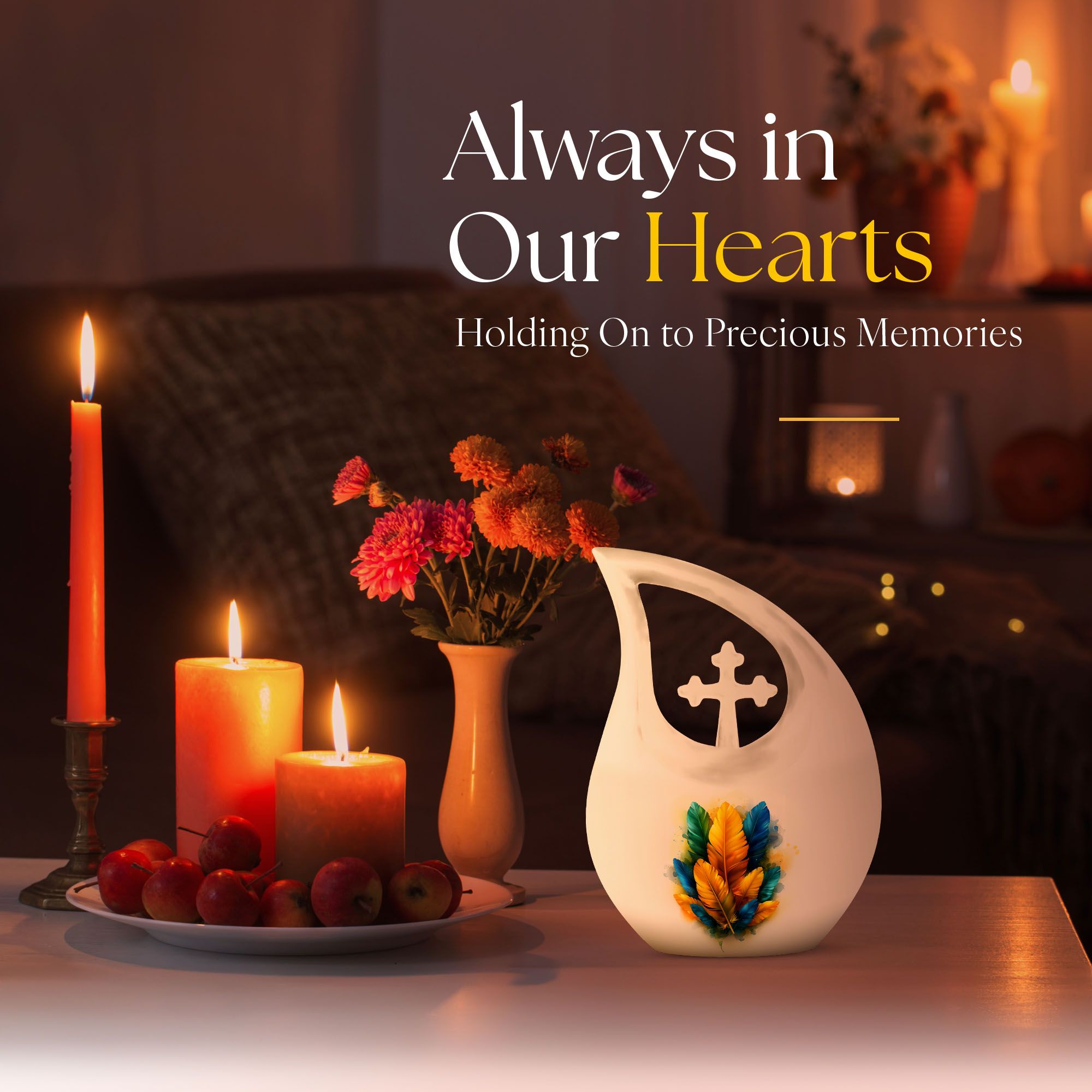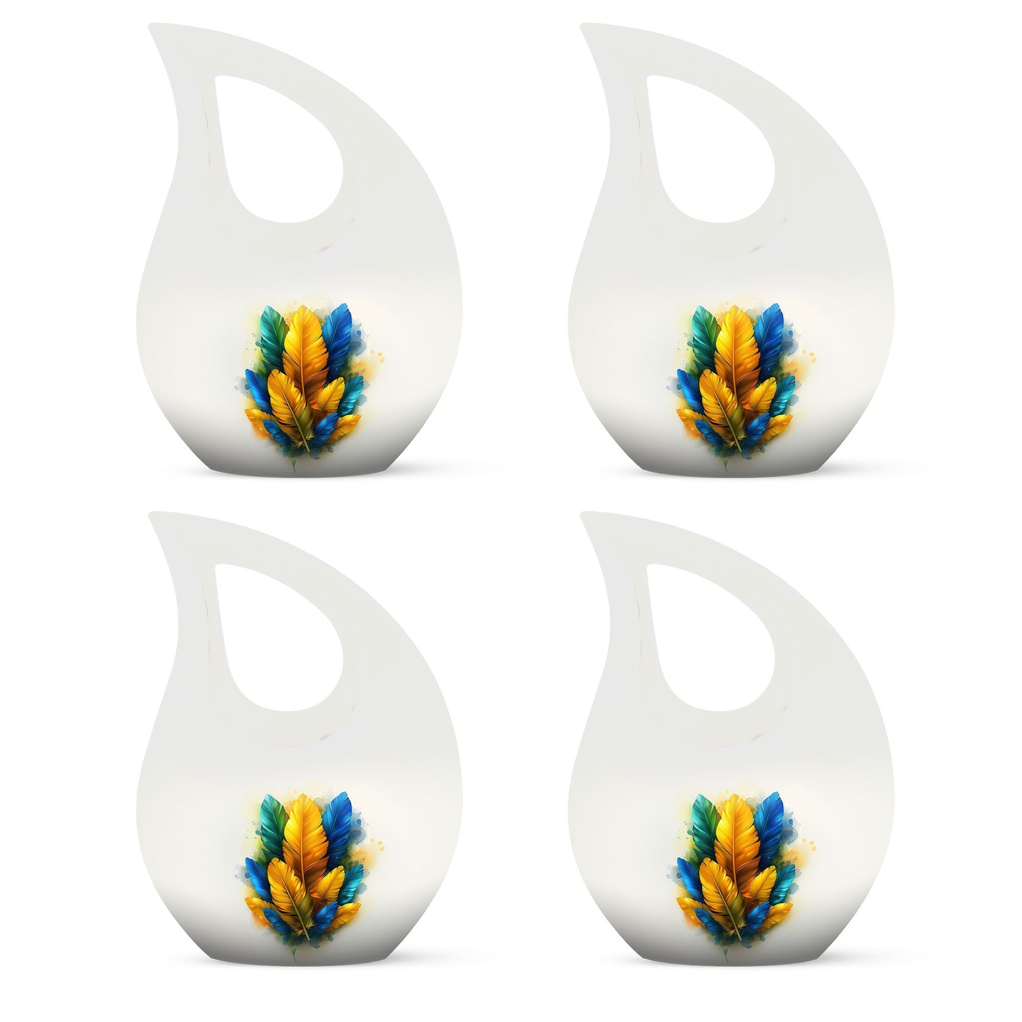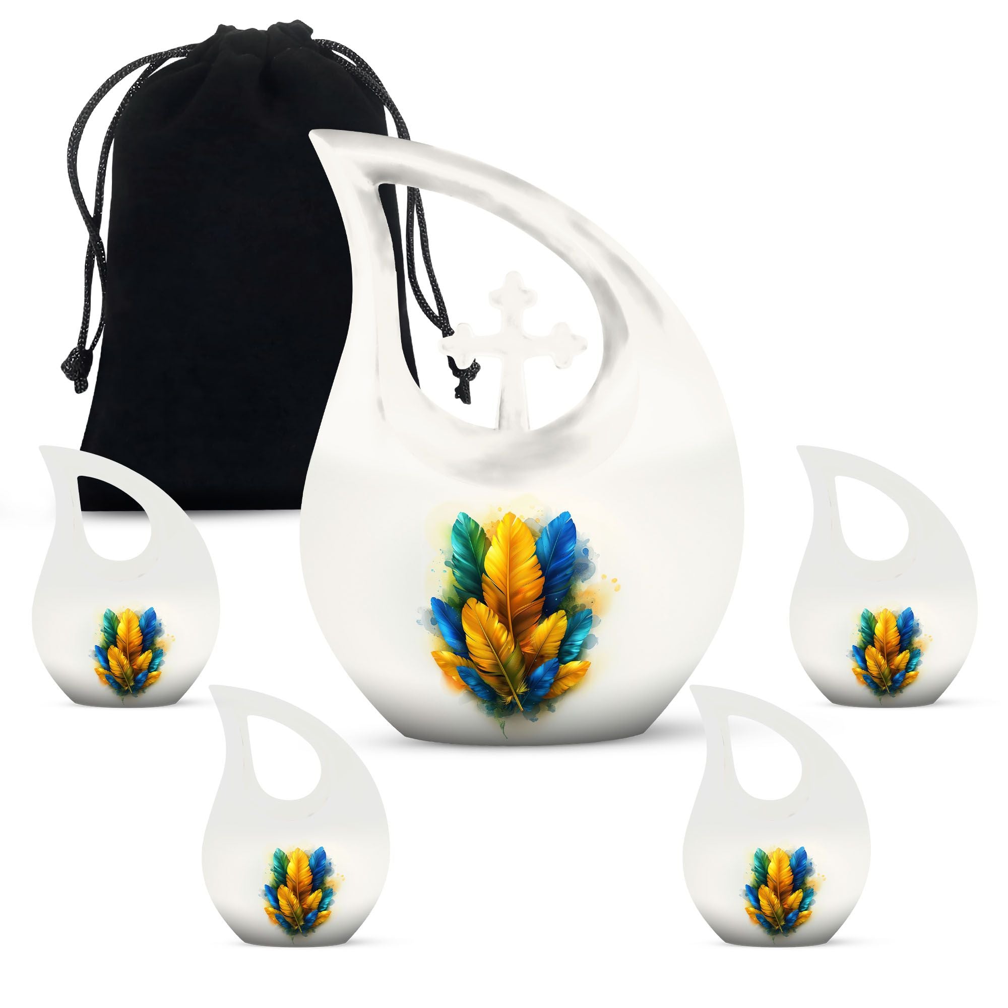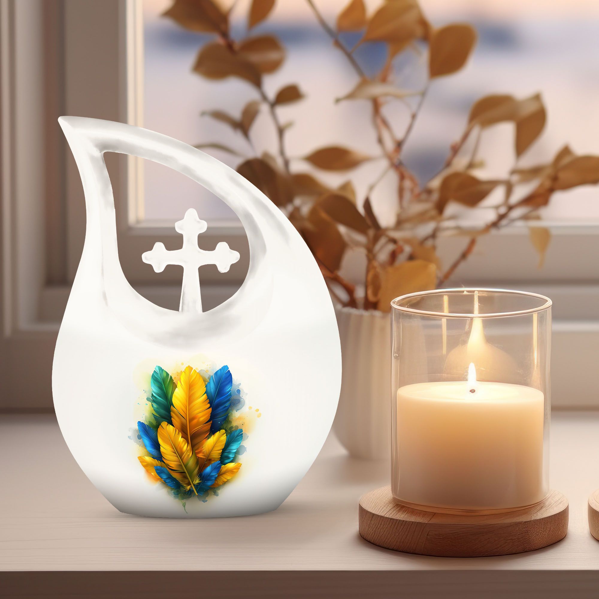 Immerse yourself in the gentle elegance of our irresistible Feather Urn. Expertly wrought from sturdy Aluminium, this 10-inch tall Large Urn offers an exceptional way to honour and remember a much-loved individual. The Feather themed, Cross Drop designed urn has a generous capacity of 200 cubic inches, meticulously crafted to contain the ashes of adults and seniors. Weighing in at 3.3 pounds, its enduring structure is meant to withstand the test of time. Thoughtfully included in the package is a delicately plush velvet pouch, providing an additional layer of protection to the cremains. As a unique touch, the urn can also be personalized with engraved names, letting you add an intimate reminder of the person who lightened up your life. These distinctively appealing cremation containers are not just simple burial urns, they are a charming epitome of fond memories and love. With prominence on keywords such as 'Feather Urn', 'Cremation Containers', 'Best Urns For Ashes', 'Personalized Urns For Ashes', and 'Burial Urns', this product stands as the perfect choice for memorial urns crafted with a matchless blend of beauty, efficiency, and sentiment.