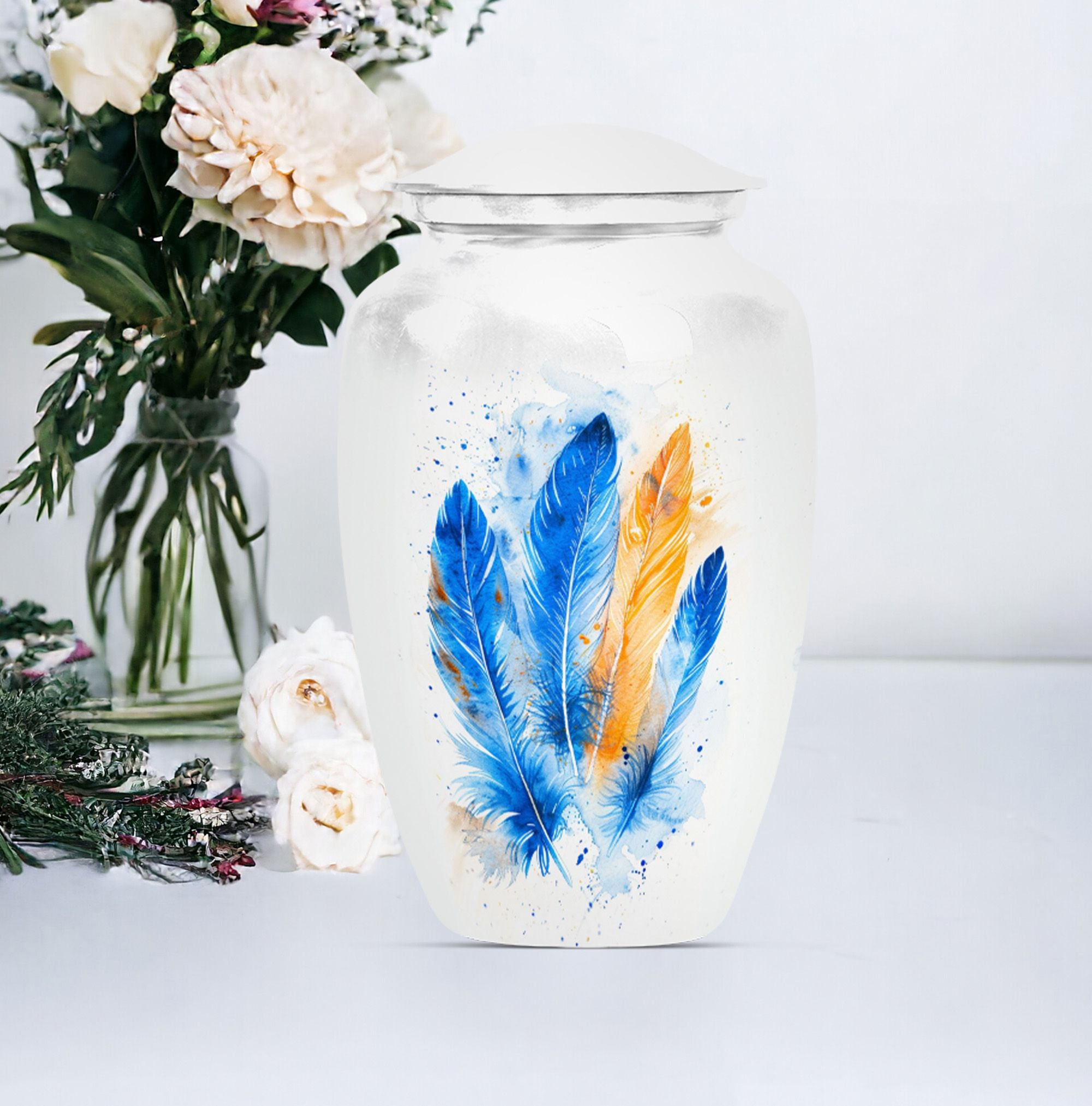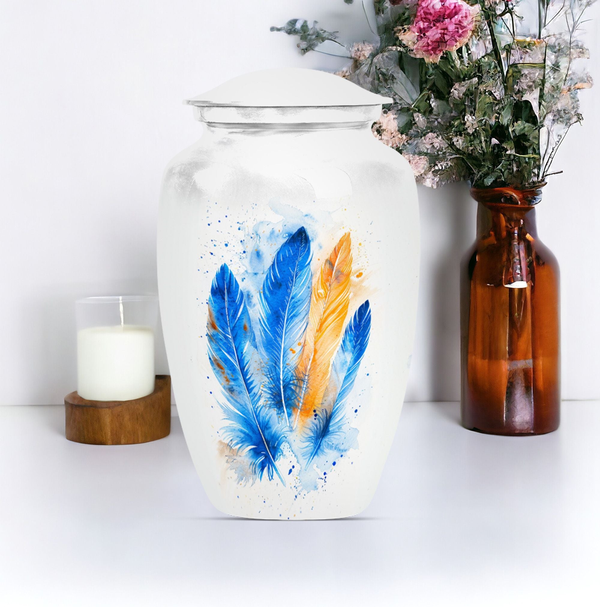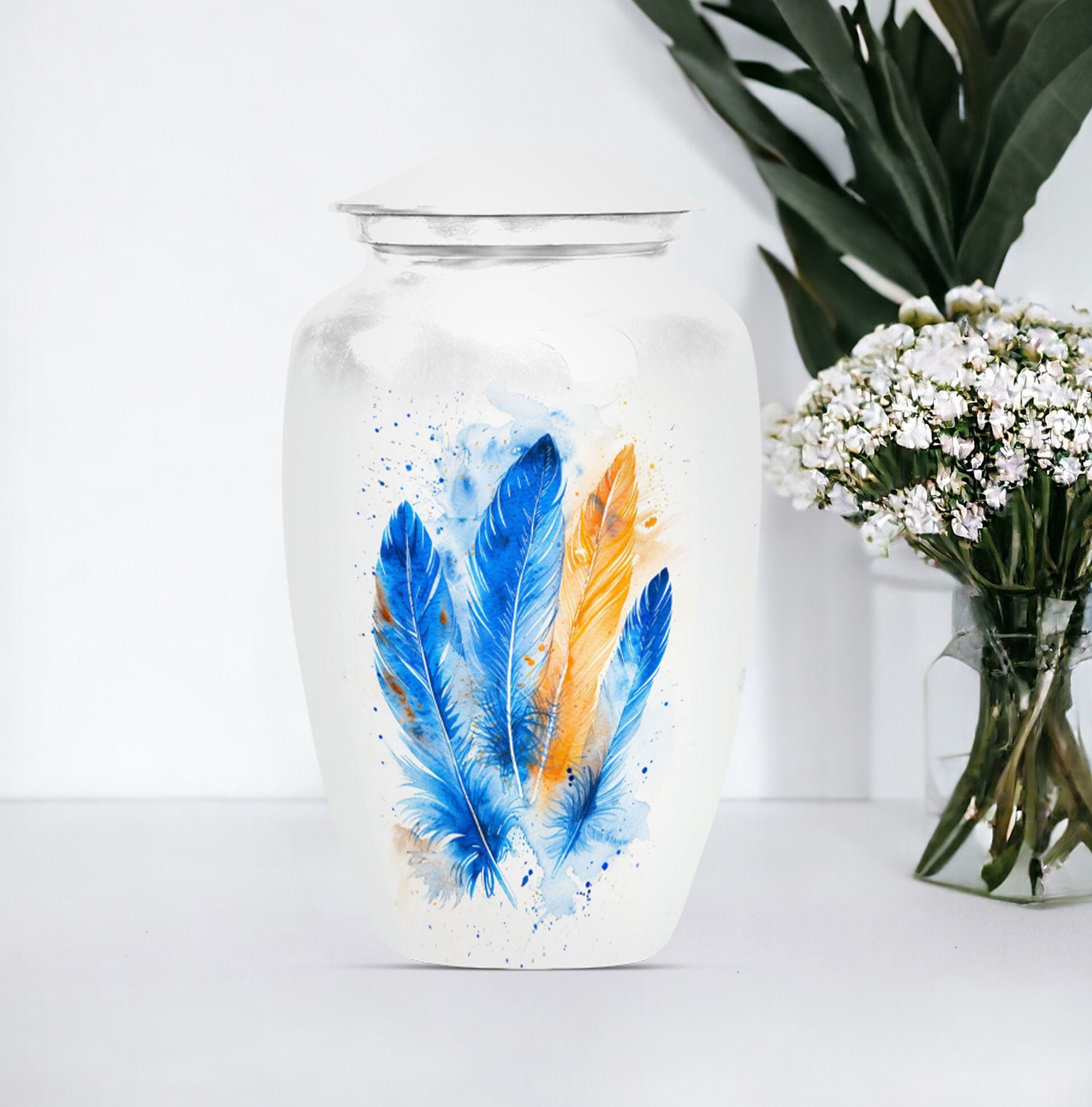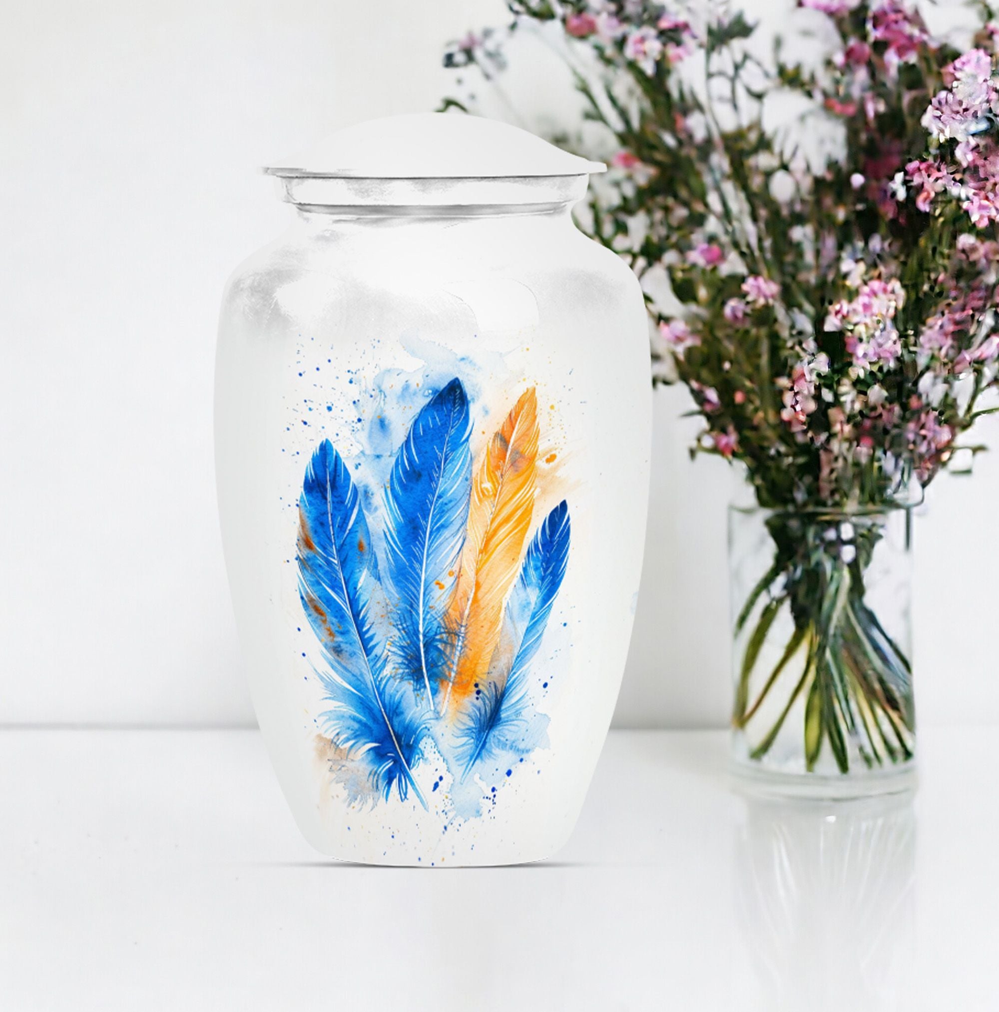 Immerse yourself in the memory of your beloved with this stunning Large 'Purple Meadow' Feather Urn. Made of high-quality aluminium, this cremation urn for adult ashes women radiates a comforting presence. Its weight of 3.3 pounds, paired with its dimensions (10 inches in height), signifies substantial holding power - a capacity of 200 cubic inches to be exact. The size of this classic cremation urn, coupled with its somber theme, can effortlessly cater to any part of your home. The package also includes a velvet pouch for the safe containment of cherished ashes. You can further personalize this urn with engraved names, bestowing upon it a unique emotional value that is unparalleled. With 'cremation memorial urns for human ashes', 'human urn adult ash woman', 'cremation box', and 'adult-size cremation urns' as secondary keywords, customers can easily find this burial funeral urn during their online search. Celebrate the life of your loved one with our heartwarming and timeless feather urn.