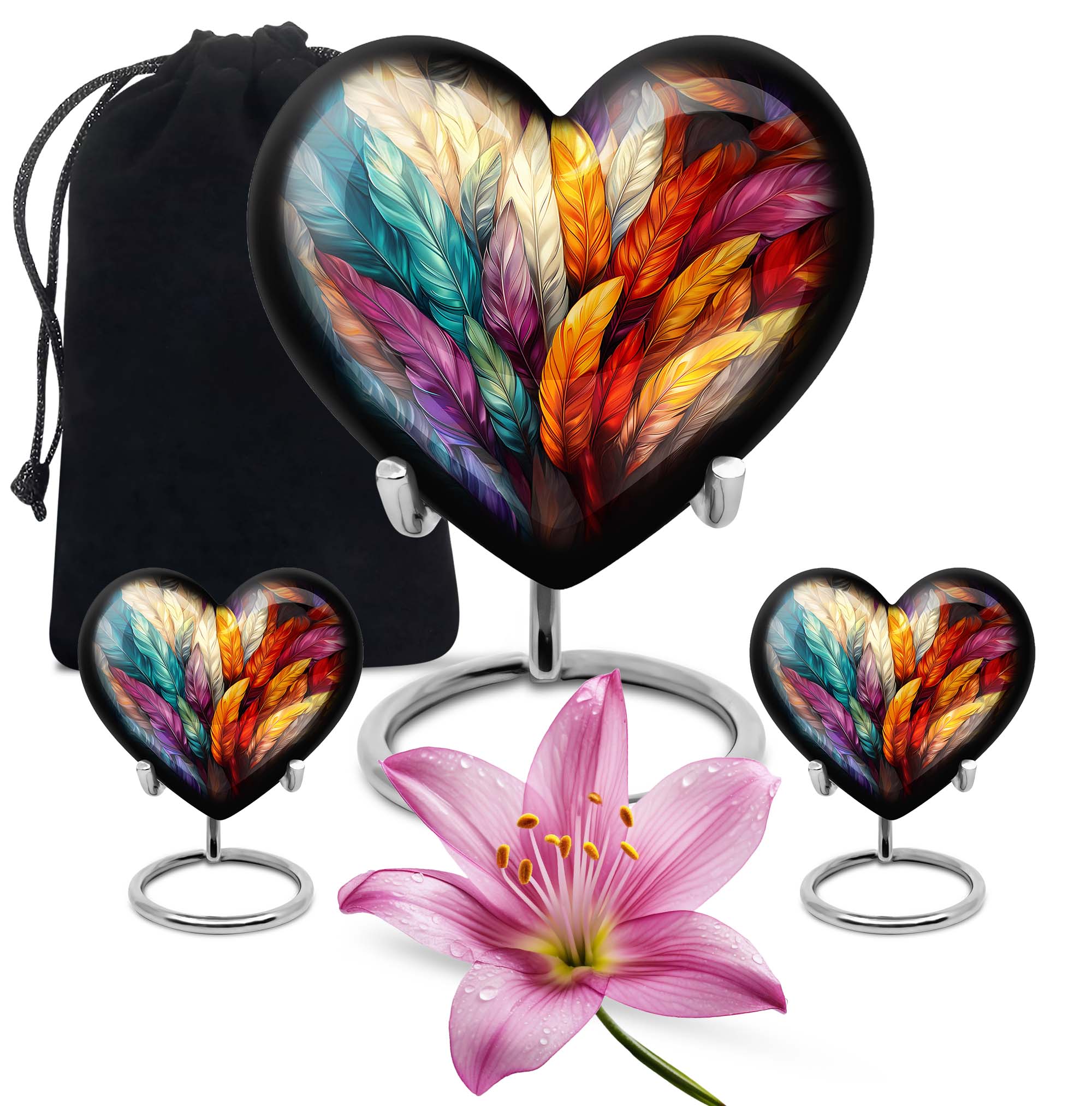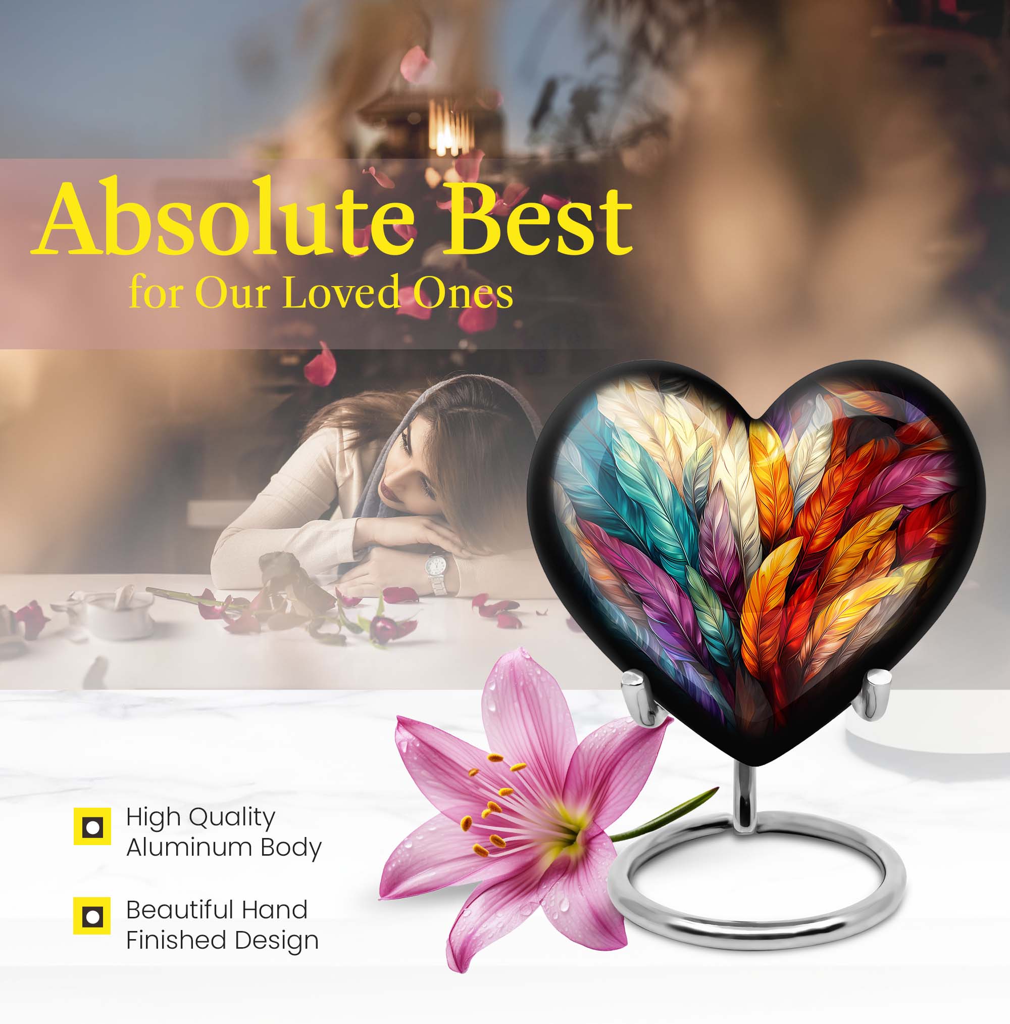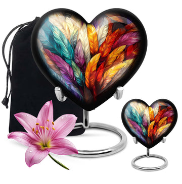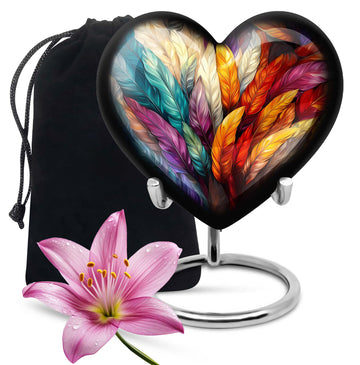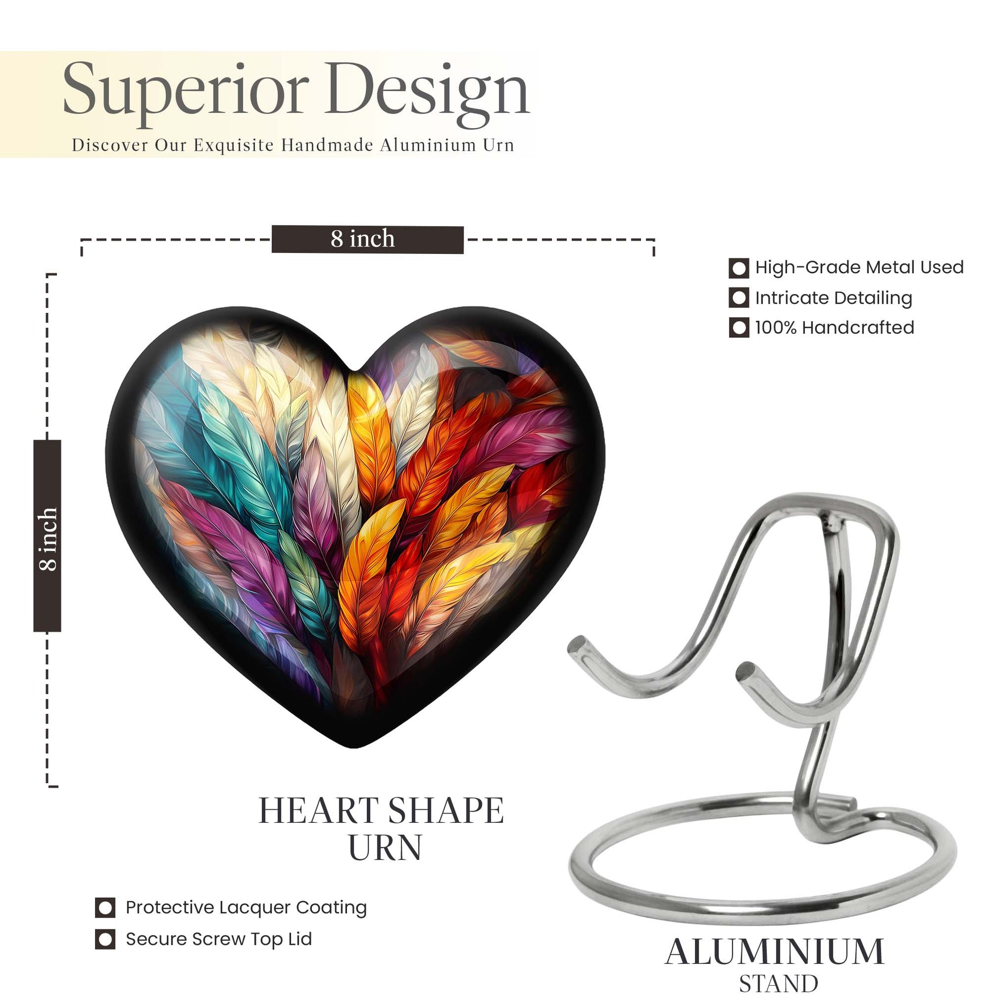 Honor your loved ones and hold their memory close with our striking 'Purple Meadow' funeral unique urns specifically assembled for human ashes. Fashioned from sturdy aluminium, this 10-Inch large urn showcases a stunning heart theme, a testament to infinite love and an ever-lasting bond. With a substantial capacity of 200 cubic inches and a weight of 3.3 pounds, it adeptly encapsulates the physical presence of your beloved one. This feather urn isn't just a resting place for your loved one, but a beautiful piece of art that stands as a tribute to a well-lived life. It comes with a velvet pouch for containment of ashes, signifying the sacredness of the memorabilia it contains. Additionally, the urn offers customization--engrave it with names to create a personal touch. By purchasing our outstanding memorial urns, you're not just buying a product, but a treasured keepsake, that is as unique as the life it represents. Keywords: feather Urn, funeral unique urns for human ashes, memorial medium urns for ashes, cremation urn burial, funeral, and funeral cremation urn.