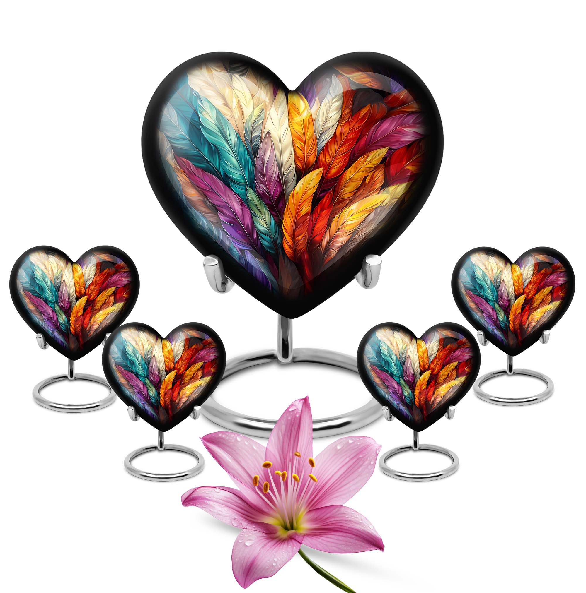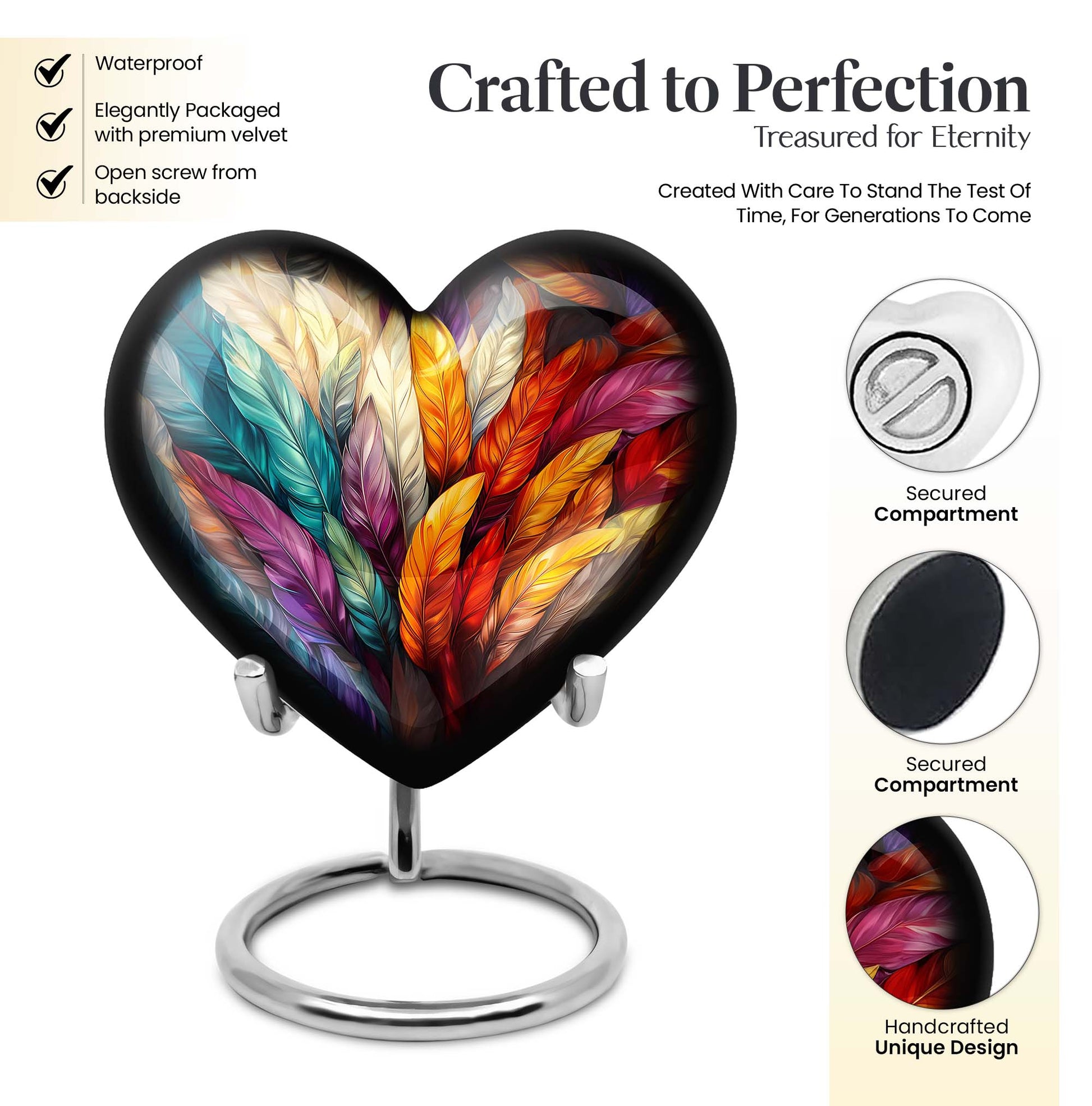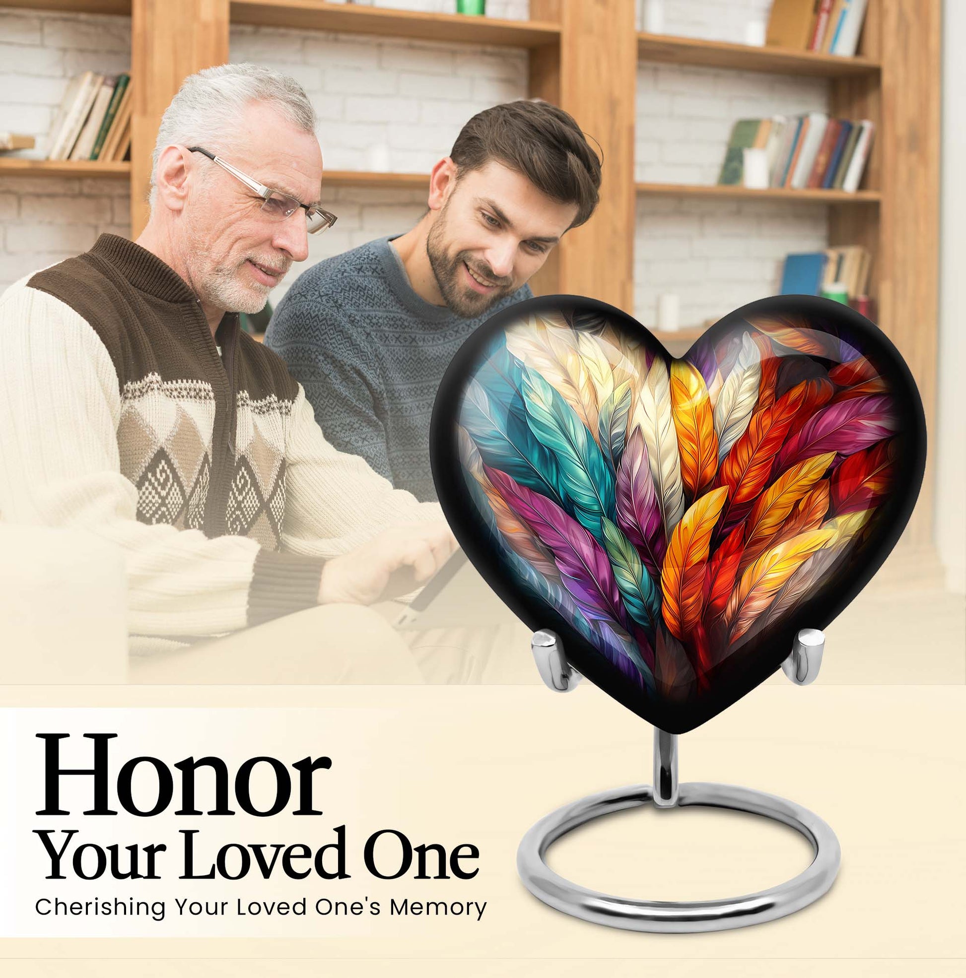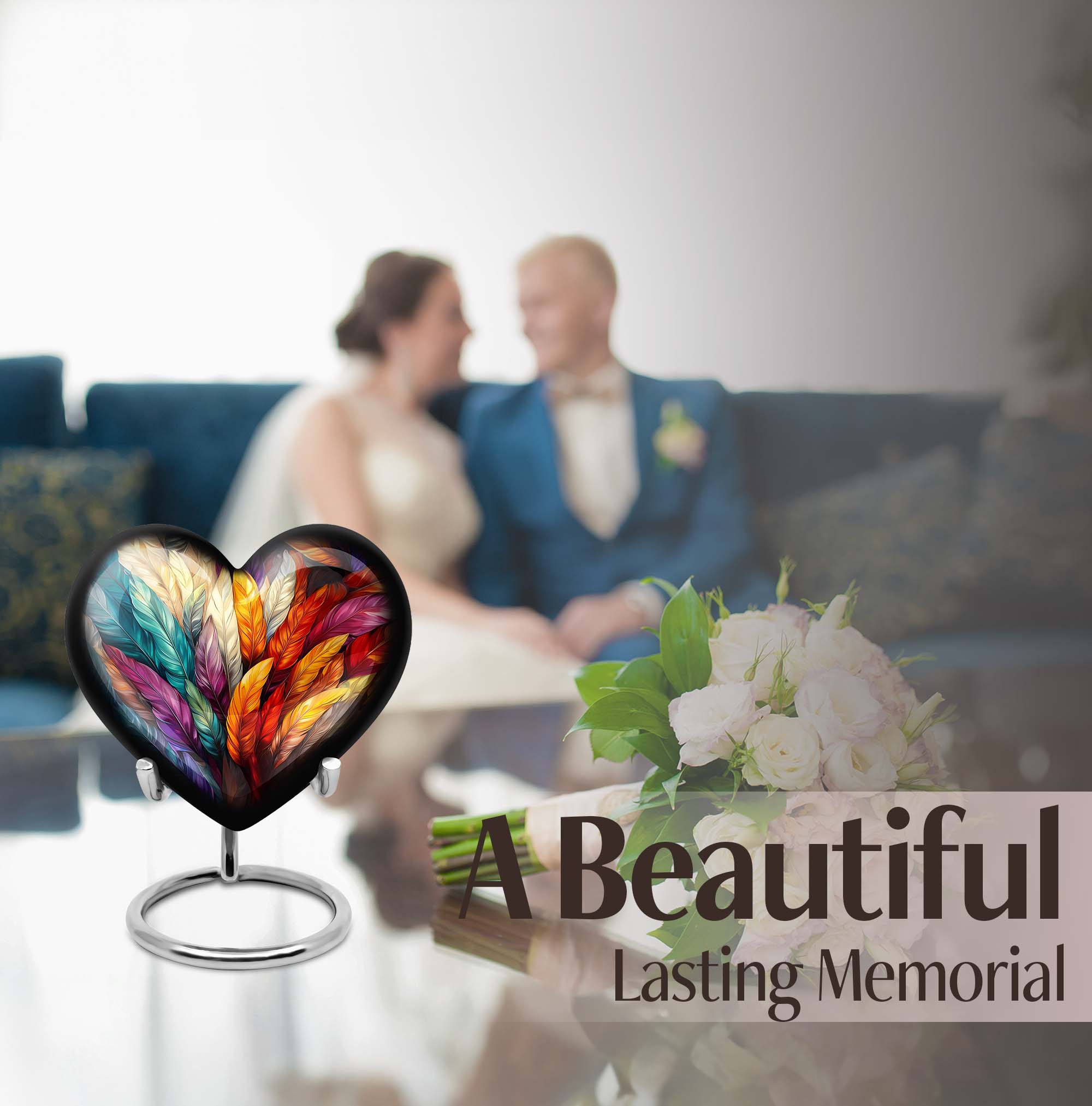 Honor your loved ones and hold their memory close with our striking 'Purple Meadow' funeral unique urns specifically assembled for human ashes. Fashioned from sturdy aluminium, this 10-Inch large urn showcases a stunning heart theme, a testament to infinite love and an ever-lasting bond. With a substantial capacity of 200 cubic inches and a weight of 3.3 pounds, it adeptly encapsulates the physical presence of your beloved one. This feather urn isn't just a resting place for your loved one, but a beautiful piece of art that stands as a tribute to a well-lived life. It comes with a velvet pouch for containment of ashes, signifying the sacredness of the memorabilia it contains. Additionally, the urn offers customization--engrave it with names to create a personal touch. By purchasing our outstanding memorial urns, you're not just buying a product, but a treasured keepsake, that is as unique as the life it represents. Keywords: feather Urn, funeral unique urns for human ashes, memorial medium urns for ashes, cremation urn burial, funeral, and funeral cremation urn.