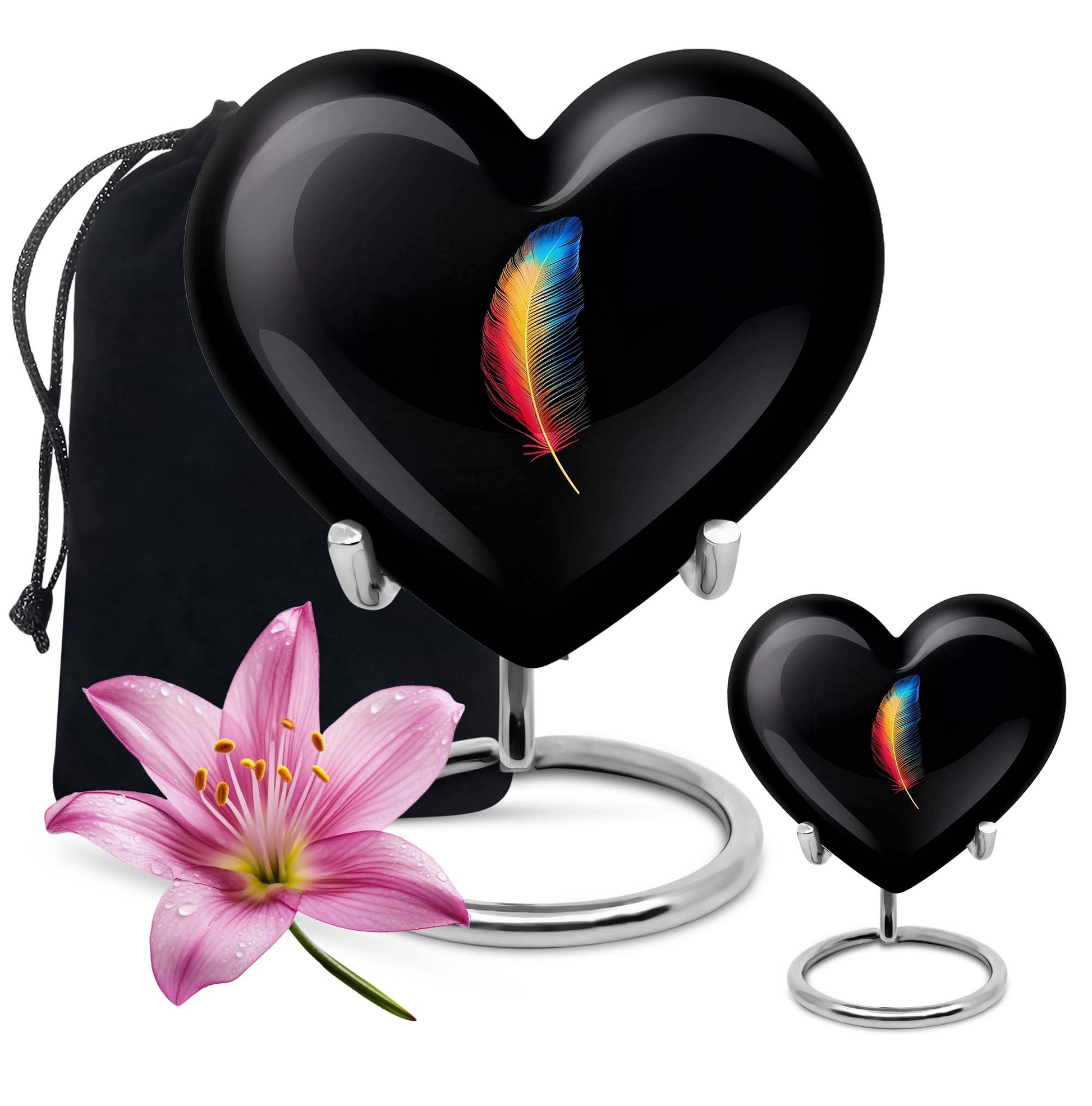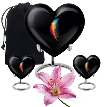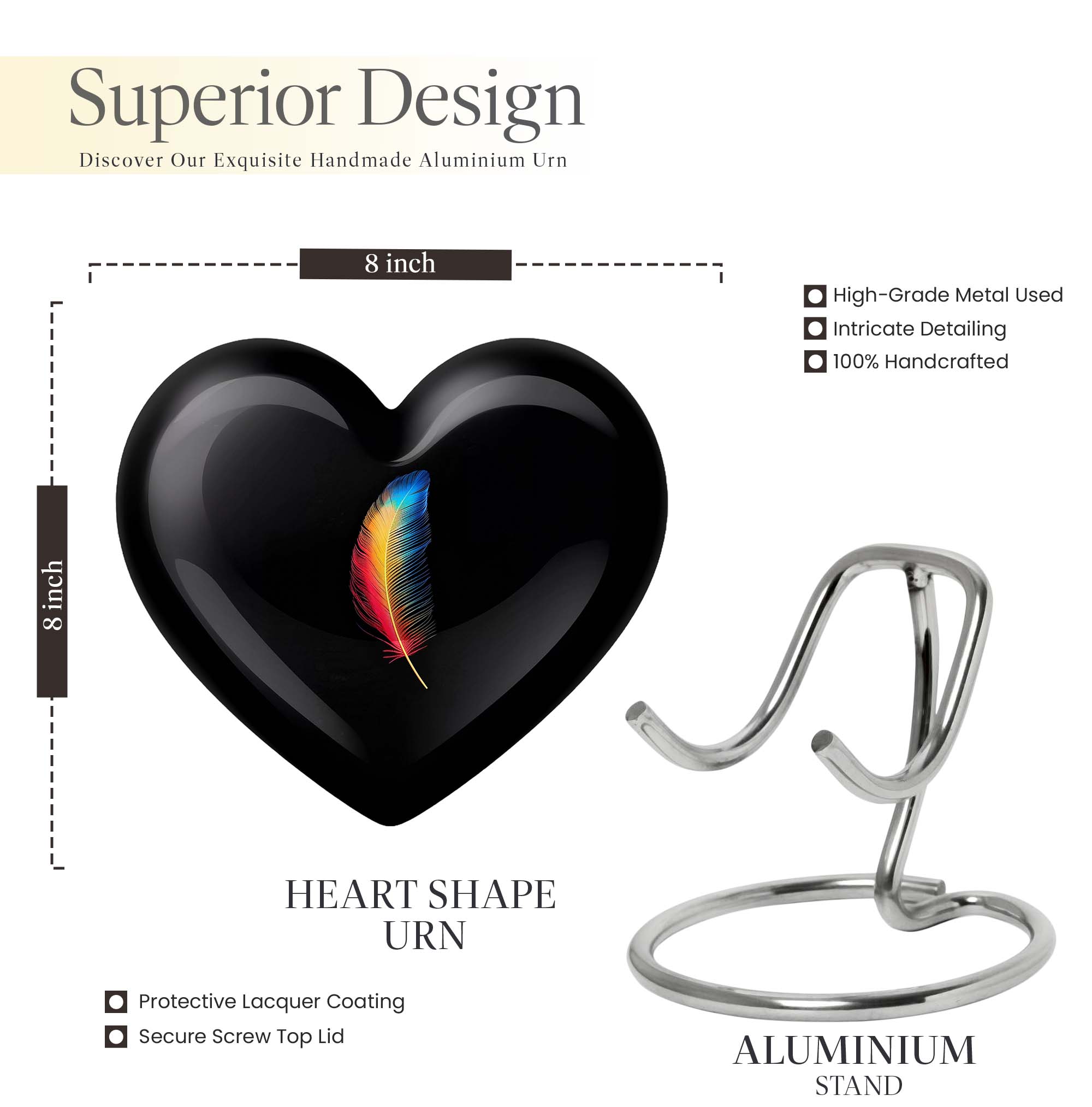 Cherish the memory of a loved one with our beautifully crafted 'Heart Urn', a perfect example of large urns meticulously designed for the containment of ashes. This cremation urn, standing tall at 10 inches, has a substantial weight of 3.3 pounds and offers an abundant capacity of 200 cubic inches. The feather urn is delicately fabricated from aluminium, known for its lasting durability. It gracefully portrays the 'Purple Meadow' theme, adding a serene aura to any set-up. The cremation large urn for ashes comes with a chic velvet pouch for secure storage. We offer the feature to personalize this cremation medium urn with engraved names. The keywords for our product are 'funeral gifts and 'metal urns for human ashes', making it an ideal choice for those seeking human ash urns.