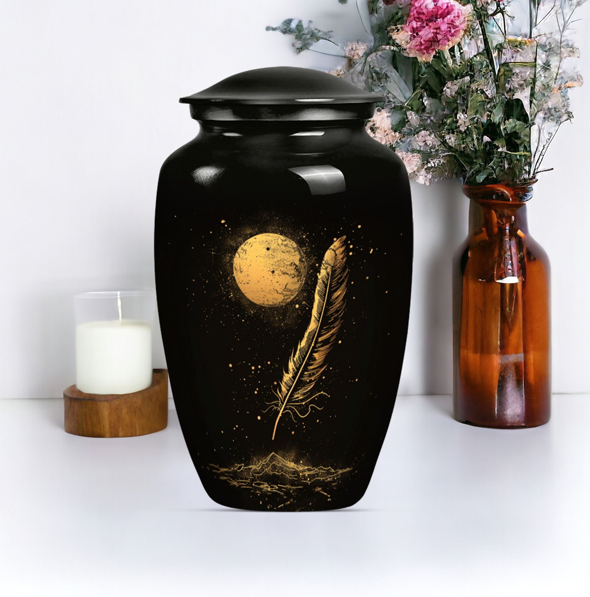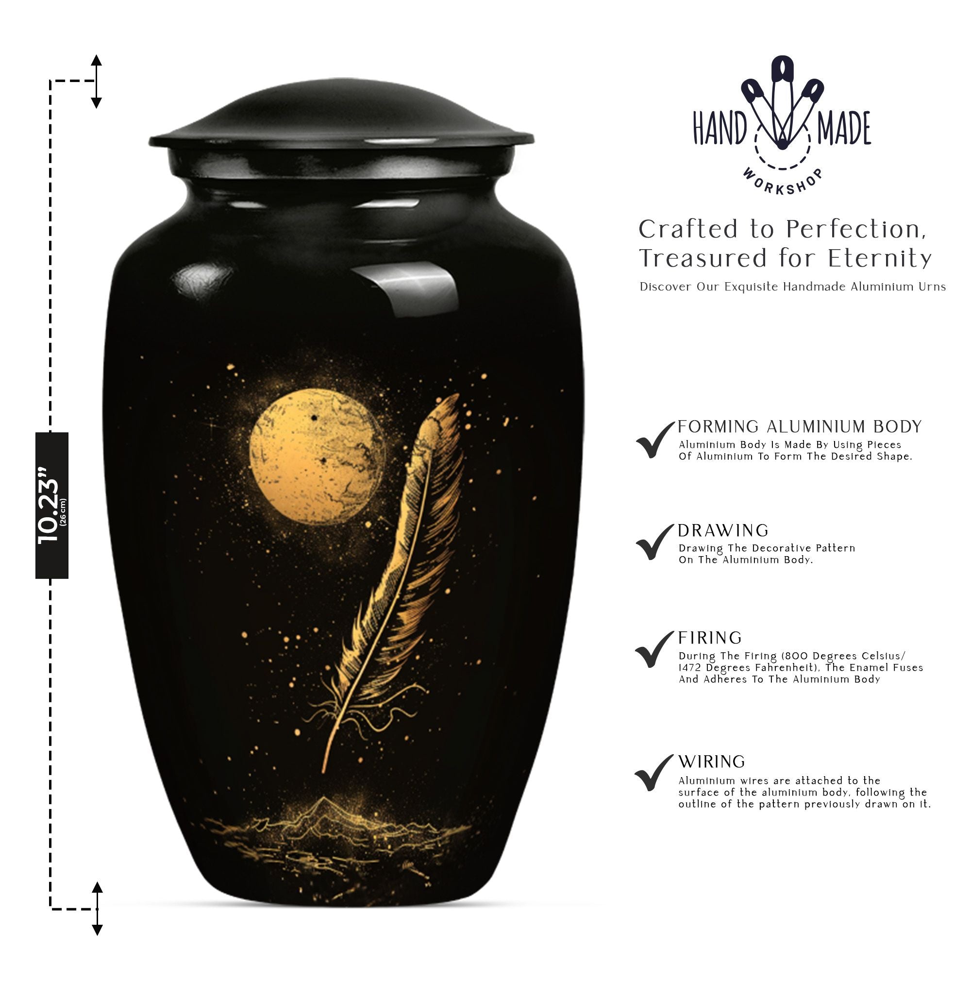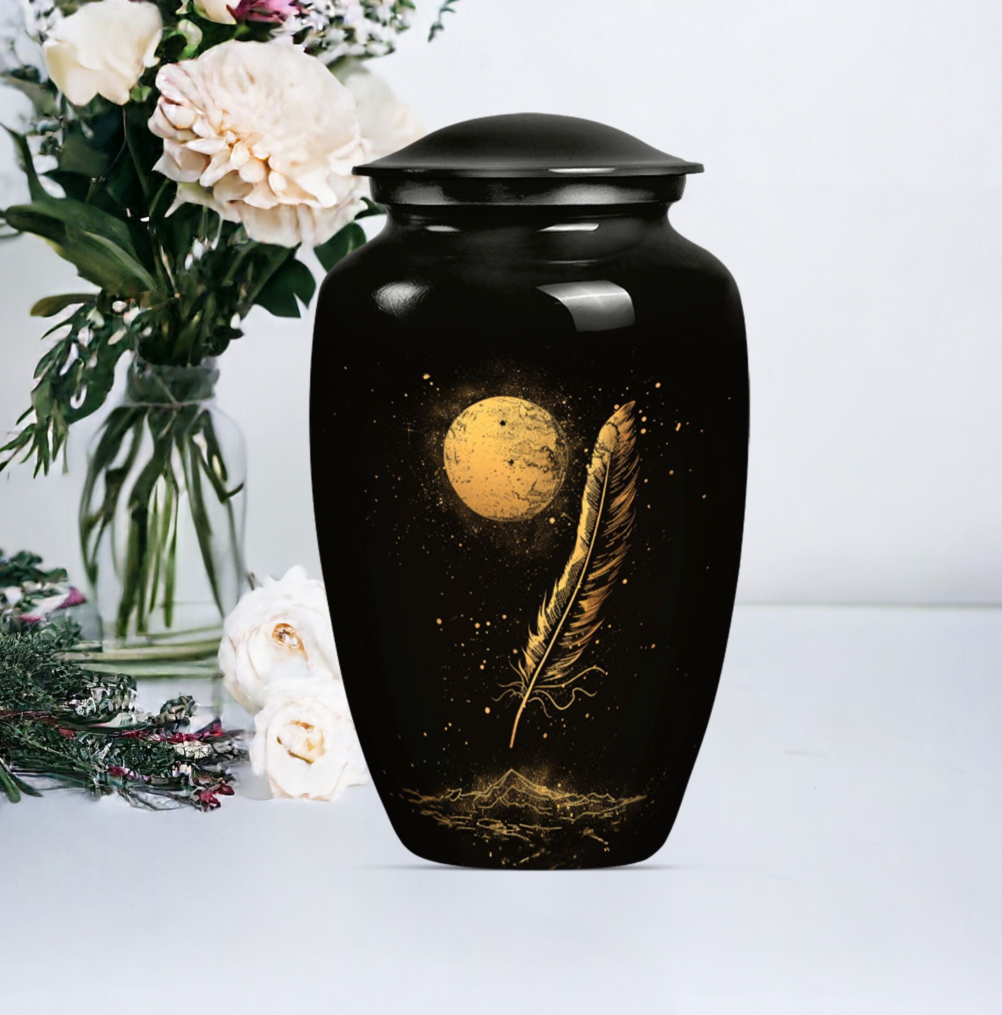 Treasure the loving memories of your departed mom with our feather urn, a solemn testament to a life well-lived. Our memorial urns boast a 10-inch stature, making it a standout piece in your home while being unobtrusive. Every one of our creations is heavy-duty, with each memorial urn weighing a solid 3.3 pounds, offering you lasting durability. Each urn is meticulously designed with a Purple Meadow theme, adding a touch of nature's serenity to your heartfelt remembrance. This large urn boasts an impressive capacity of 200 cubic inches, spacious enough to hold human ash. Crafted from high-grade aluminium, expect long-lasting durability and timeless elegance from our burial cremation urns. With each purchase, you receive a velvet pouch for secure containment of the precious ashes. And to add a personal touch, all of our cremation personalized urns for human ashes adult allow you to customize with engraved names. Distinctively immortalize your loved one's memory with our exclusive collection of cremation urns medium size.