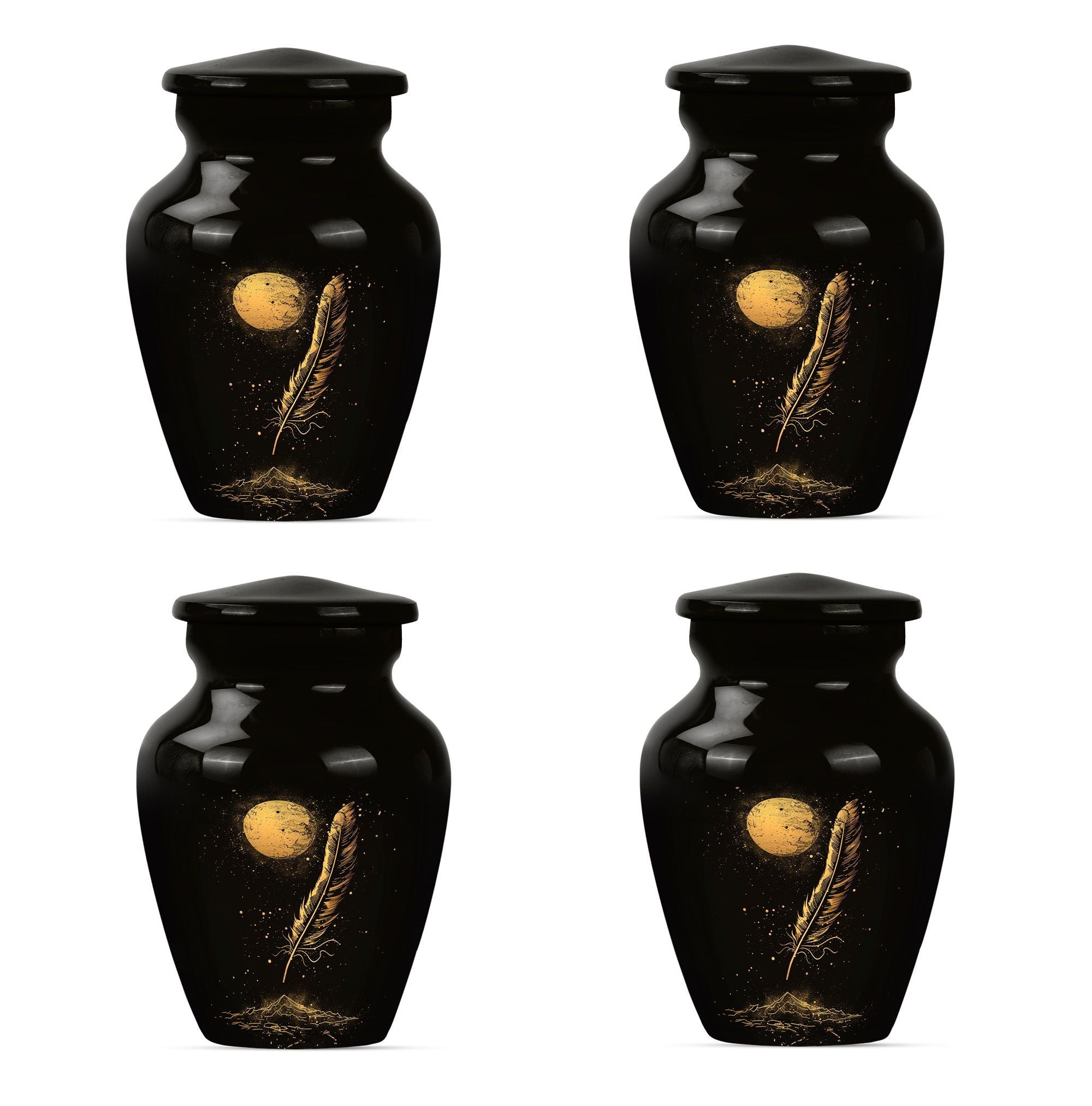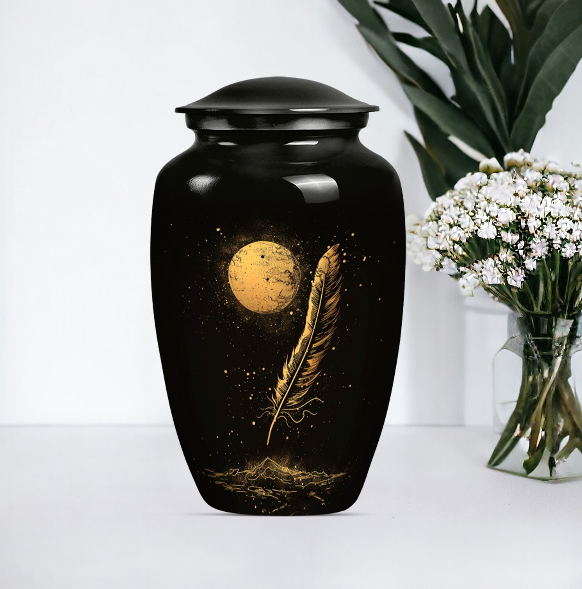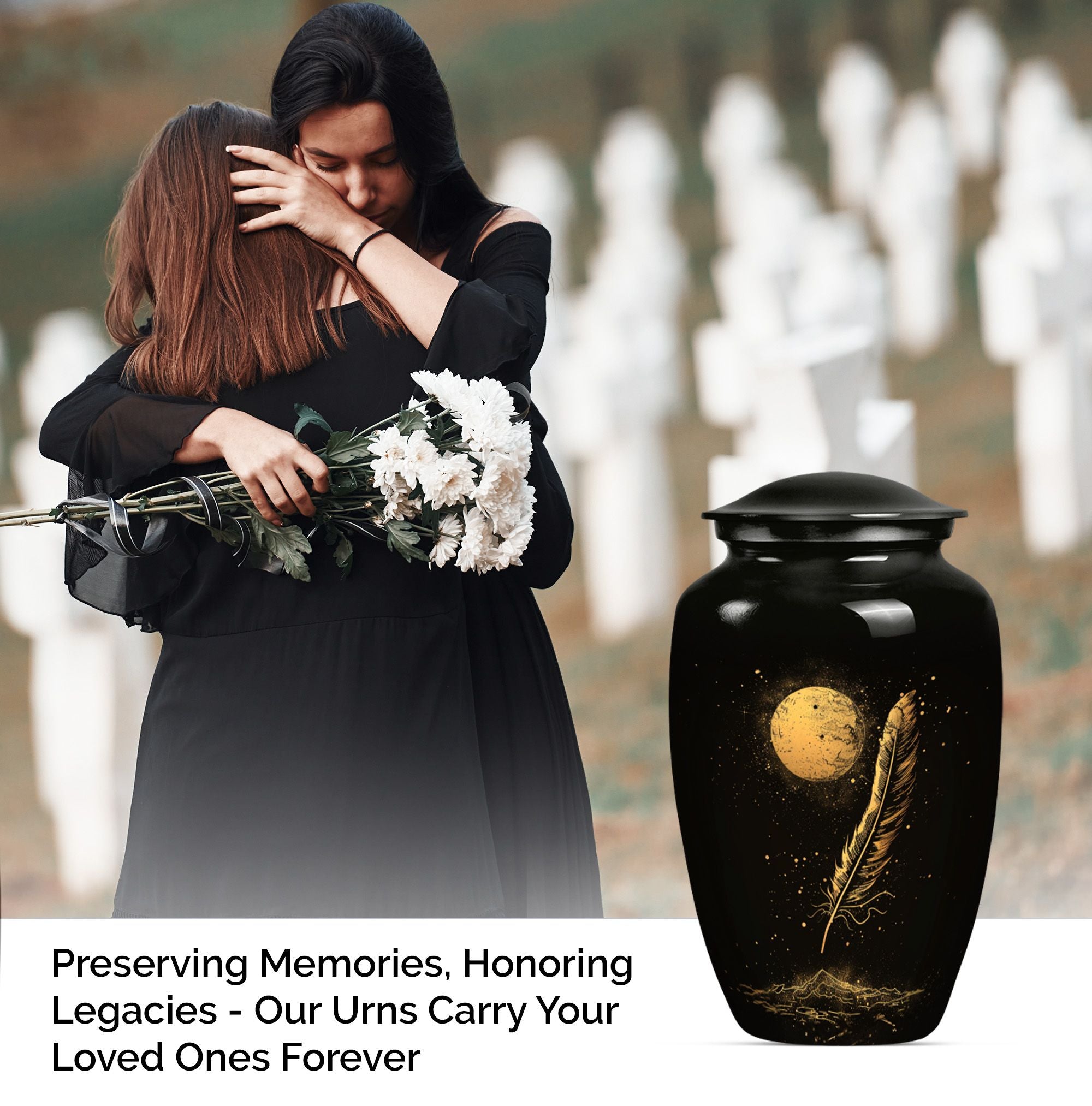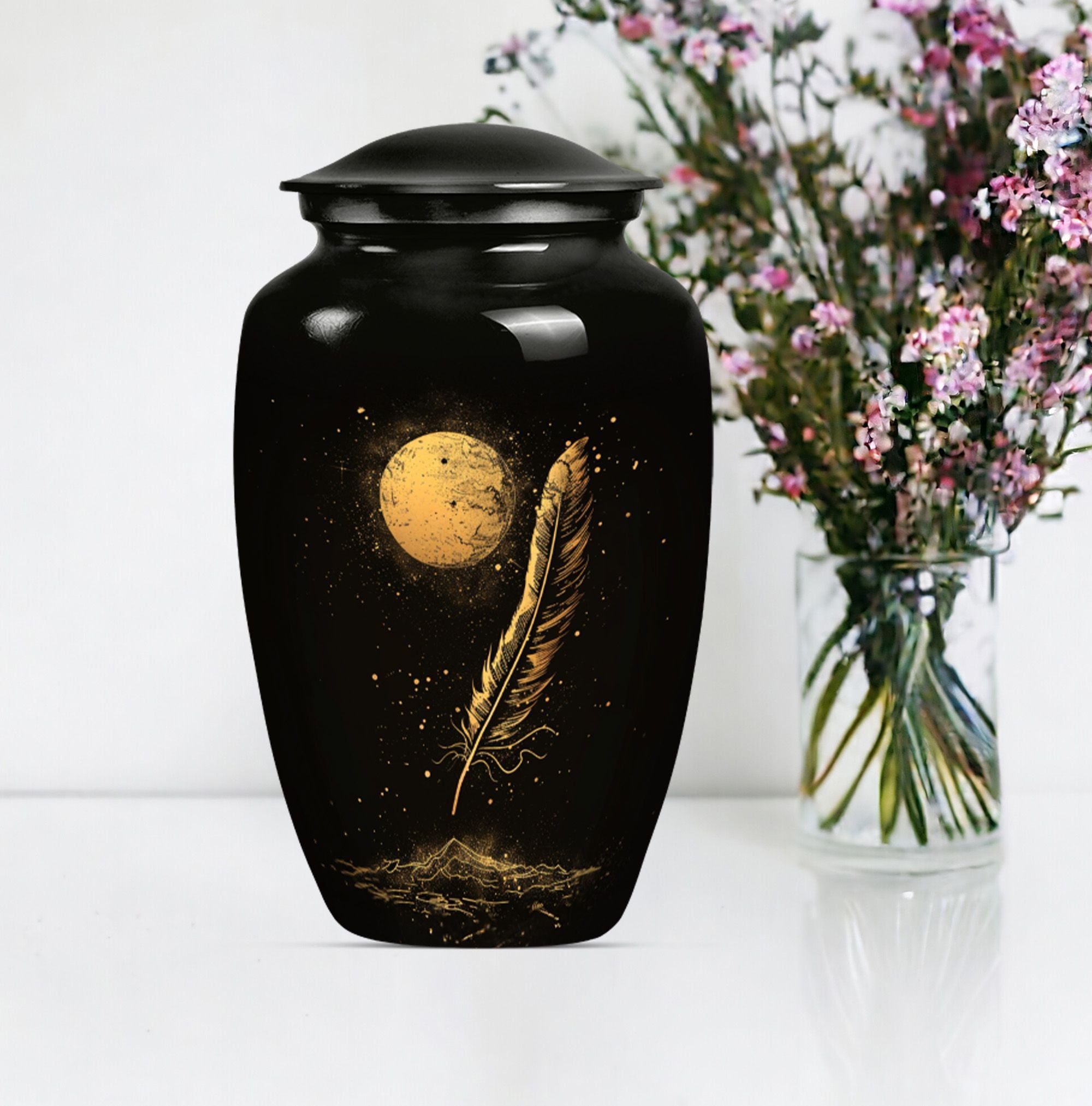 Treasure the loving memories of your departed mom with our feather urn, a solemn testament to a life well-lived. Our memorial urns boast a 10-inch stature, making it a standout piece in your home while being unobtrusive. Every one of our creations is heavy-duty, with each memorial urn weighing a solid 3.3 pounds, offering you lasting durability. Each urn is meticulously designed with a Purple Meadow theme, adding a touch of nature's serenity to your heartfelt remembrance. This large urn boasts an impressive capacity of 200 cubic inches, spacious enough to hold human ash. Crafted from high-grade aluminium, expect long-lasting durability and timeless elegance from our burial cremation urns. With each purchase, you receive a velvet pouch for secure containment of the precious ashes. And to add a personal touch, all of our cremation personalized urns for human ashes adult allow you to customize with engraved names. Distinctively immortalize your loved one's memory with our exclusive collection of cremation urns medium size.