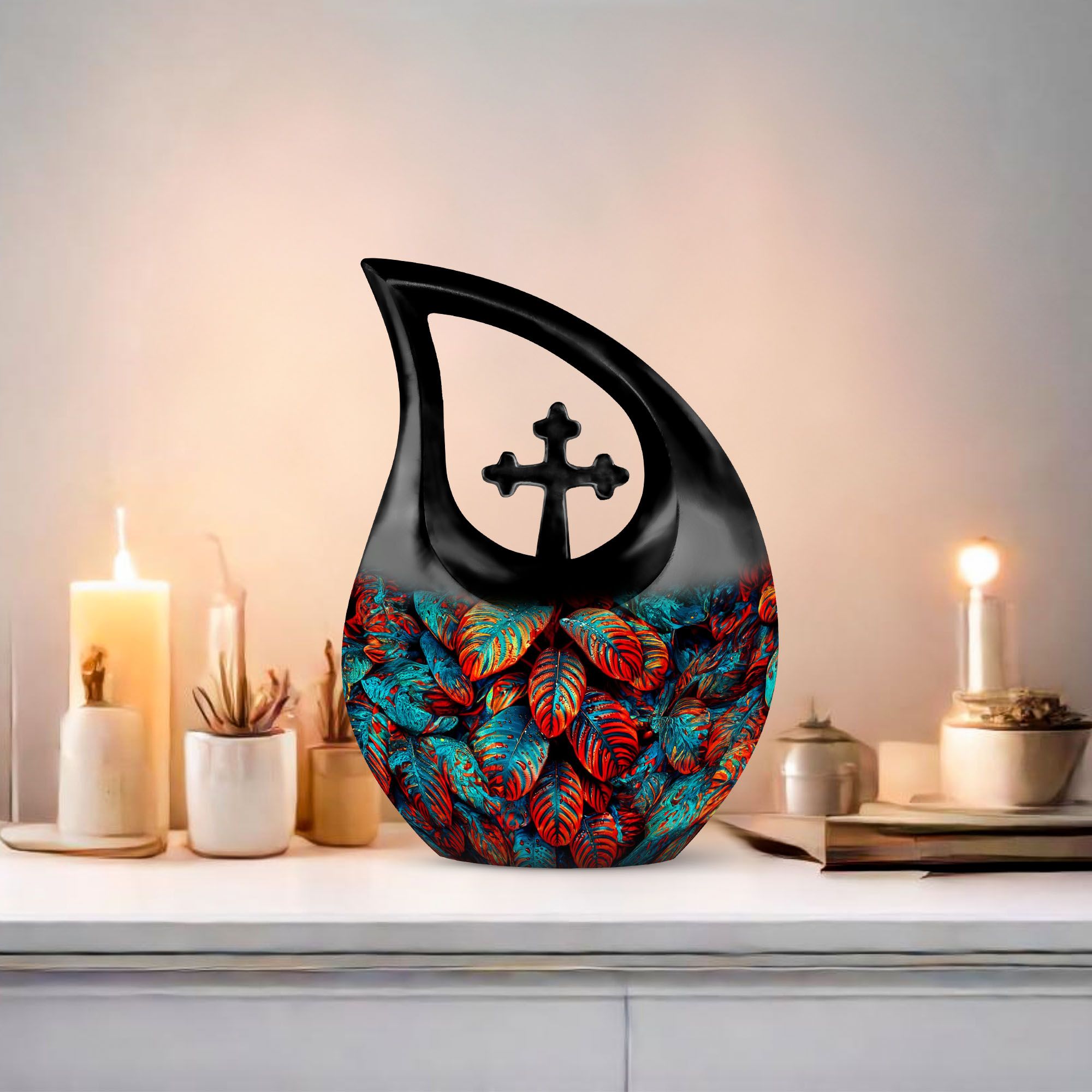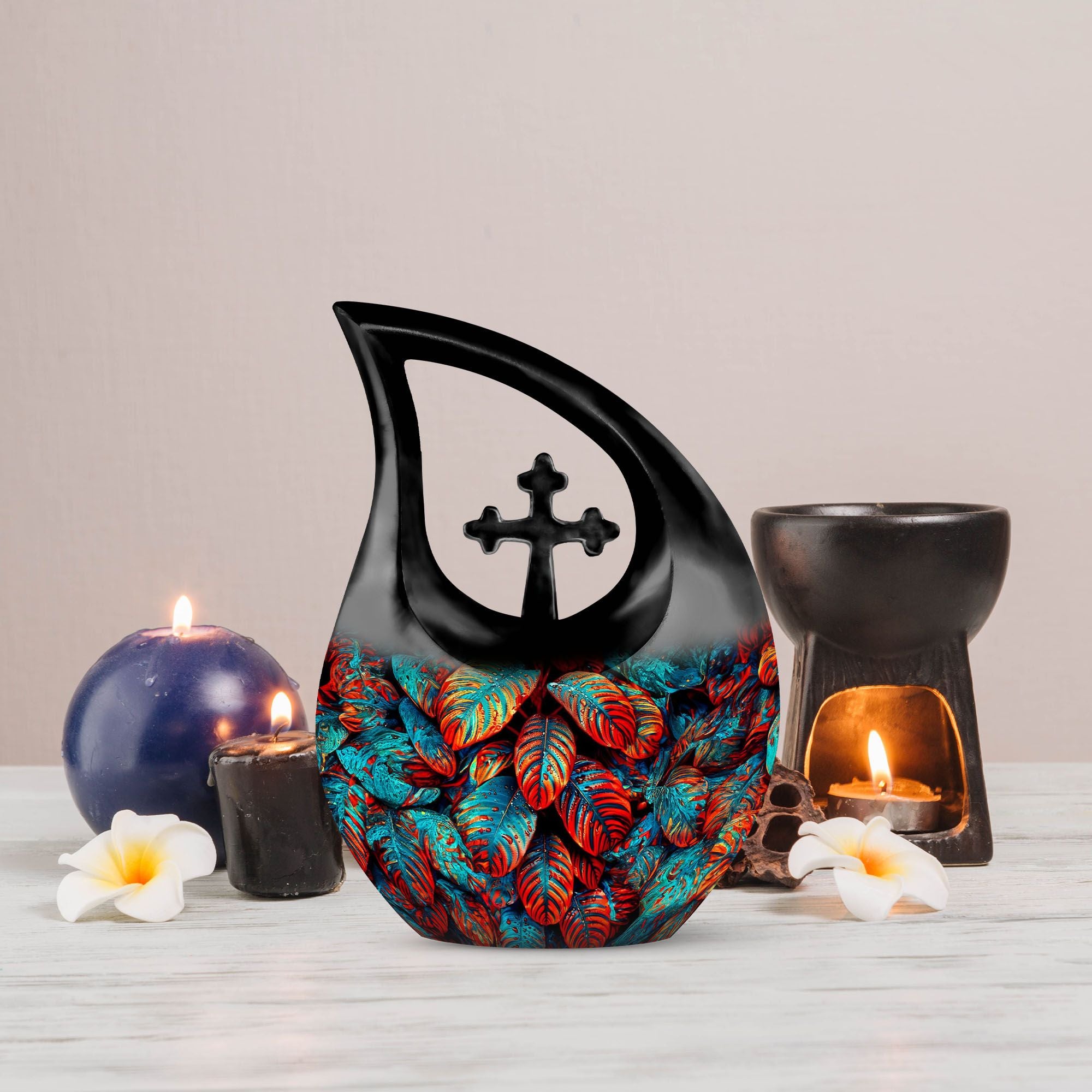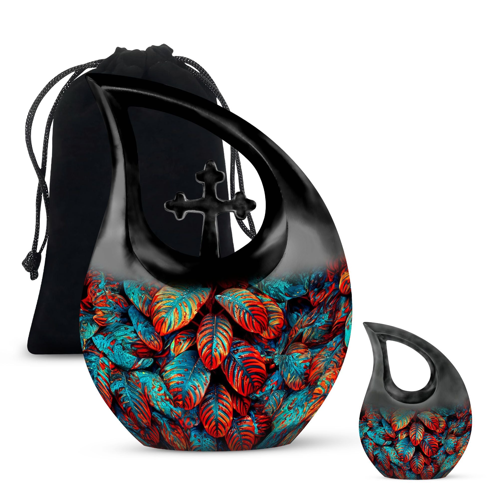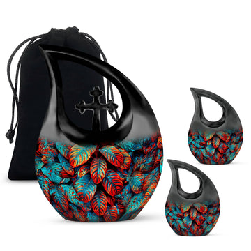 Discover a peaceful tribute to your loved one with our Feather Urn – an enriching symbol of love and remembrance. Expertly crafted from robust aluminum, this metal cremation urn showcases the unique 'Cross Drop' motif, reinforcing your faith and reverence. Measuring 10 inches tall, this large urn can store up to 200 cubic inches of ashes effortlessly. The urn weighs a sturdy 3.3 pounds, balancing substantiality and delicacy with utmost elegance. Every Feather urn comes with a soft velvet pouch, allowing safe and dignified containment of your dear one's ashes. What's more? You can personalize this memorial urn with the engraved names of your choice, adding a heartfelt touch to your tribute. Whether you're searching for 'Miniature Urns For Ashes,' 'Blue Urn For Ashes,' 'Ashes Urns For Sale,' or 'Garden Urns For Ashes,' our Feather Urn fulfills your solemn need with grace and serenity. Remember, honor, and celebrate in the most respectful manner with our Feather Urn.