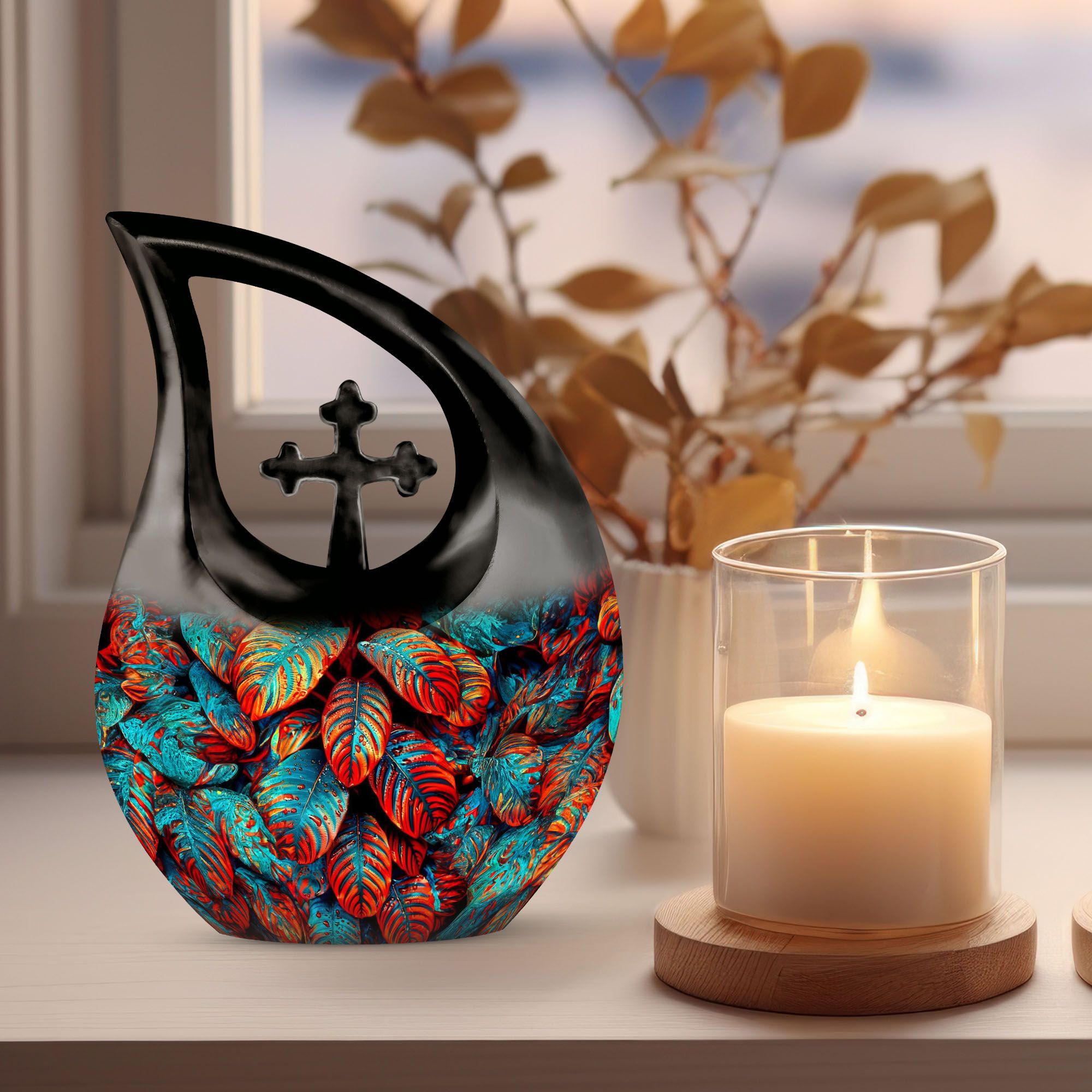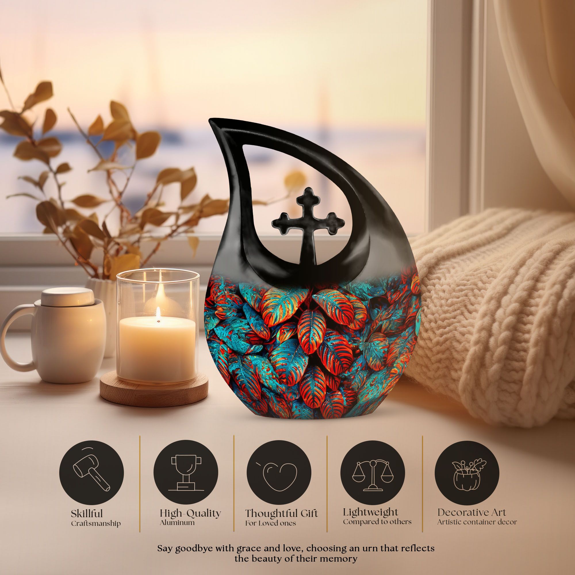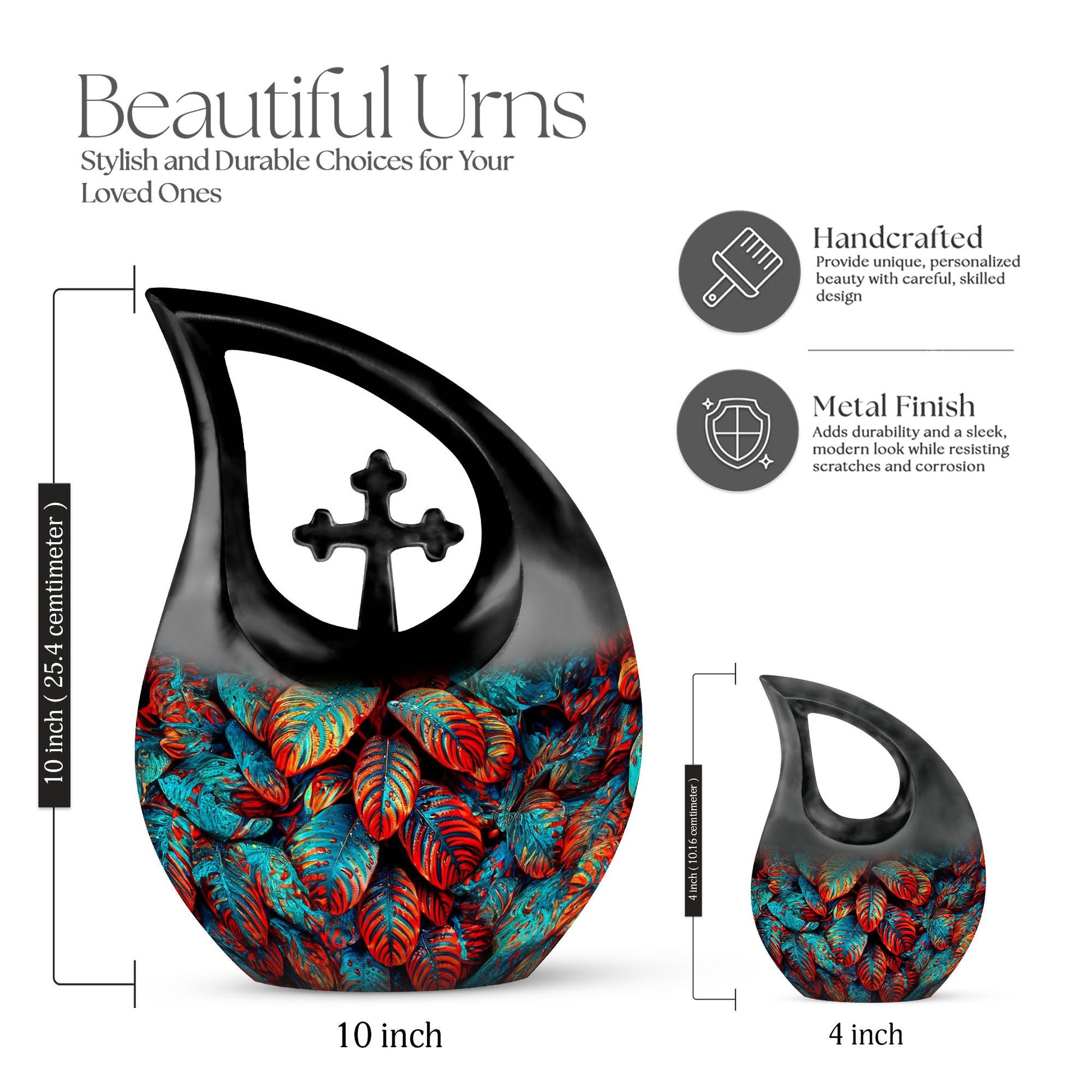 Discover a peaceful tribute to your loved one with our Feather Urn – an enriching symbol of love and remembrance. Expertly crafted from robust aluminum, this metal cremation urn showcases the unique 'Cross Drop' motif, reinforcing your faith and reverence. Measuring 10 inches tall, this large urn can store up to 200 cubic inches of ashes effortlessly. The urn weighs a sturdy 3.3 pounds, balancing substantiality and delicacy with utmost elegance. Every Feather urn comes with a soft velvet pouch, allowing safe and dignified containment of your dear one's ashes. What's more? You can personalize this memorial urn with the engraved names of your choice, adding a heartfelt touch to your tribute. Whether you're searching for 'Miniature Urns For Ashes,' 'Blue Urn For Ashes,' 'Ashes Urns For Sale,' or 'Garden Urns For Ashes,' our Feather Urn fulfills your solemn need with grace and serenity. Remember, honor, and celebrate in the most respectful manner with our Feather Urn.