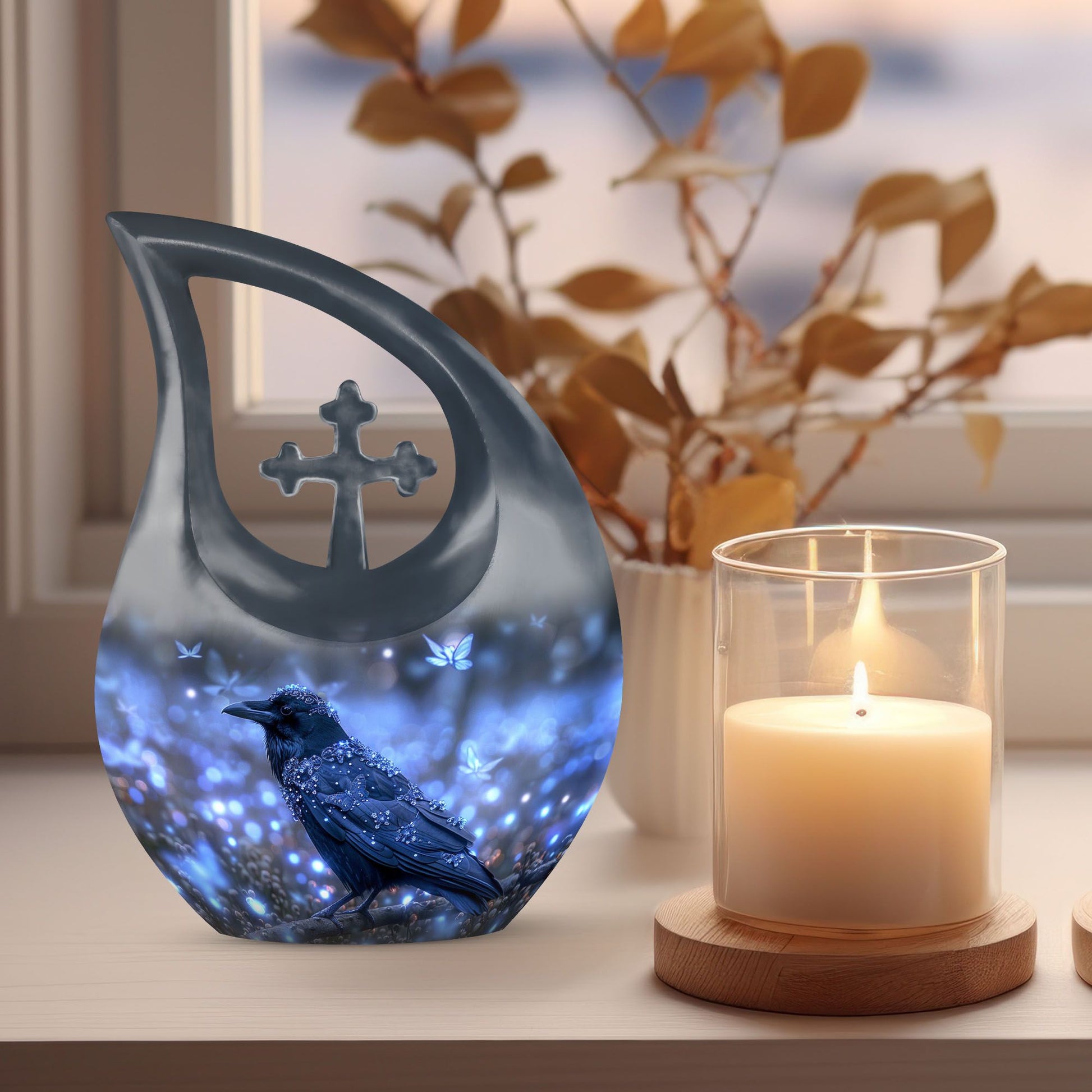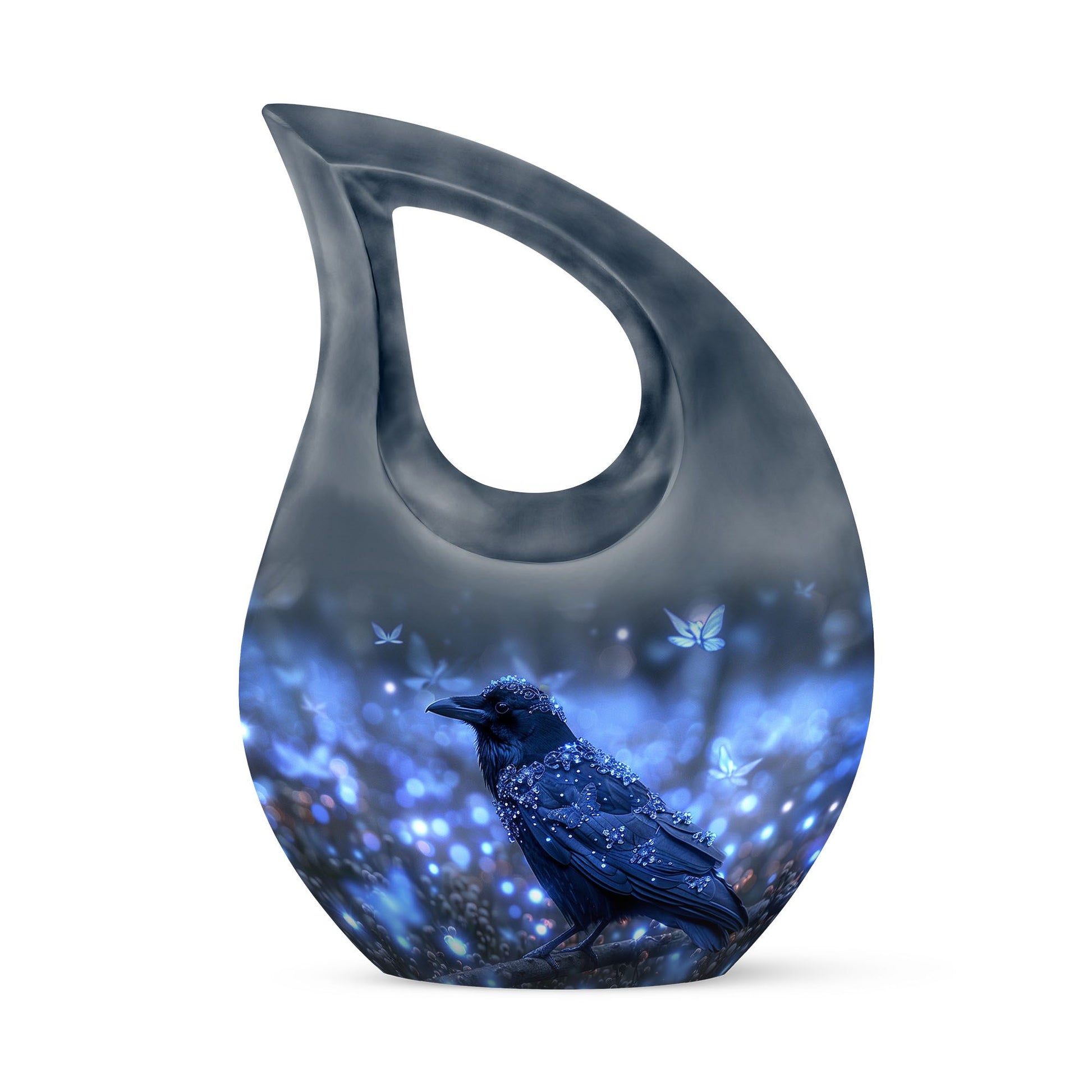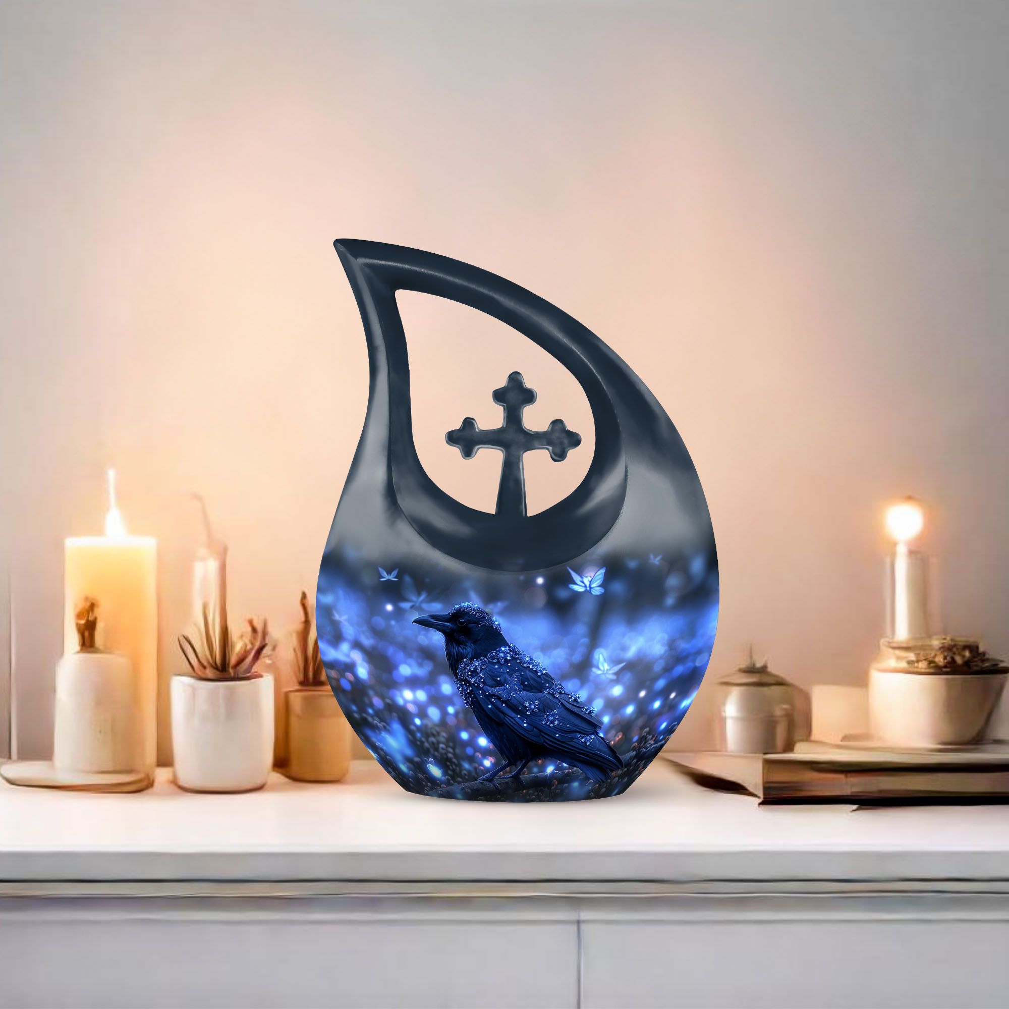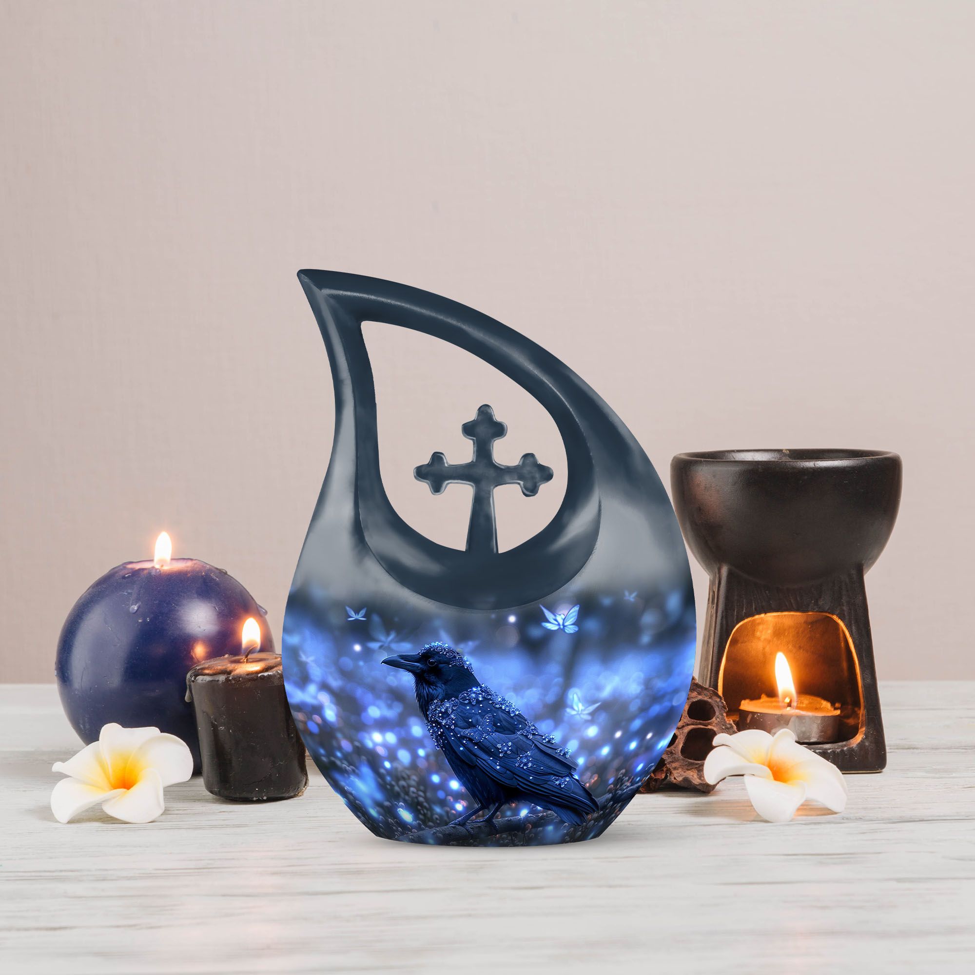 The Royal Raven Urn for Human Ashes is a magnificent tribute that embodies mystery, wisdom, and everlasting remembrance. With its deep blue glow and intricate raven artwork, this urn keepsake for human ashes represents guidance and protection through the spiritual journey. Crafted for those who lived boldly and left behind powerful memories, it stands as a timeless ashes memorial keepsake for families seeking beauty and meaning in remembrance.